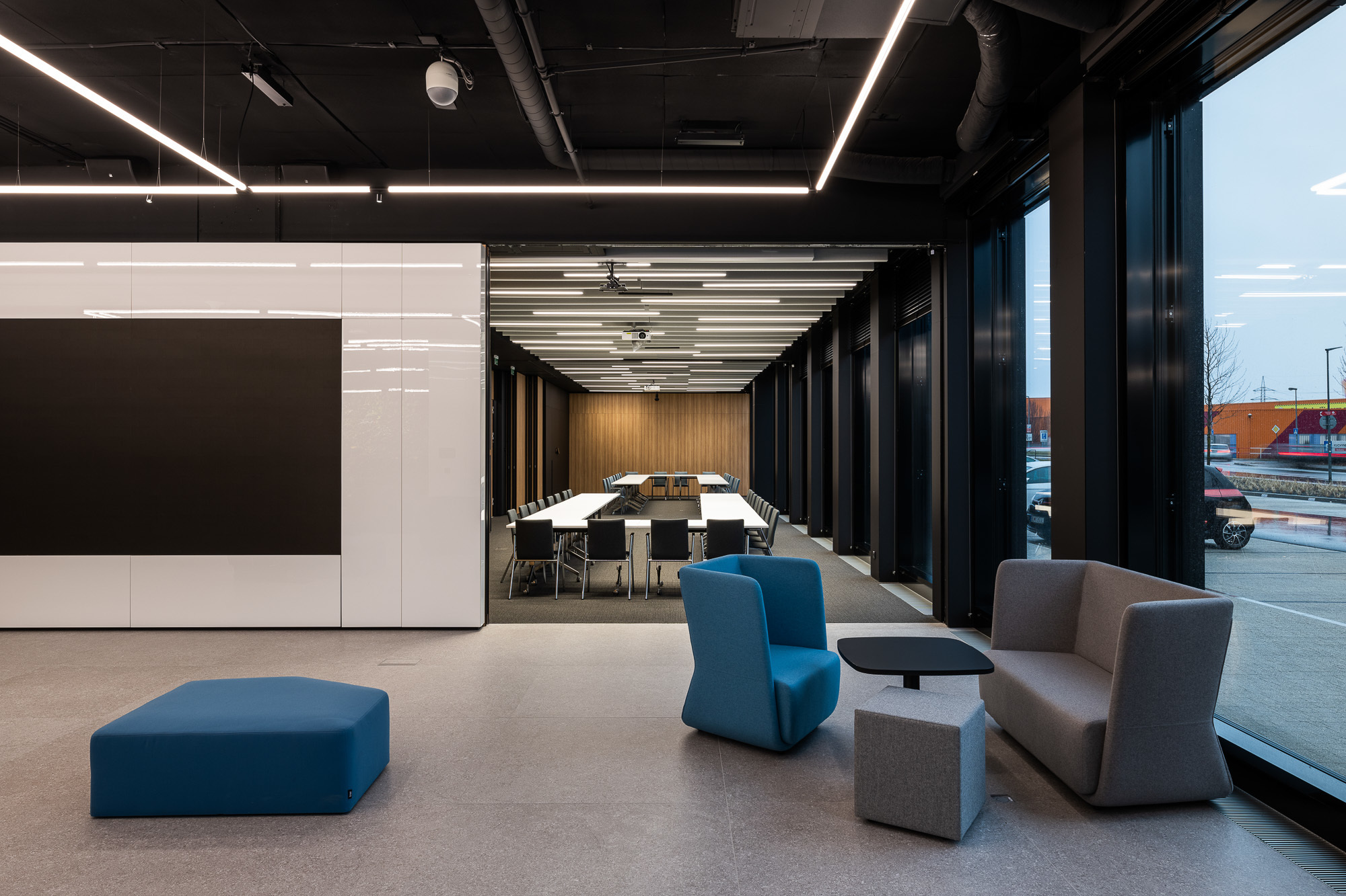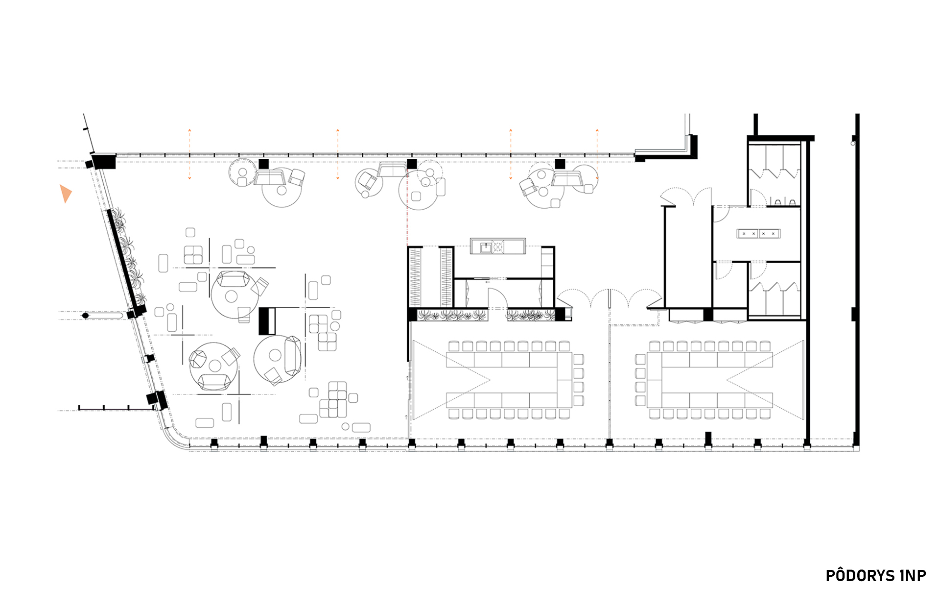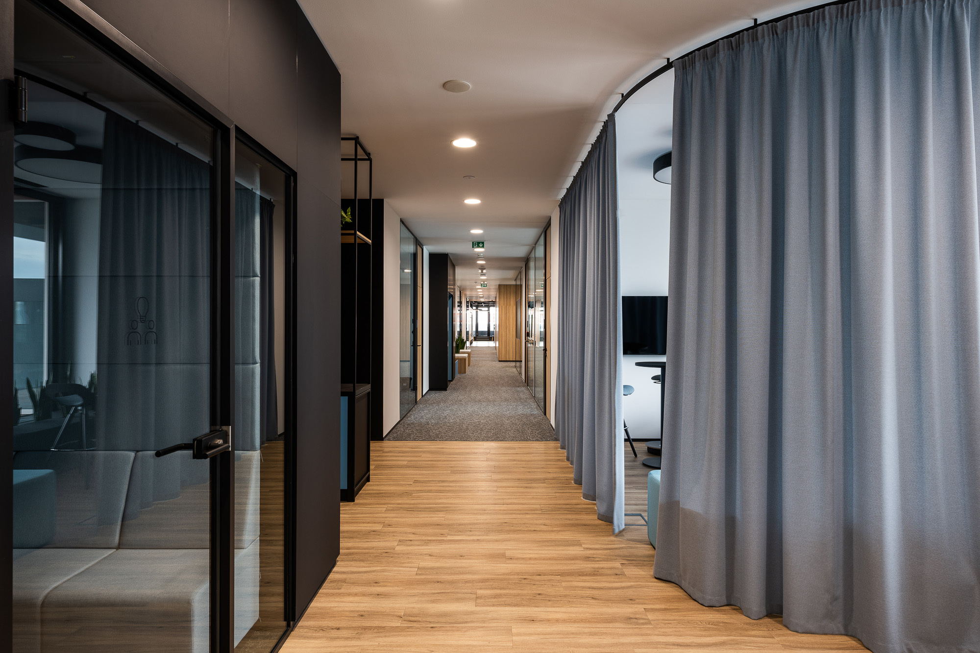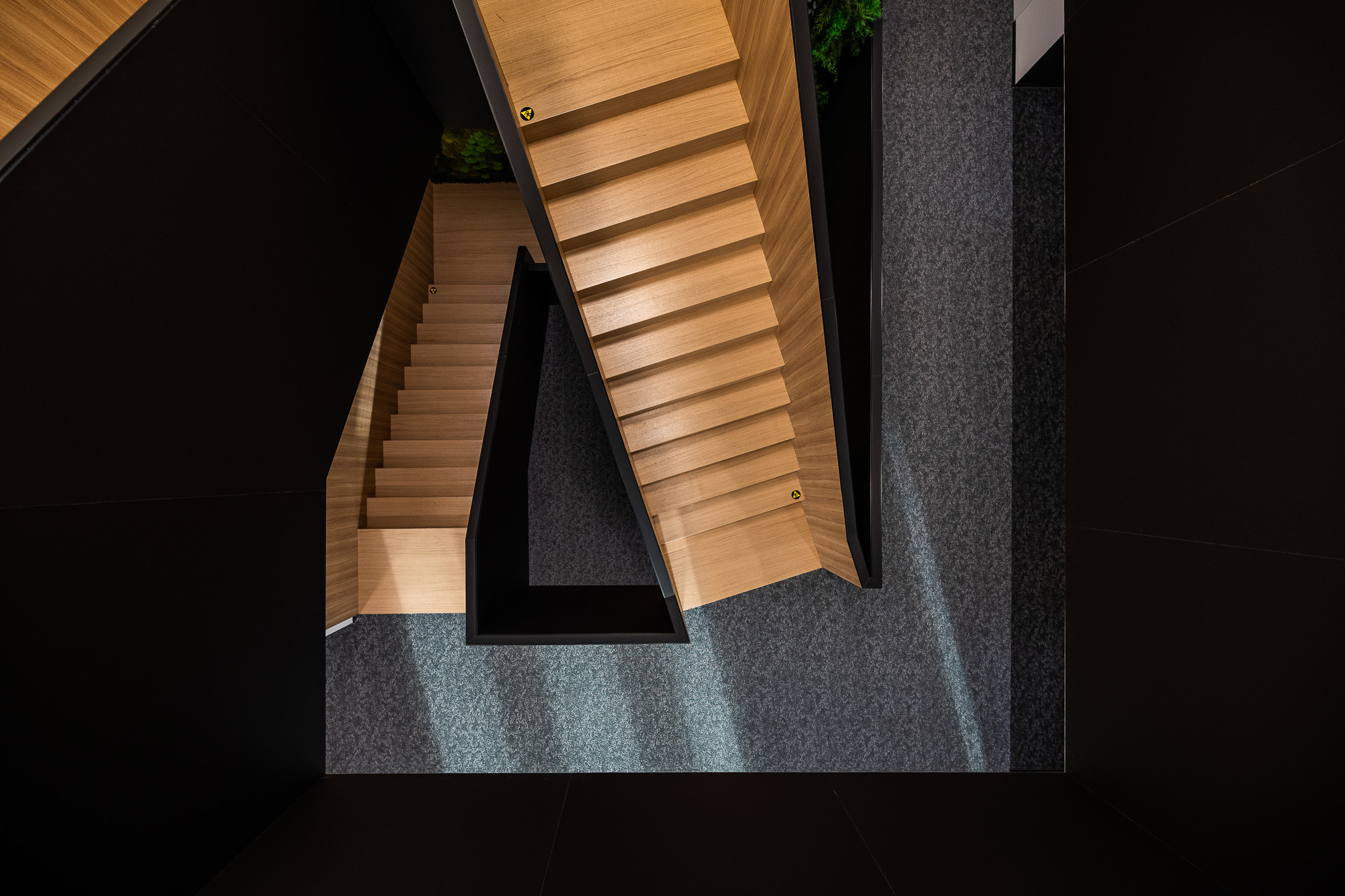 Dispozícia pracovných priestorov je efektívna a prehľadná, no zároveň funkčne, priestorovo a vizuálne bohatá. Namiesto tradičných chodieb vytvárame multifunkčný, pôdorysne členitý (a skutočne) komunikačný priestor, ktorý tvorí chrbticu celej prevádzky. Vznikajú v ňou "zálivy", naplnené pracovnými či oddychovými mikropriestormi, ktorých úlohou je spájať ľudí, podporovať sociálny a pracovný kontakt medzi kolegami. Vďaka internému schodisku prestávajú byť podlažia bariérou pre tento kontakt. Dôraz sme kládli aj na oddychové priestory, najmä ich správnu funkčnú segregáciu. Gastro zariadenia sa členia od malých coffee pointov, cez uzatvorené kuchyne s jedálňou až po firemnú kaviareň.