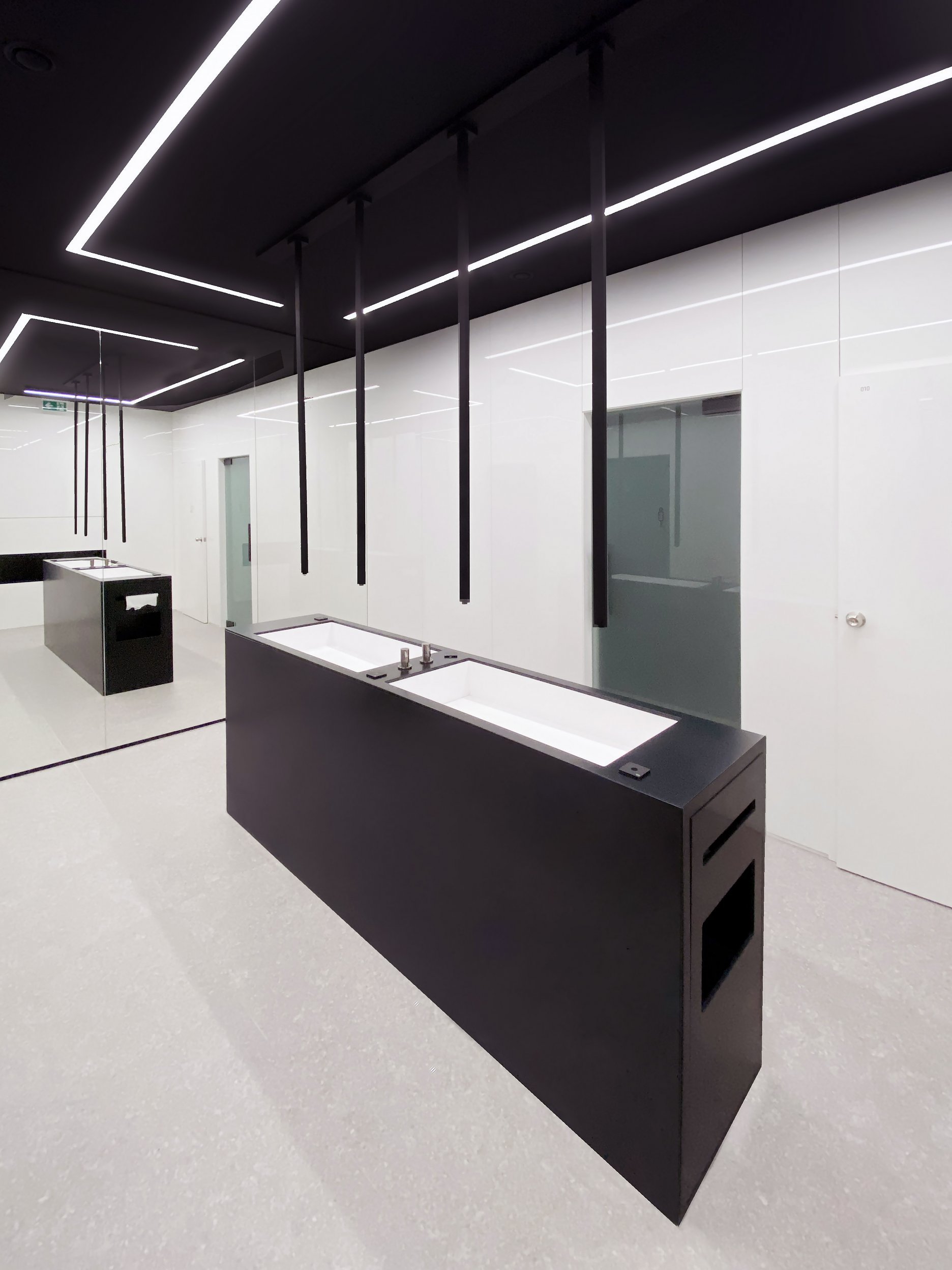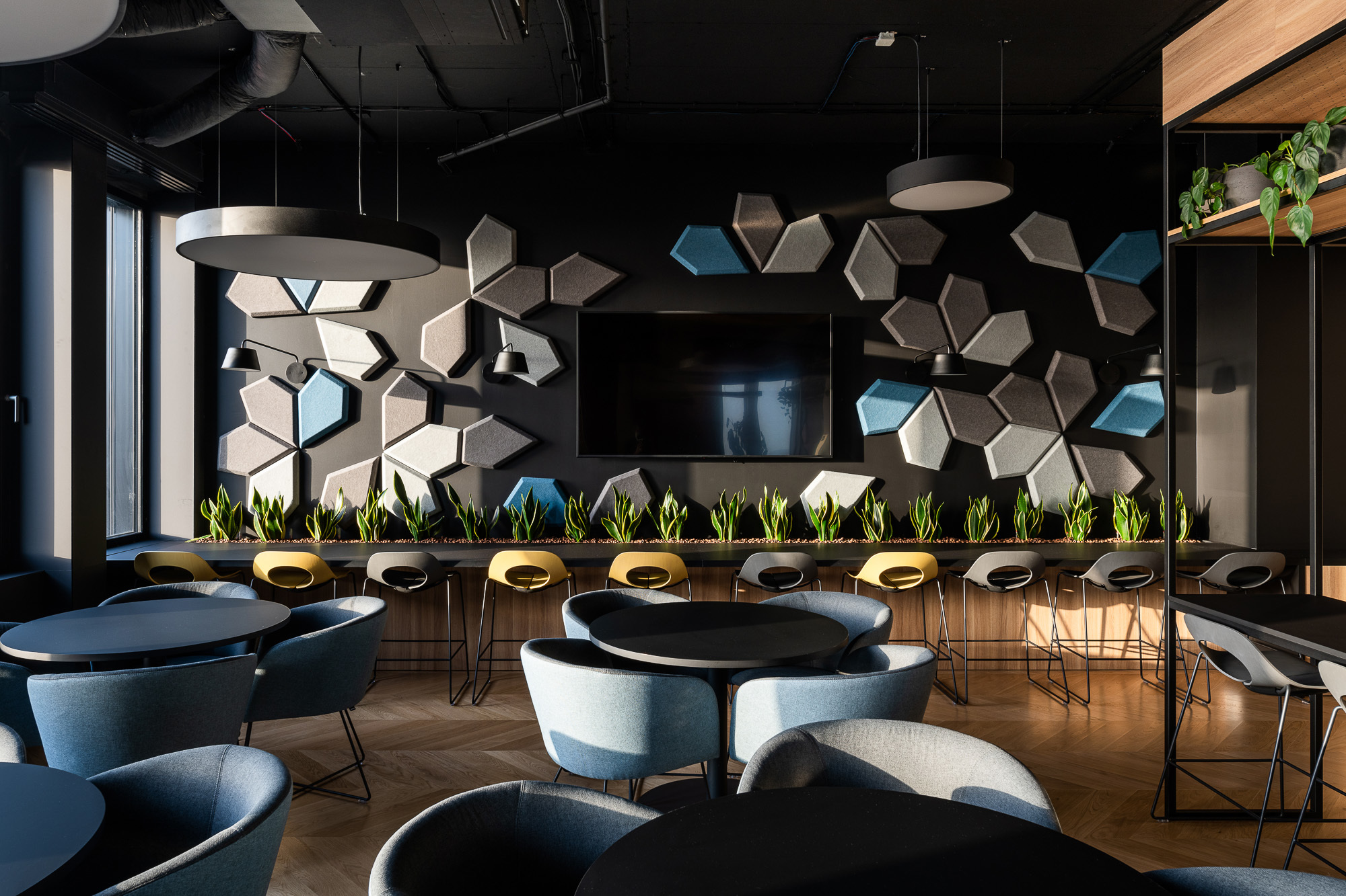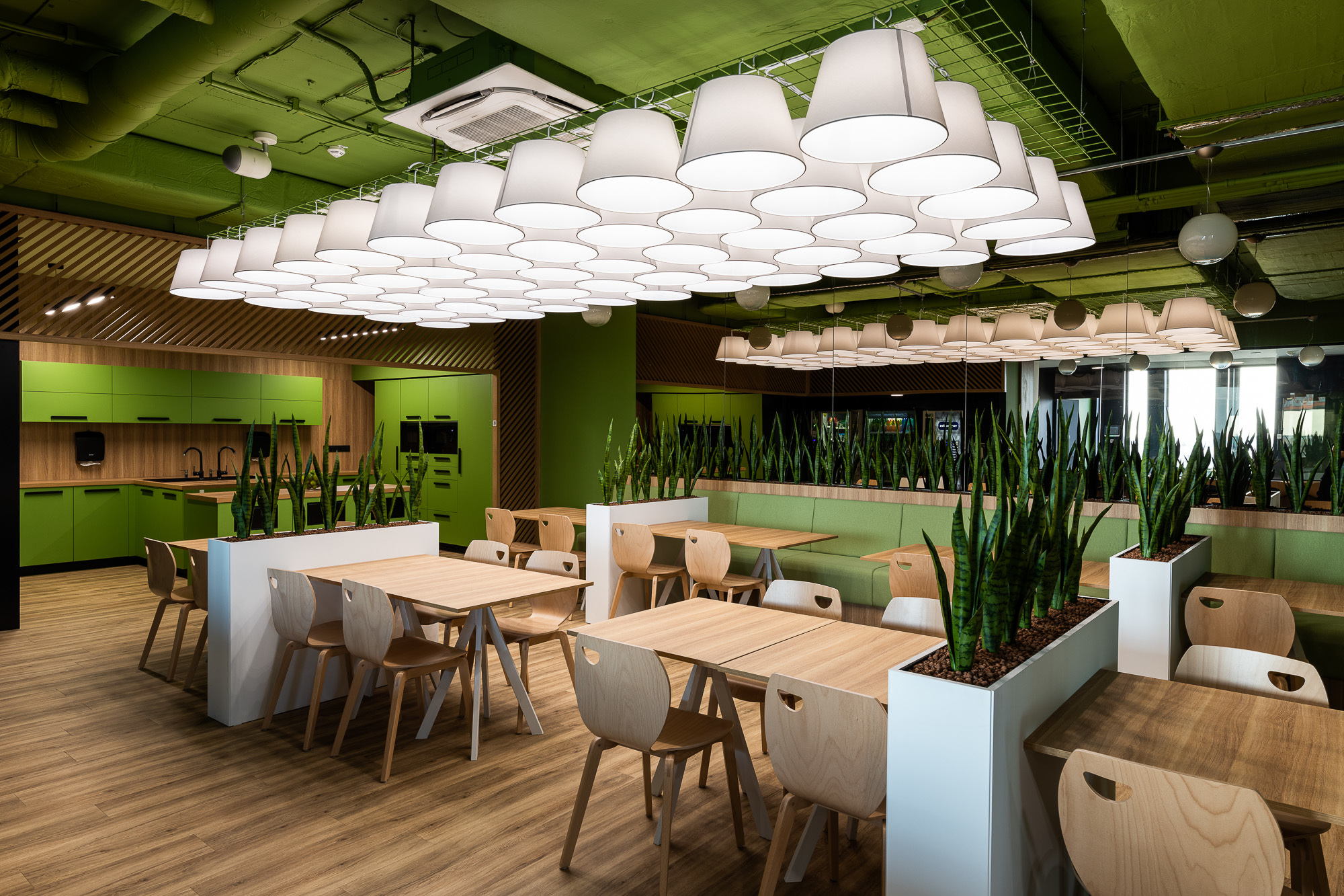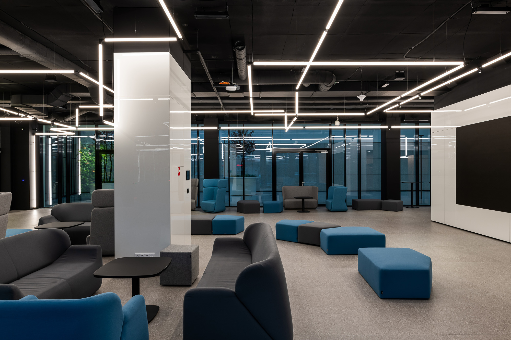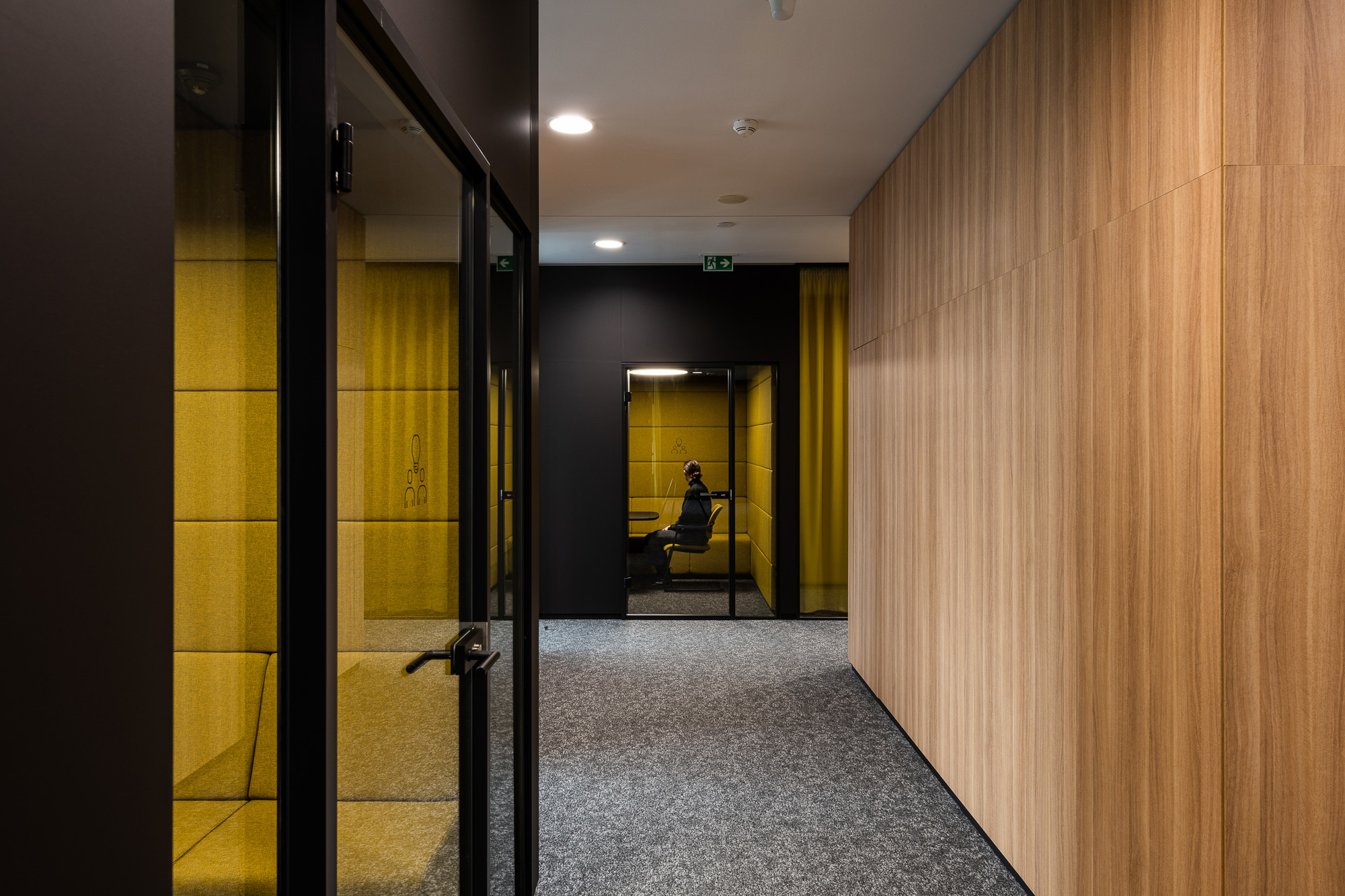 Dispozícia pracovných priestorov je efektívna a prehľadná, no zároveň funkčne, priestorovo a vizuálne bohatá. Namiesto tradičných chodieb vytvárame multifunkčný, pôdorysne členitý (a skutočne) komunikačný priestor, ktorý tvorí chrbticu celej prevádzky. Vznikajú v ňou "zálivy", naplnené pracovnými či oddychovými mikropriestormi, ktorých úlohou je spájať ľudí, podporovať sociálny a pracovný kontakt medzi kolegami. Vďaka internému schodisku prestávajú byť podlažia bariérou pre tento kontakt. Dôraz sme kládli aj na oddychové priestory, najmä ich správnu funkčnú segregáciu. Gastro zariadenia sa členia od malých coffee pointov, cez uzatvorené kuchyne s jedálňou až po firemnú kaviareň.