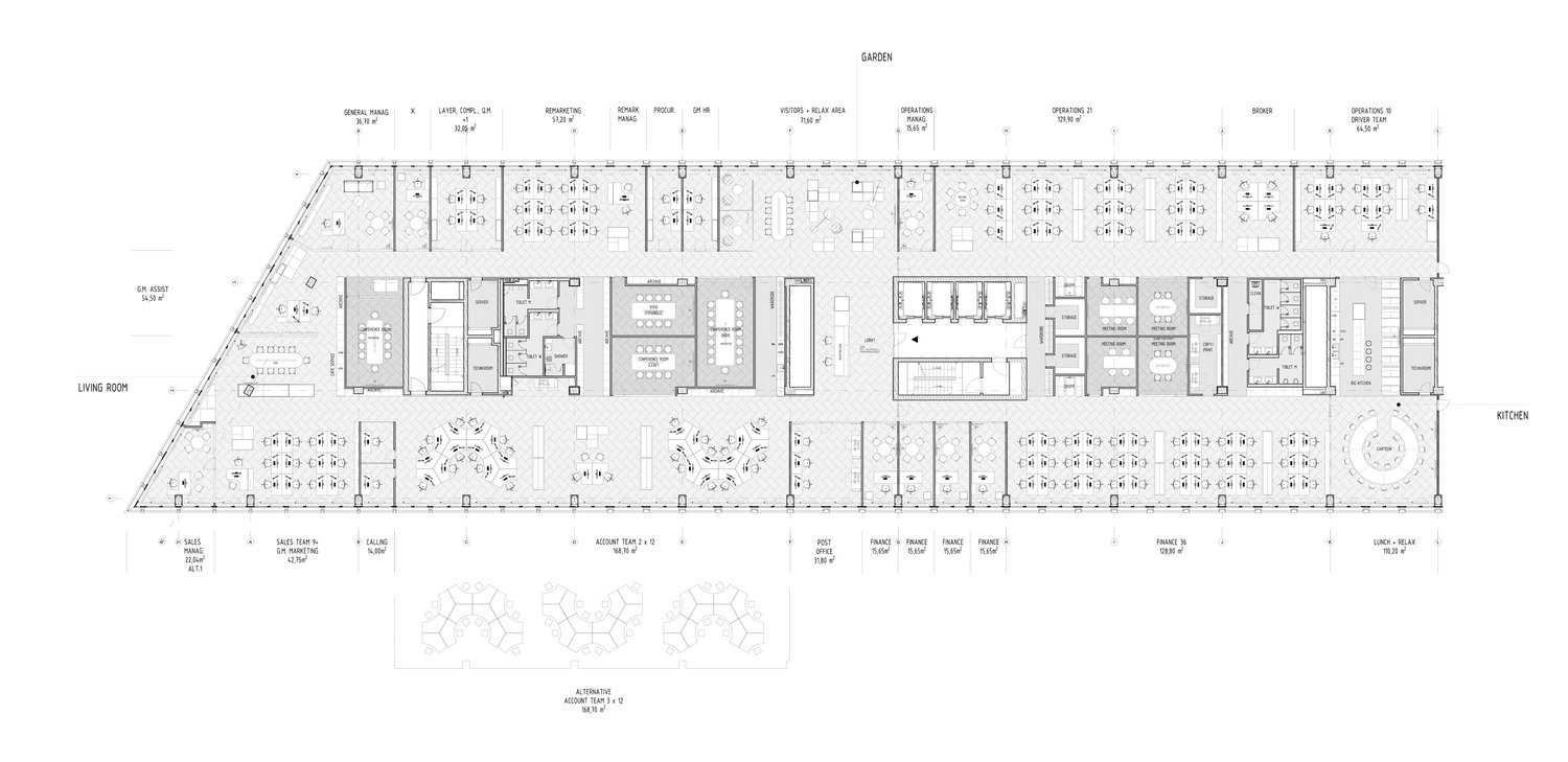 Centrálny trakt (ktorý nadväzuje na vertikálne jadrá) je spolu so zasadacími miestnosťami, hygienickým zázemím a skladmi “zjednotený” dyhovým obkladom. Do stien sú integrované dvere, šatňové skrinky, či schránky na dokumenty. Súvislý povrch je prerušený len zasklenými priečkami zasadacích miestností.