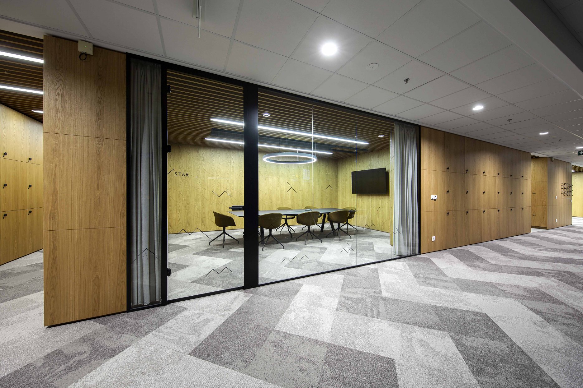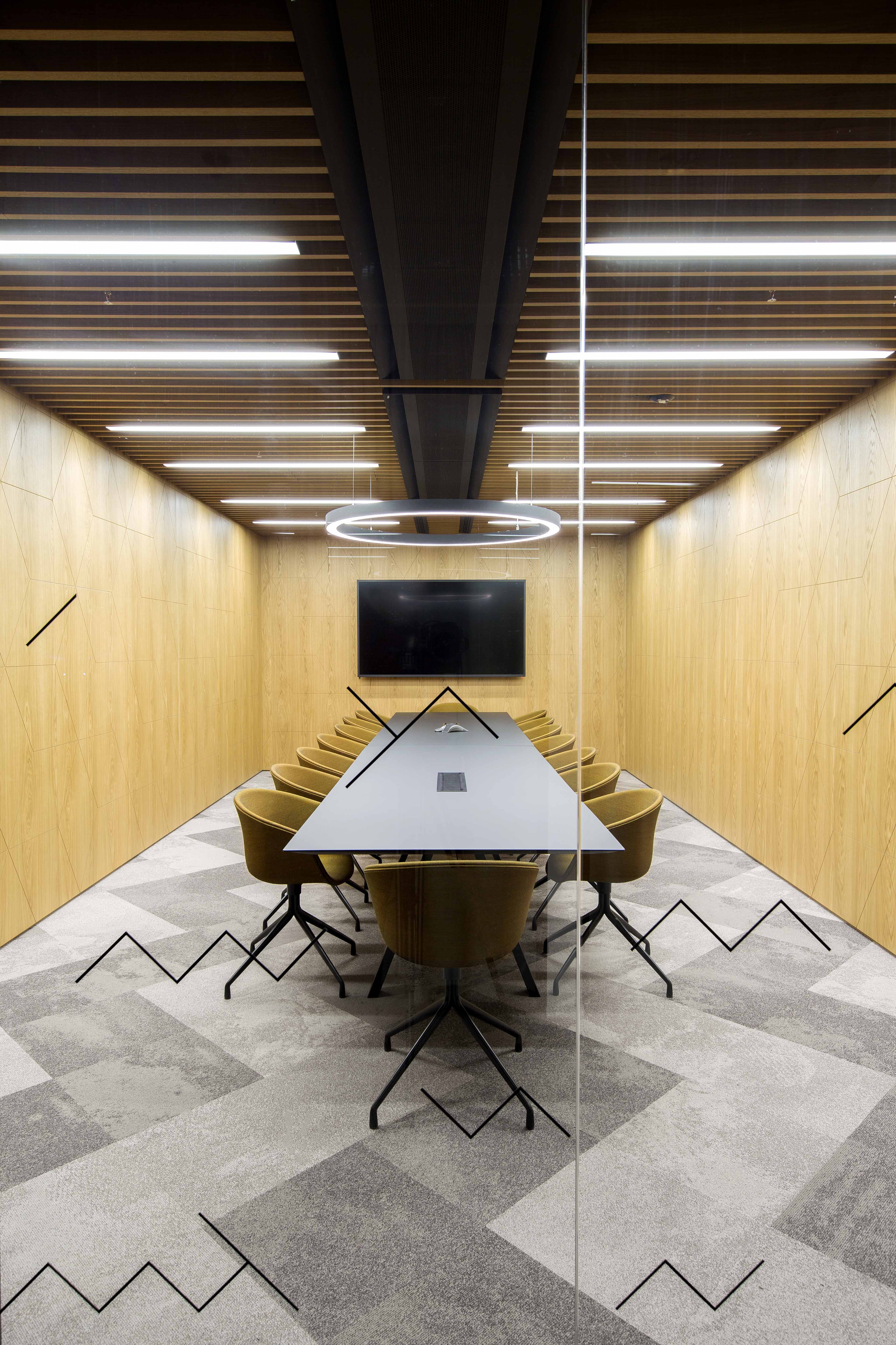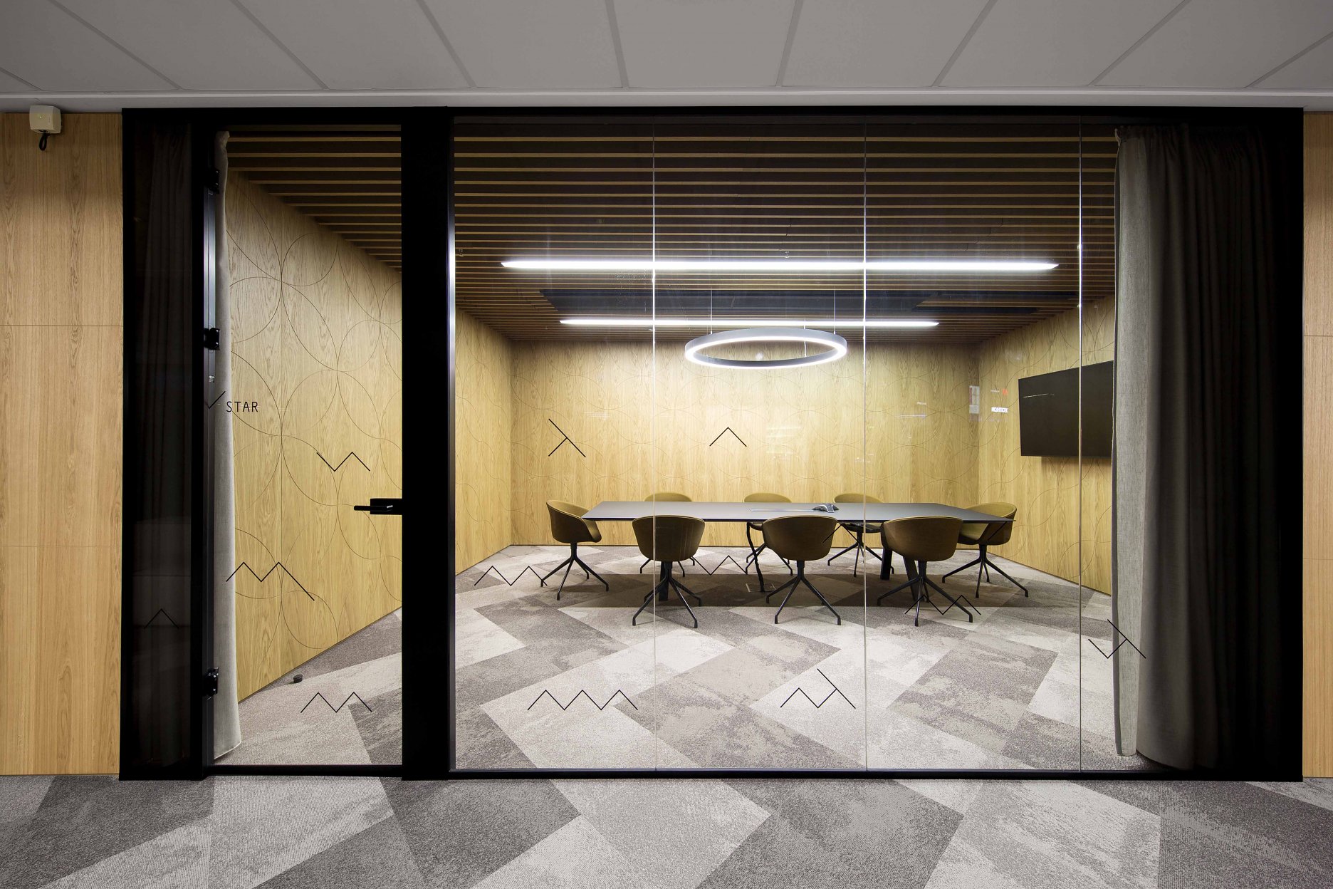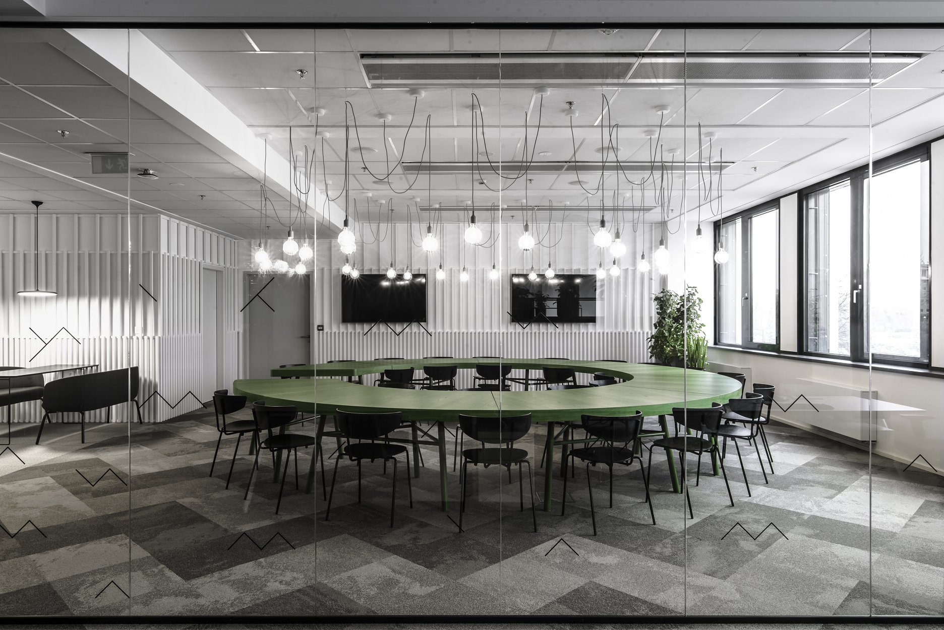 Zasadačky sú navzájom odlíšené geometrickým vzorom vyfrézovaným do dyhovéh obkladu stien. Okolo jadra so zázemím a zasadačkami sa “odvíja” svetlý, bielo-čierny priestor pracoviska.