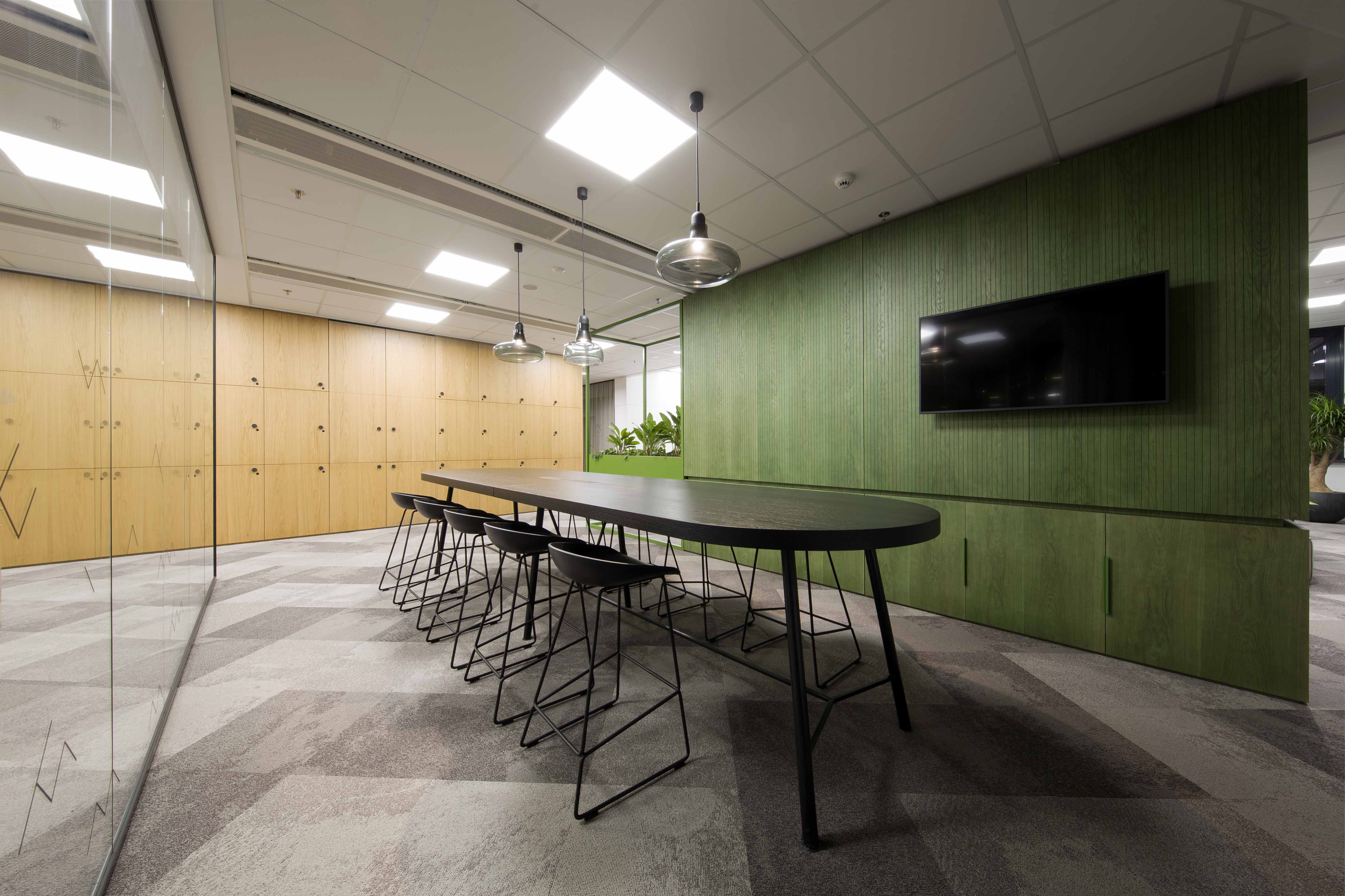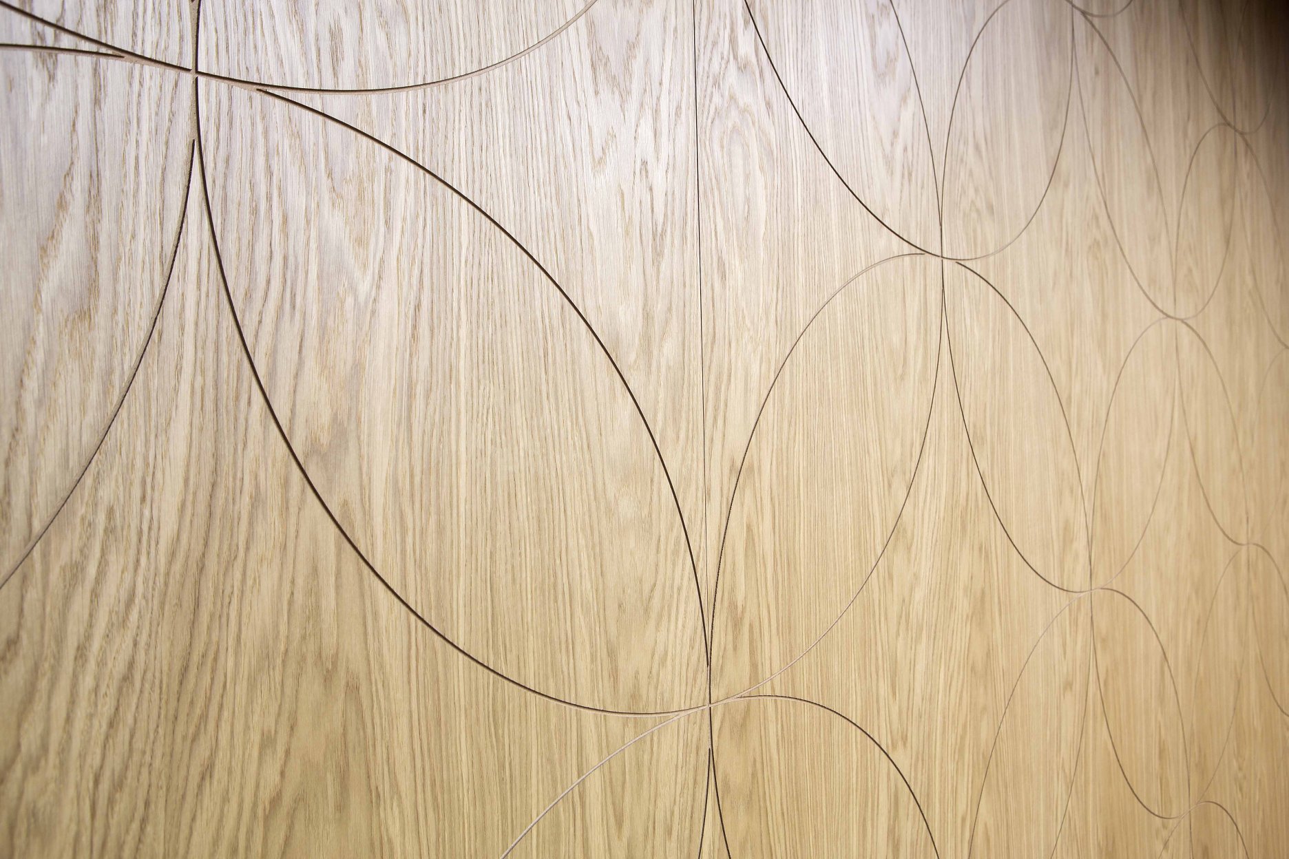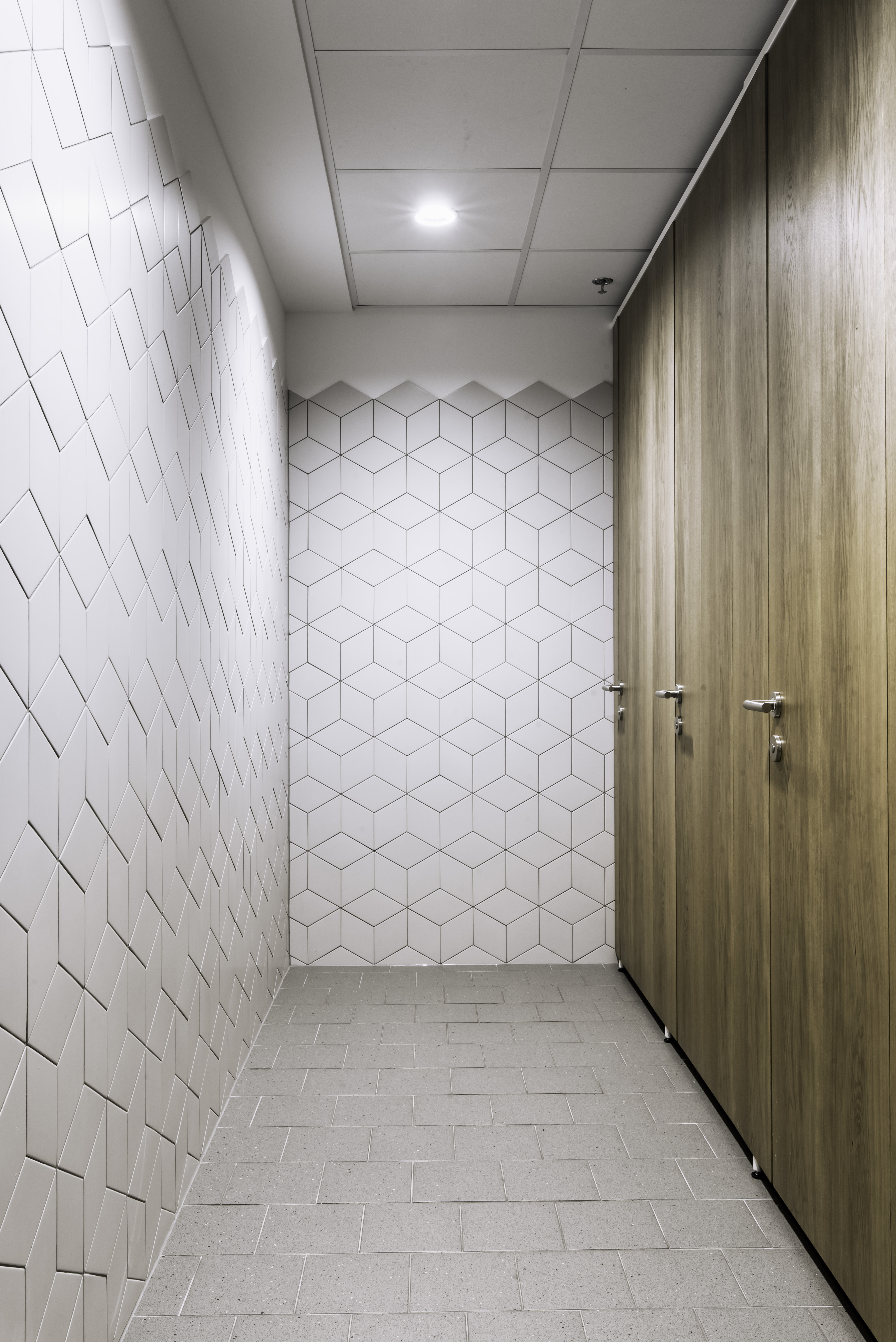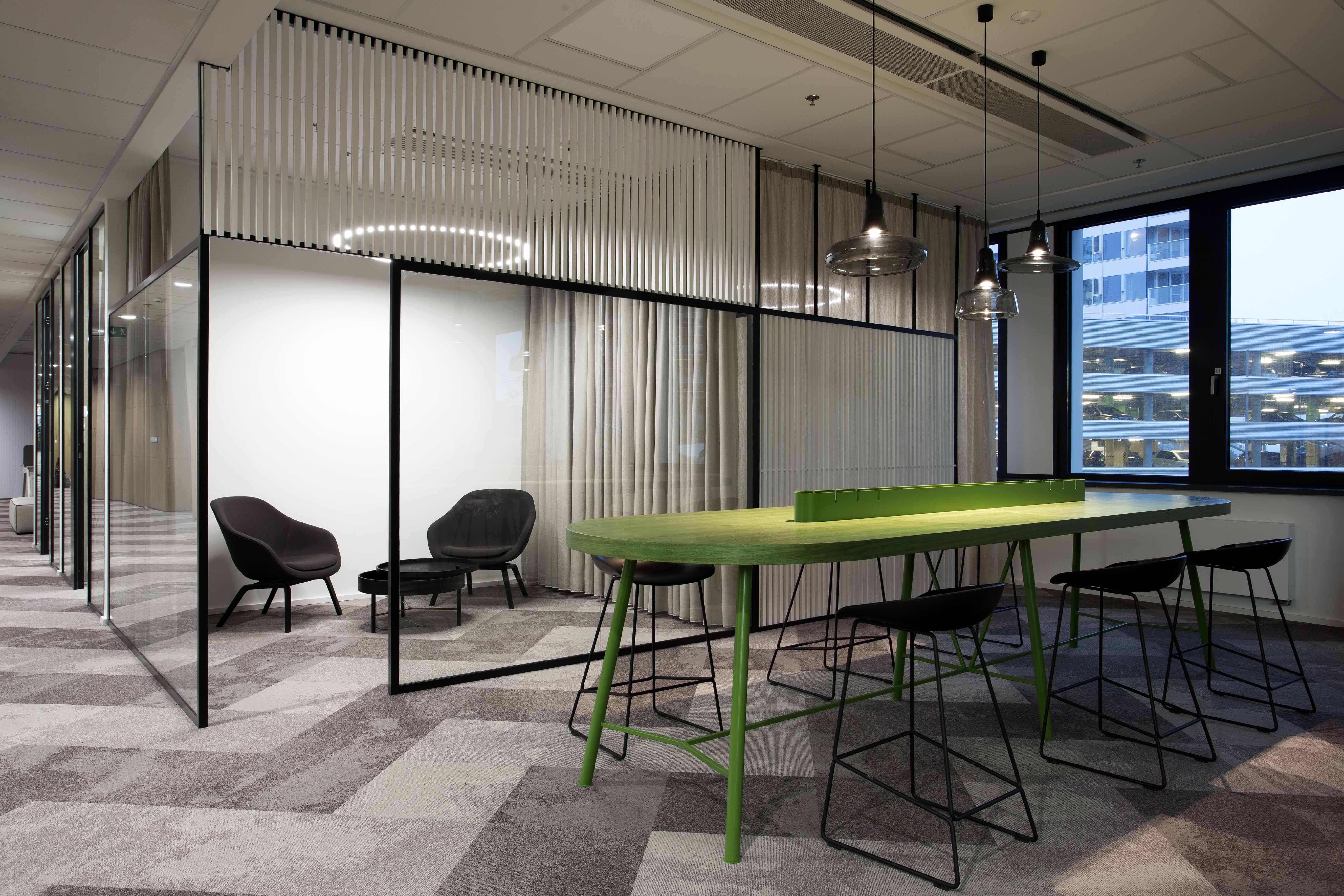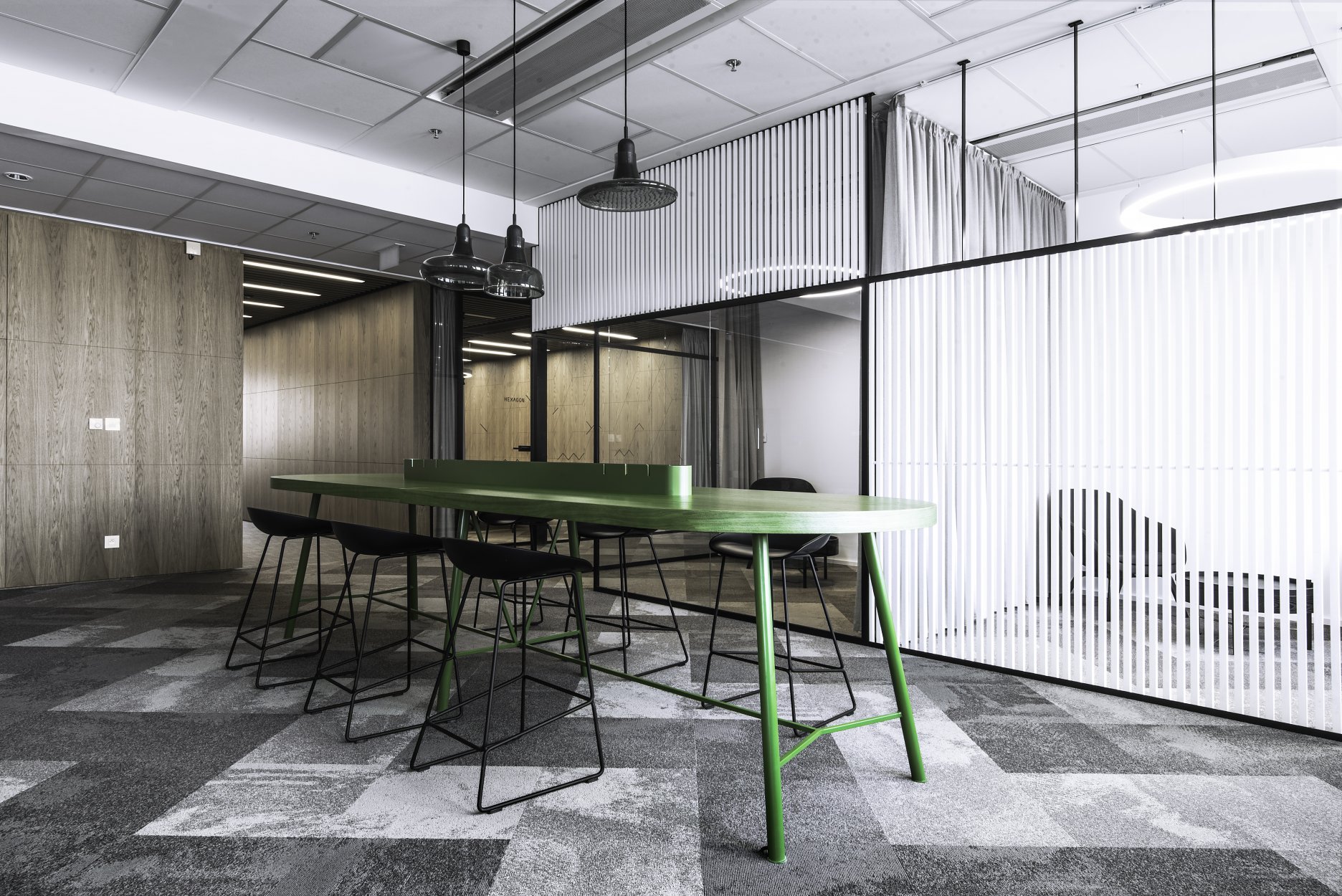 Zasadačky sú navzájom odlíšené geometrickým vzorom vyfrézovaným do dyhovéh obkladu stien. Okolo jadra so zázemím a zasadačkami sa “odvíja” svetlý, bielo-čierny priestor pracoviska.