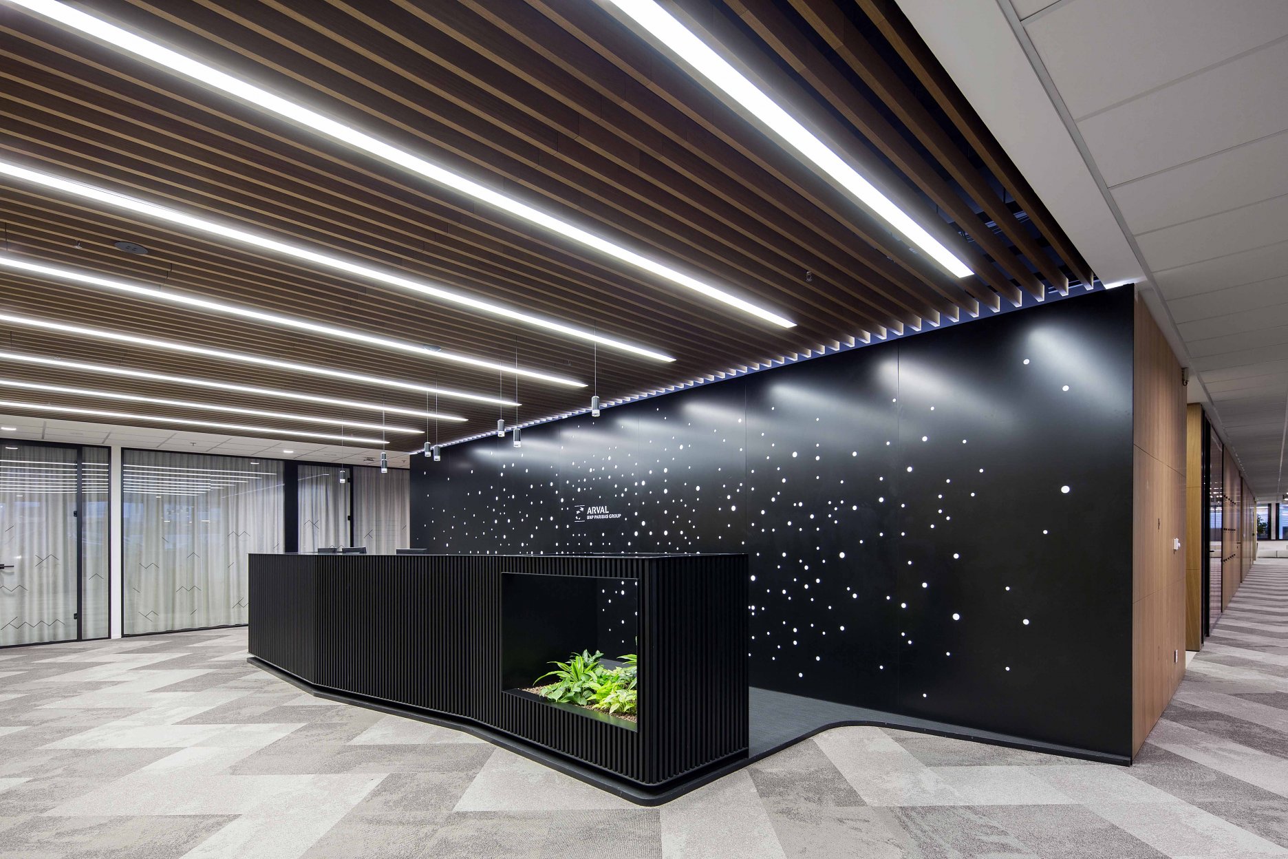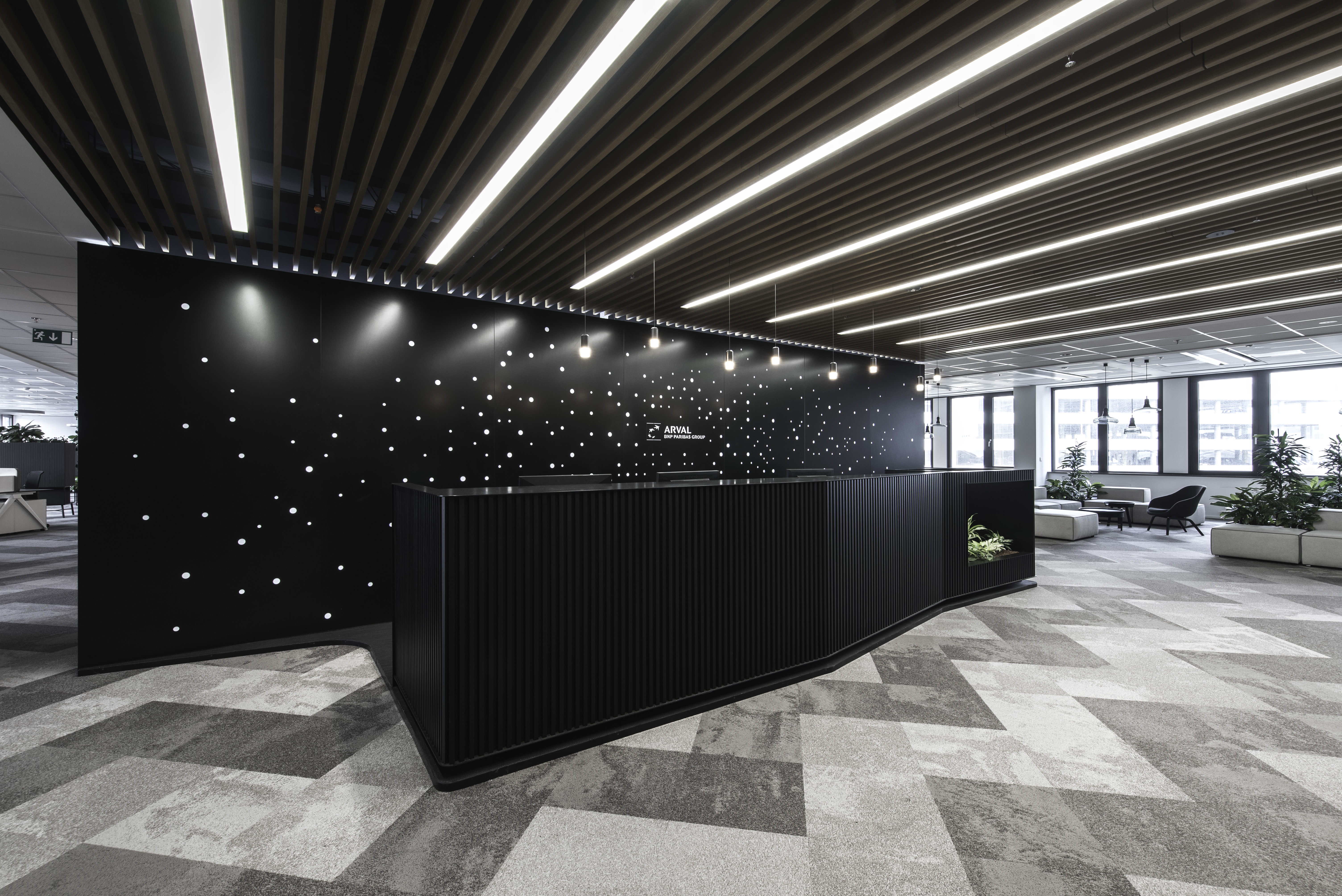 Vstup s recepciou a priľahlou oddychovou zónou (“záhradou”) je charakteristický podsvietenou čiernou stenou s metalickým obkladom a recepčným pultom obloženým čiernymi lamelami. Na ne je napojený oddychový priestor doplnený vysokou zeleňou evokujúcou záhradu. Voľné sedenie a “zelený” barový stôl je určený na neformálne stretnutia a prácu v stoji.