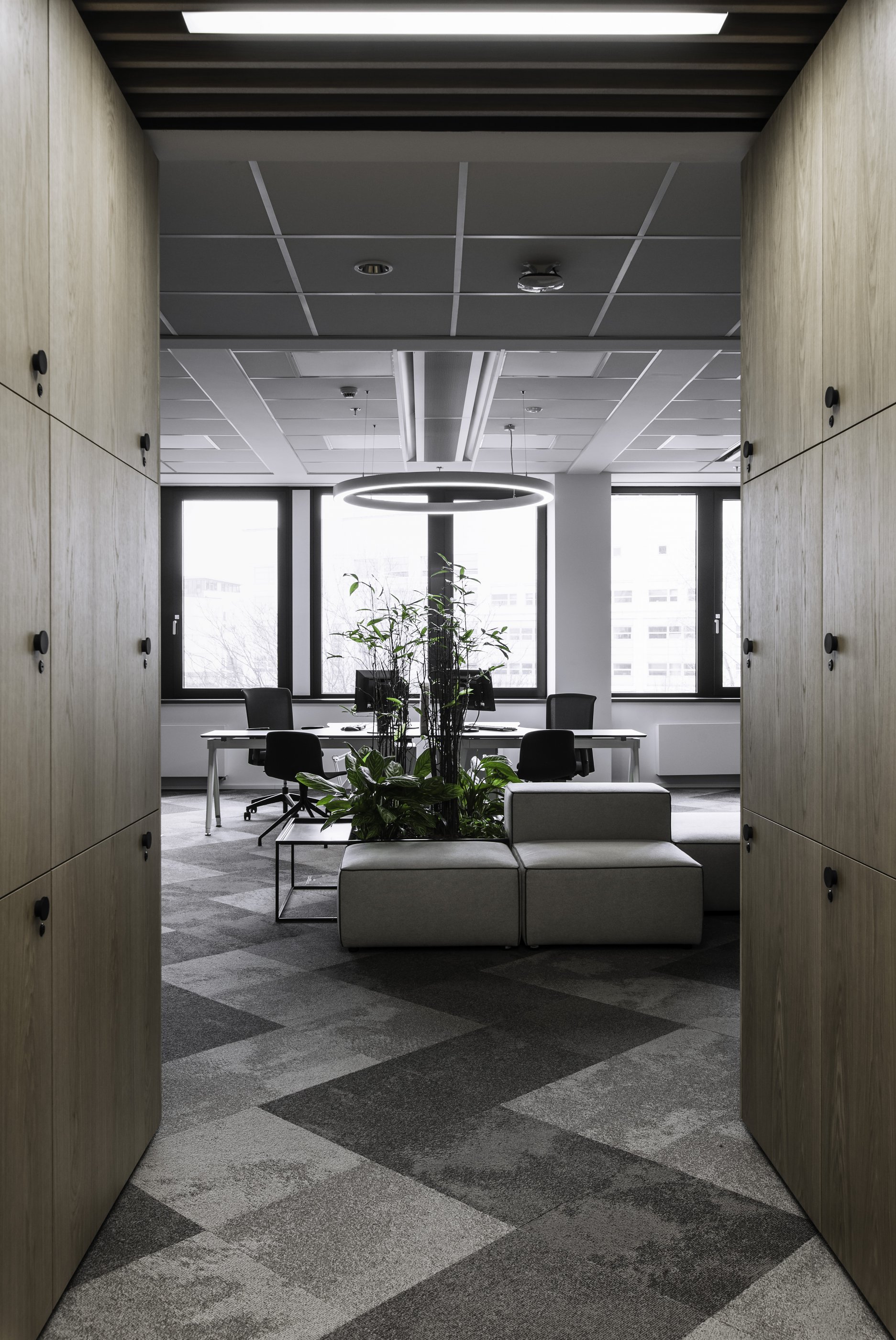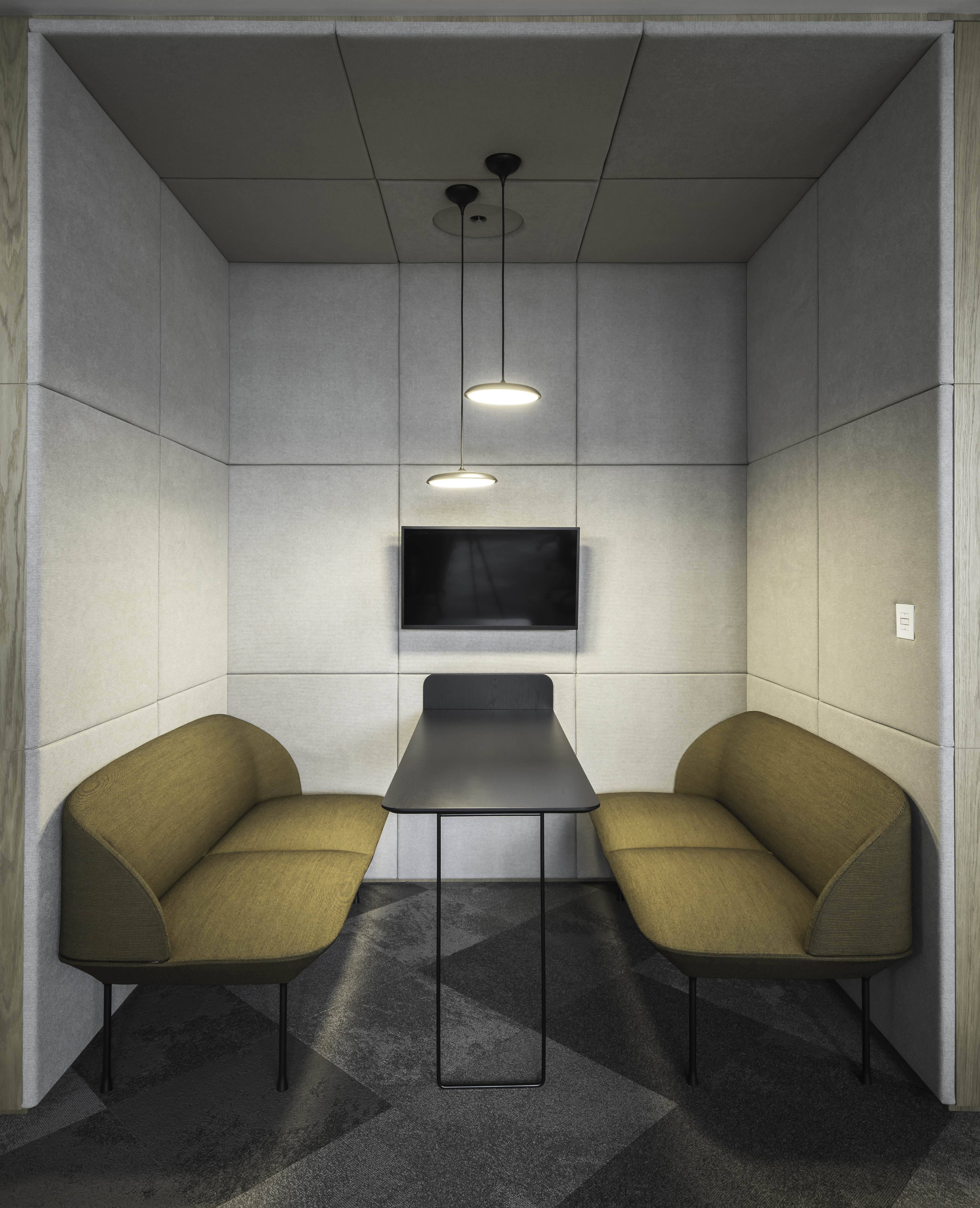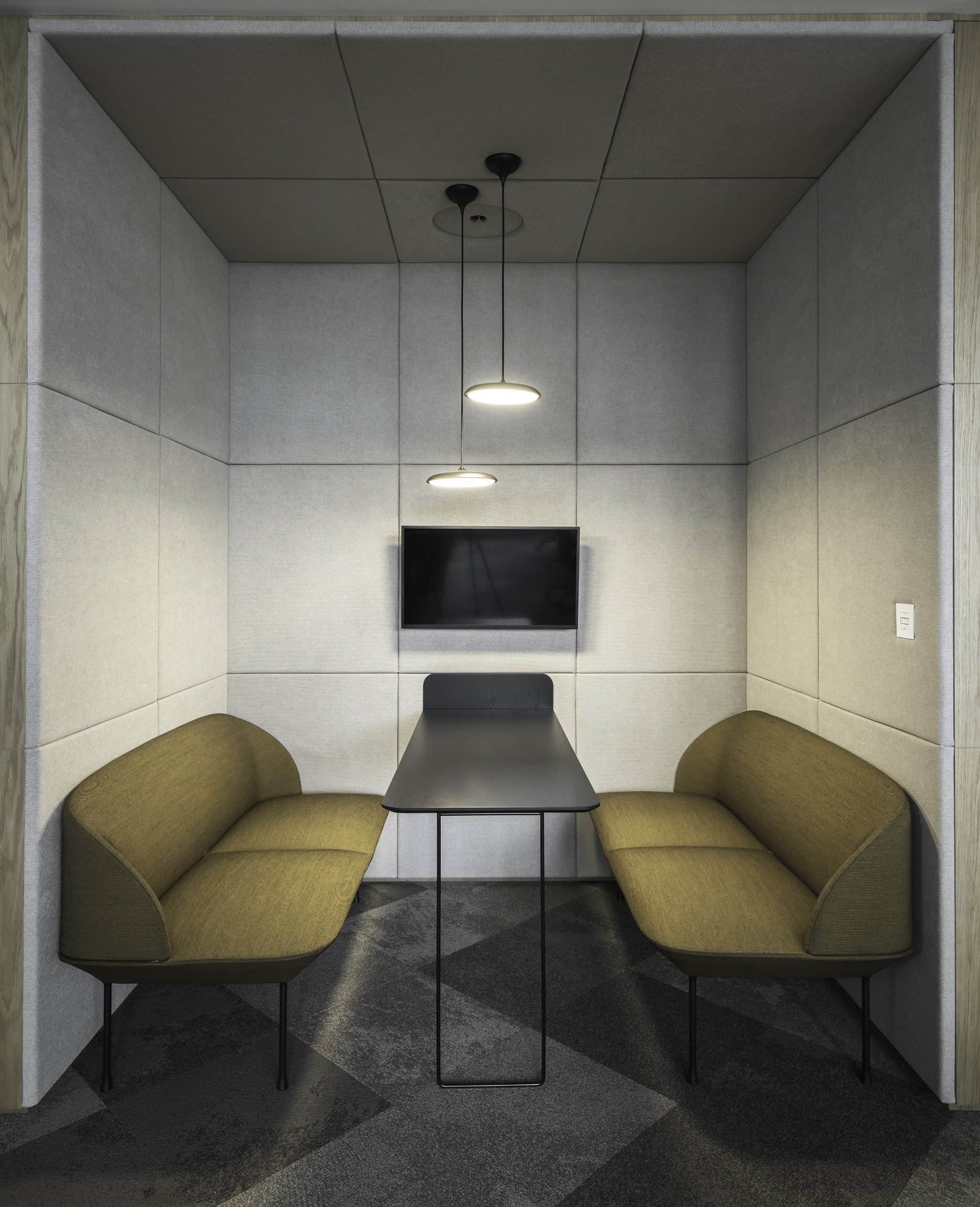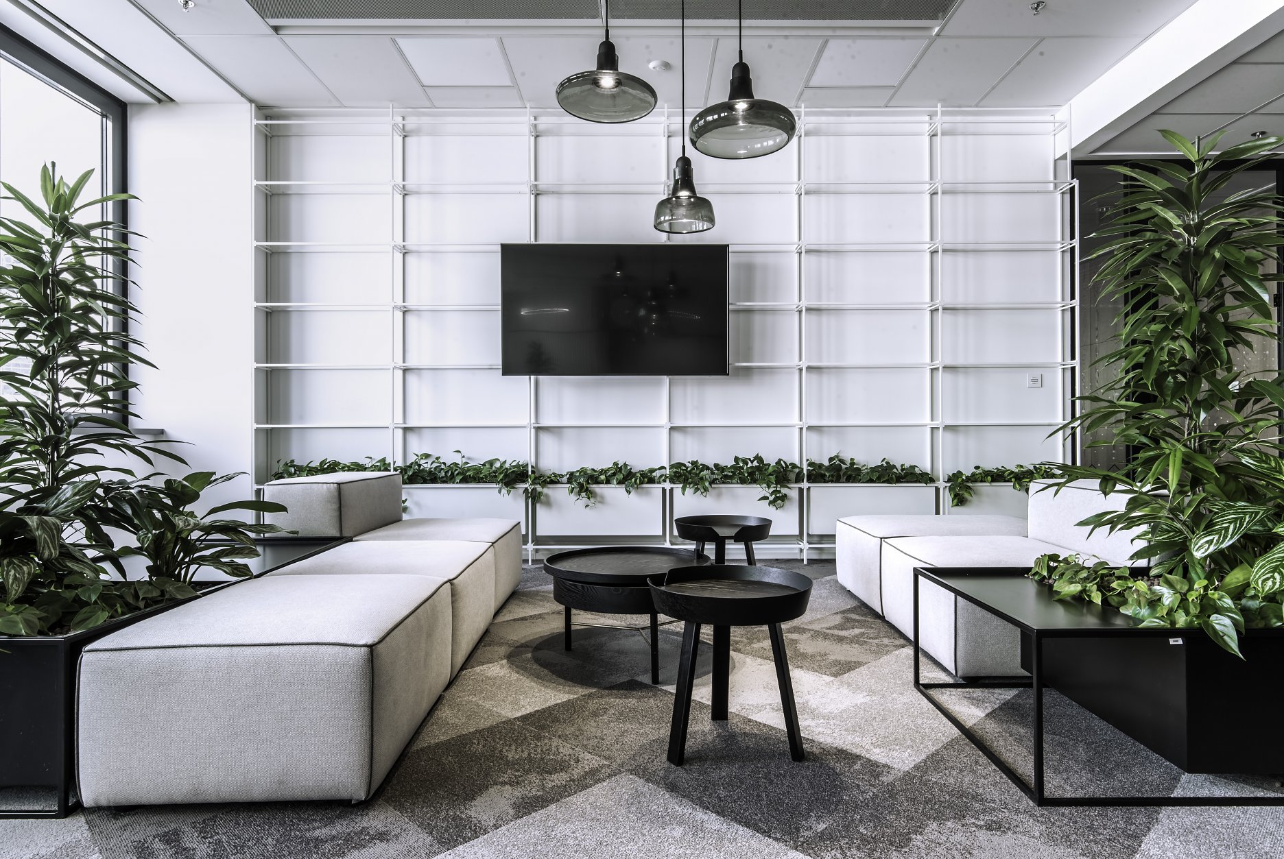 Každé z kancelárskych oddelení je doplnené oddychovou zónou s pohodlným sedením a integrovaným kvetináčom. Priestor je vhodný na rýchly odpočinok či neformálny rozhovor. Nachádza sa tu aj tabuľa integrovaná do bieleho dreveného obkladu steny.