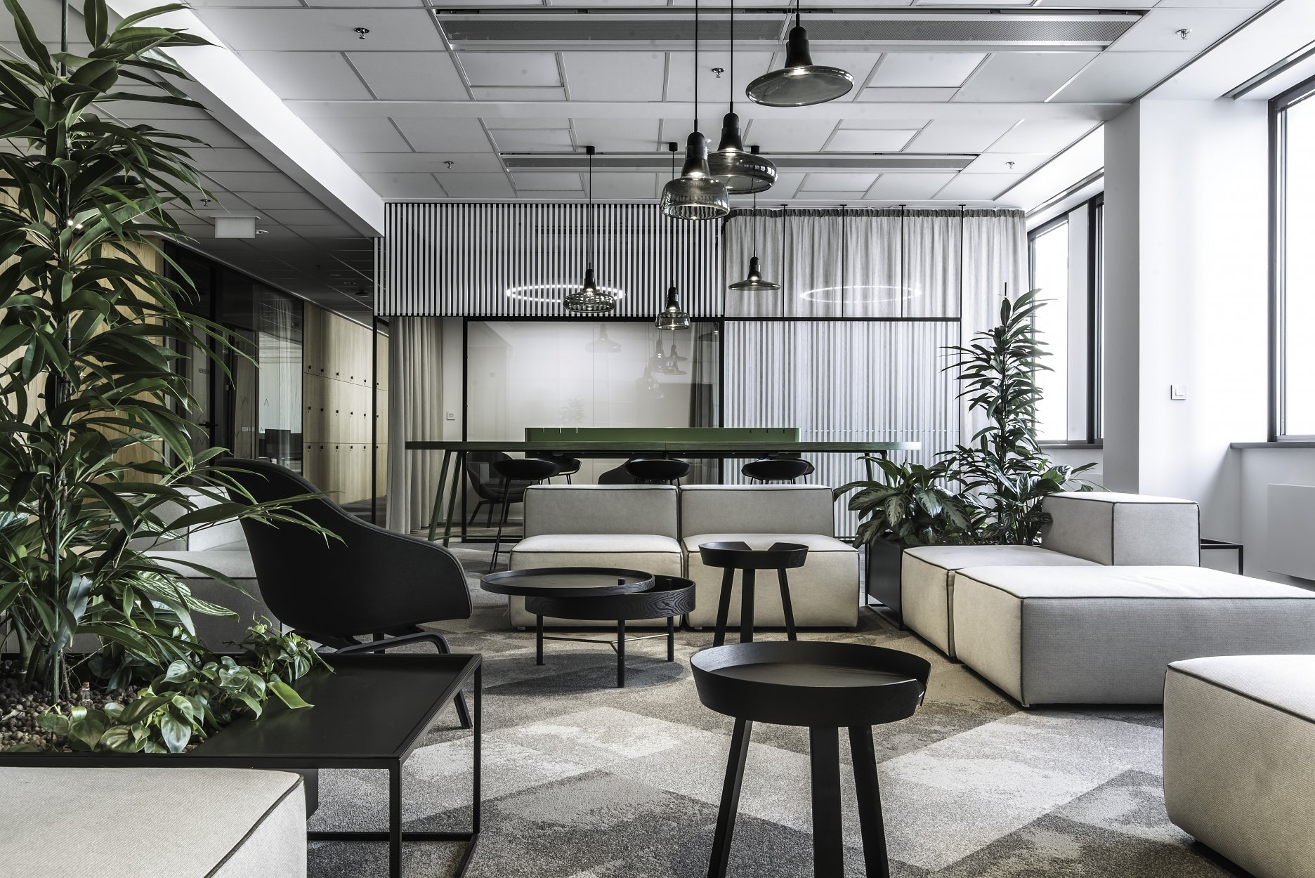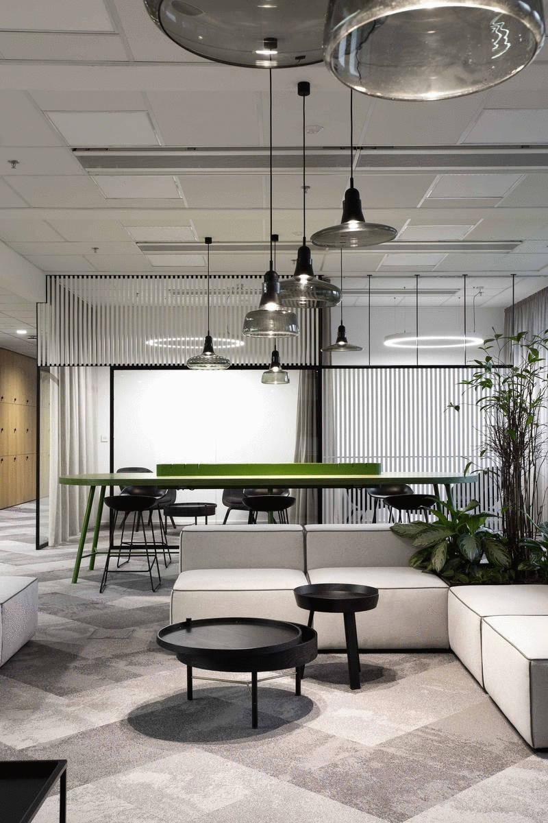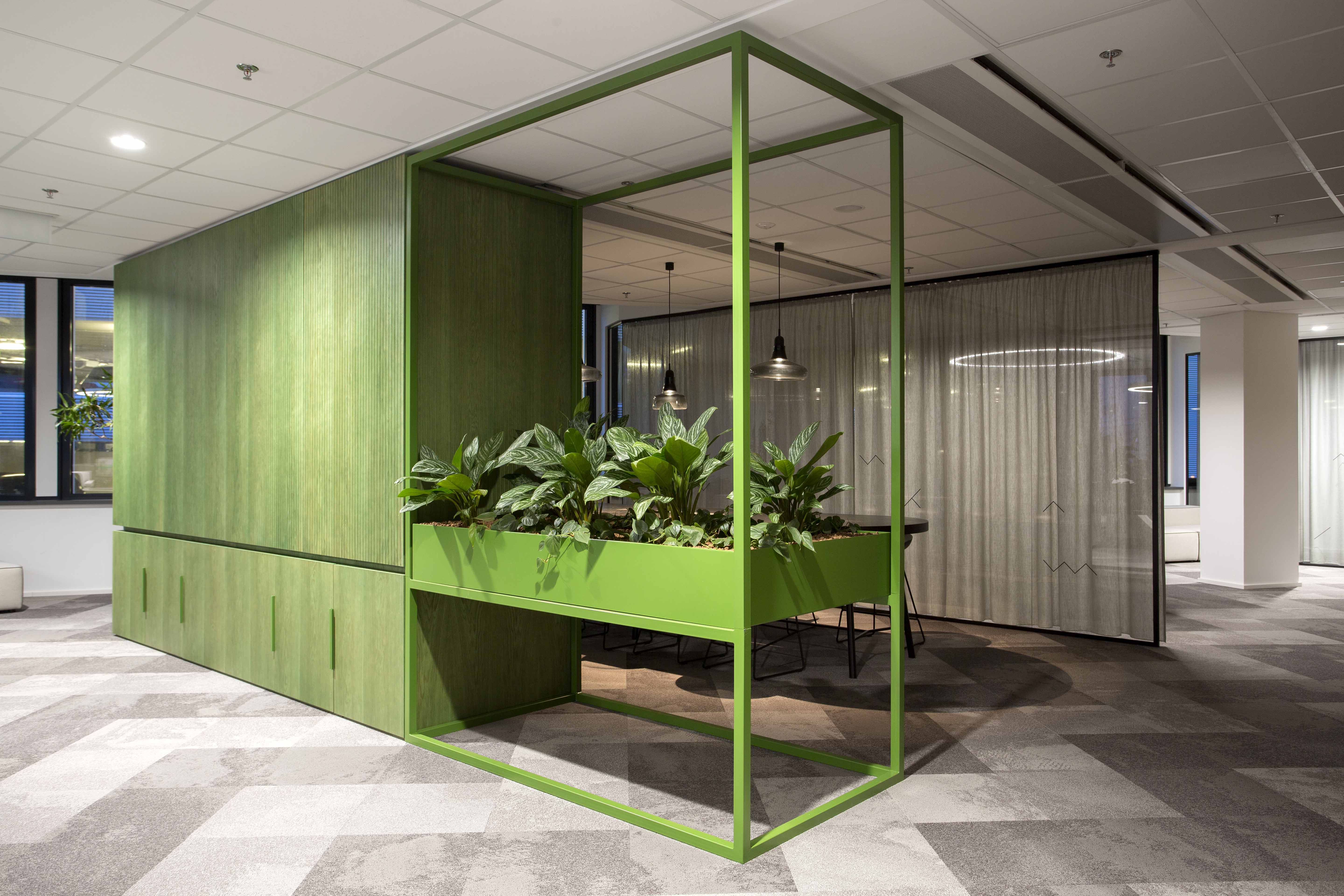 Každé z kancelárskych oddelení je doplnené oddychovou zónou s pohodlným sedením a integrovaným kvetináčom. Priestor je vhodný na rýchly odpočinok či neformálny rozhovor. Nachádza sa tu aj tabuľa integrovaná do bieleho dreveného obkladu steny.