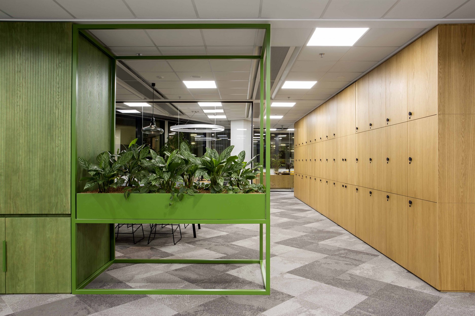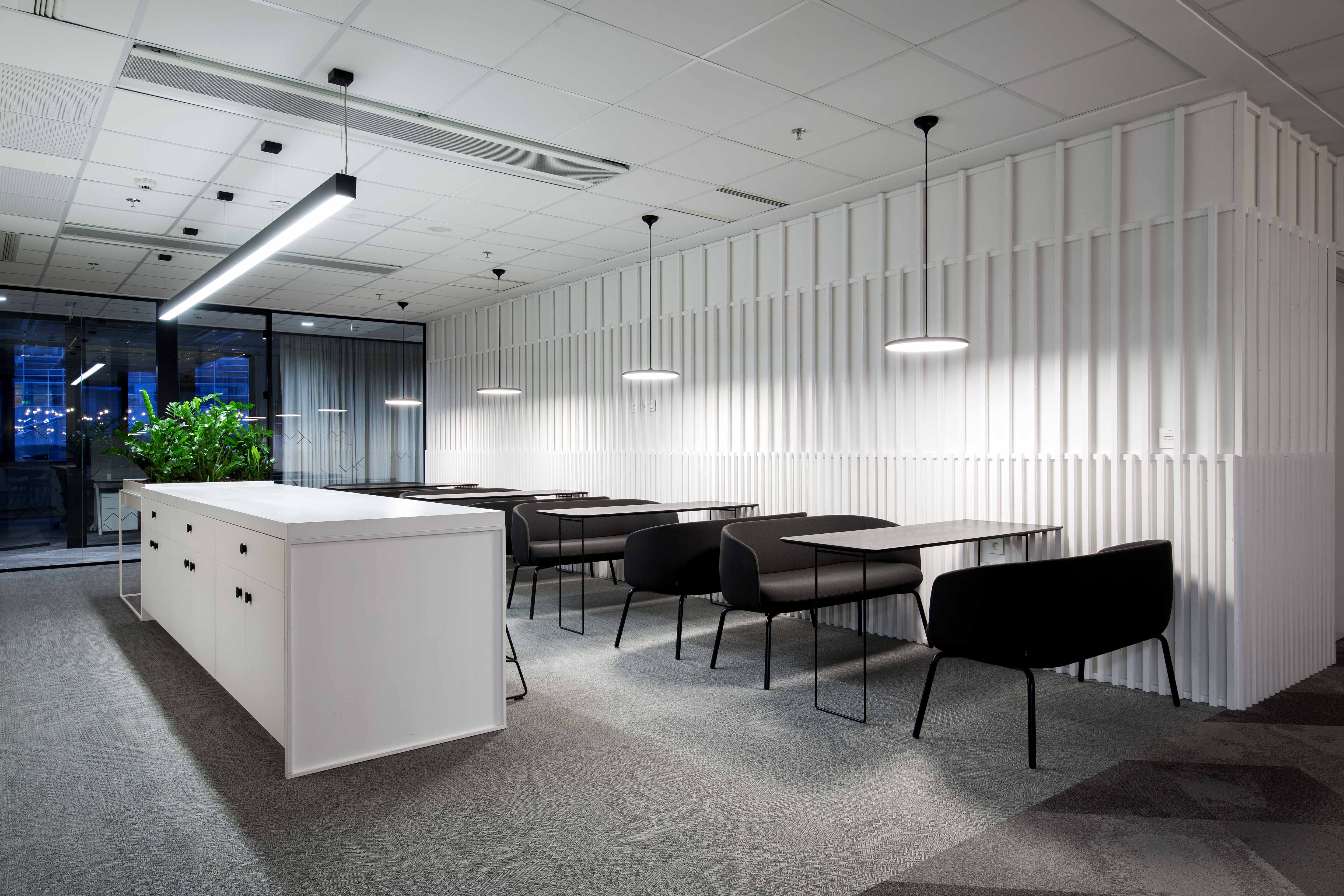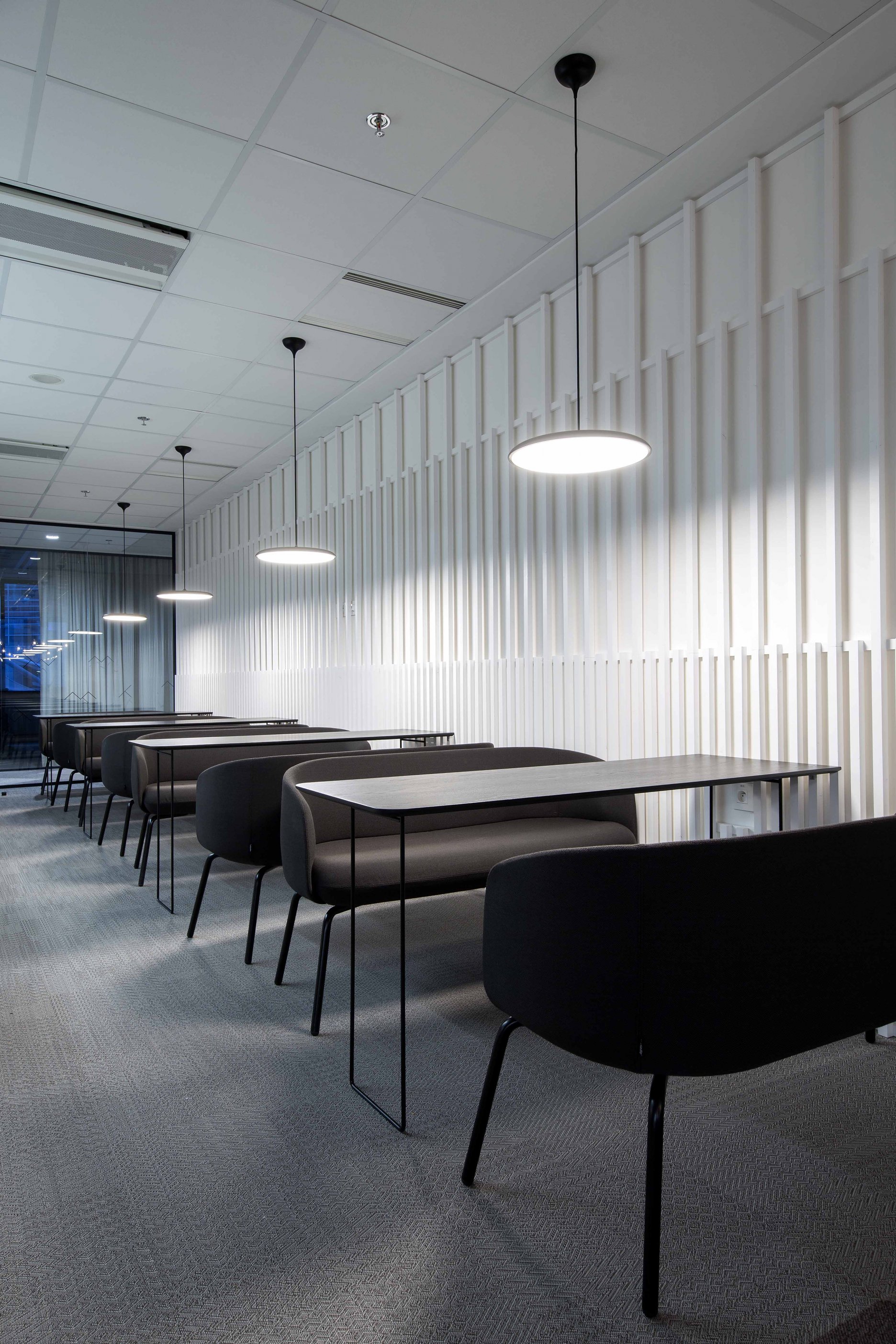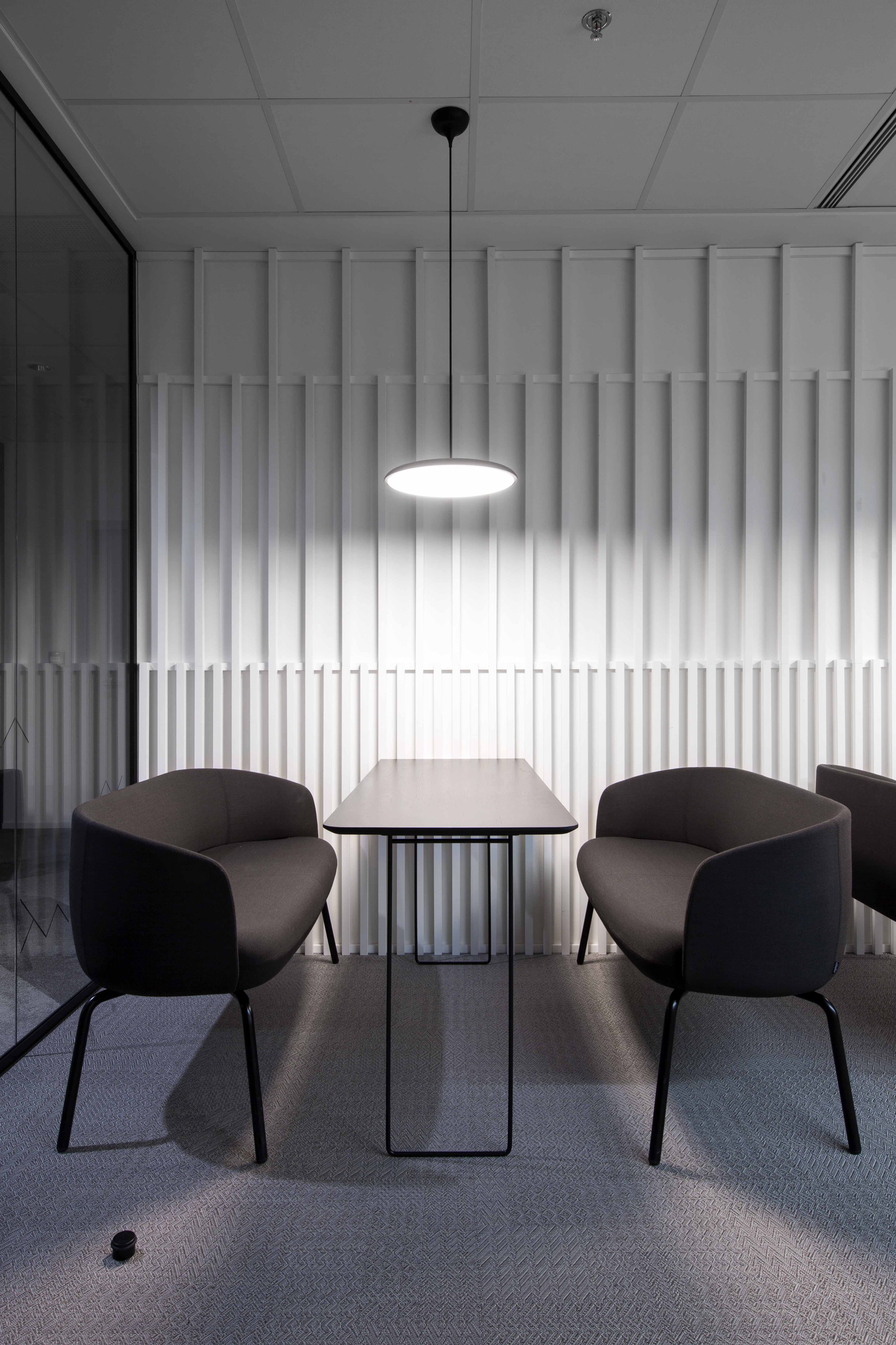 Každé z kancelárskych oddelení je doplnené oddychovou zónou s pohodlným sedením a integrovaným kvetináčom. Priestor je vhodný na rýchly odpočinok či neformálny rozhovor. Nachádza sa tu aj tabuľa integrovaná do bieleho dreveného obkladu steny.