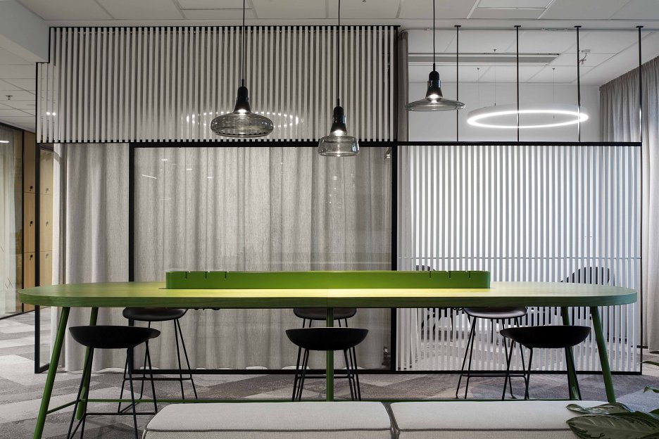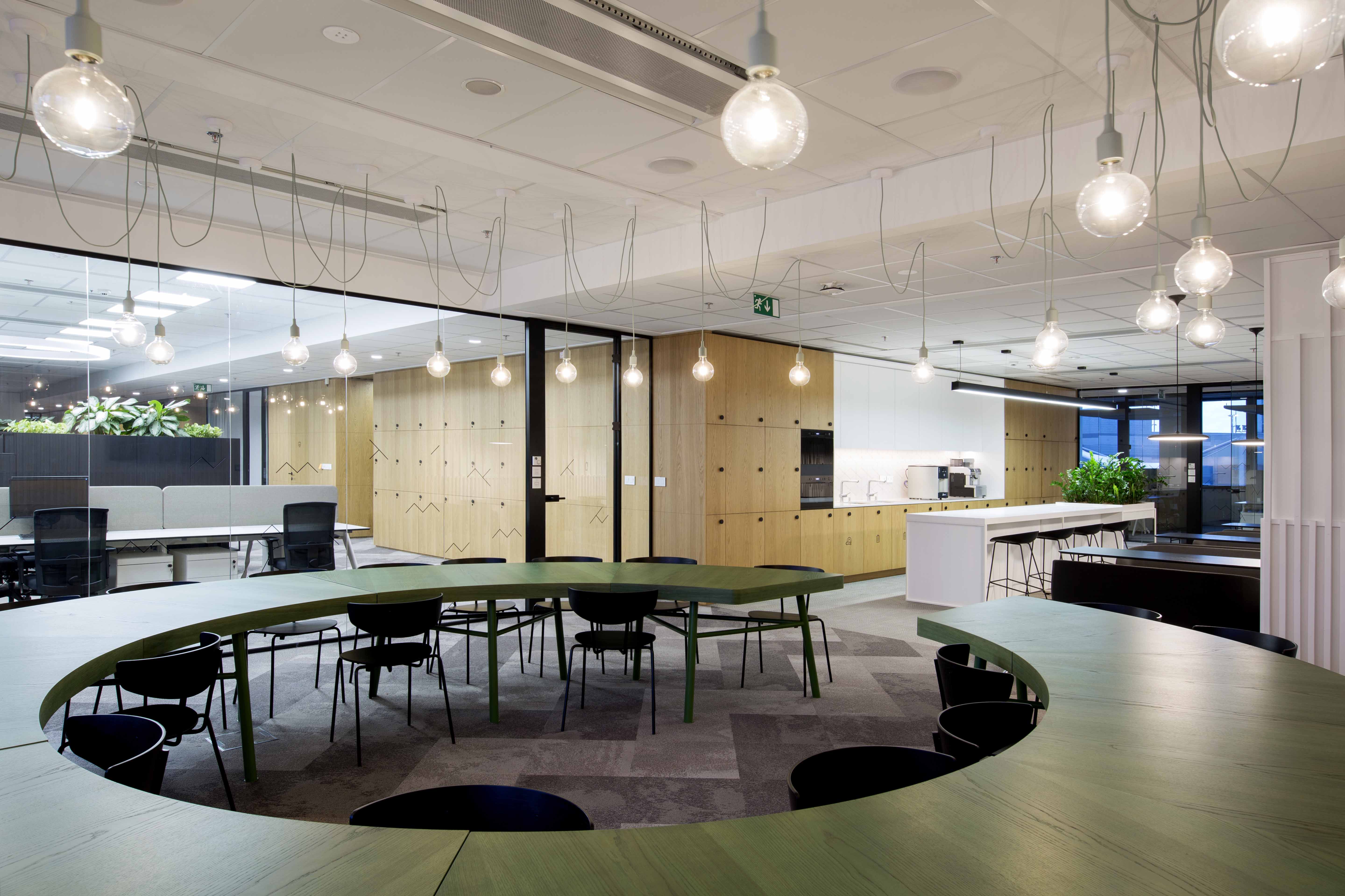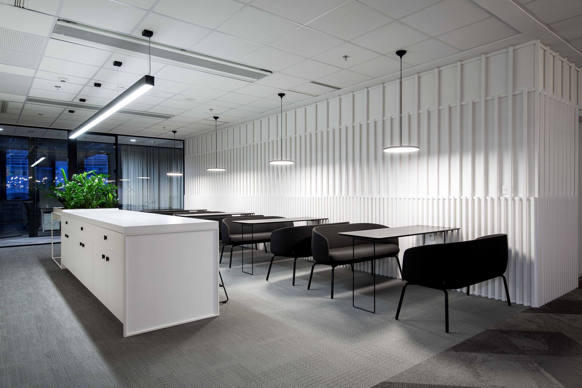 "Jedáleň" je zároveň zasadačkou, ktorá slúži na spoločné celofiremné stretnutia. V strede miestnosti je okrúhly modulový stôl, ktorý je v prípade potreby možné preskladať do ľubovoľnej konfigurácie (pri príležitosti prezentácií). Drevený biely lamelový obklad spoločne s “lustrom” zo žiaroviek dotvára neformálnu atmosféru.