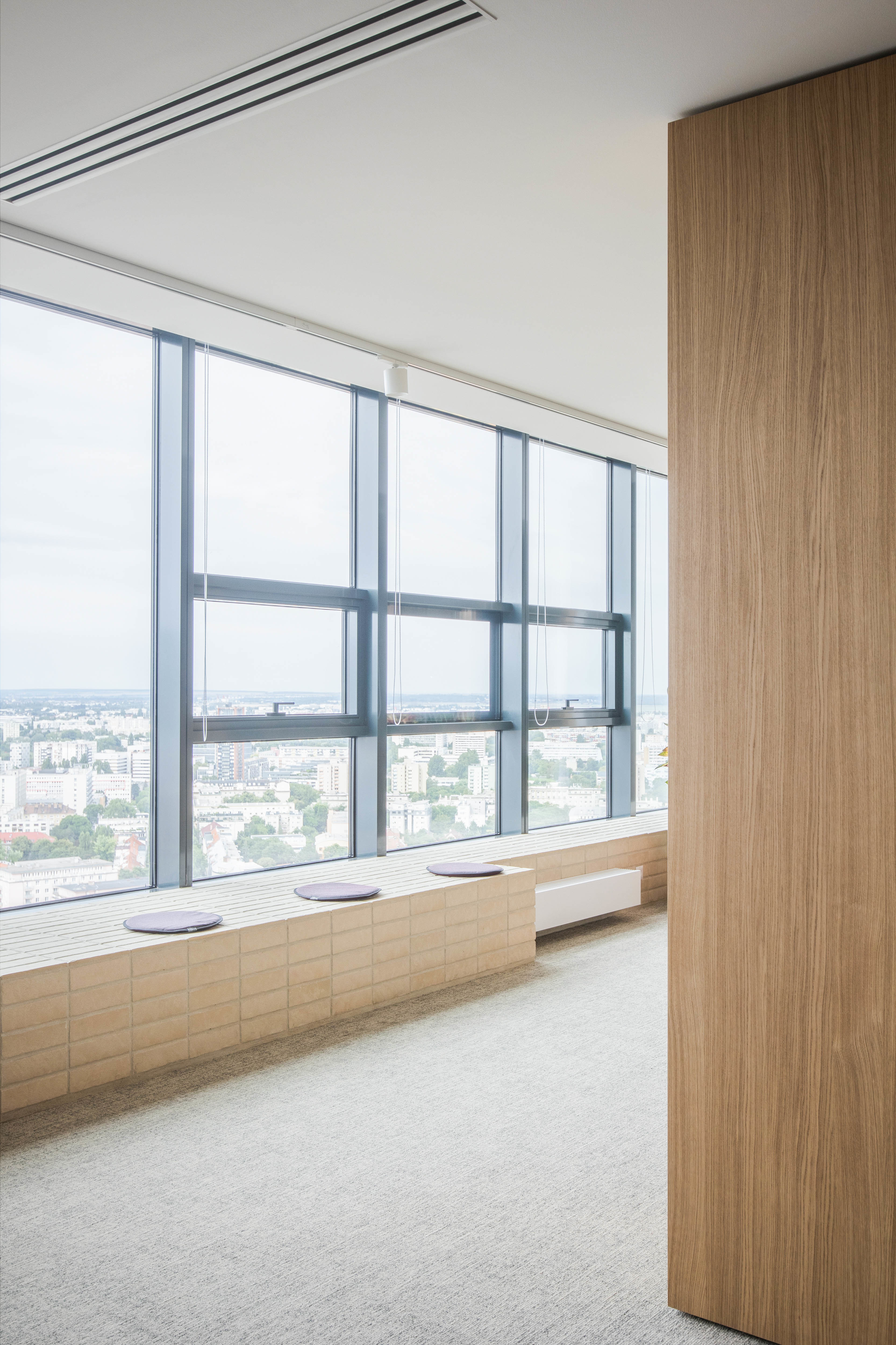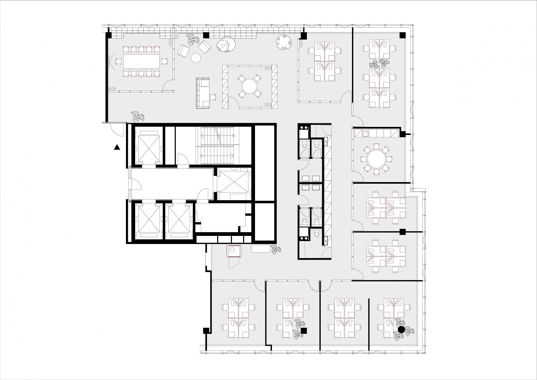Priestor tvoria dva celky. Vstupná časť s recepciou a nadvädzujúcimi zasadačkami je určená pre klientov a návštevy, prípadne pracovné a polopracovné stretnutia. Zvyšok zaberajú jednotlivé, obsaho veľmi podobné, kancelárie. Medzi špecifické prvky patria sférické stropné svietidlá, ktoré umožňujú meniť atmosféru pracoviska. Centrálnu časť dispozície tvorí jadro, ktoré integruje technické, hygienické a úložné priestory.