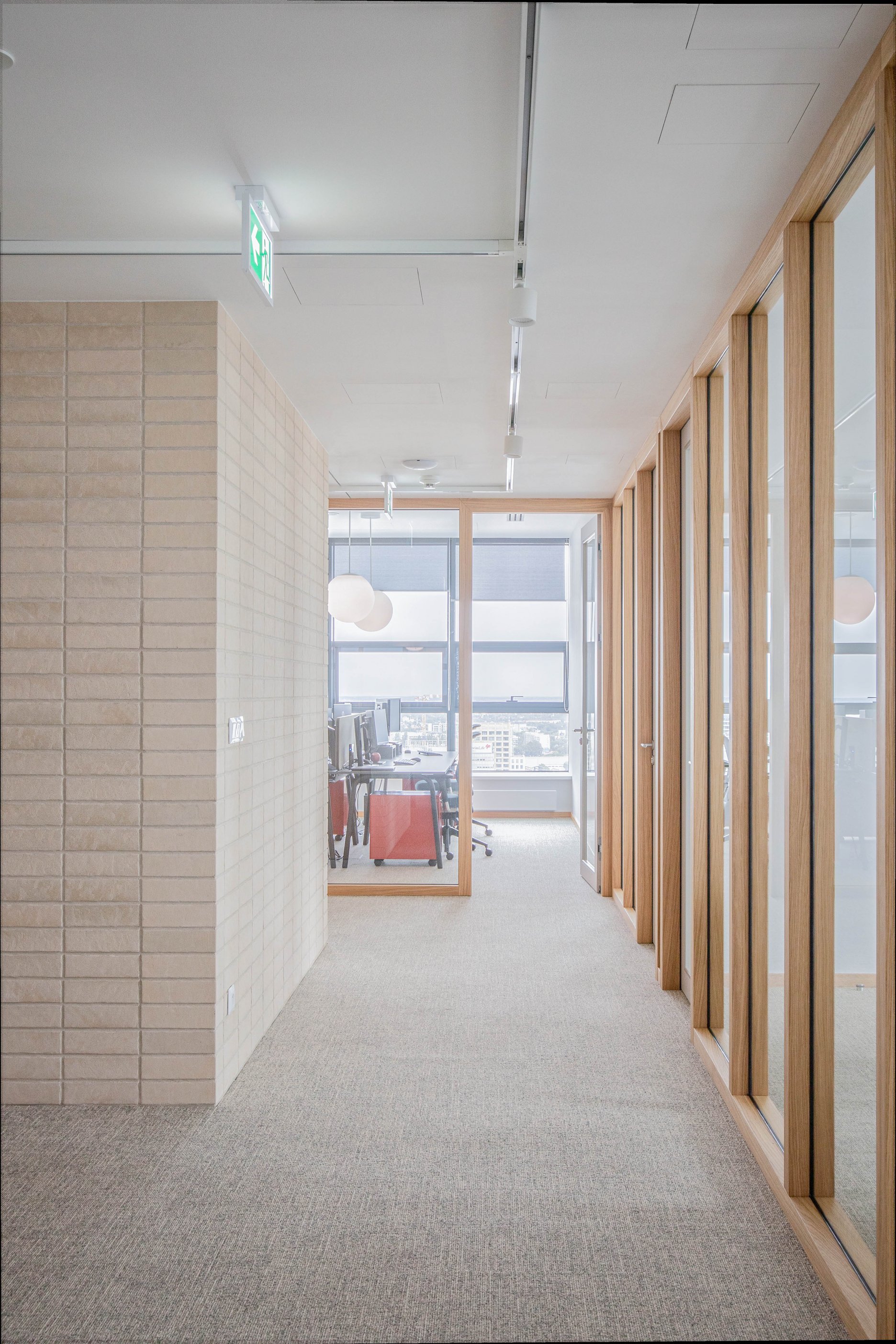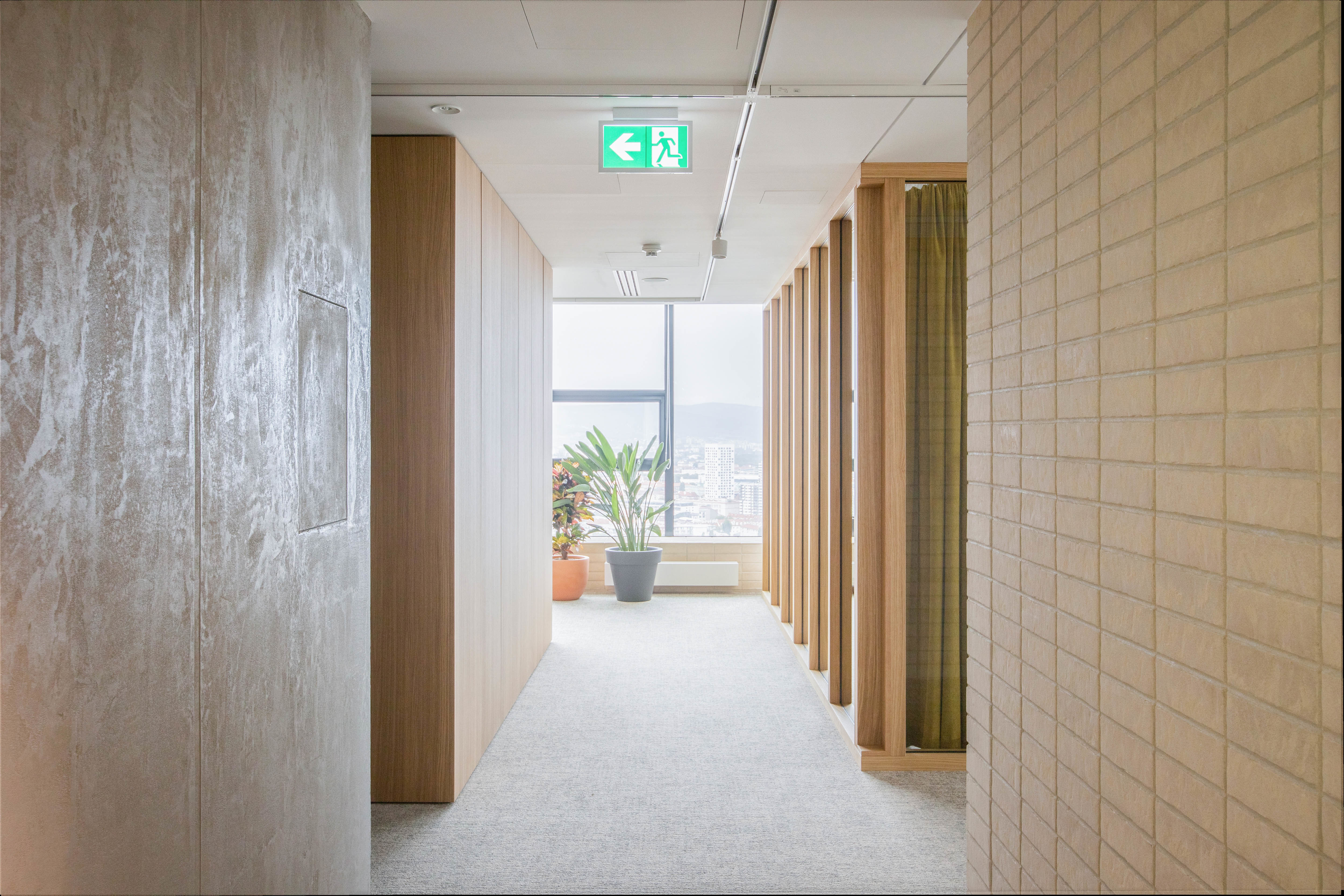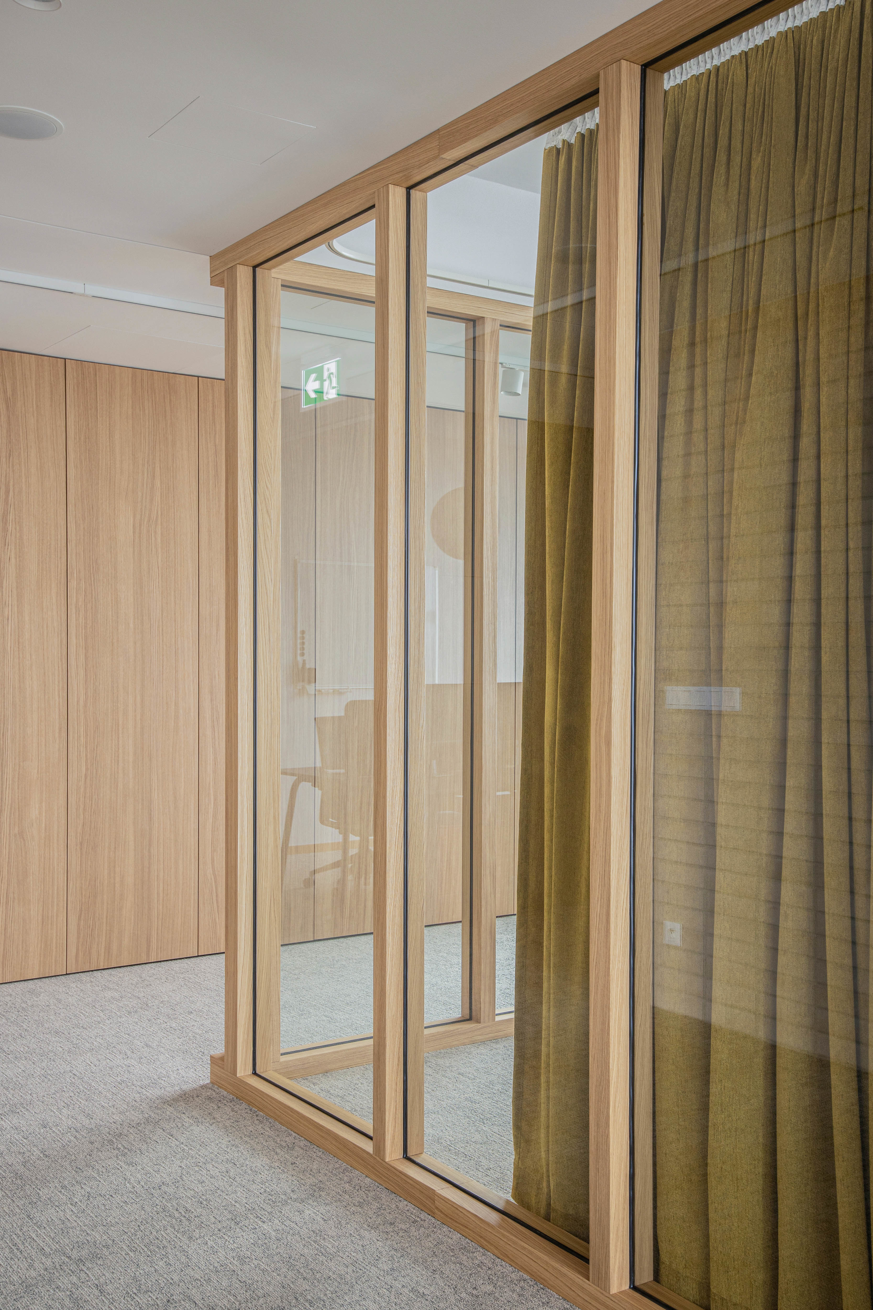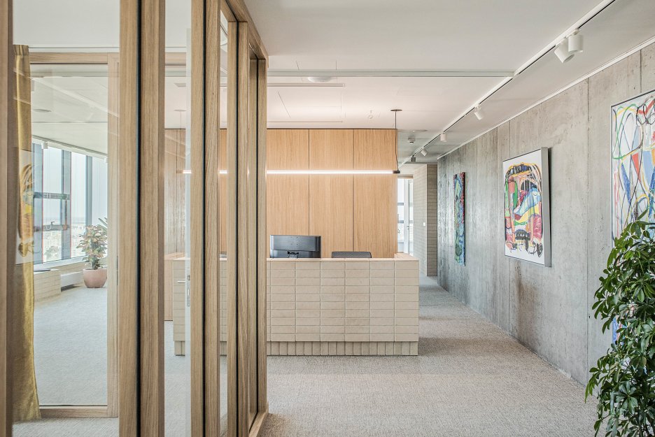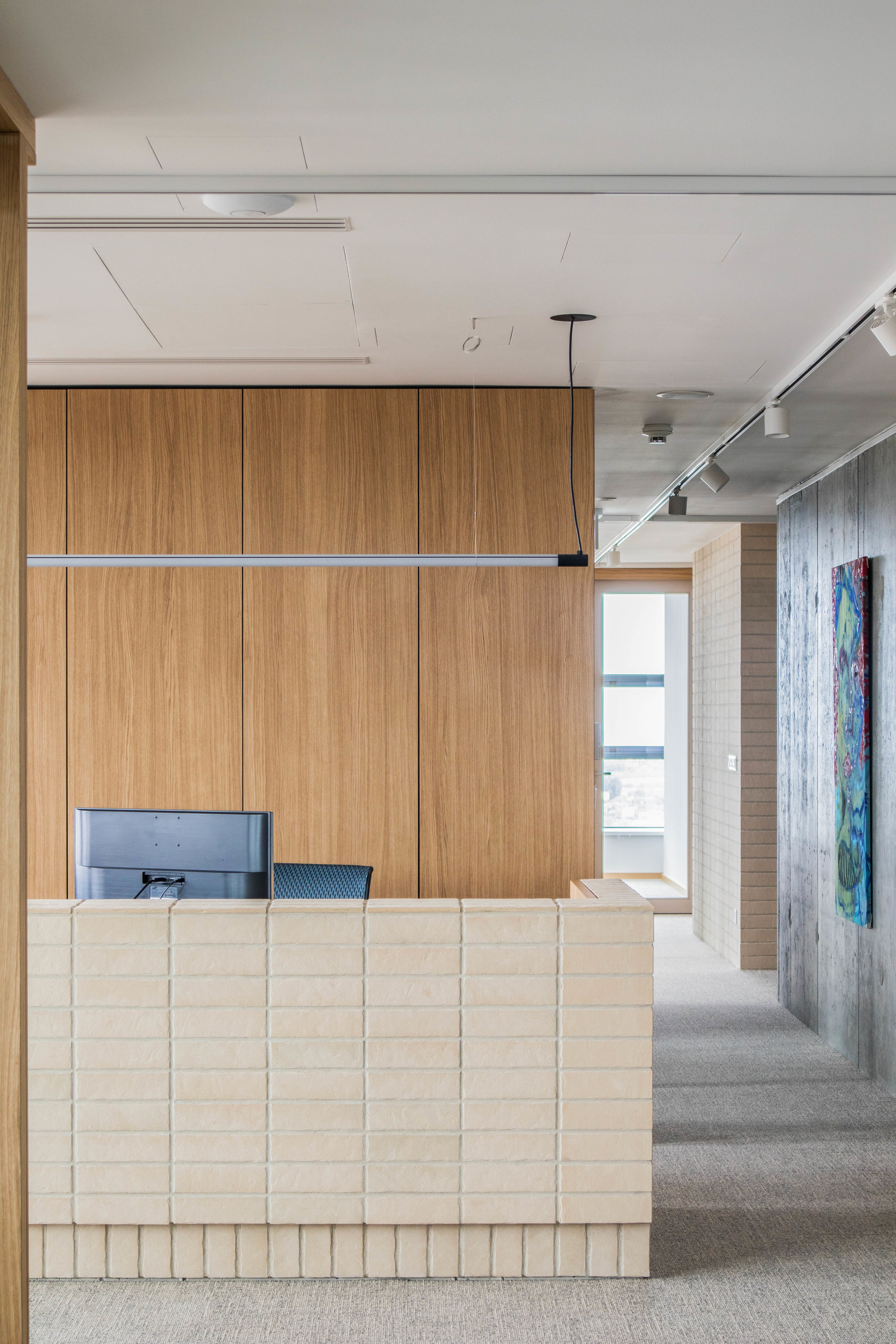 V interiéri prevláda decentná materialita, primárne dubová dyha a tehlový obklad. Dyhu sme použili na rámoch sklenených deliacich priečok, ako aj na jadre spolu s tehlovým obkladom, do ktorého je obalený taktiež recepčný pult a parapet. Stenu, ktorá delí kanceláriu aj vertikálne jadro sme ponechali v priznanej podobe. Investor využil betónový povrch ako výstavnú plochu, kde na ňu pribudlo viacero farebných obrazov. Čierny mobiliár s farebnými akcentami tvorí kontrast k prevažujúcim tlmeným a teplým tónom, ktoré podčiarkujú textilné prvky. Závesy majú súčasne akustickú funkciu a slúžia aj ako možná vizuálna bariéra, dopĺňajúca transparentné sklenené priečky.