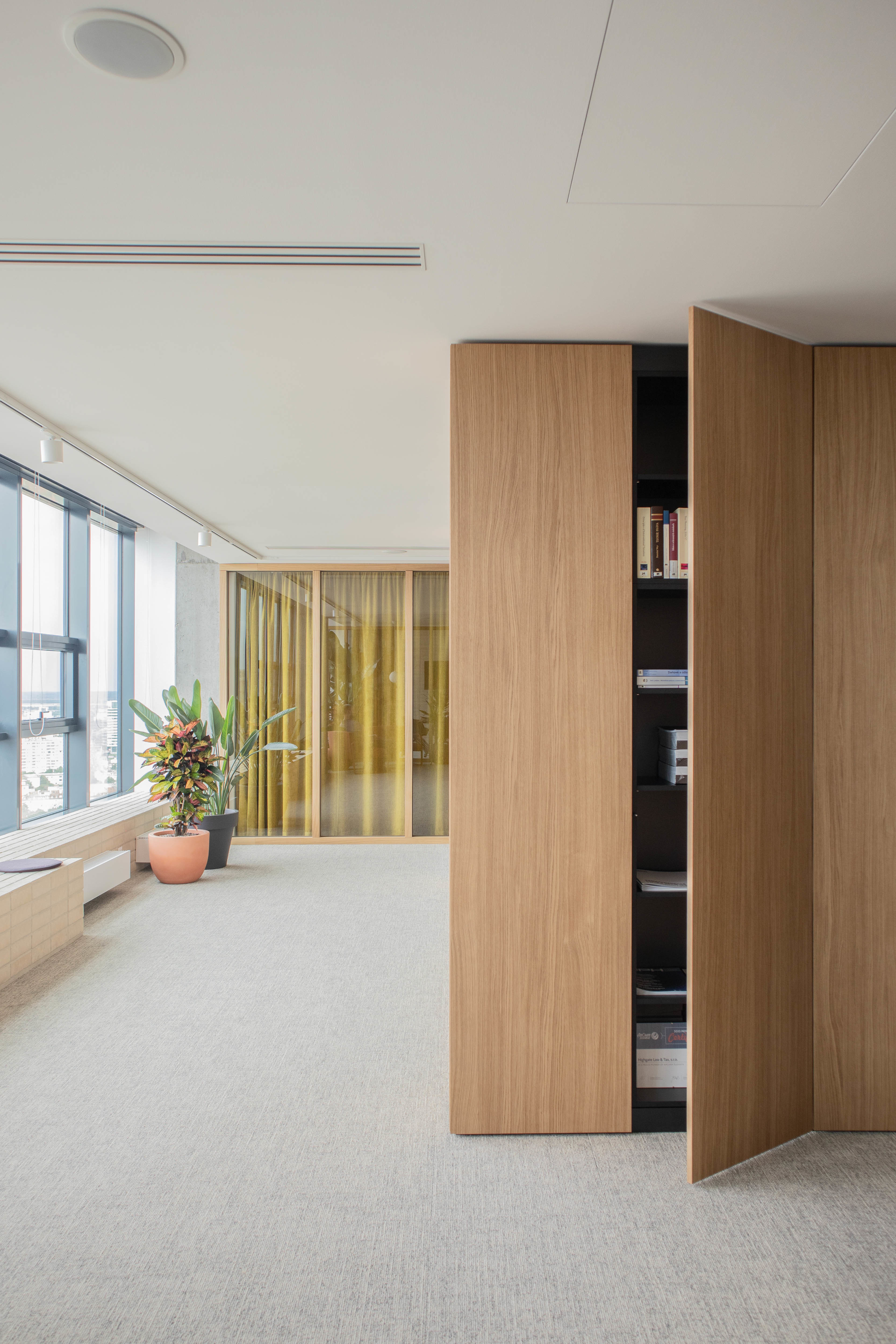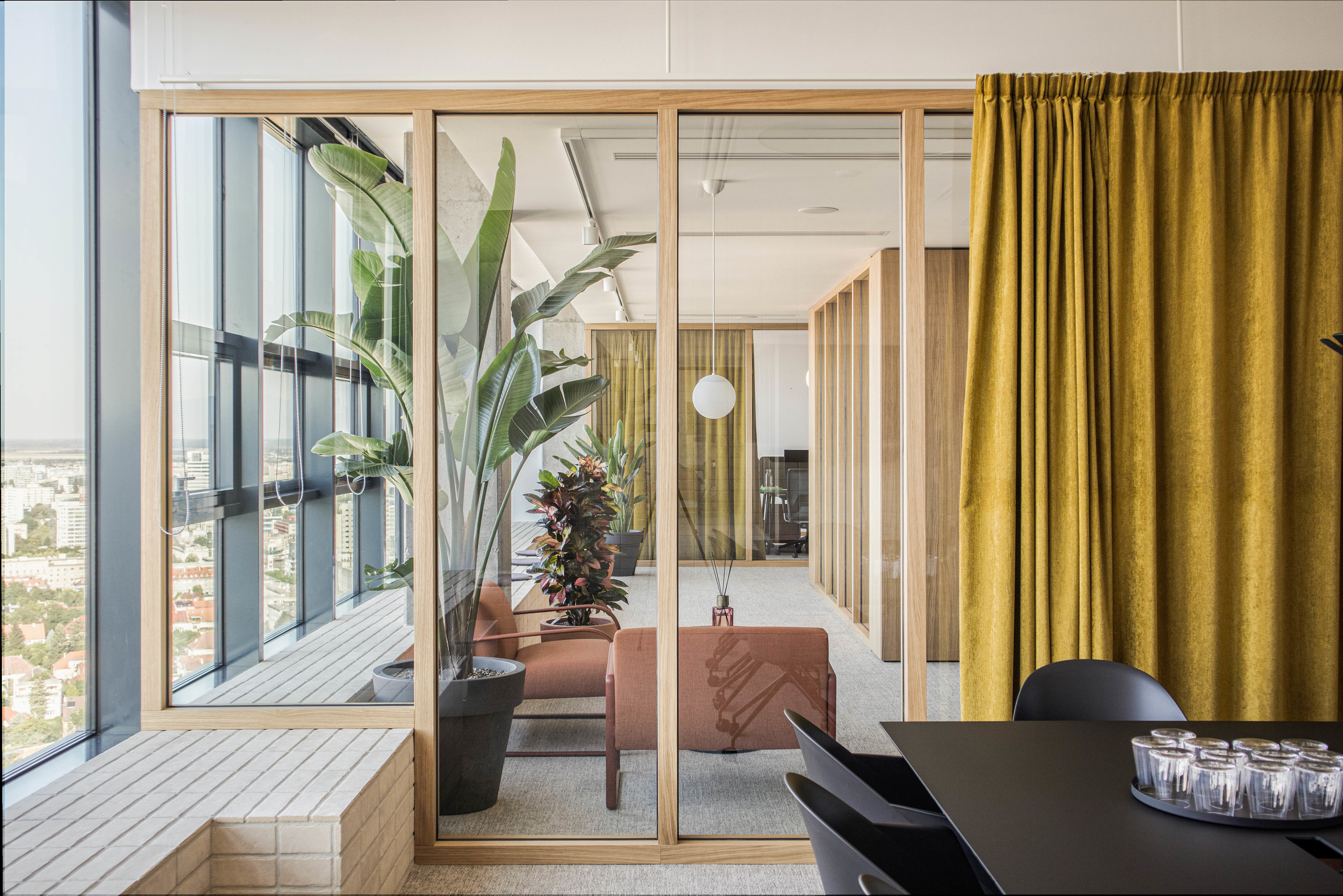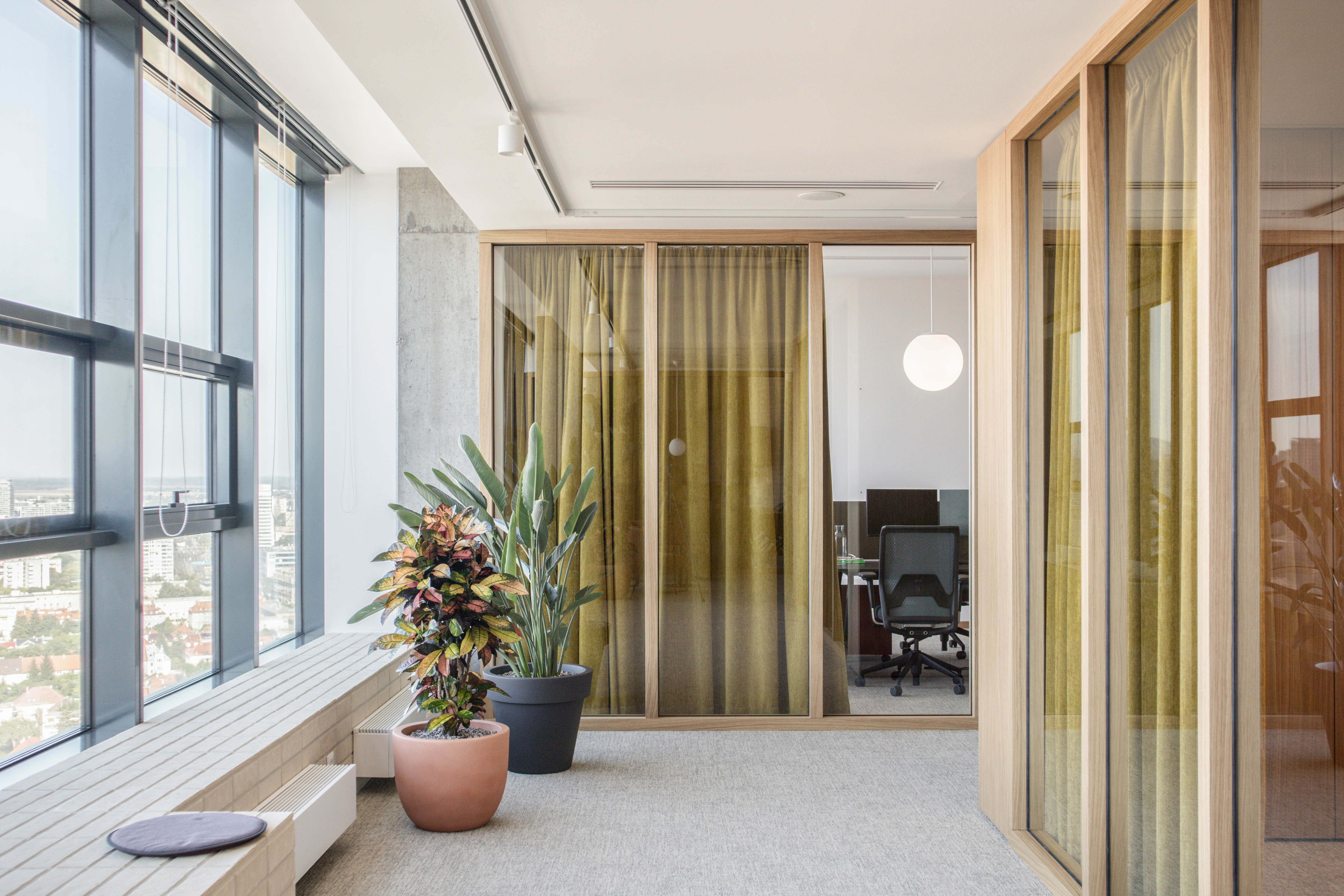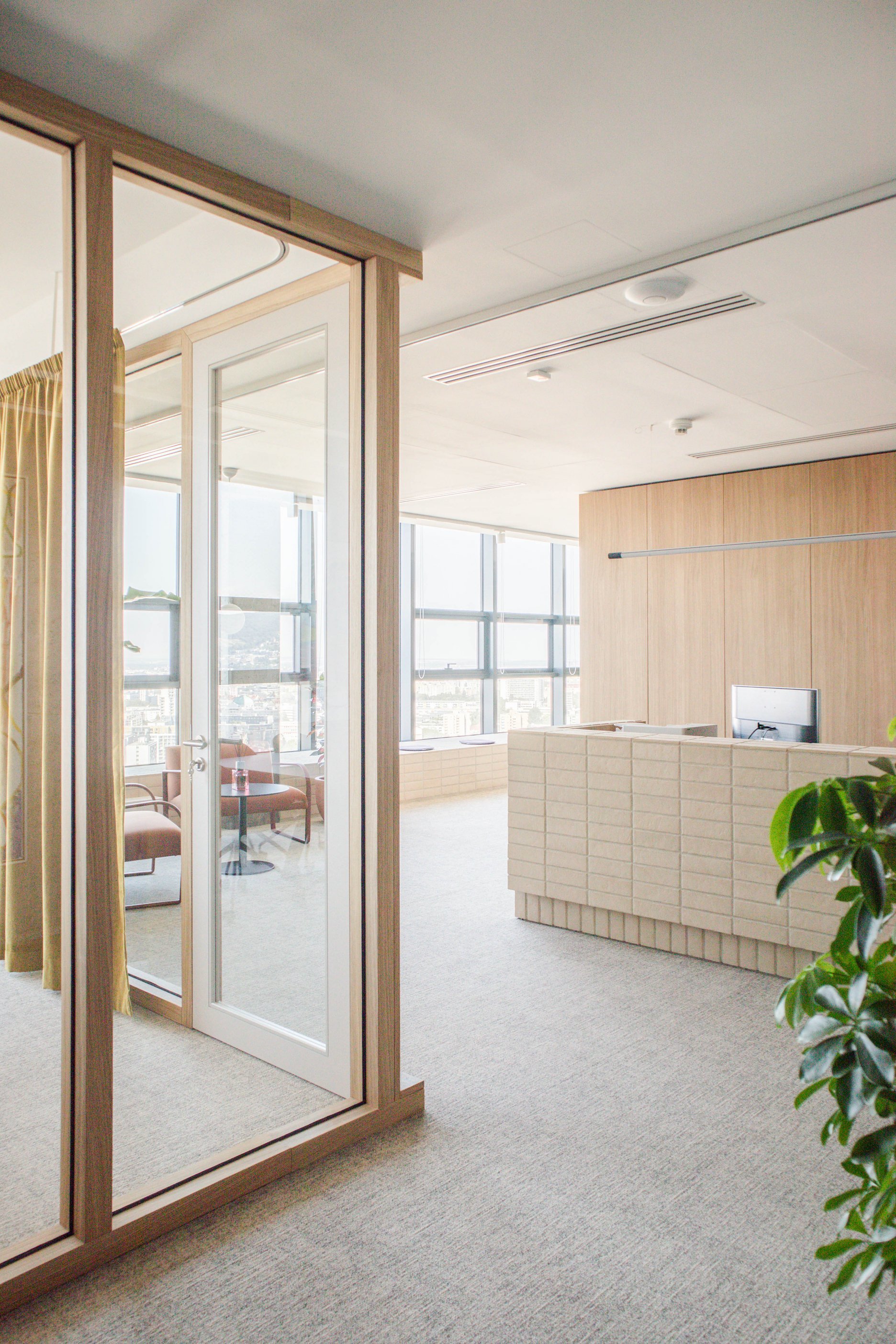V interiéri prevláda decentná materialita, primárne dubová dyha a tehlový obklad. Dyhu sme použili na rámoch sklenených deliacich priečok, ako aj na jadre spolu s tehlovým obkladom, do ktorého je obalený taktiež recepčný pult a parapet. Stenu, ktorá delí kanceláriu aj vertikálne jadro sme ponechali v priznanej podobe. Investor využil betónový povrch ako výstavnú plochu, kde na ňu pribudlo viacero farebných obrazov. Čierny mobiliár s farebnými akcentami tvorí kontrast k prevažujúcim tlmeným a teplým tónom, ktoré podčiarkujú textilné prvky. Závesy majú súčasne akustickú funkciu a slúžia aj ako možná vizuálna bariéra, dopĺňajúca transparentné sklenené priečky.