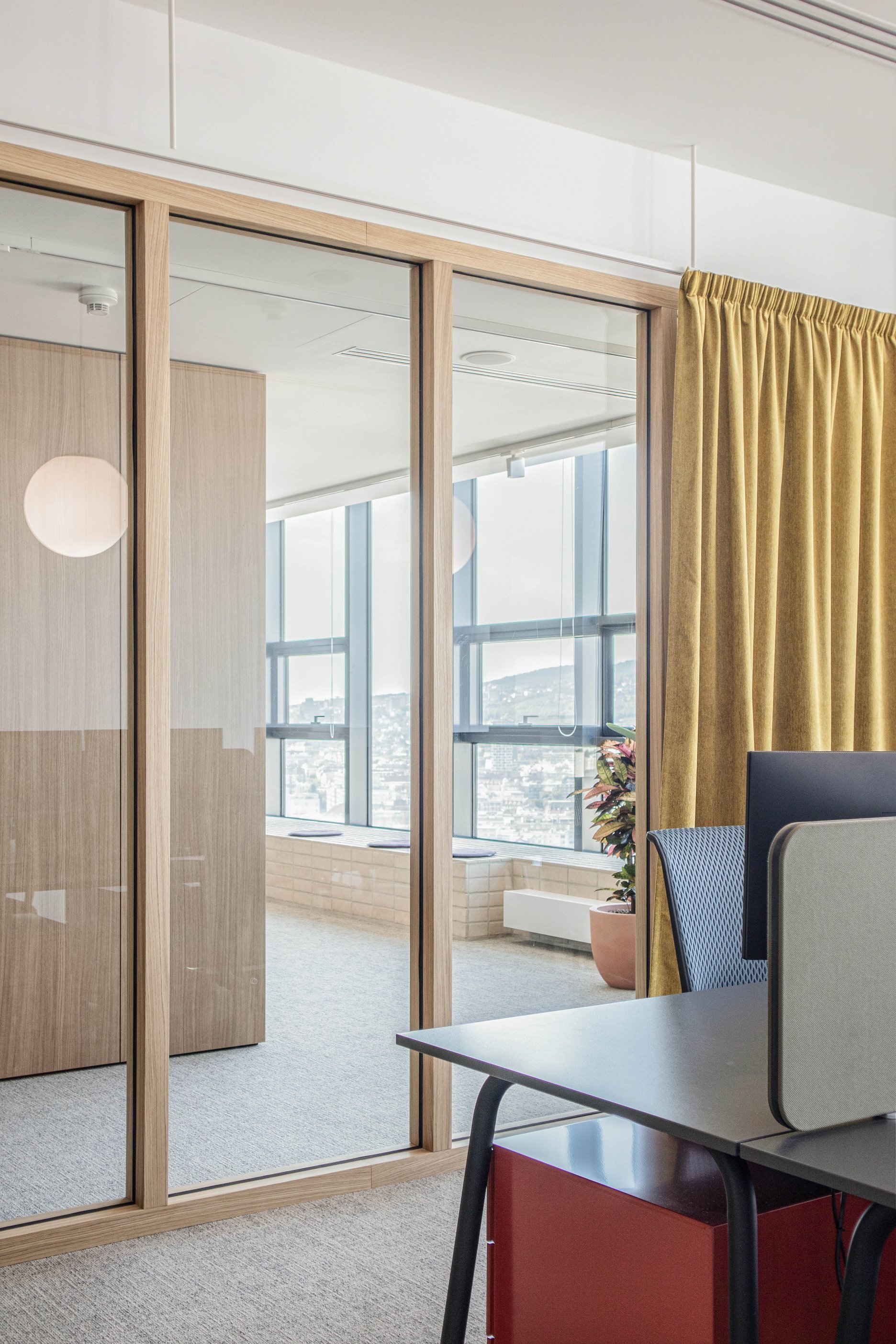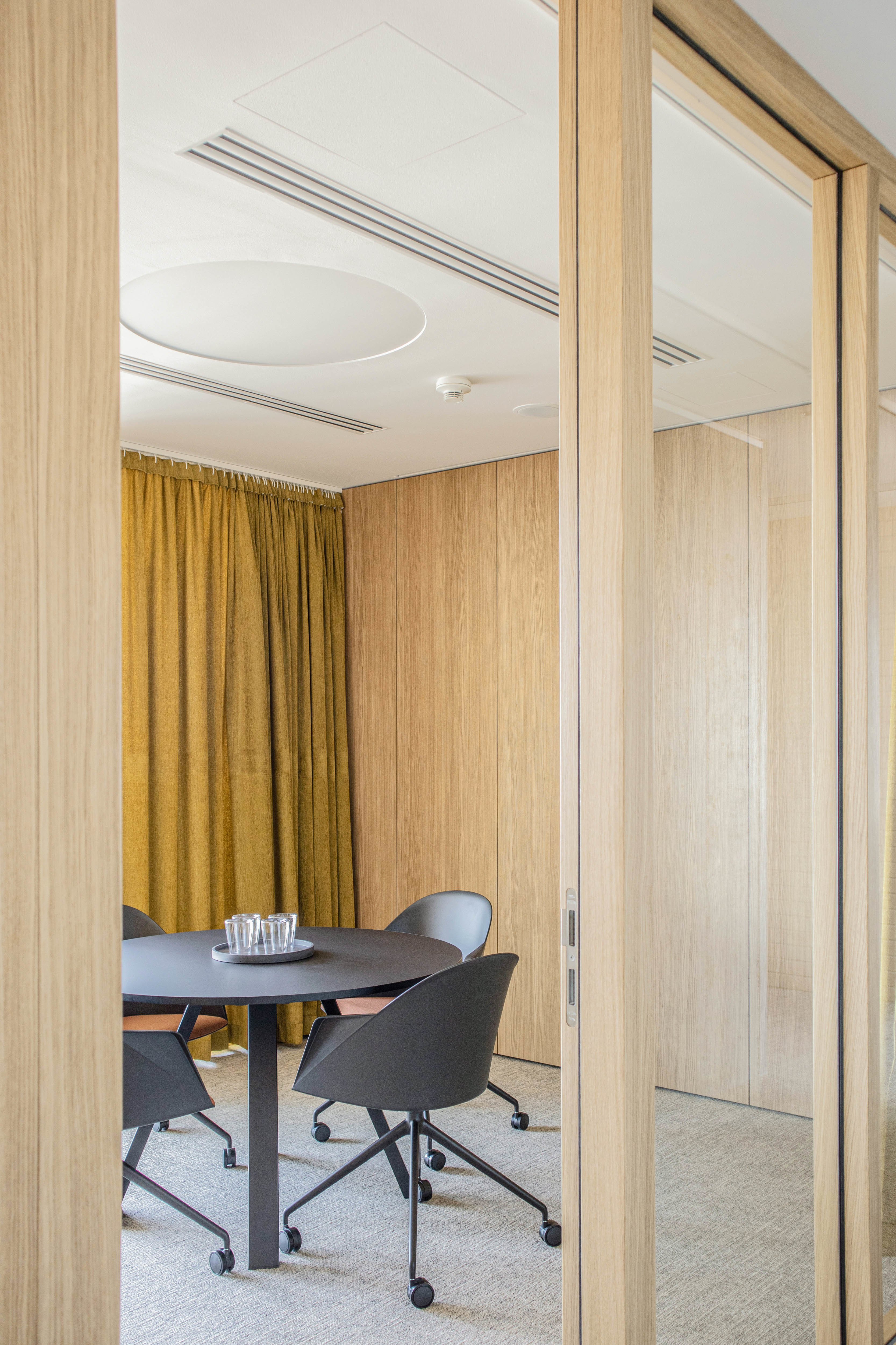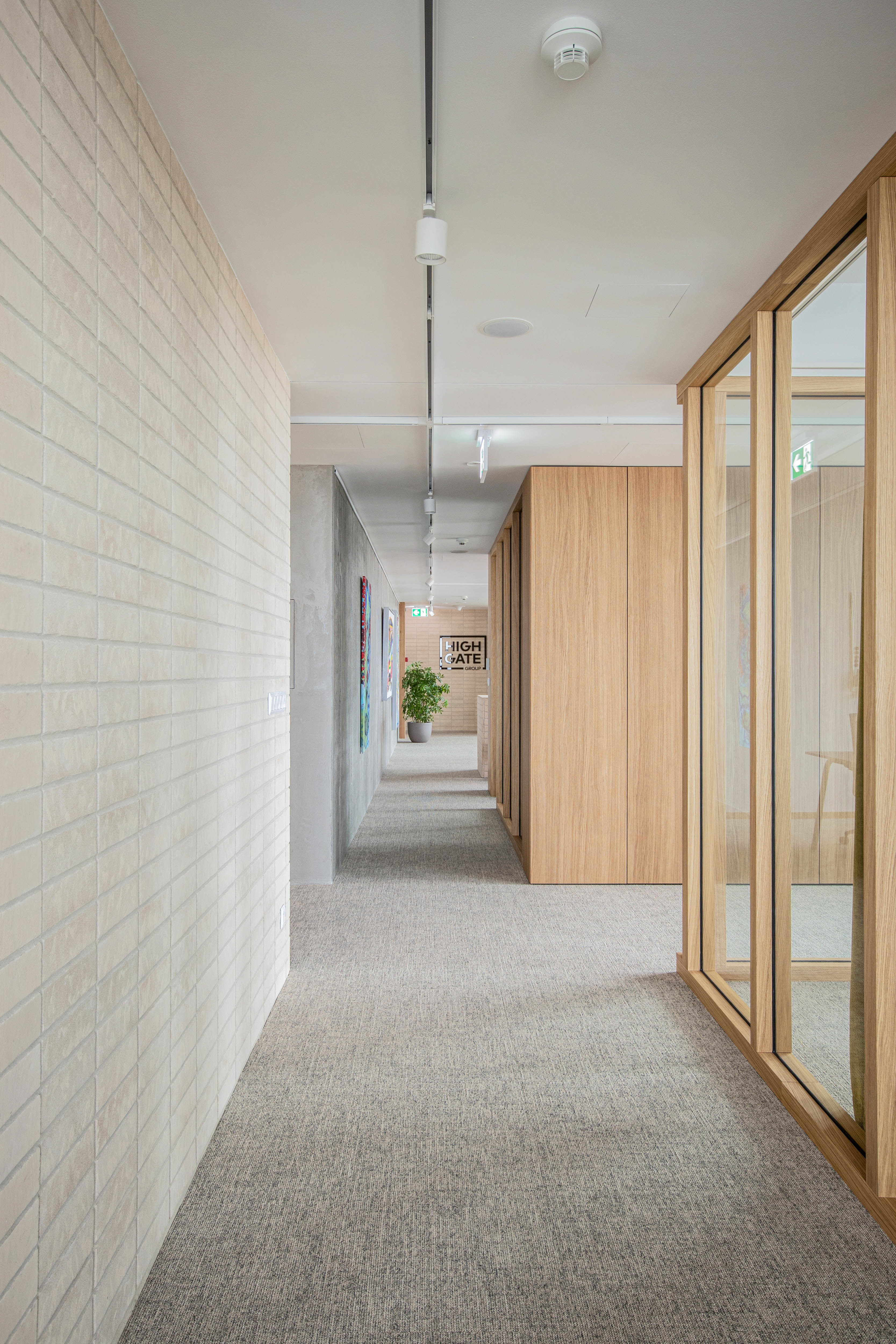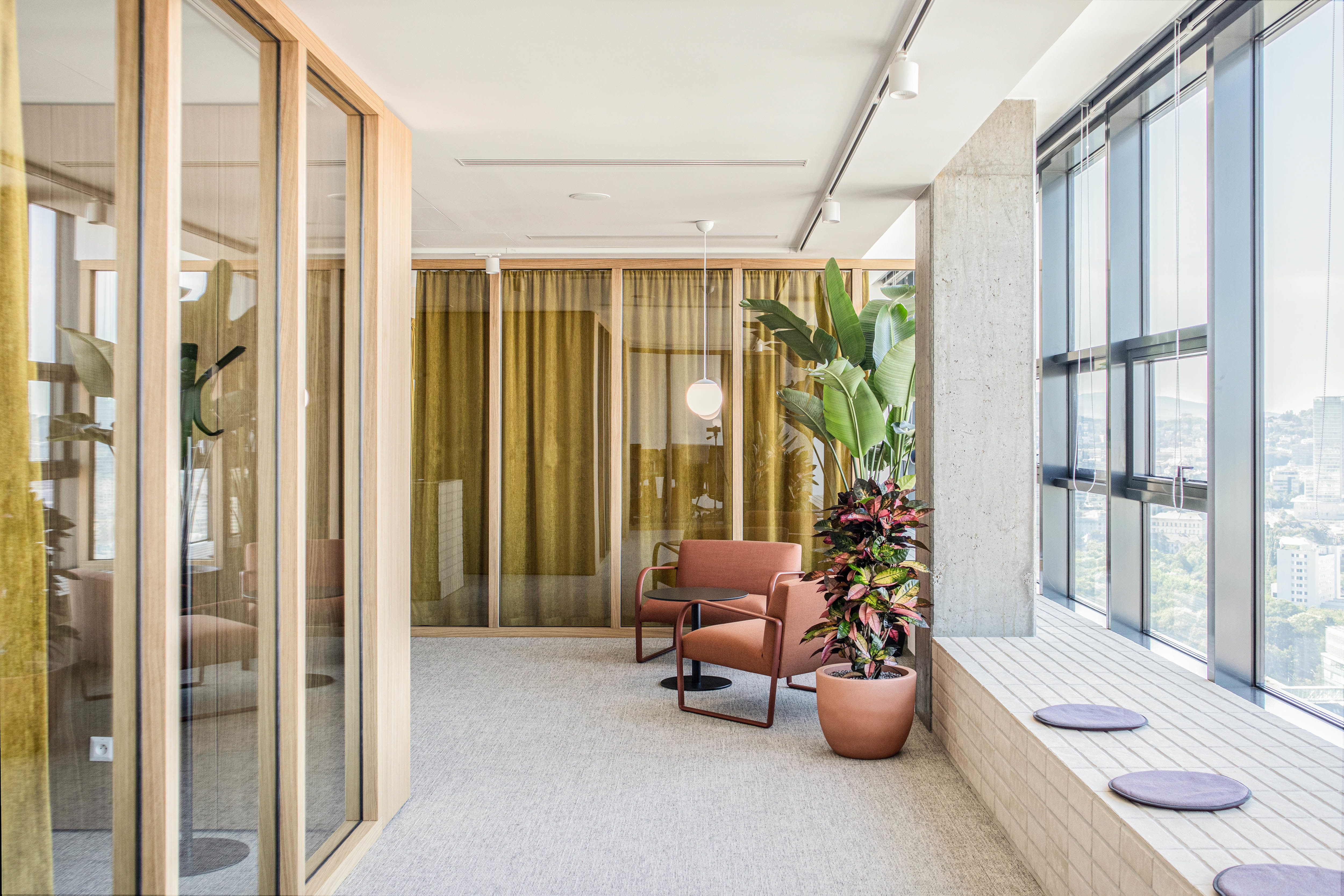 V interiéri prevláda decentná materialita, primárne dubová dyha a tehlový obklad. Dyhu sme použili na rámoch sklenených deliacich priečok, ako aj na jadre spolu s tehlovým obkladom, do ktorého je obalený taktiež recepčný pult a parapet. Stenu, ktorá delí kanceláriu aj vertikálne jadro sme ponechali v priznanej podobe. Investor využil betónový povrch ako výstavnú plochu, kde na ňu pribudlo viacero farebných obrazov. Čierny mobiliár s farebnými akcentami tvorí kontrast k prevažujúcim tlmeným a teplým tónom, ktoré podčiarkujú textilné prvky. Závesy majú súčasne akustickú funkciu a slúžia aj ako možná vizuálna bariéra, dopĺňajúca transparentné sklenené priečky.