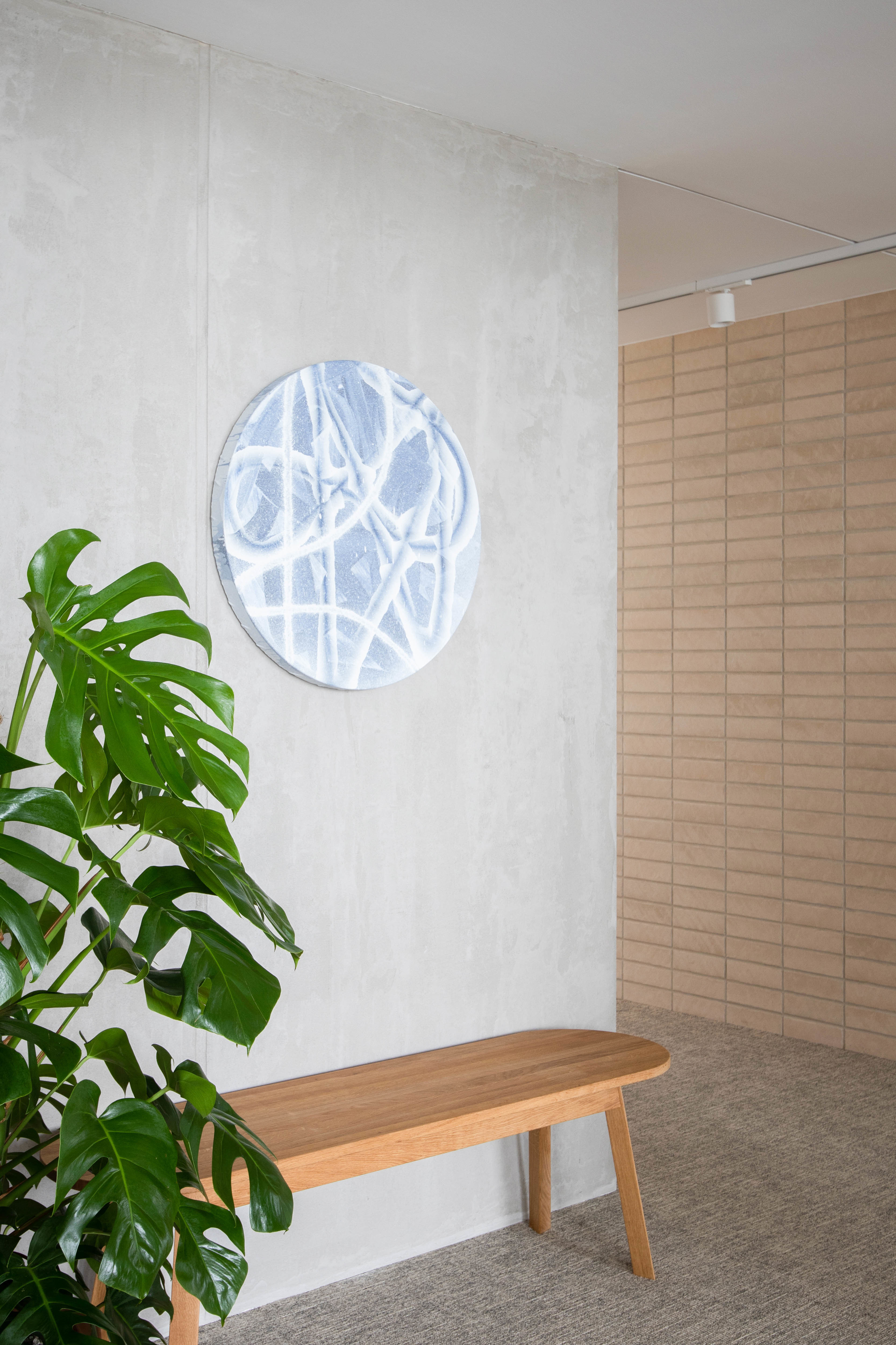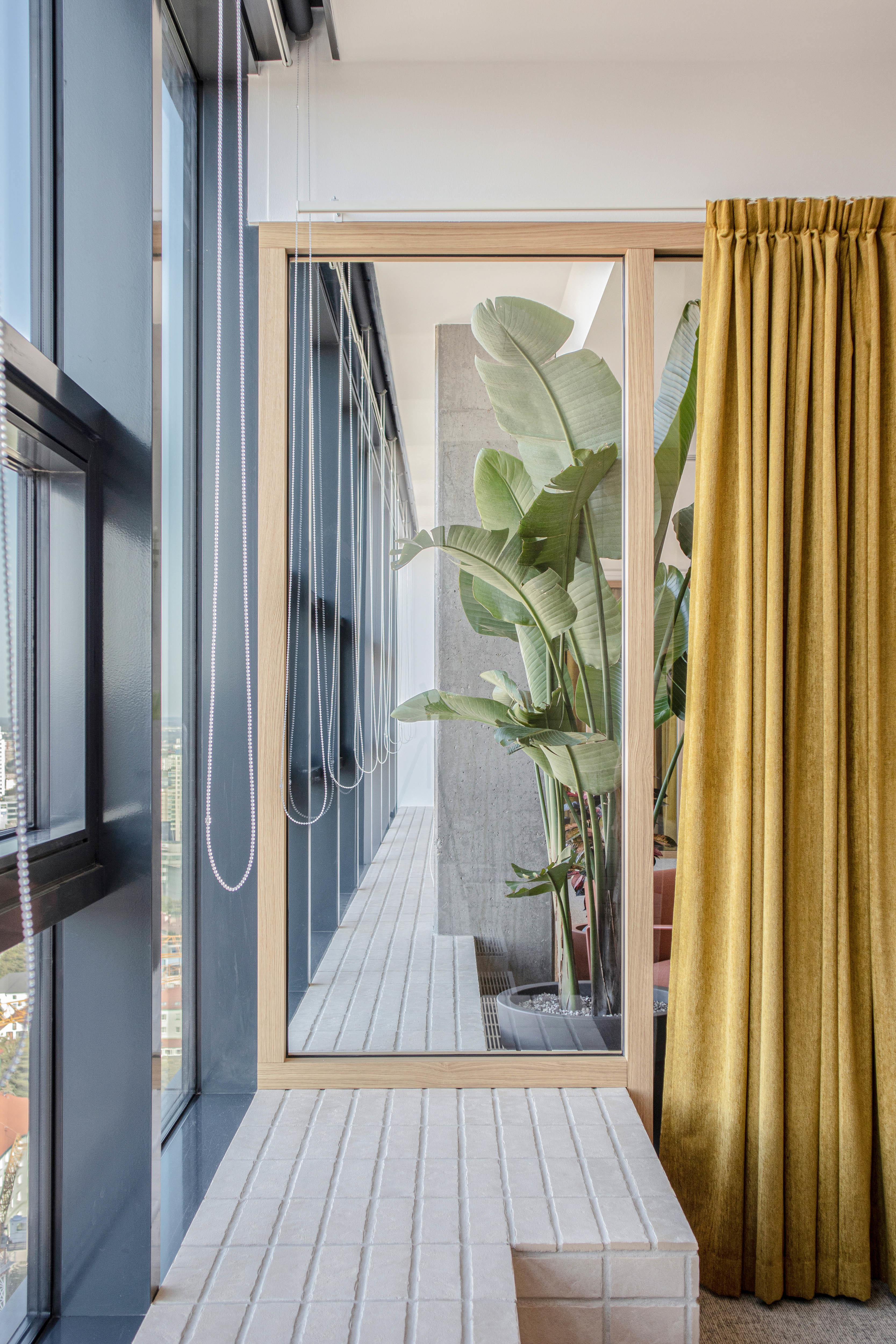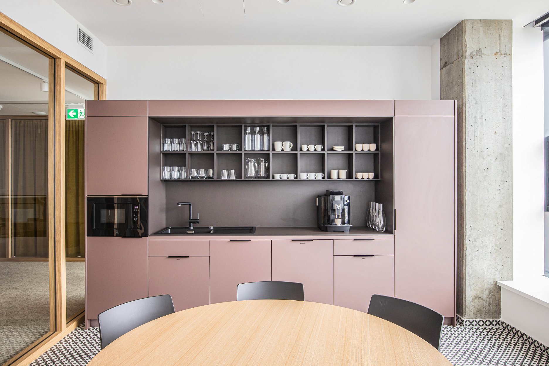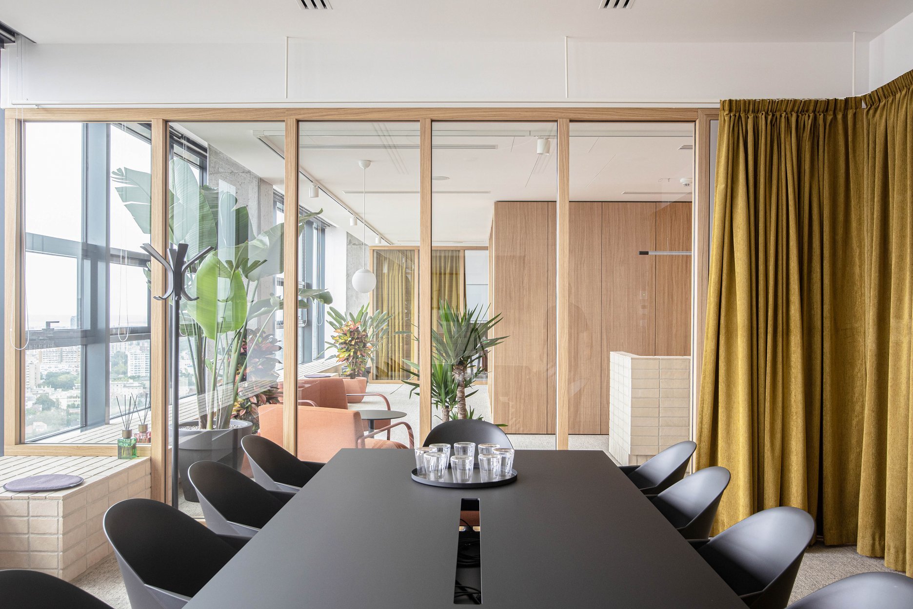 V interiéri prevláda decentná materialita, primárne dubová dyha a tehlový obklad. Dyhu sme použili na rámoch sklenených deliacich priečok, ako aj na jadre spolu s tehlovým obkladom, do ktorého je obalený taktiež recepčný pult a parapet. Stenu, ktorá delí kanceláriu aj vertikálne jadro sme ponechali v priznanej podobe. Investor využil betónový povrch ako výstavnú plochu, kde na ňu pribudlo viacero farebných obrazov. Čierny mobiliár s farebnými akcentami tvorí kontrast k prevažujúcim tlmeným a teplým tónom, ktoré podčiarkujú textilné prvky. Závesy majú súčasne akustickú funkciu a slúžia aj ako možná vizuálna bariéra, dopĺňajúca transparentné sklenené priečky.