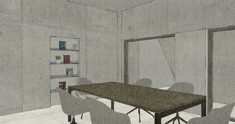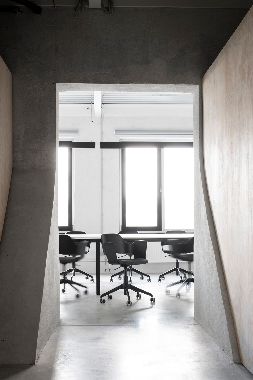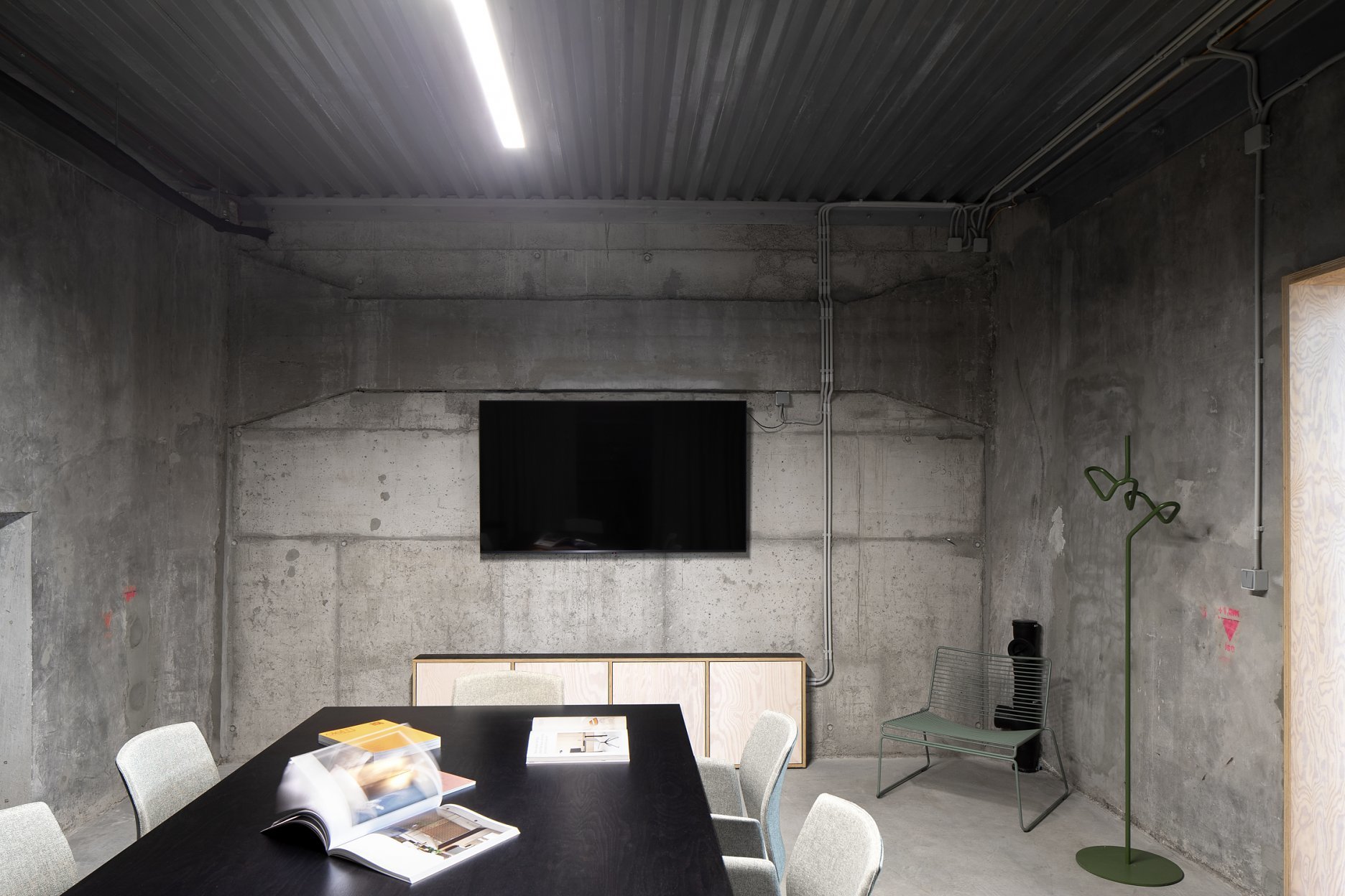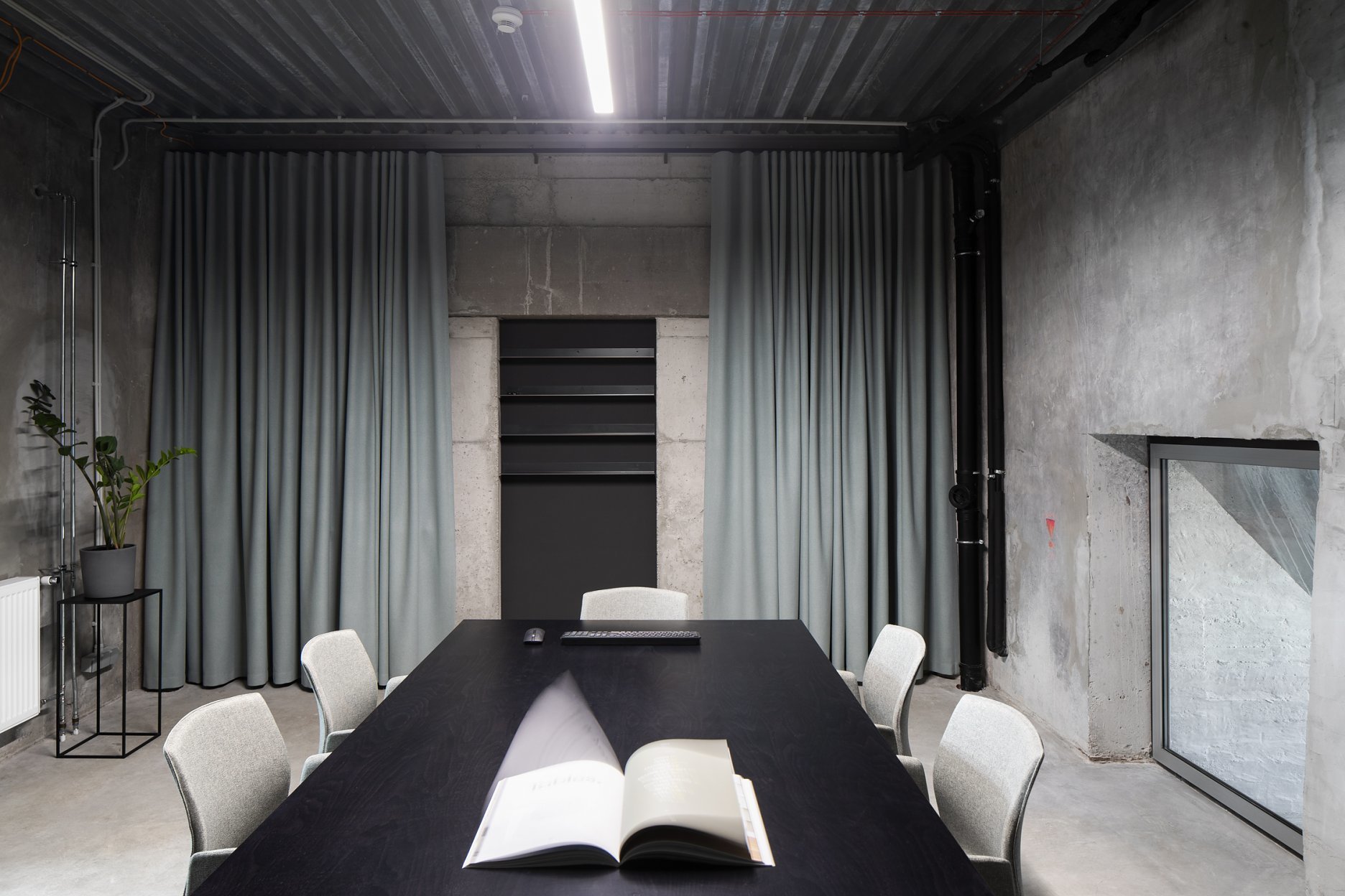 Druhá - malá zasadačka - slúži skôr na komorné reprezentačné účely. Je ponechaná v pôvodnom materiálovom riešení. Očistené betónové steny sú doplnené akustickým závesom. Atmosféru dopĺňajú komfortné dizajnové stoličky a vešiak.