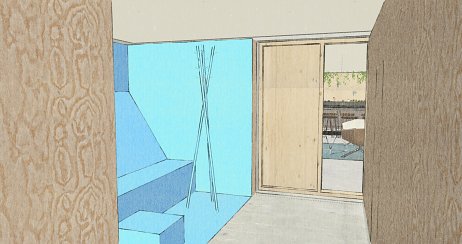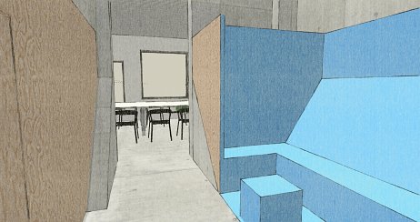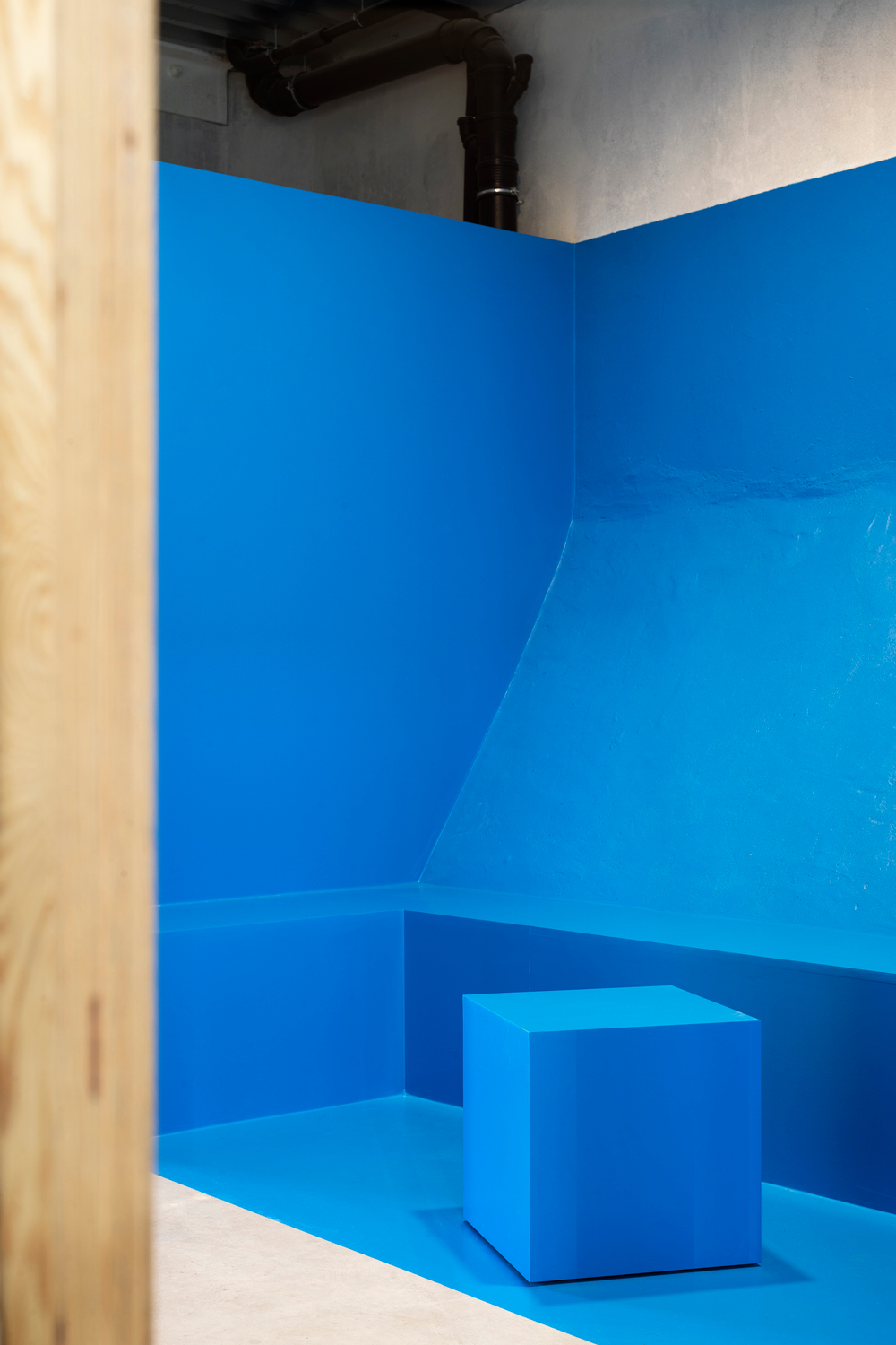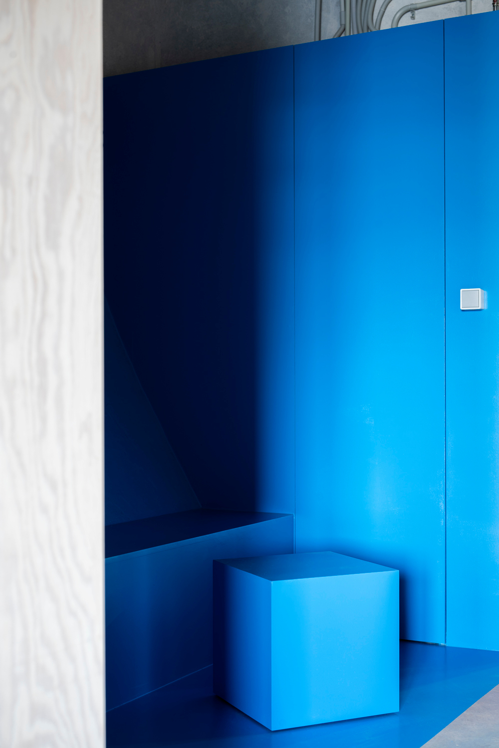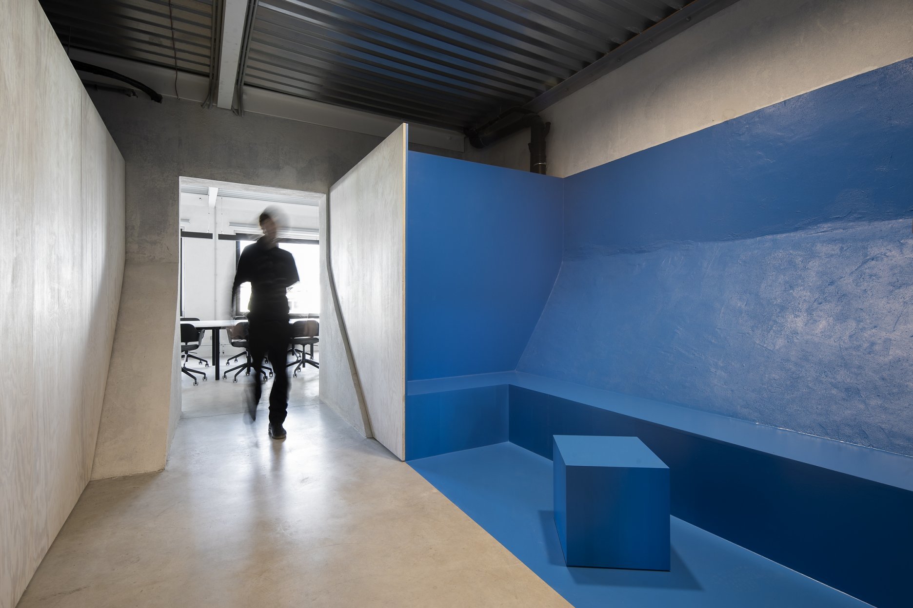 Zasadačky majú svoje špecifické atmosféry. Vstupný priestor k veľkej zasadačke prechádza cez pôvodné teleso zásobníka/sýpky. Vzhľadom na jej zošikmené steny - tu bolo uvažované s archívom, ale nakoniec tu vznikol "modrý záliv" - predpolie zasadačky, kde sa dá posedieť a počkať na poradu, odložiť si kabát, alebo len prejsť okolo. Farebnosť modrého zálivu vychádza z fragmentov zachovaných platní na stenách.