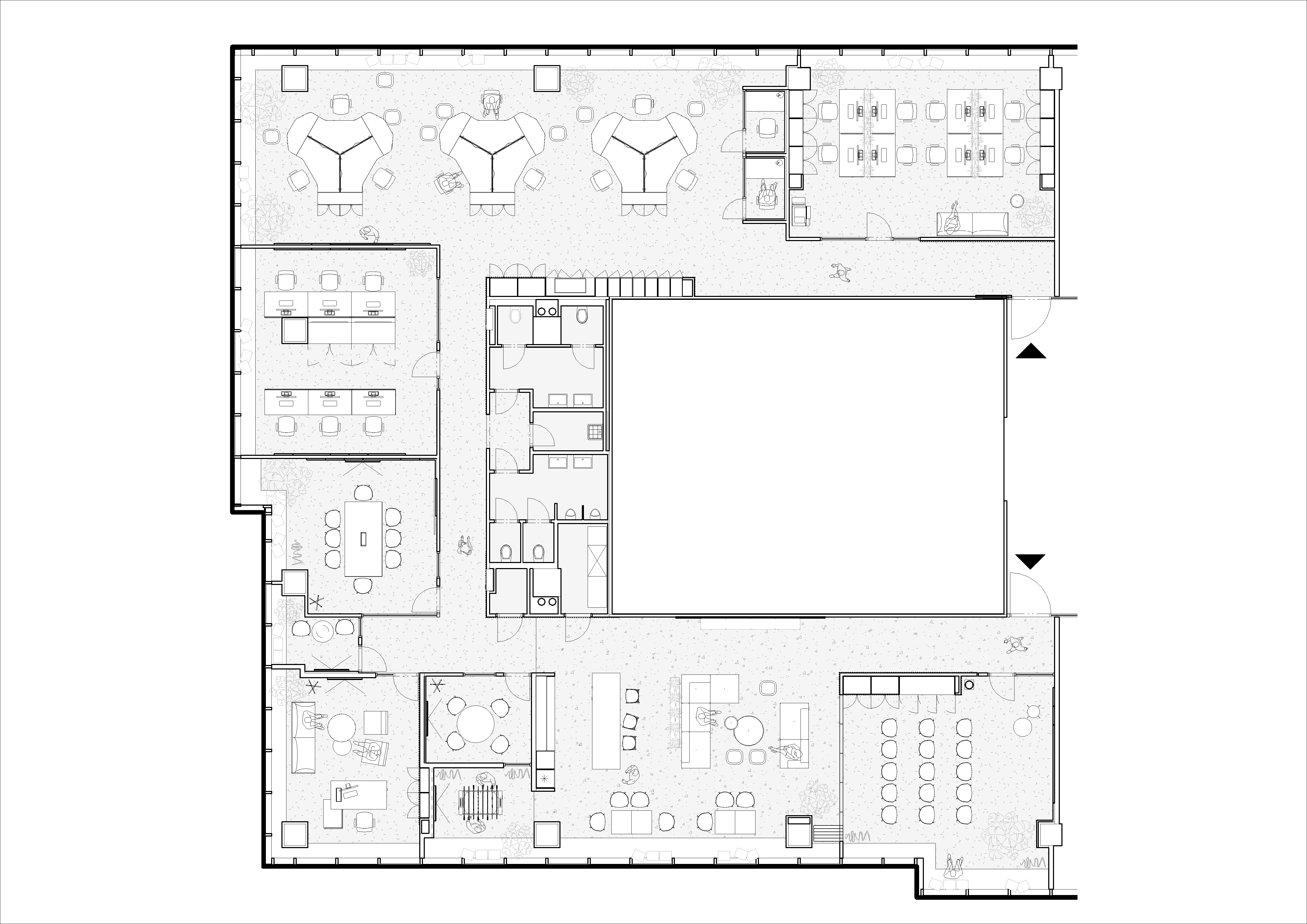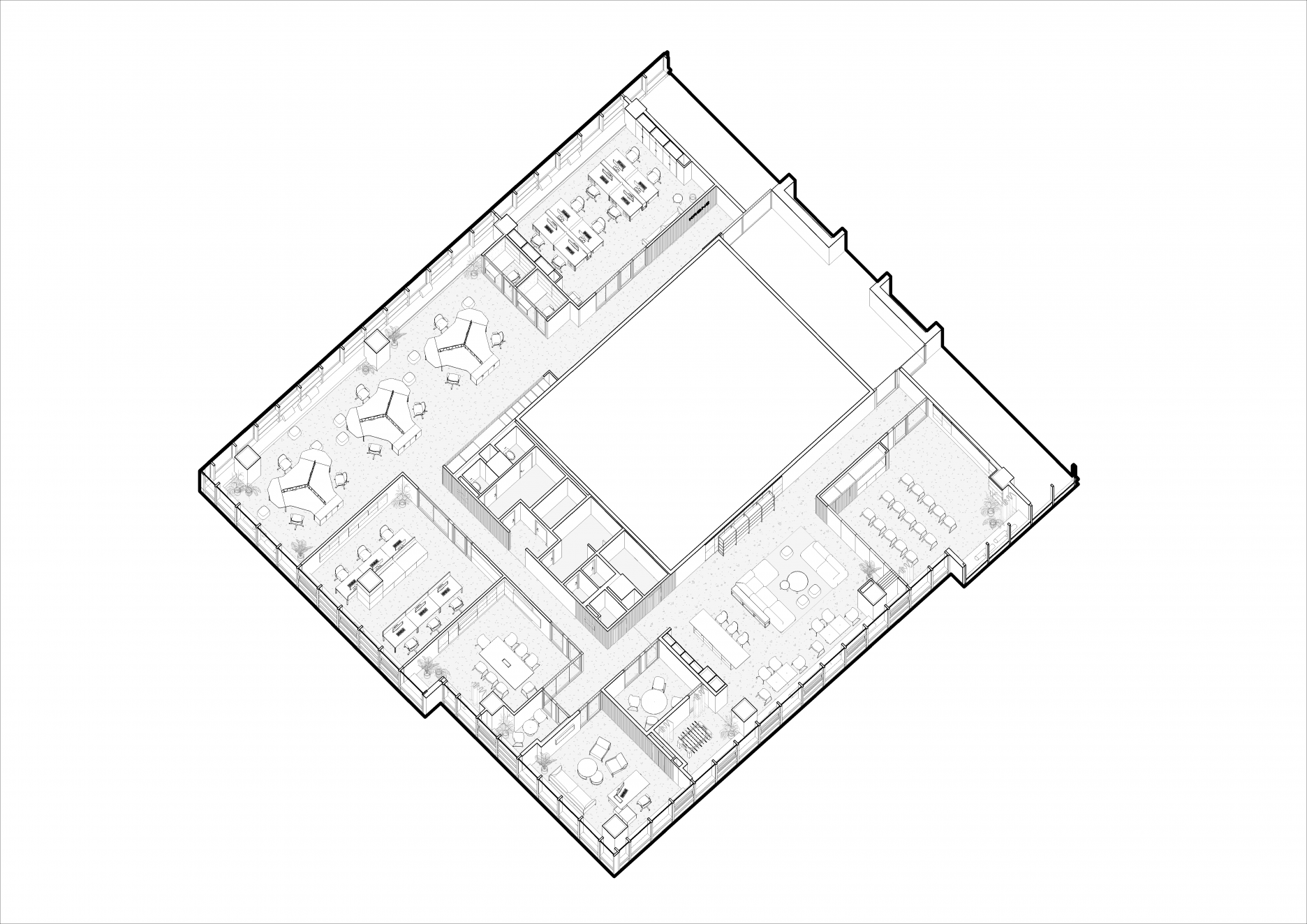 V nadväzujúcej časti sú situované zasadačky a kancelária CEO. Pracovná zóna obsahuje tri kancelárie vo forme uzavretých miestností a jeden open space. Doplnkové vybavenie tvoria: dve focus miestnosti pre koncentrovanú prácu alebo telefonovanie, batéria osobných skriniek doplnená o akvárium, doplnkové neformálne sedenie pri oknách a pufy pri stoloch.