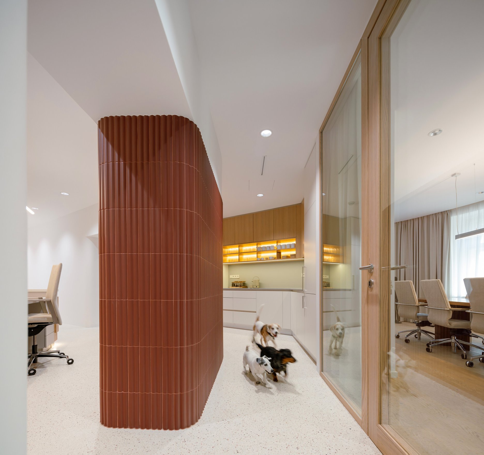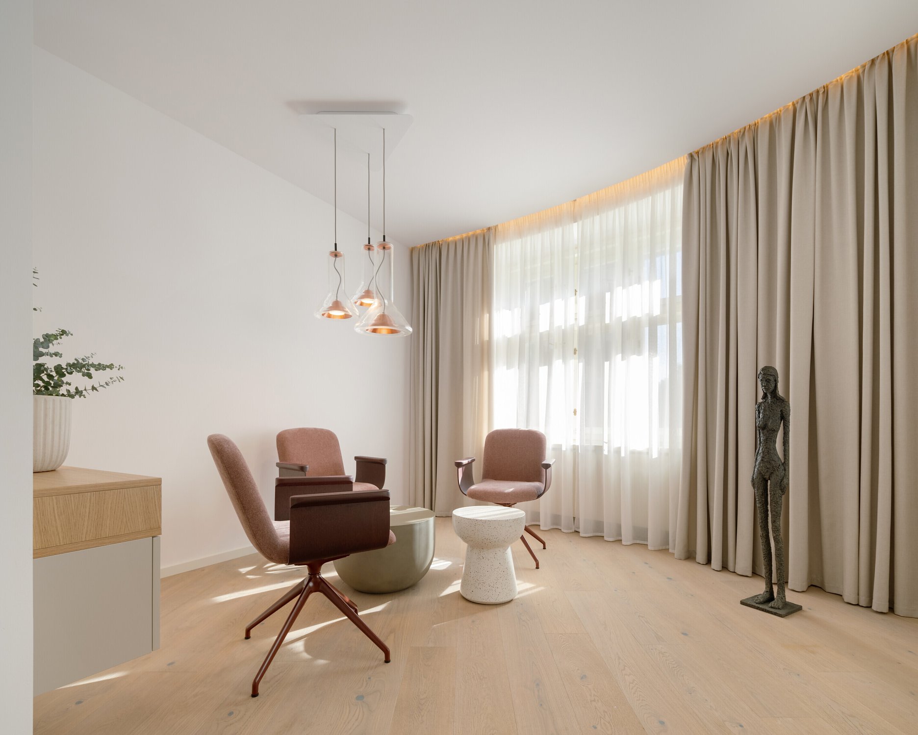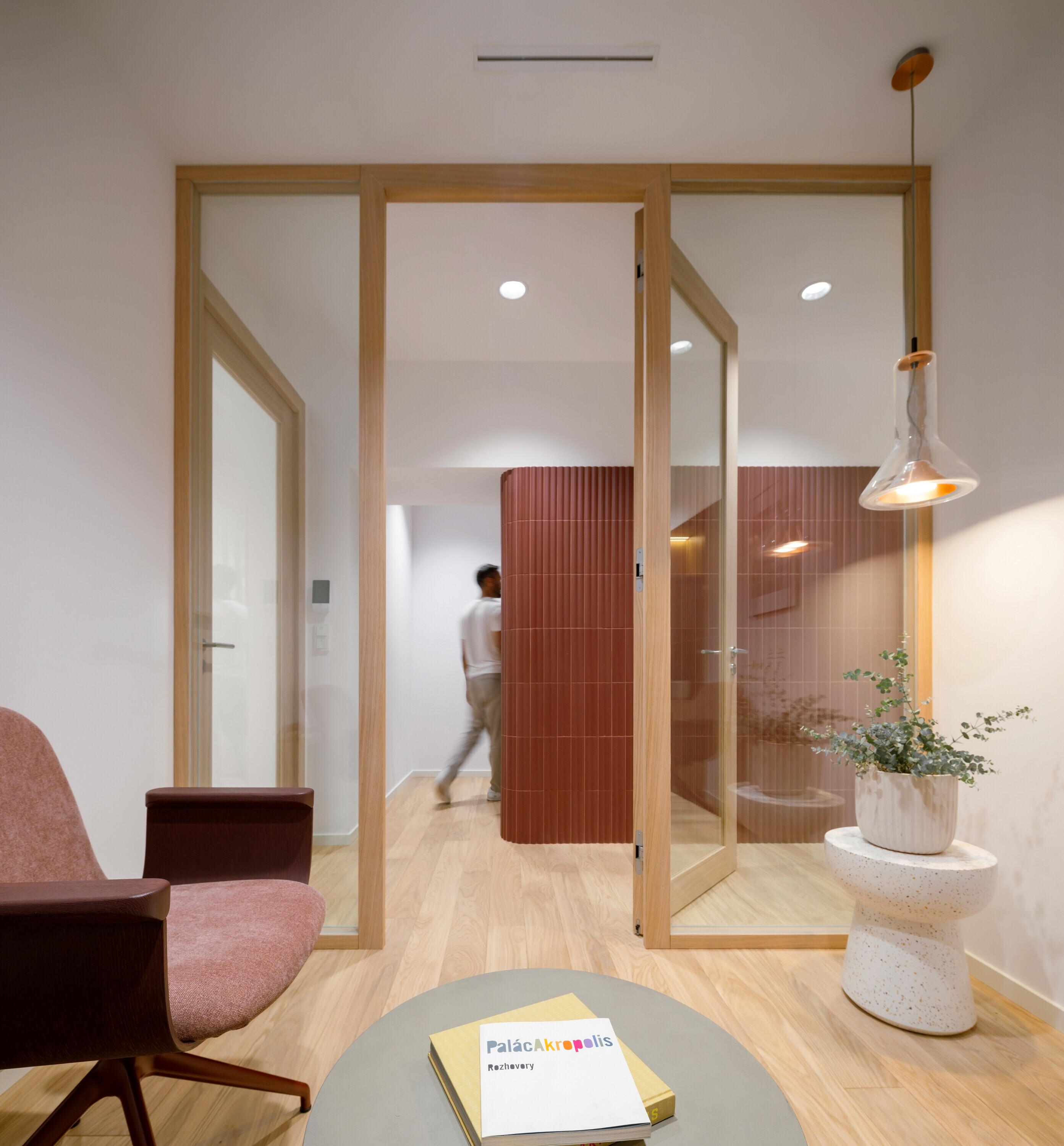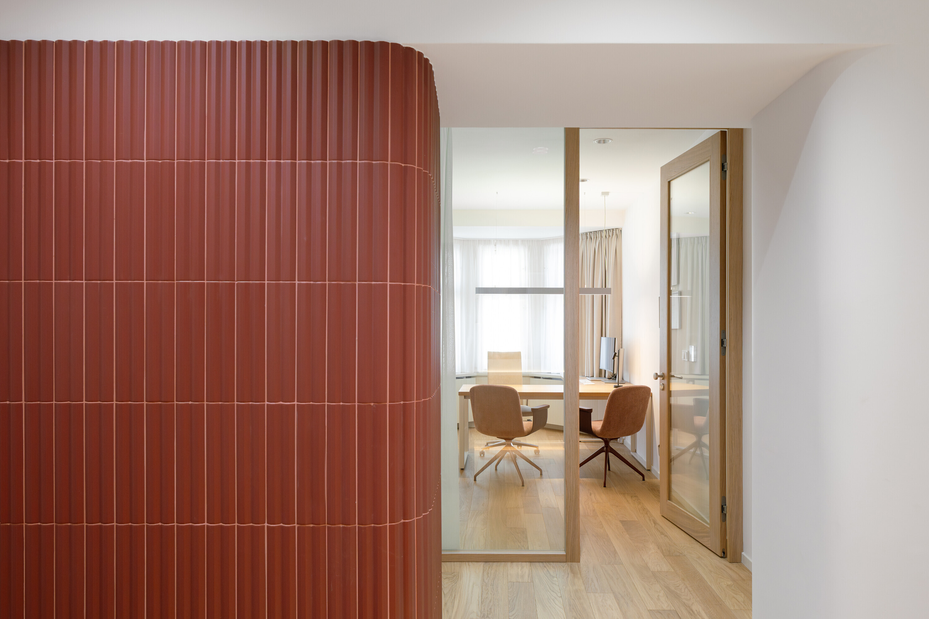 Základnú priestorovú schému interiér ďalej rozvíja prostredníctvom zvolenej palety materiálov. Kedysi tmavé chodby sú nanovo poňaté ako jemne zakrivené priechody s červenými keramickými obkladmi. Rovnaký keramický materiál sa vo svetlejších tónoch objavuje aj v hygienických zariadeniach, čo dotvára vizuálnu kontinuitu naprieč celým podlažím. Výrazné keramické povrchy vyvažuje prírodná dubová podlaha, nábytok a okenné rámy. Na mieru vyrobené orechové zasadacie stoly vnášajú do interiéru hrubšiu textúru. Osvetlenie zvýrazňuje zakrivené tvary a nenápadne vedie pohyb priestorom.