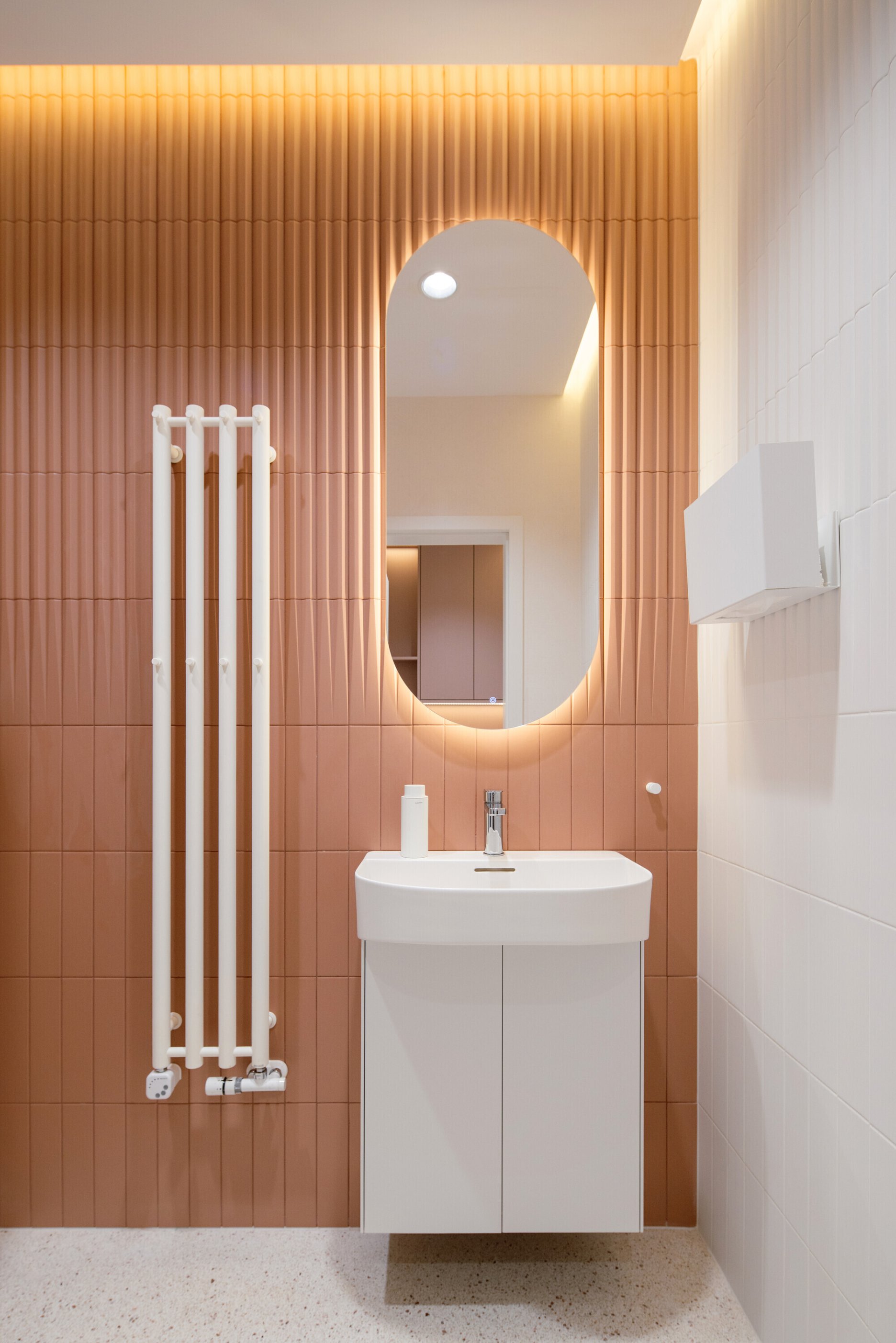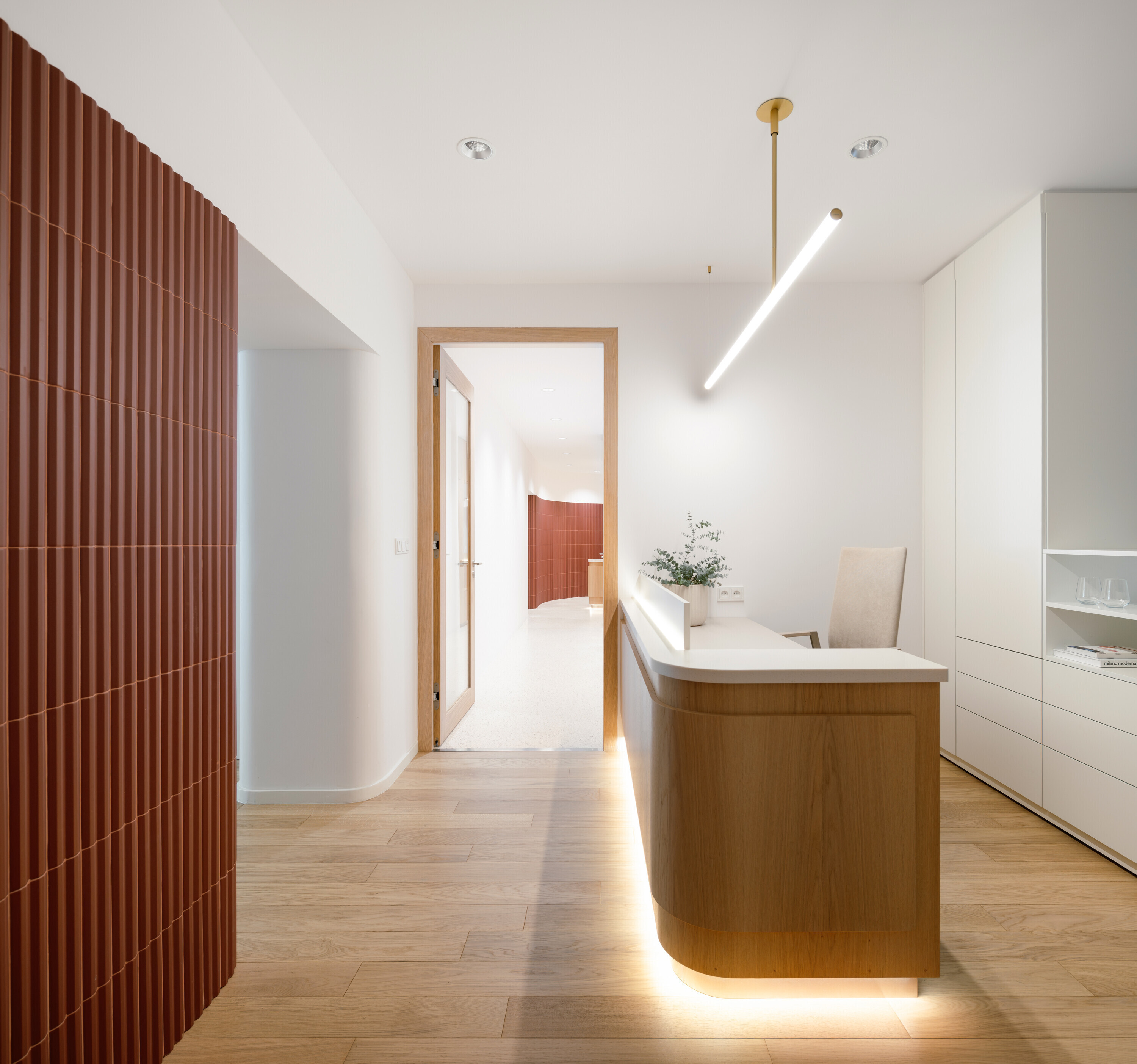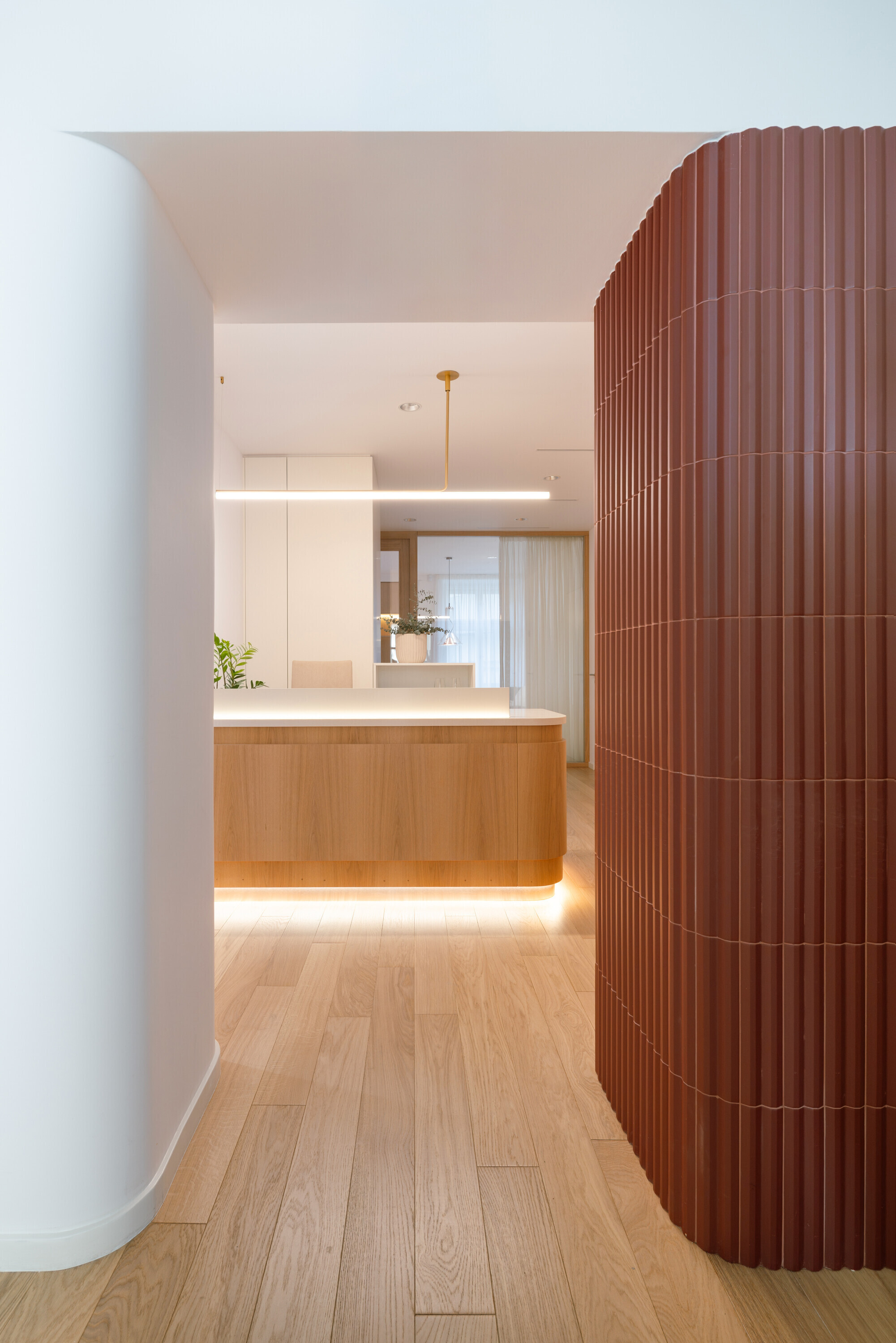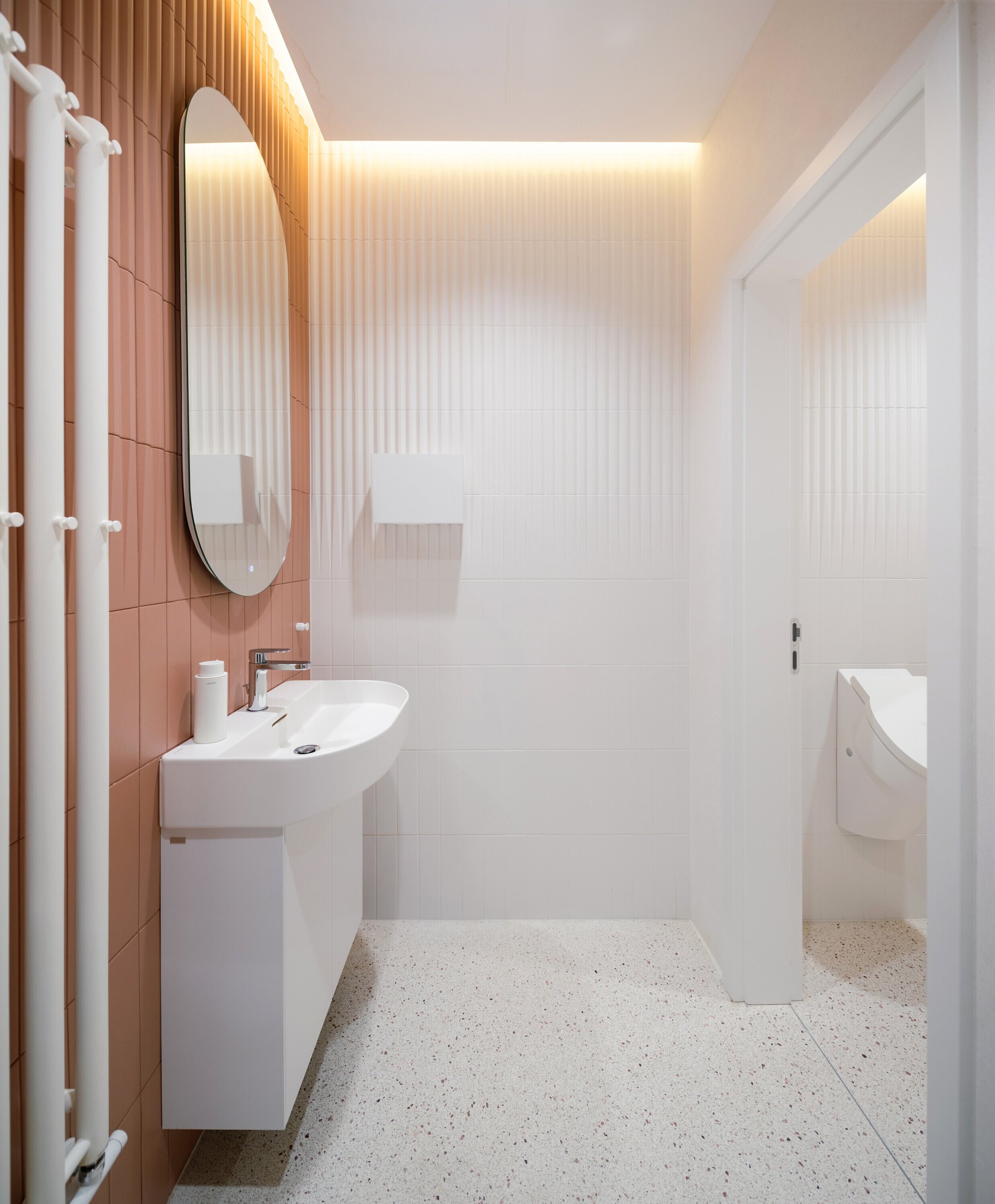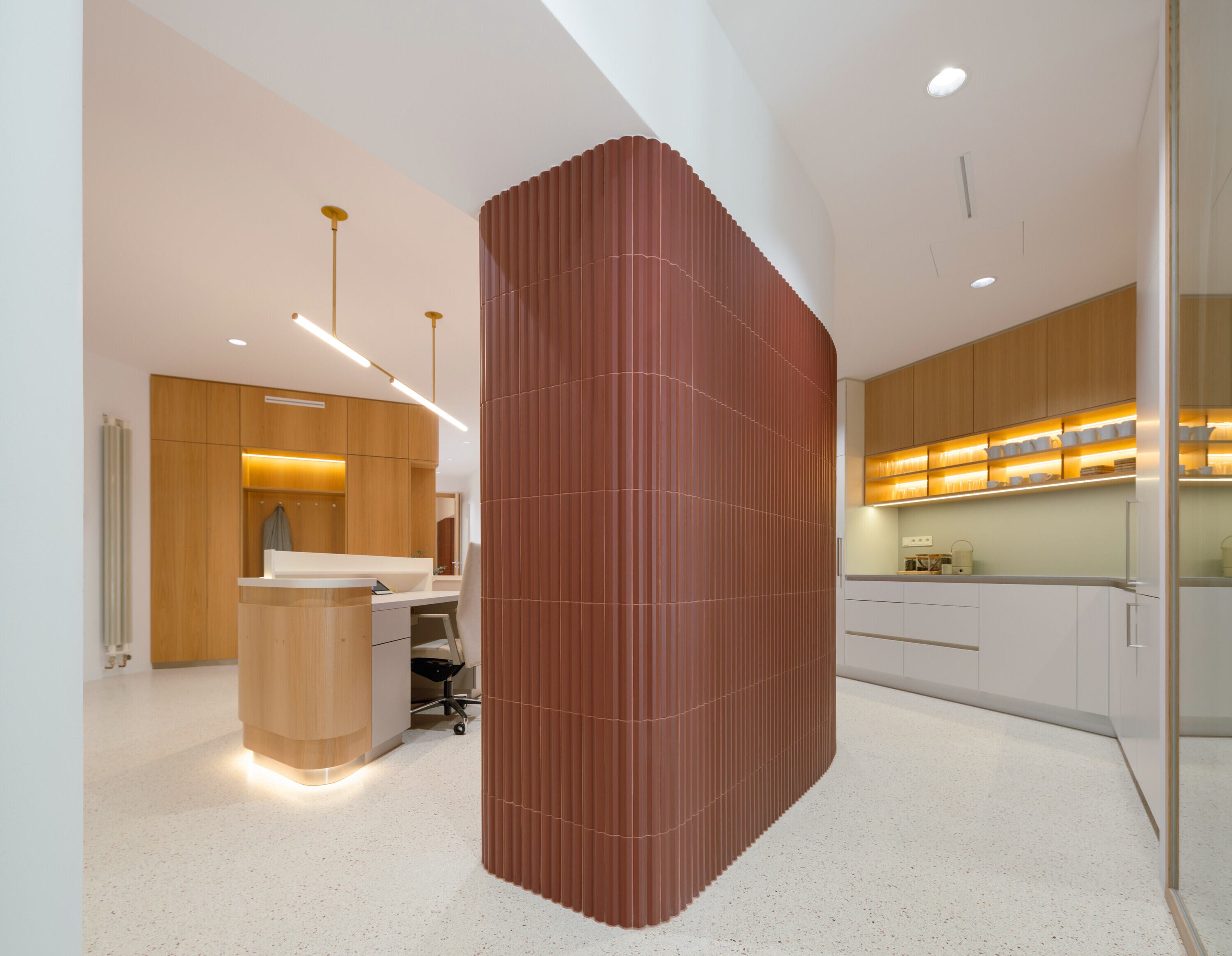 Základnú priestorovú schému interiér ďalej rozvíja prostredníctvom zvolenej palety materiálov. Kedysi tmavé chodby sú nanovo poňaté ako jemne zakrivené priechody s červenými keramickými obkladmi. Rovnaký keramický materiál sa vo svetlejších tónoch objavuje aj v hygienických zariadeniach, čo dotvára vizuálnu kontinuitu naprieč celým podlažím. Výrazné keramické povrchy vyvažuje prírodná dubová podlaha, nábytok a okenné rámy. Na mieru vyrobené orechové zasadacie stoly vnášajú do interiéru hrubšiu textúru. Osvetlenie zvýrazňuje zakrivené tvary a nenápadne vedie pohyb priestorom.