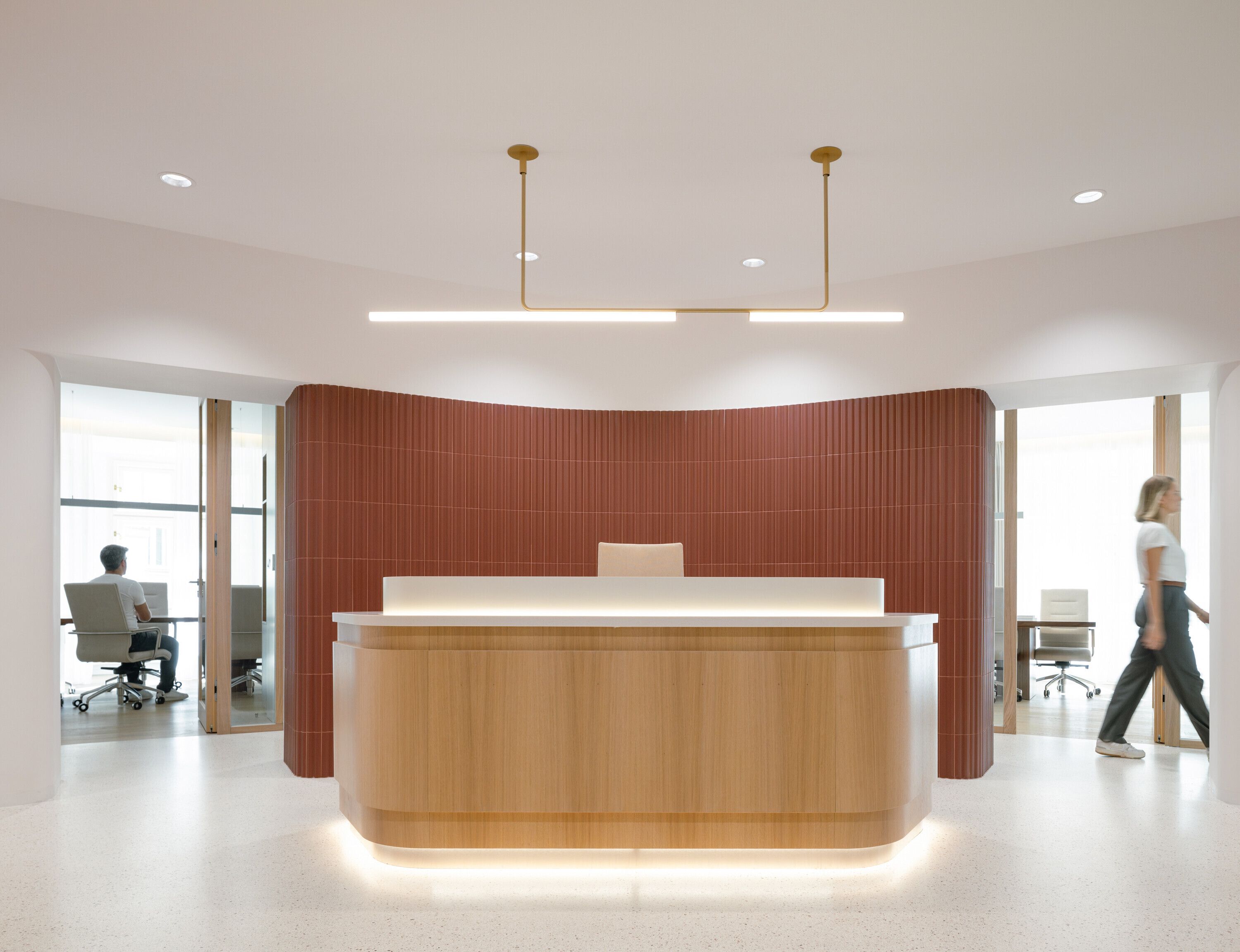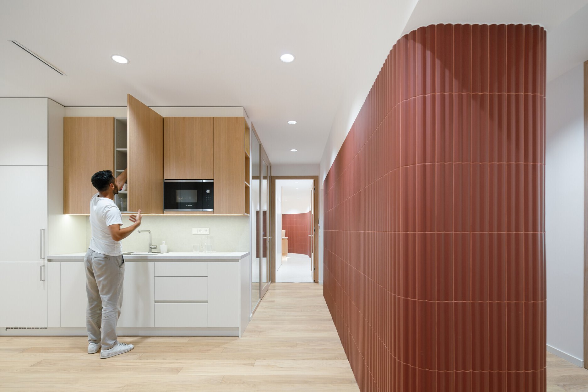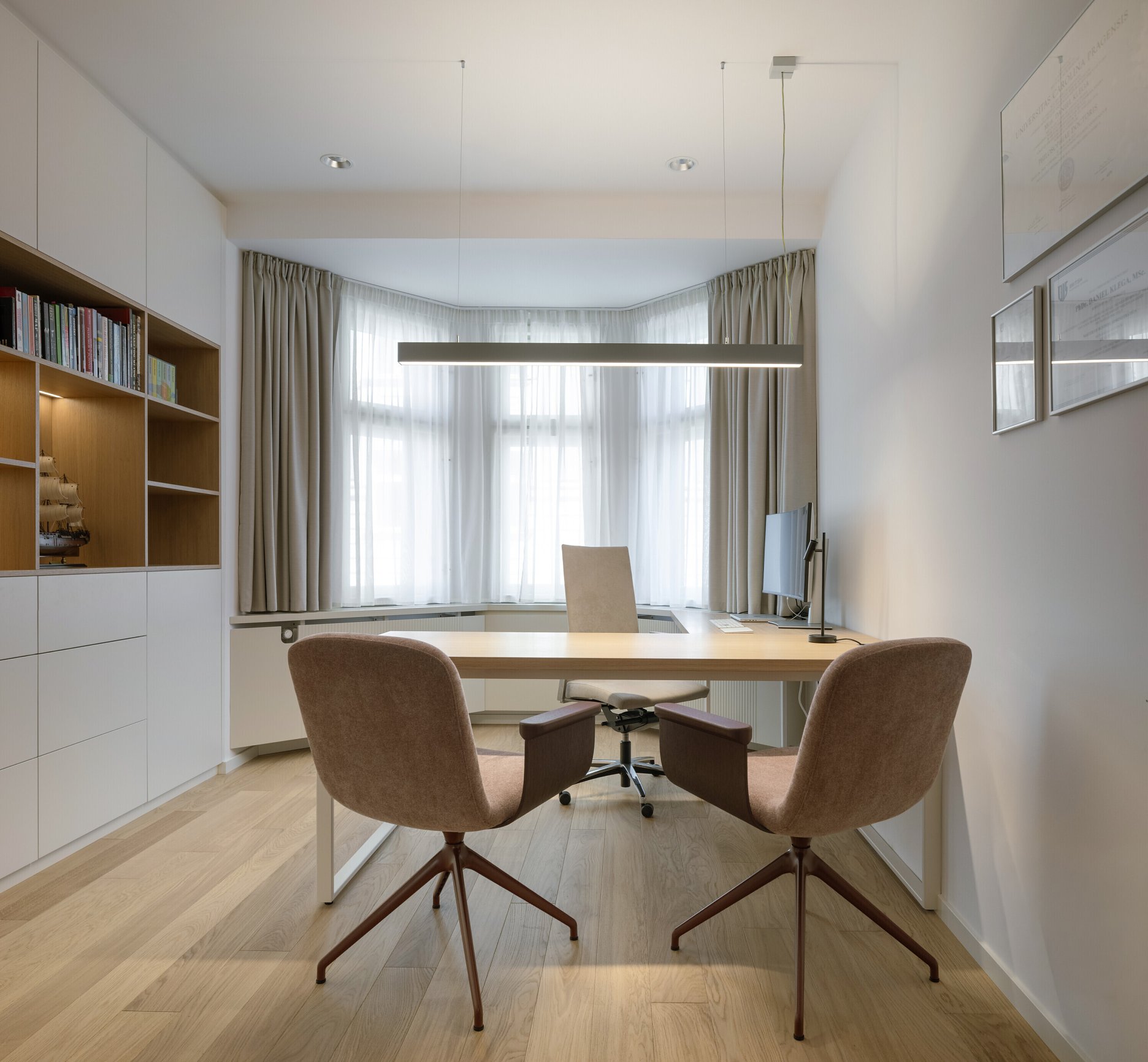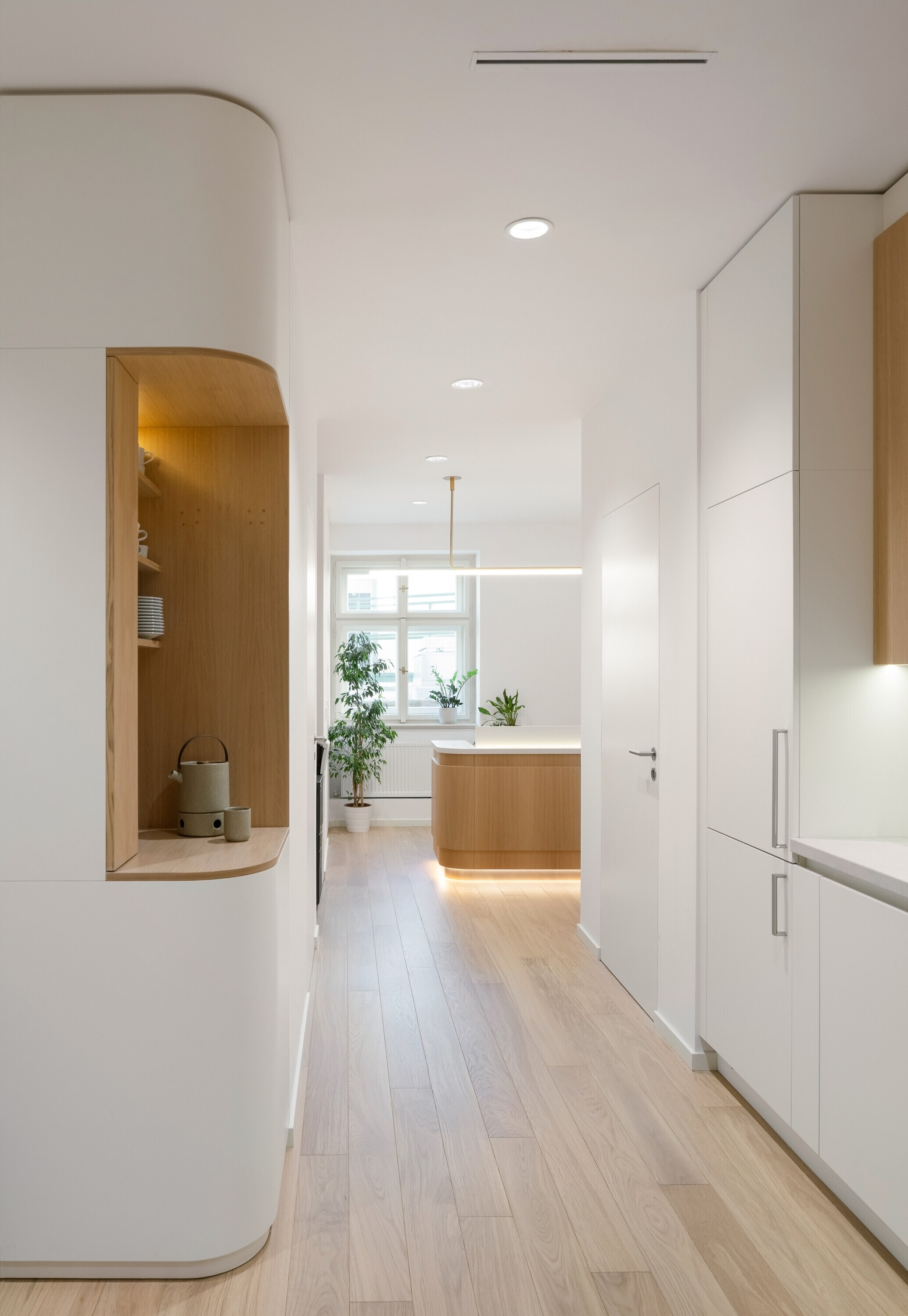 Základnú priestorovú schému interiér ďalej rozvíja prostredníctvom zvolenej palety materiálov. Kedysi tmavé chodby sú nanovo poňaté ako jemne zakrivené priechody s červenými keramickými obkladmi. Rovnaký keramický materiál sa vo svetlejších tónoch objavuje aj v hygienických zariadeniach, čo dotvára vizuálnu kontinuitu naprieč celým podlažím. Výrazné keramické povrchy vyvažuje prírodná dubová podlaha, nábytok a okenné rámy. Na mieru vyrobené orechové zasadacie stoly vnášajú do interiéru hrubšiu textúru. Osvetlenie zvýrazňuje zakrivené tvary a nenápadne vedie pohyb priestorom.