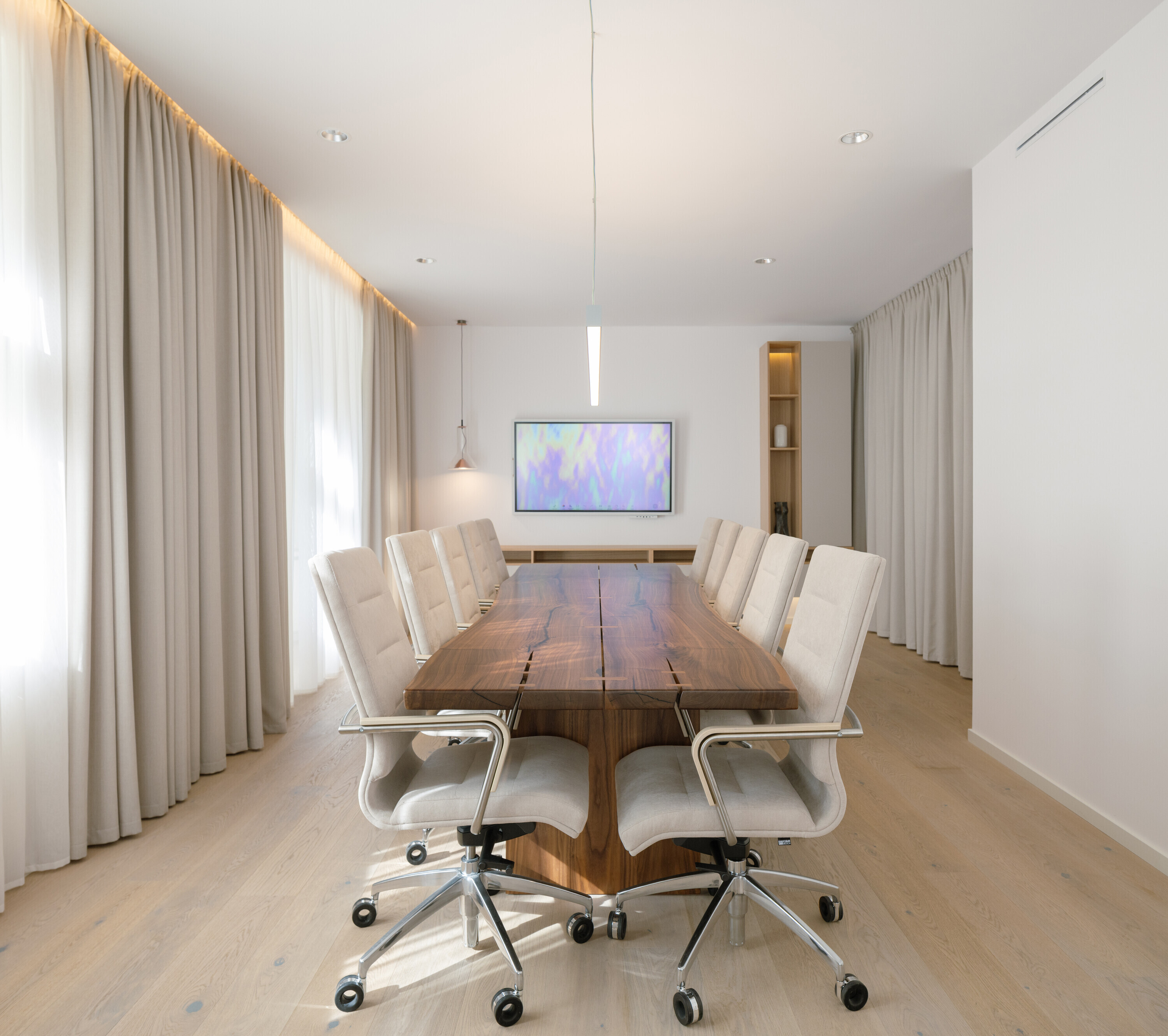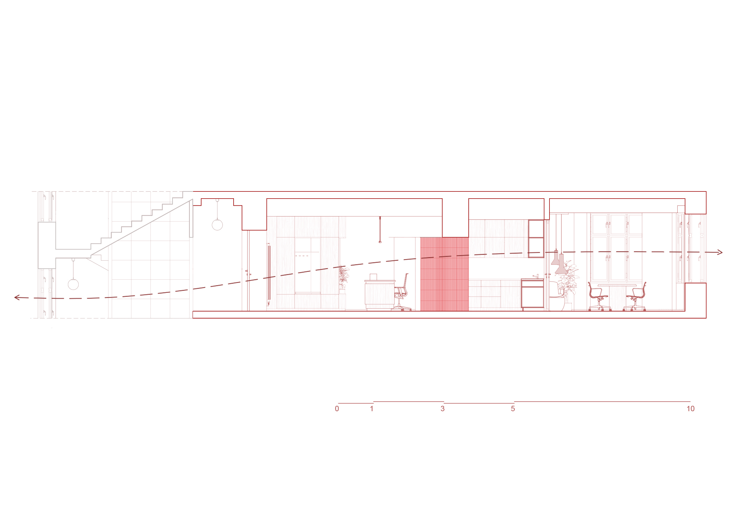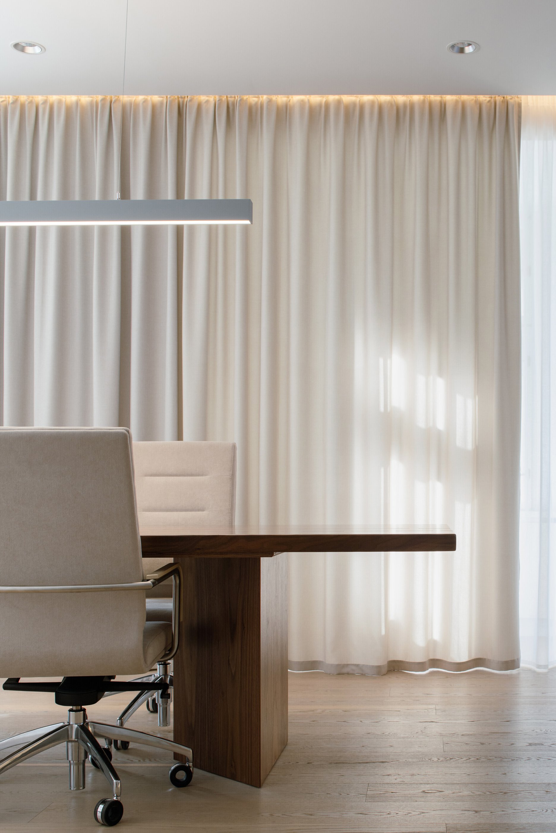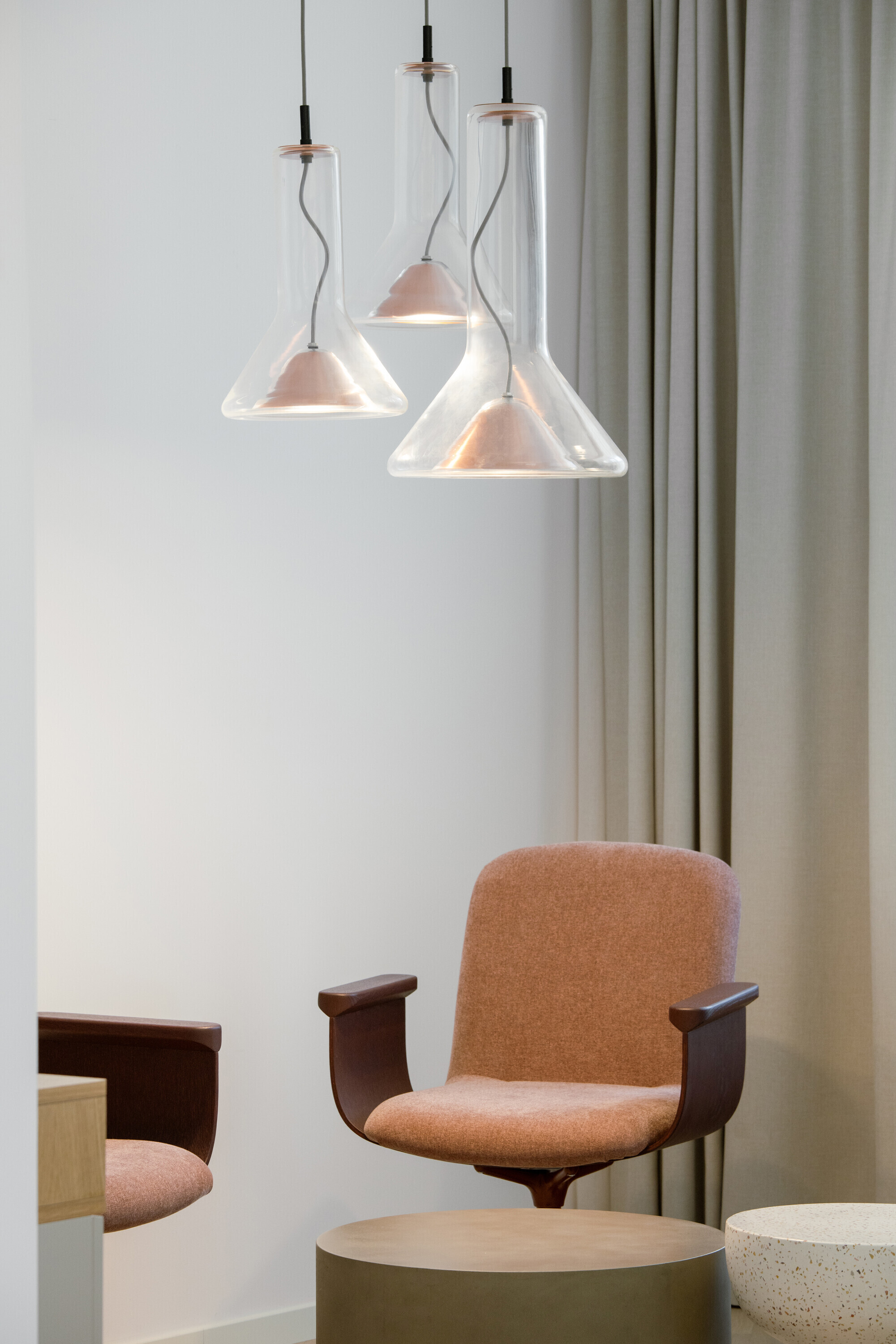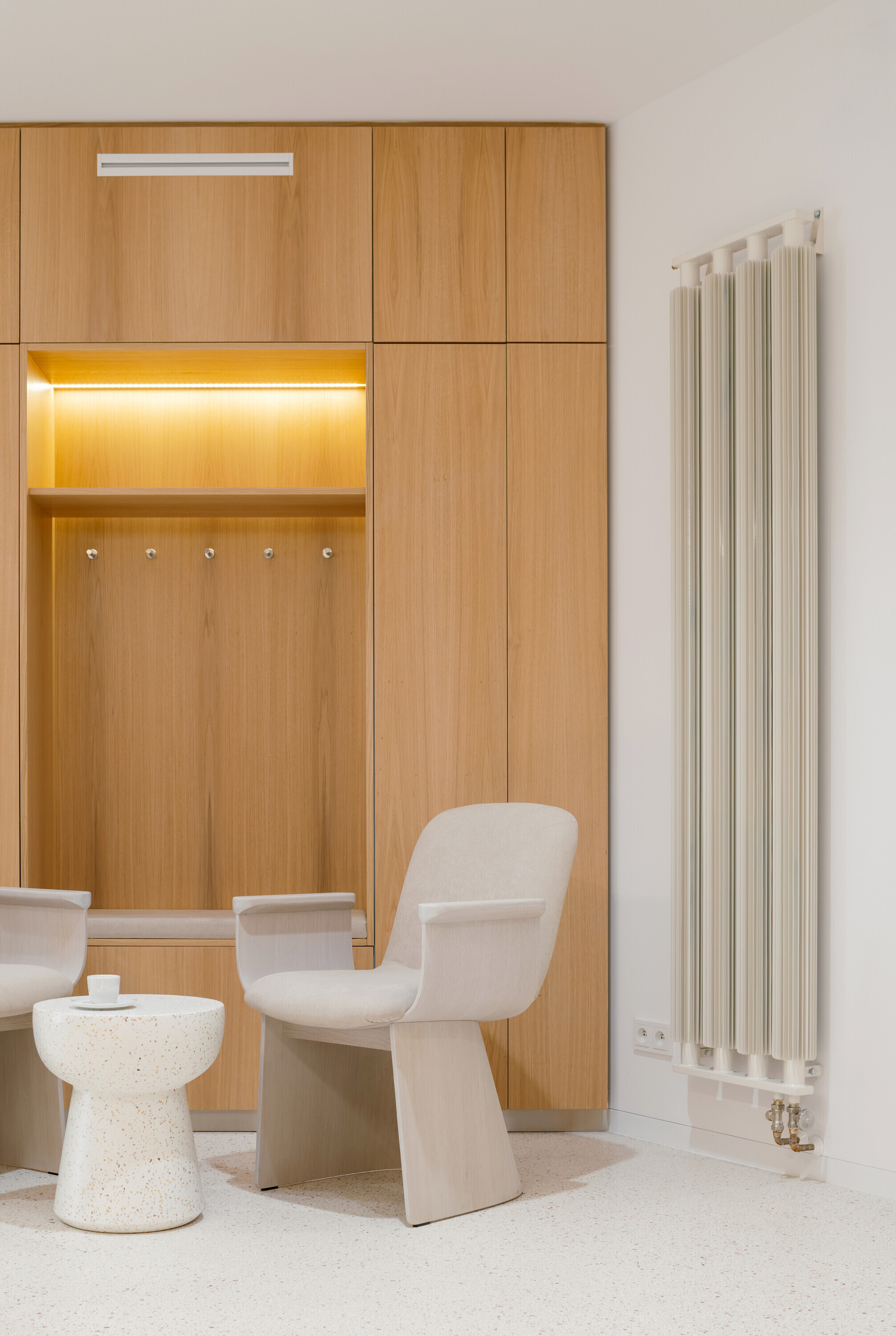 Základnú priestorovú schému interiér ďalej rozvíja prostredníctvom zvolenej palety materiálov. Kedysi tmavé chodby sú nanovo poňaté ako jemne zakrivené priechody s červenými keramickými obkladmi. Rovnaký keramický materiál sa vo svetlejších tónoch objavuje aj v hygienických zariadeniach, čo dotvára vizuálnu kontinuitu naprieč celým podlažím. Výrazné keramické povrchy vyvažuje prírodná dubová podlaha, nábytok a okenné rámy. Na mieru vyrobené orechové zasadacie stoly vnášajú do interiéru hrubšiu textúru. Osvetlenie zvýrazňuje zakrivené tvary a nenápadne vedie pohyb priestorom.