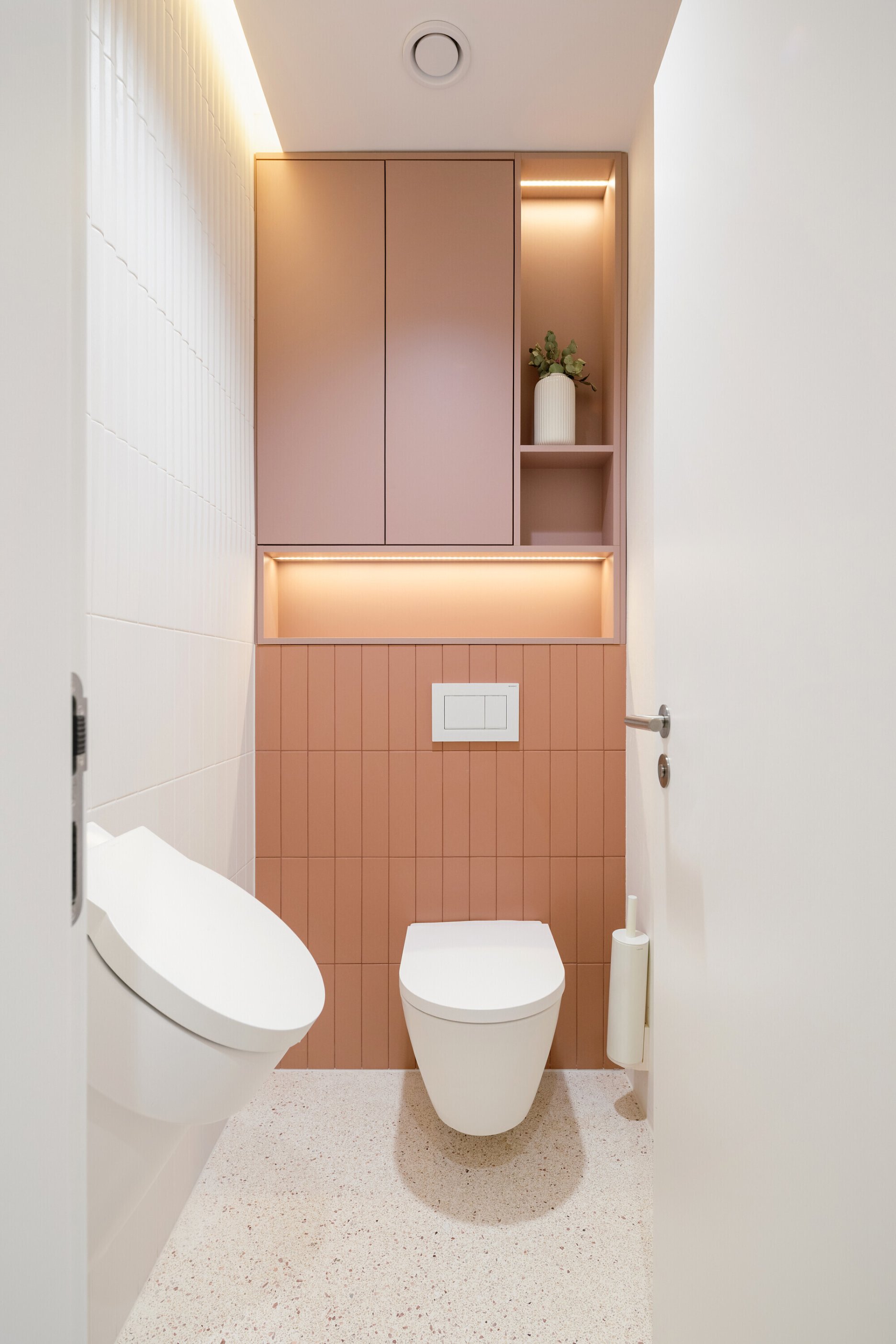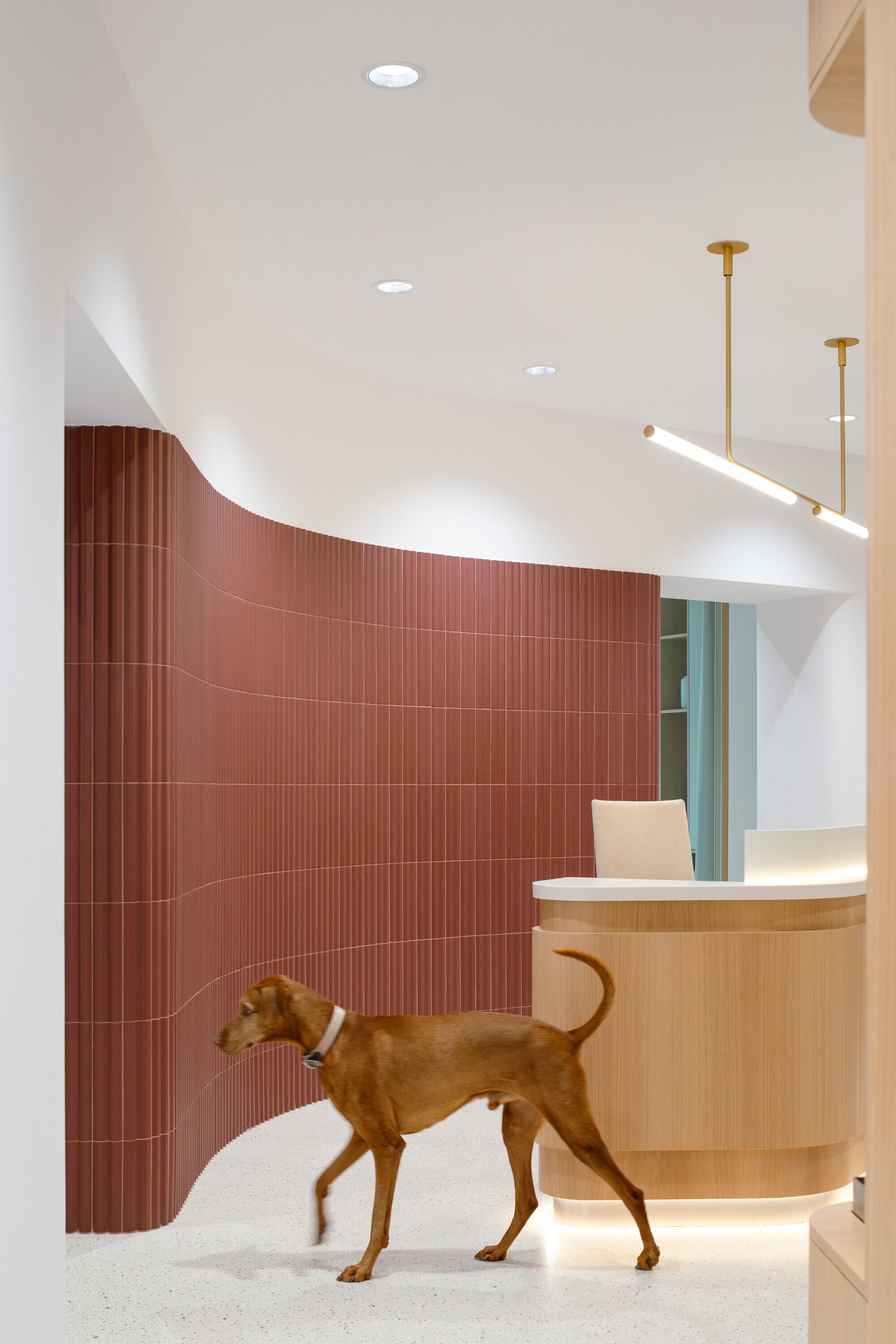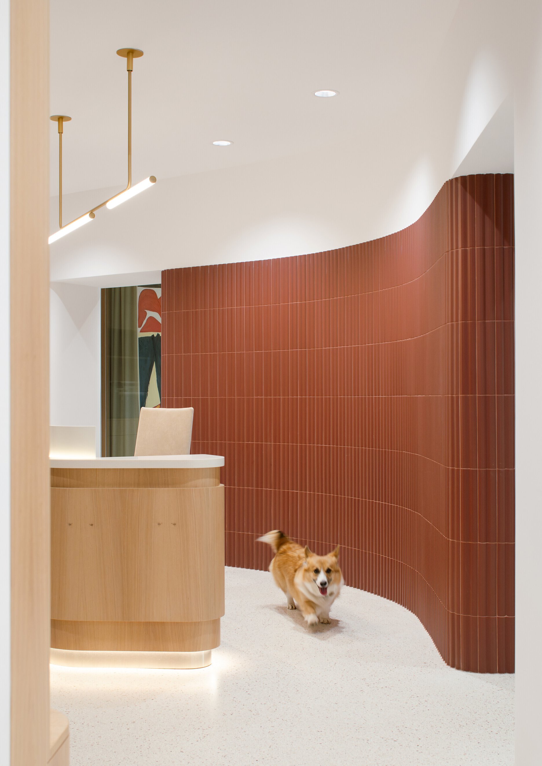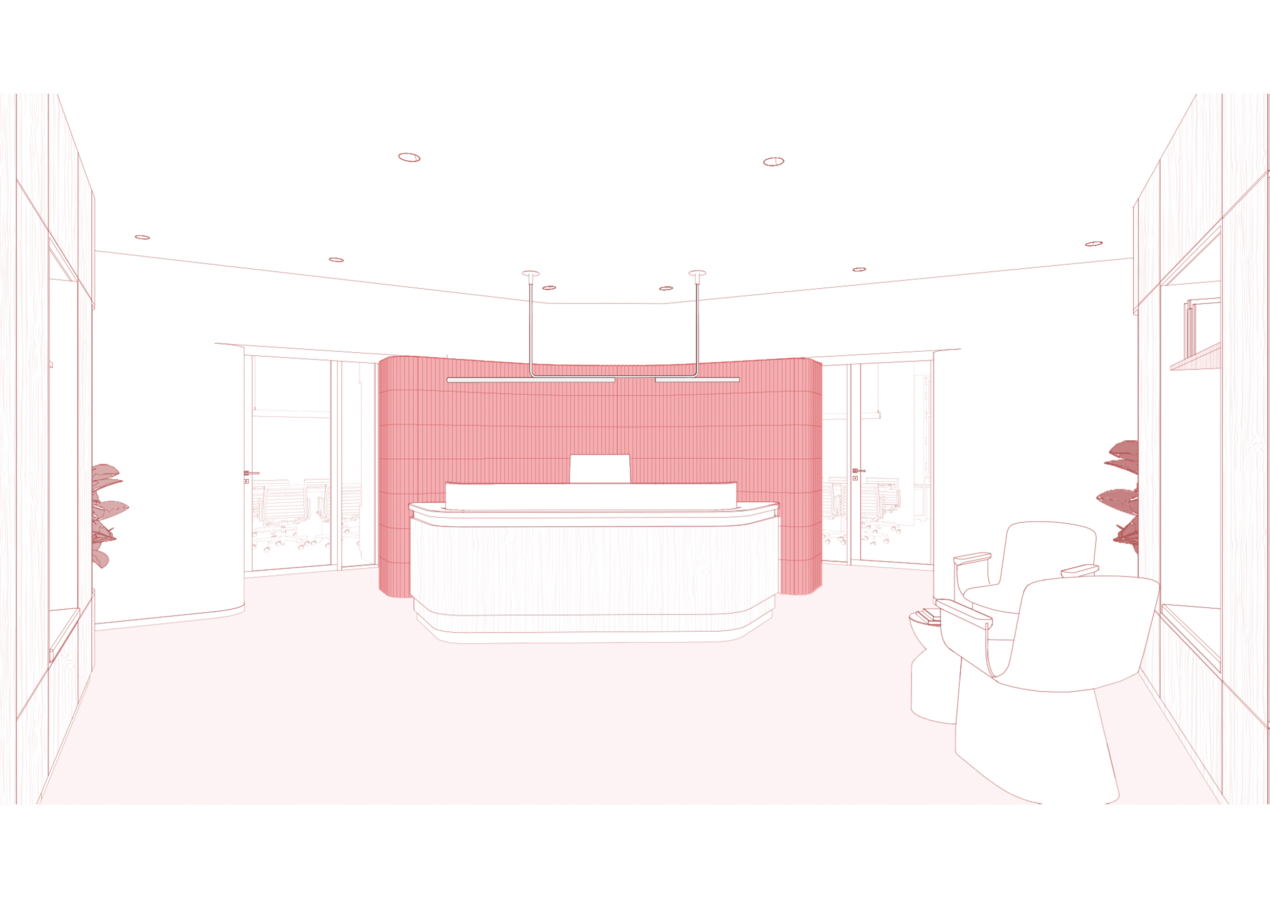 Základnú priestorovú schému interiér ďalej rozvíja prostredníctvom zvolenej palety materiálov. Kedysi tmavé chodby sú nanovo poňaté ako jemne zakrivené priechody s červenými keramickými obkladmi. Rovnaký keramický materiál sa vo svetlejších tónoch objavuje aj v hygienických zariadeniach, čo dotvára vizuálnu kontinuitu naprieč celým podlažím. Výrazné keramické povrchy vyvažuje prírodná dubová podlaha, nábytok a okenné rámy. Na mieru vyrobené orechové zasadacie stoly vnášajú do interiéru hrubšiu textúru. Osvetlenie zvýrazňuje zakrivené tvary a nenápadne vedie pohyb priestorom.