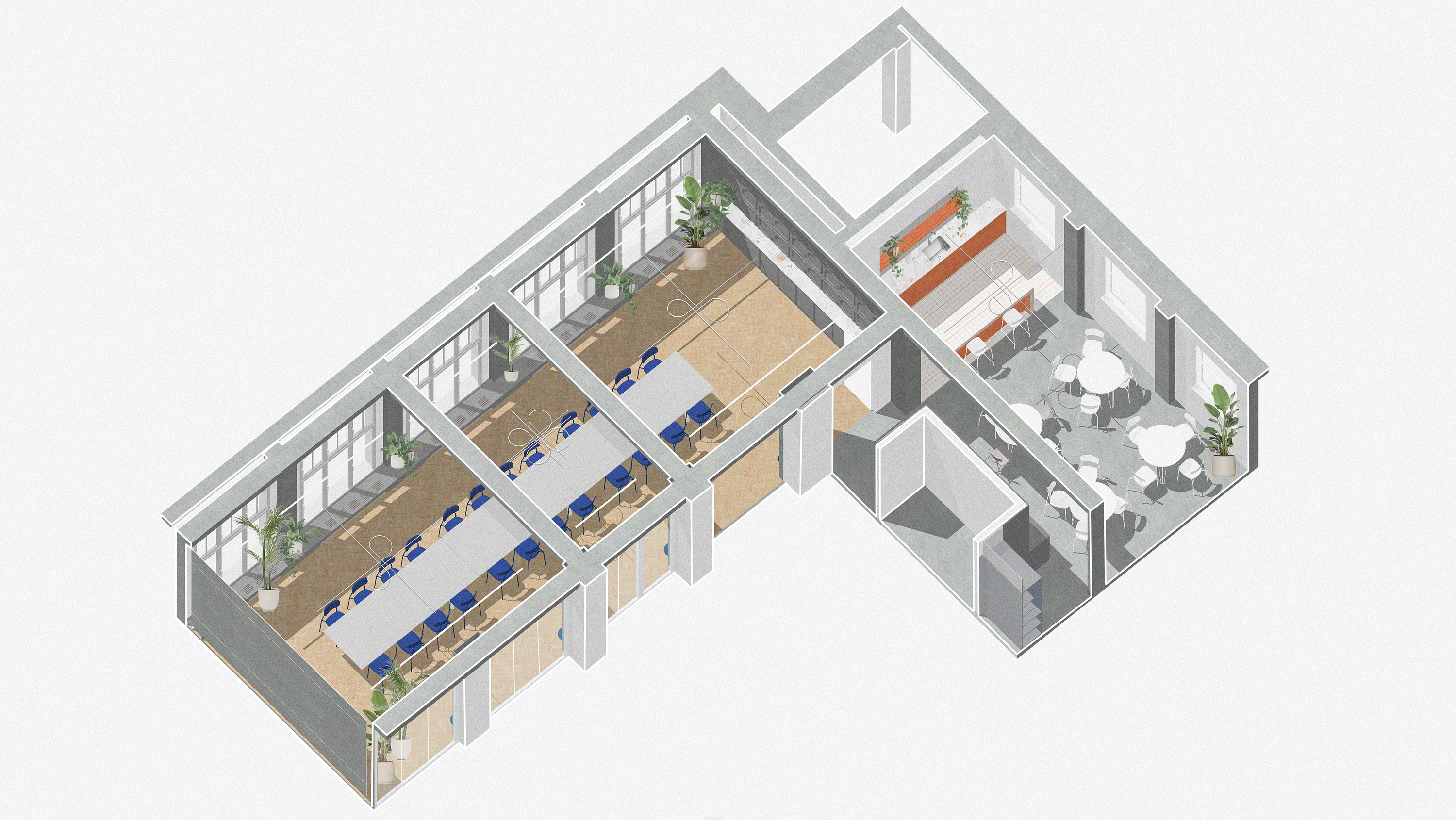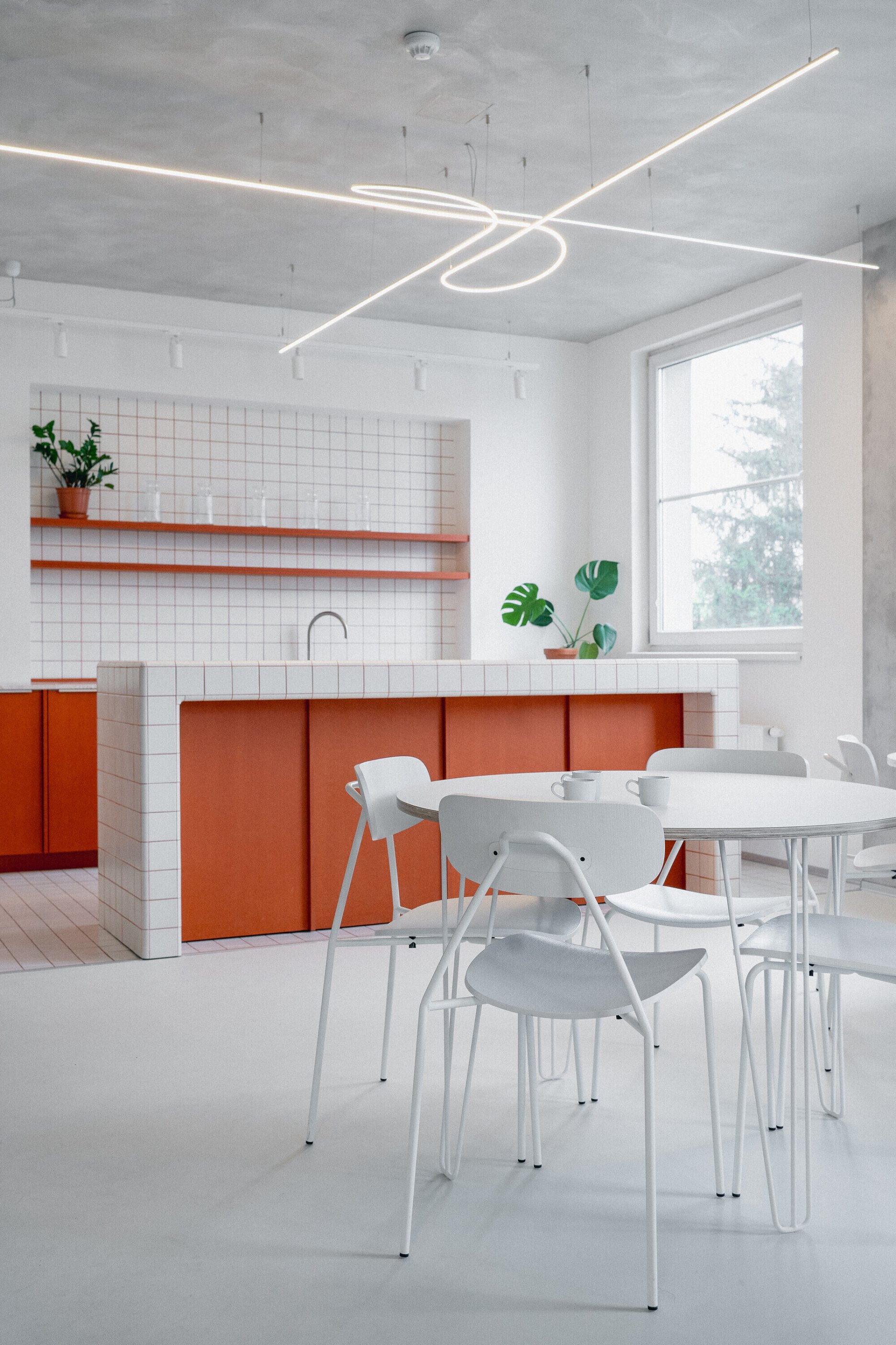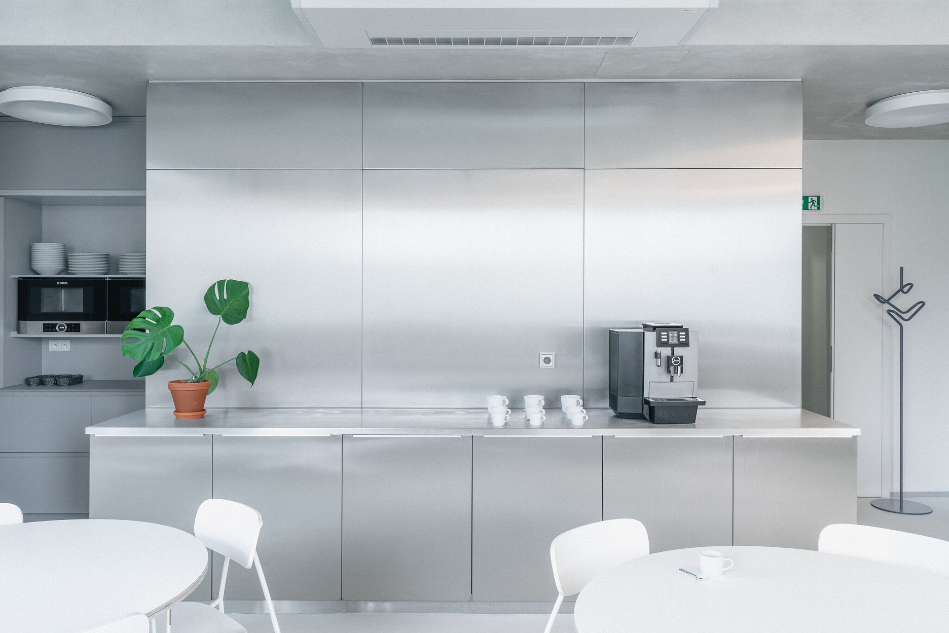 Firma sa do budovy presťahovala v roku 2019 a odvtedy postupne plánovala, ako jej priestory prispôsobiť svojim požiadavkám. Prvá etapa premeny sa sústredila na zázemie pre zamestnancov – prioritou bola moderná kuchynka a kapacitná zasadacia miestnosť. Pôvodná rozsiahla kuchyňa s jedálňou už neplnila svoju úlohu. Obedy sa dovážajú z externých prevádzok a zamestnanci ich spravidla konzumujú vo svojich kanceláriách. Nanovo vznikla útulná kuchynka so zázemím na ohrievanie jedál a kvalitnými kávovarmi, ktorá slúži aj ako miesto neformálnych stretnutí. Uvoľnený priestor po jedálni architekti pretvorili na zasadačku pre 26 osôb, potrebnú pre rozrastajúci sa tím.