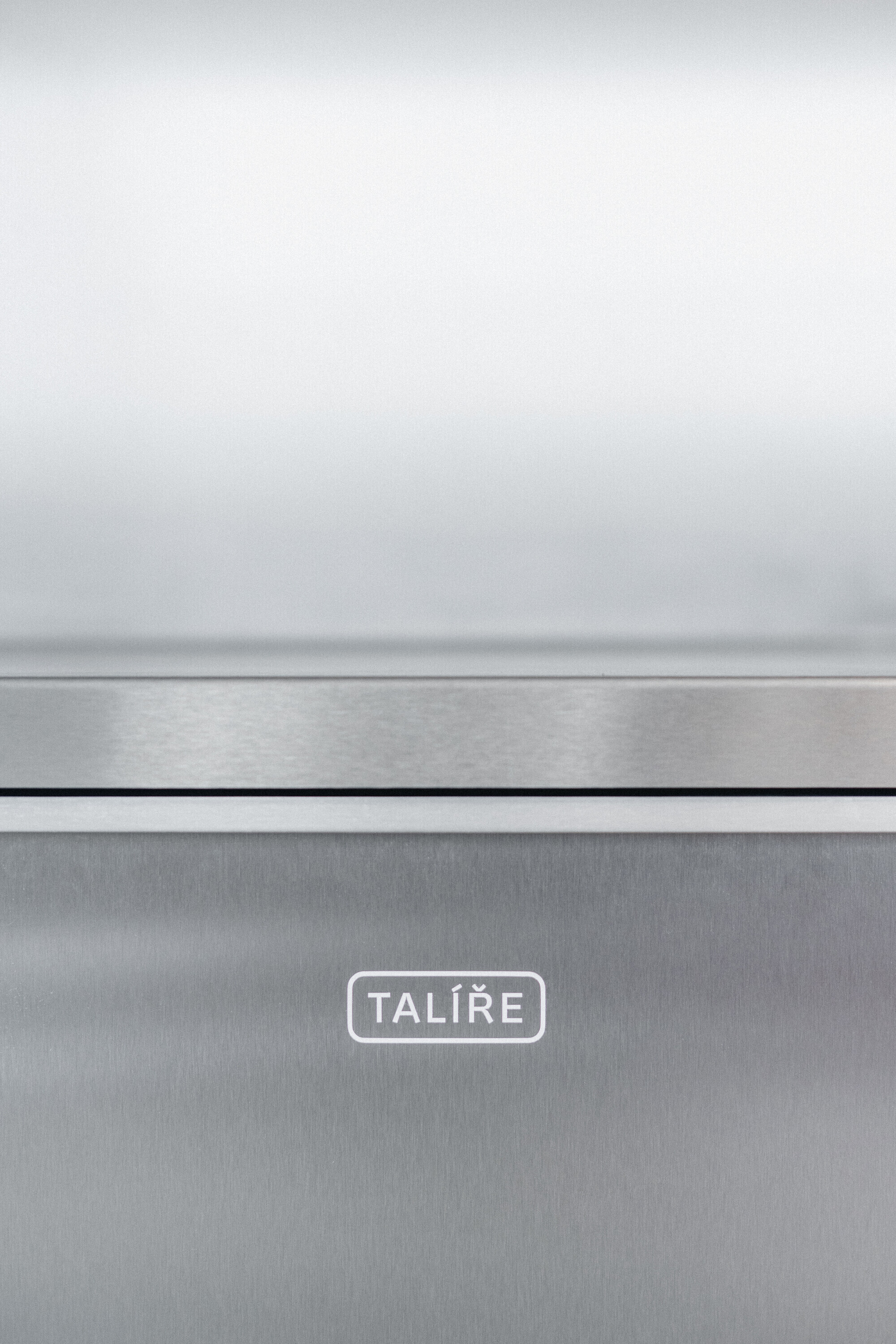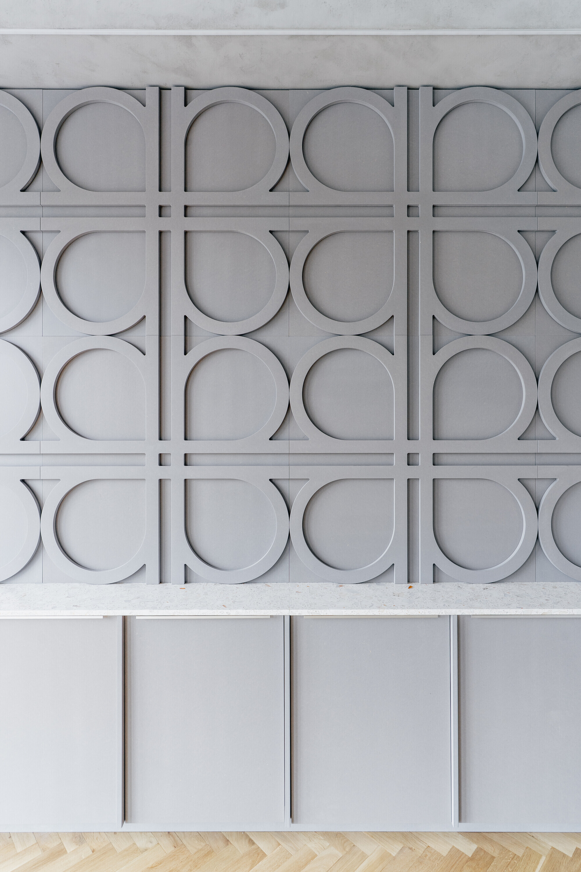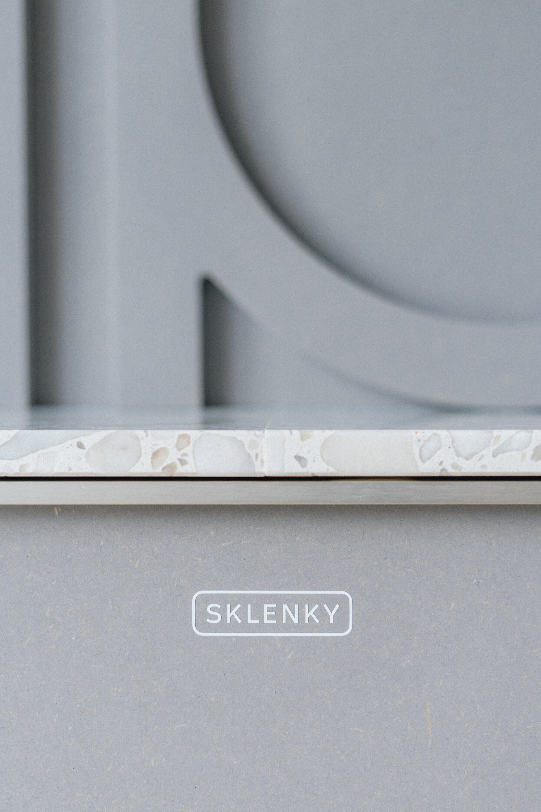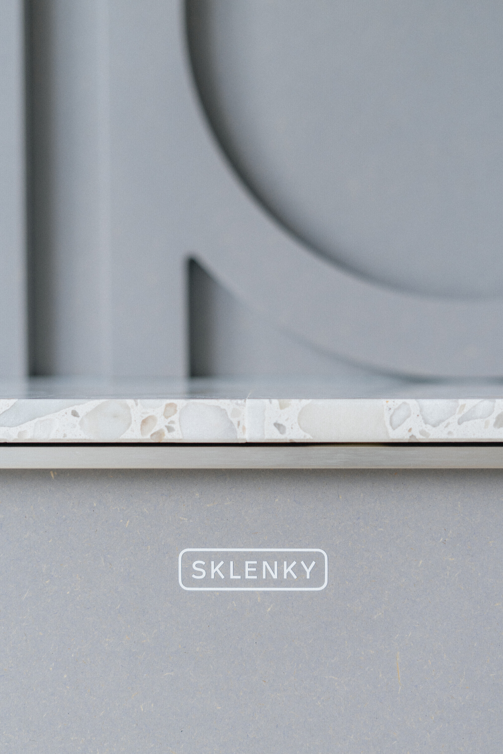 Použité materiály podčiarkujú súčasný charakter priestoru – v kuchynskej časti dominuje nerezové obloženie a keramický ostrovček, v zasadačke zas atypické MDF obloženie, ktoré nesie motív loga firmy využitý ako vzor.