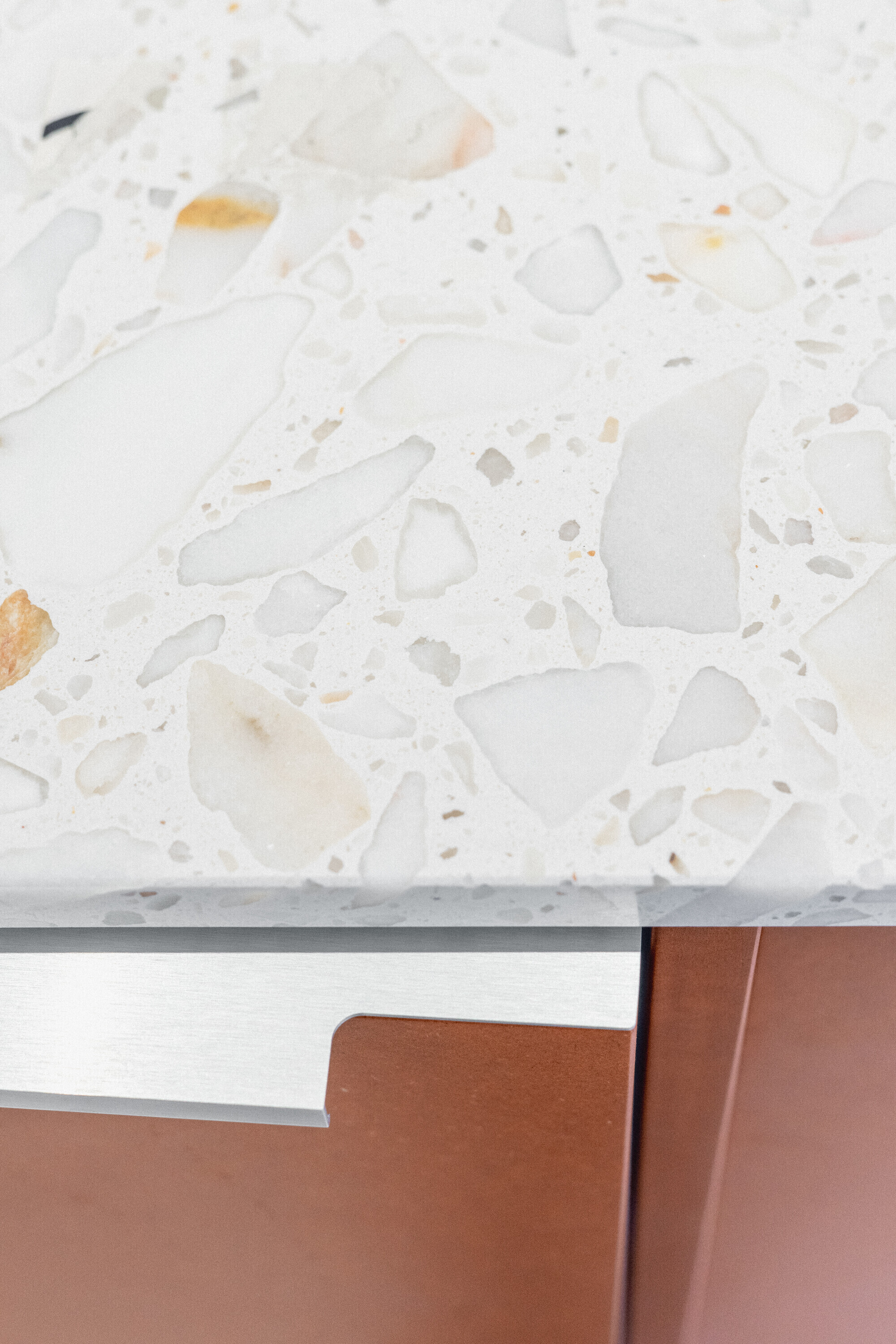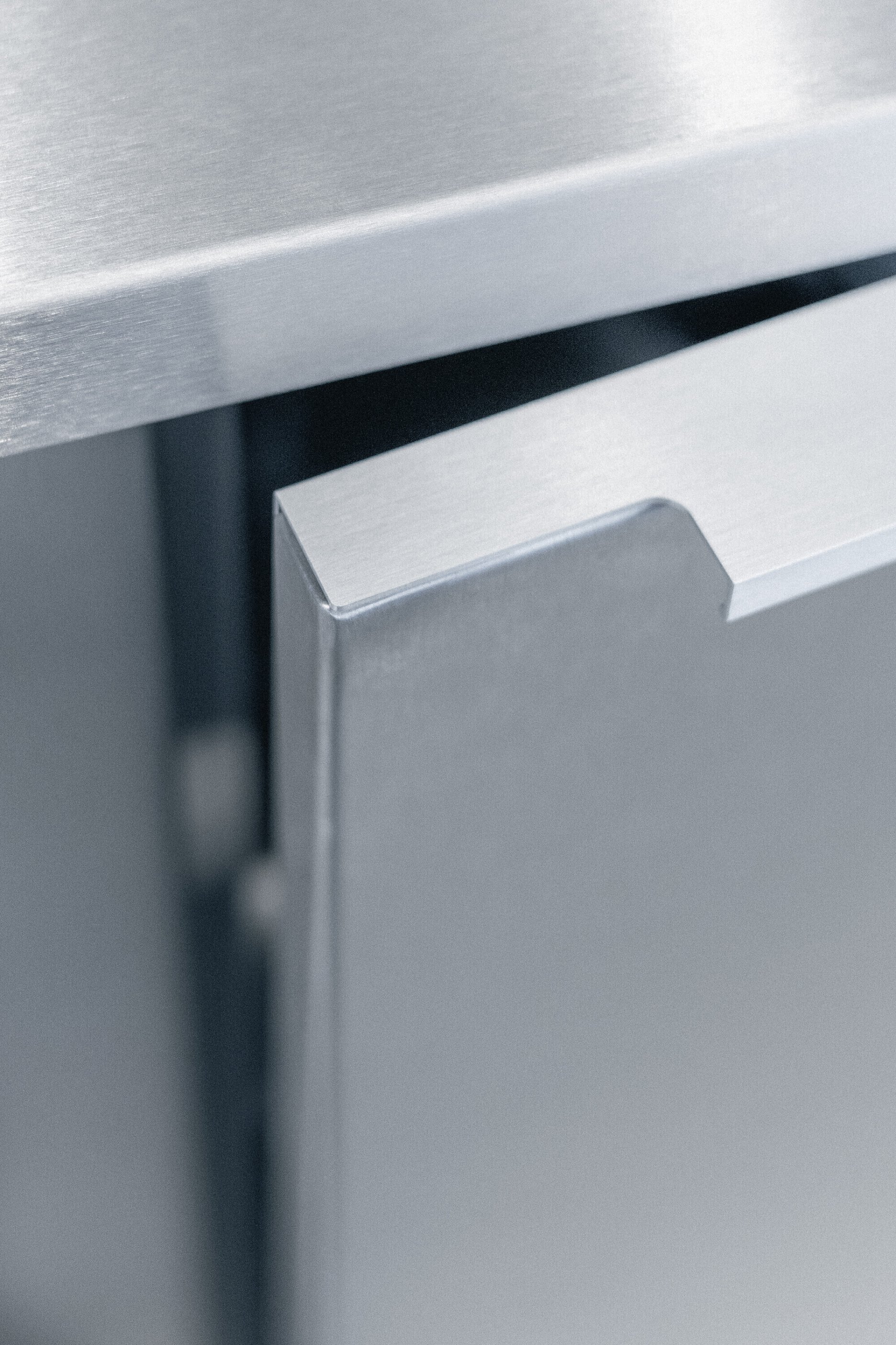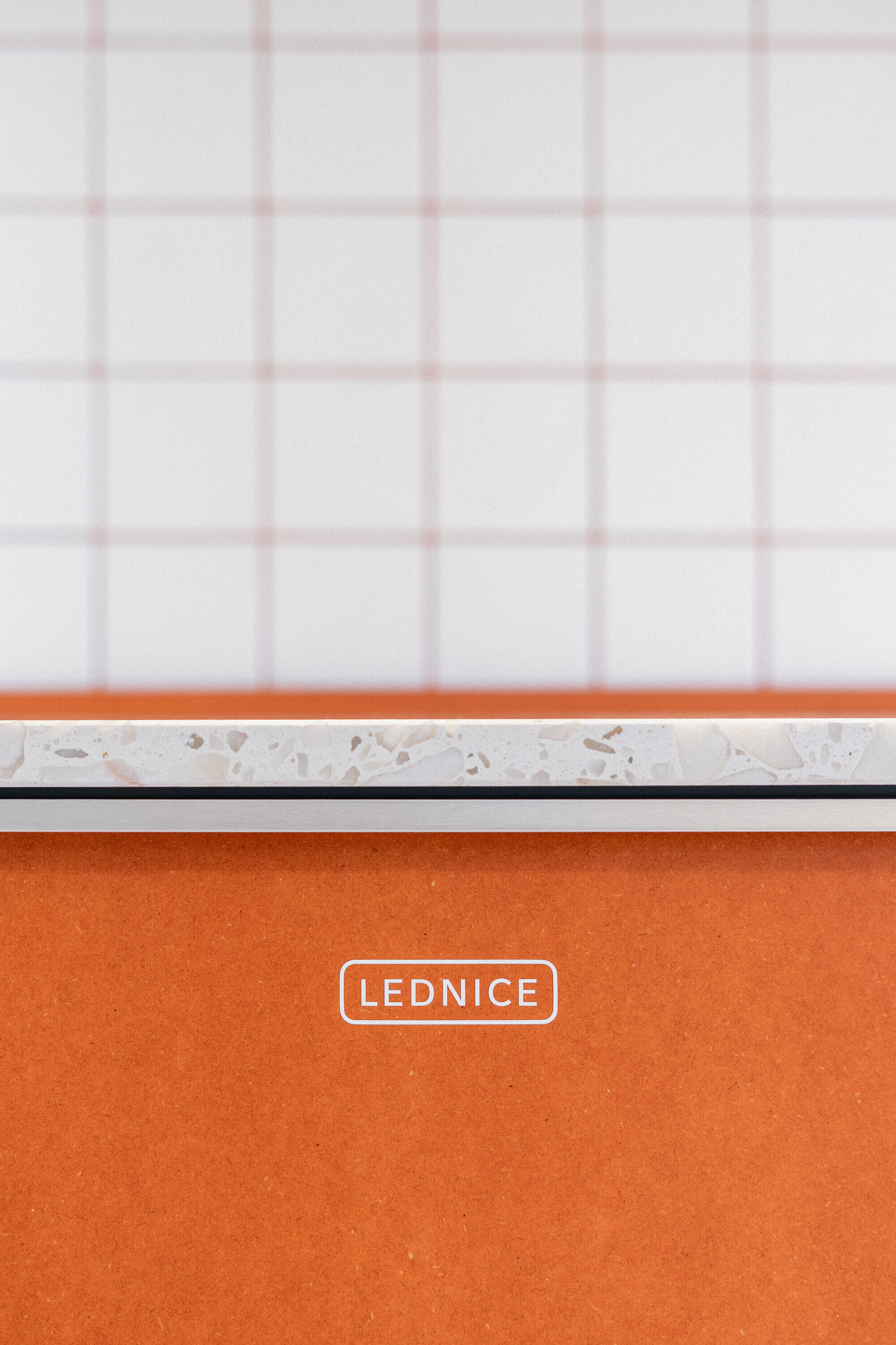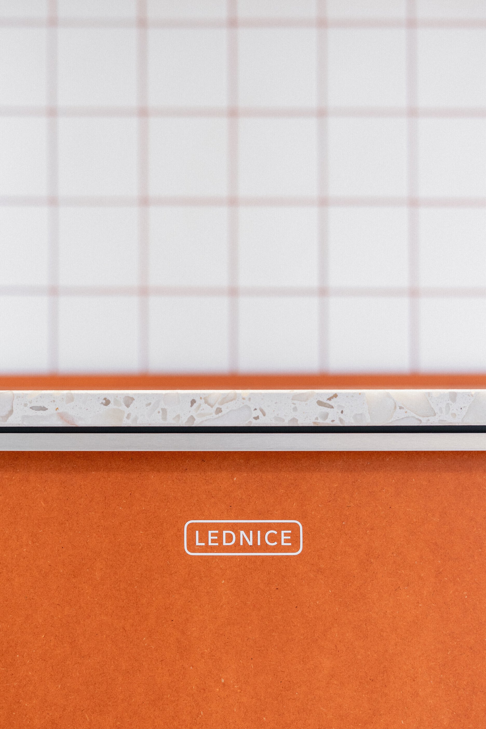 Použité materiály podčiarkujú súčasný charakter priestoru – v kuchynskej časti dominuje nerezové obloženie a keramický ostrovček, v zasadačke zas atypické MDF obloženie, ktoré nesie motív loga firmy využitý ako vzor.