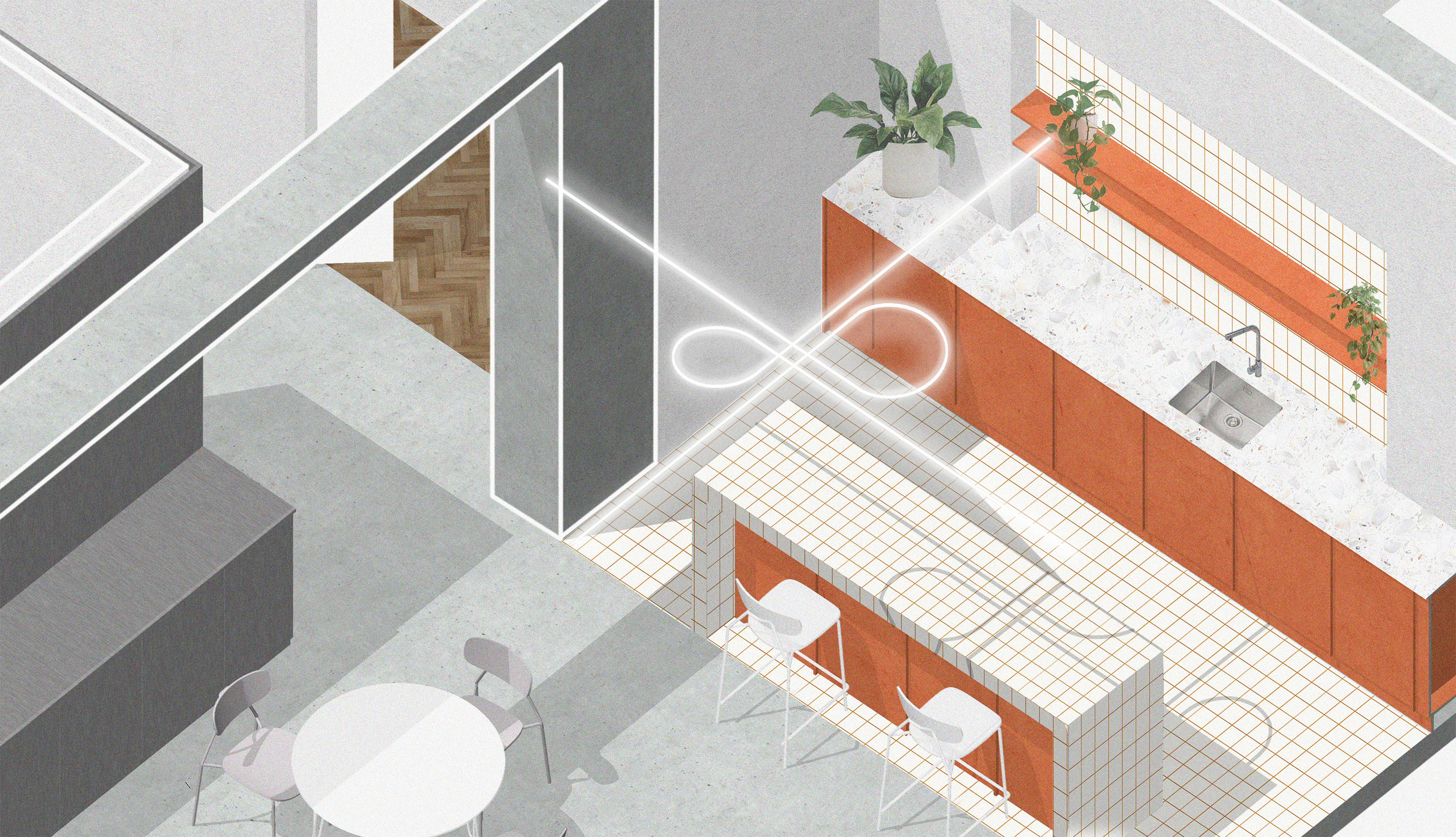 Na firemnú identitu architekti zo Studia COSMO nadviazali aj vo výrazných dizajnových prvkoch, ako sú atypické svietidlá navrhnuté na mieru rekonštruovanému priestoru – svojím tvarom odkazujú na križovatky, teda hlavný motív loga, a symbolicky prepájajú profesijné zameranie firmy s estetikou interiéru.