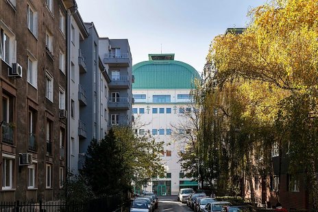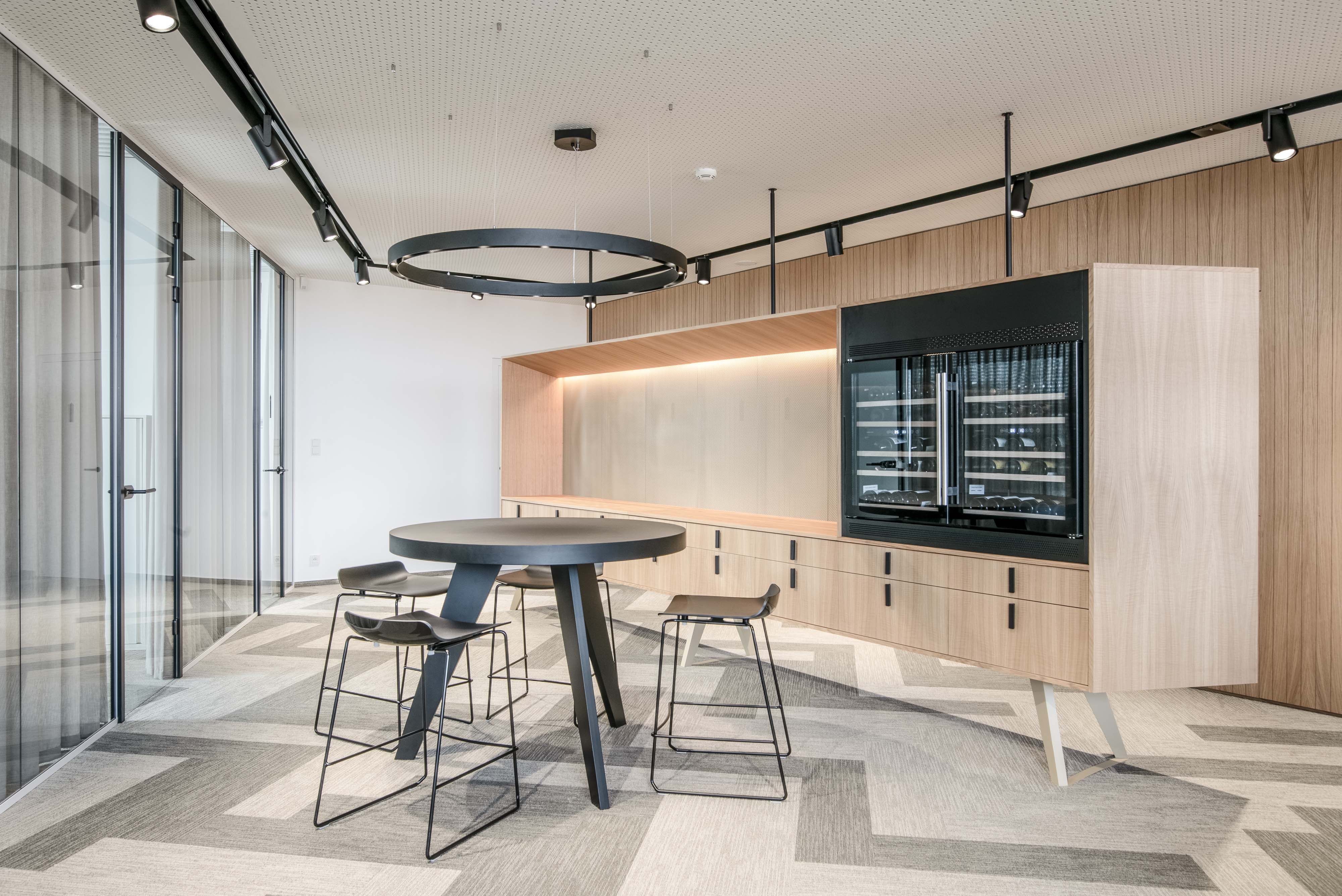 V zadnej časti kancelárskeho priestoru sa chodba otvára do "námestia", ktoré zo strany fasády ohraničuje presklená stena s integrovanými vstupnými dverami do kancelárskych buniek. V strede sa nachádza solitérny hruhový stôl, ktorý funkčne prislúcha k druhému drevenému boxu v priestore. Tento box je koncepčne rovnaký ako susedný box obsahujúci knižnicu, avšak na rozdiel od neho v sebe integruje chladničky na vína a barový pult s úložným priestorom. Pozícia boxu nie je náhodná a plní funkciu paravanu pred vstupnými dverami do predsienok hygienických priestorov.