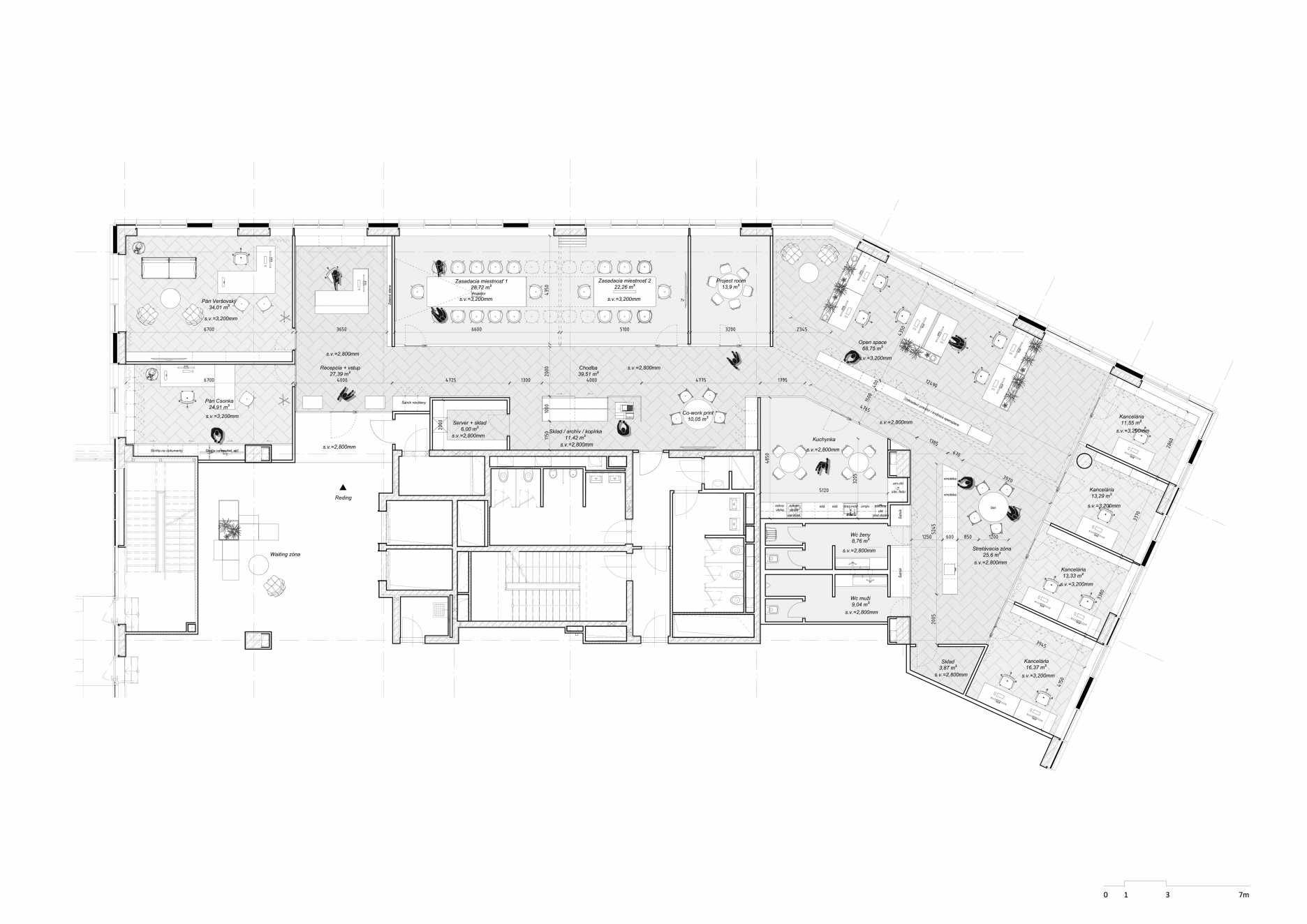 Dispozíciu sme rozdelili na presvetlené kancelárie orientované pozdĺž fasády, pobytové chodbové priestory s menšími nárokmi na prirodzené svetlo a uzavreté hygienické a skladové priestory bez denného svetla orientované pozdĺž vnútorného jadra budovy. Silnou stránkou dispozície sú práve chodbové priestory, ktoré obsahujú okrem komunikačnej funkcie aj možnosť neformálneho stretnutia a posedenia.