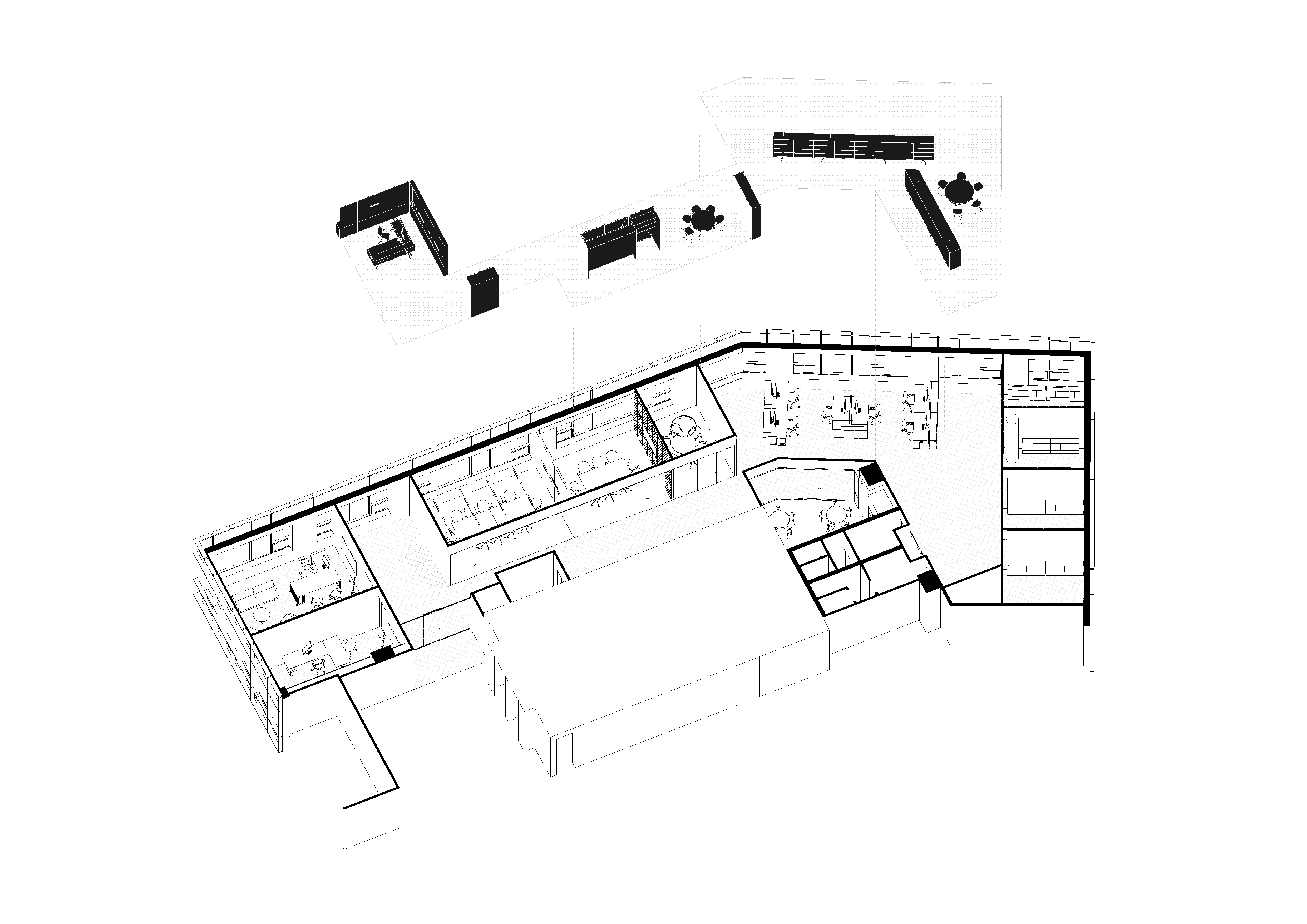 Za chodbou sa priestor zalamuje a otvára do kancelárskeho „openspace“ orientovaného pozdĺž fasády. Intimitu a nerušenú prácu zabezpečuje solitérny drevený úložný box s knižnicou, ktorý stojí na nožičkách. Úložný box okrem svojej praktickej funkcie koncepčne definuje pokračovanie chodby a plní funkciu paravanu. Do nábytkového prvku je integrovaná čalúnená nika so sedením. Oproti regálu sa vstupuje do kuchynky, ktorá je uzavretá za sklenenou stenou. Kuchynka obsahuje linku a dva kruhové stoly so stoličkami.