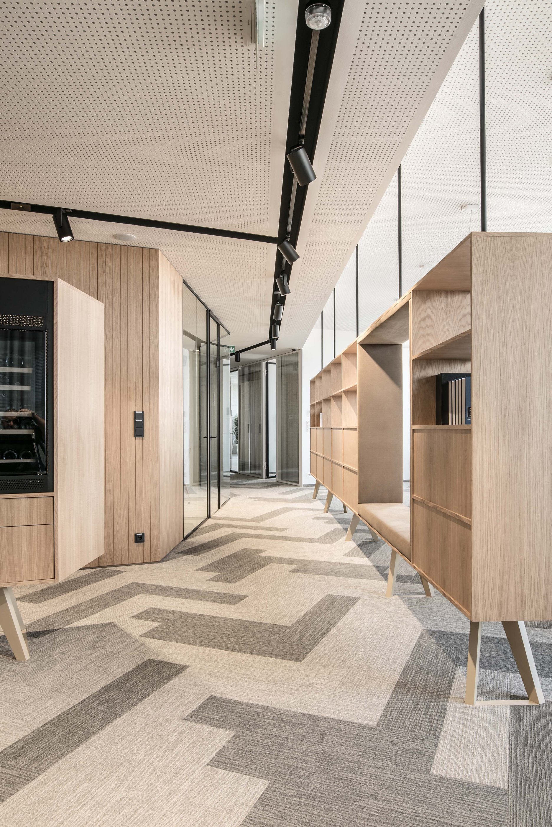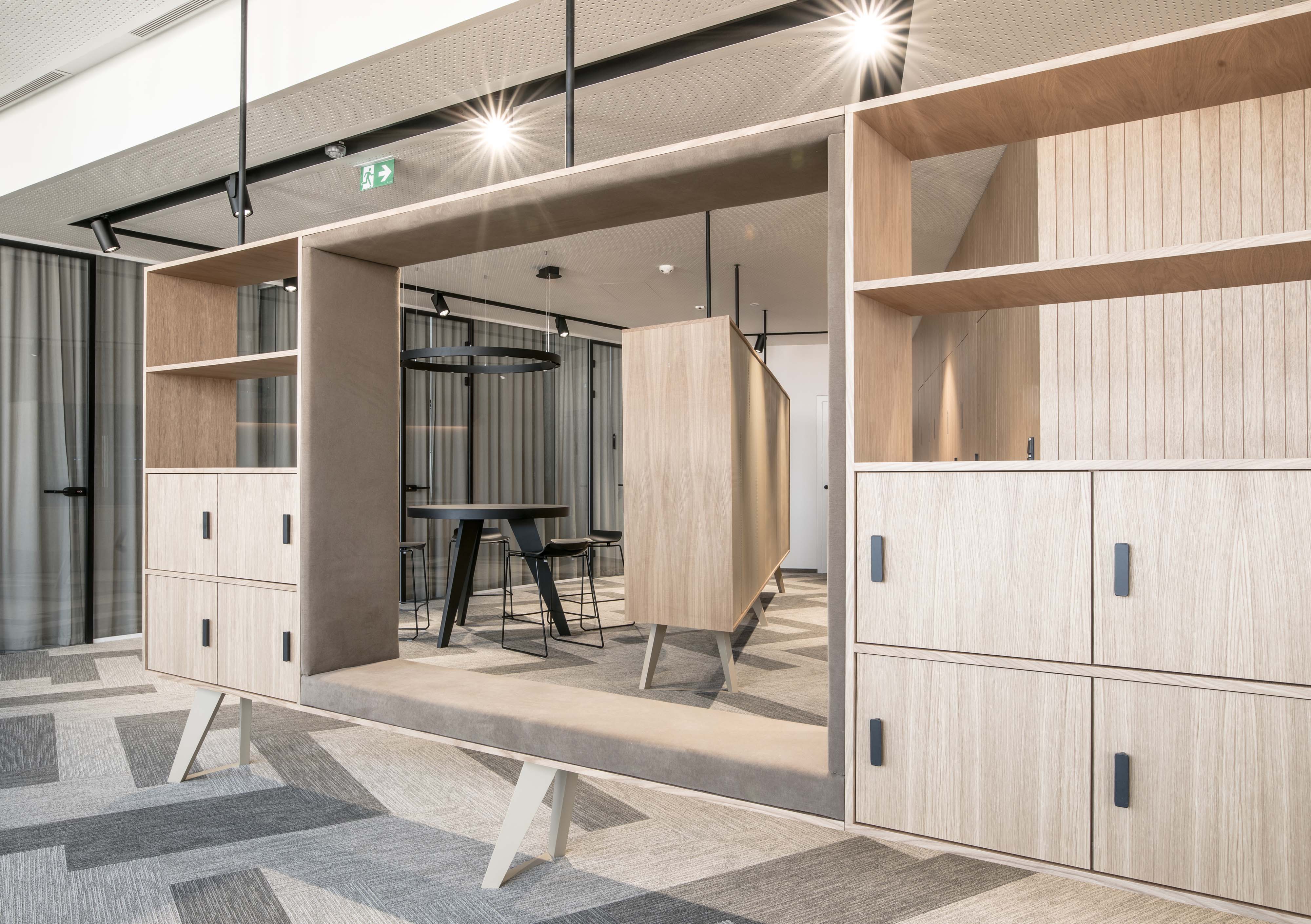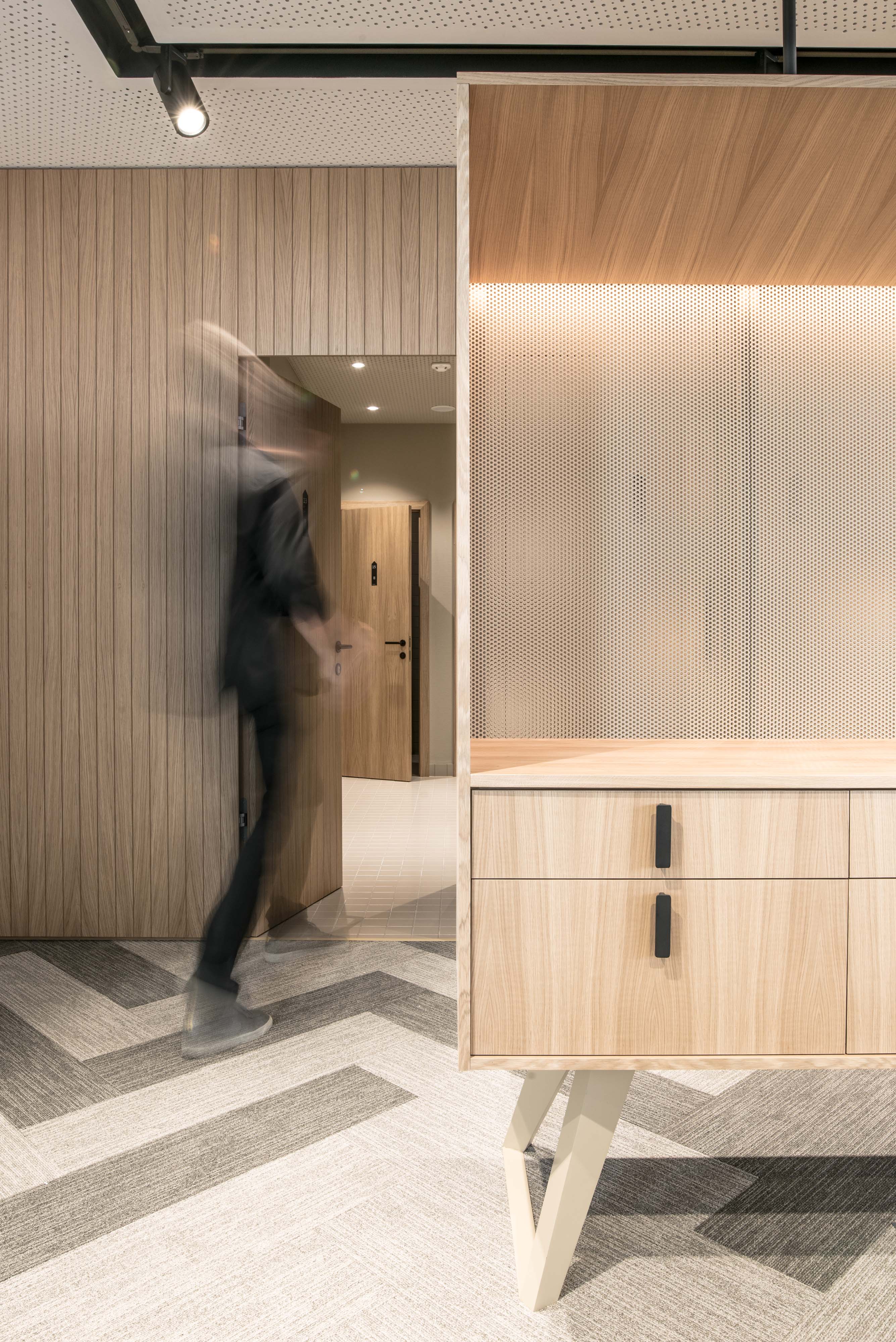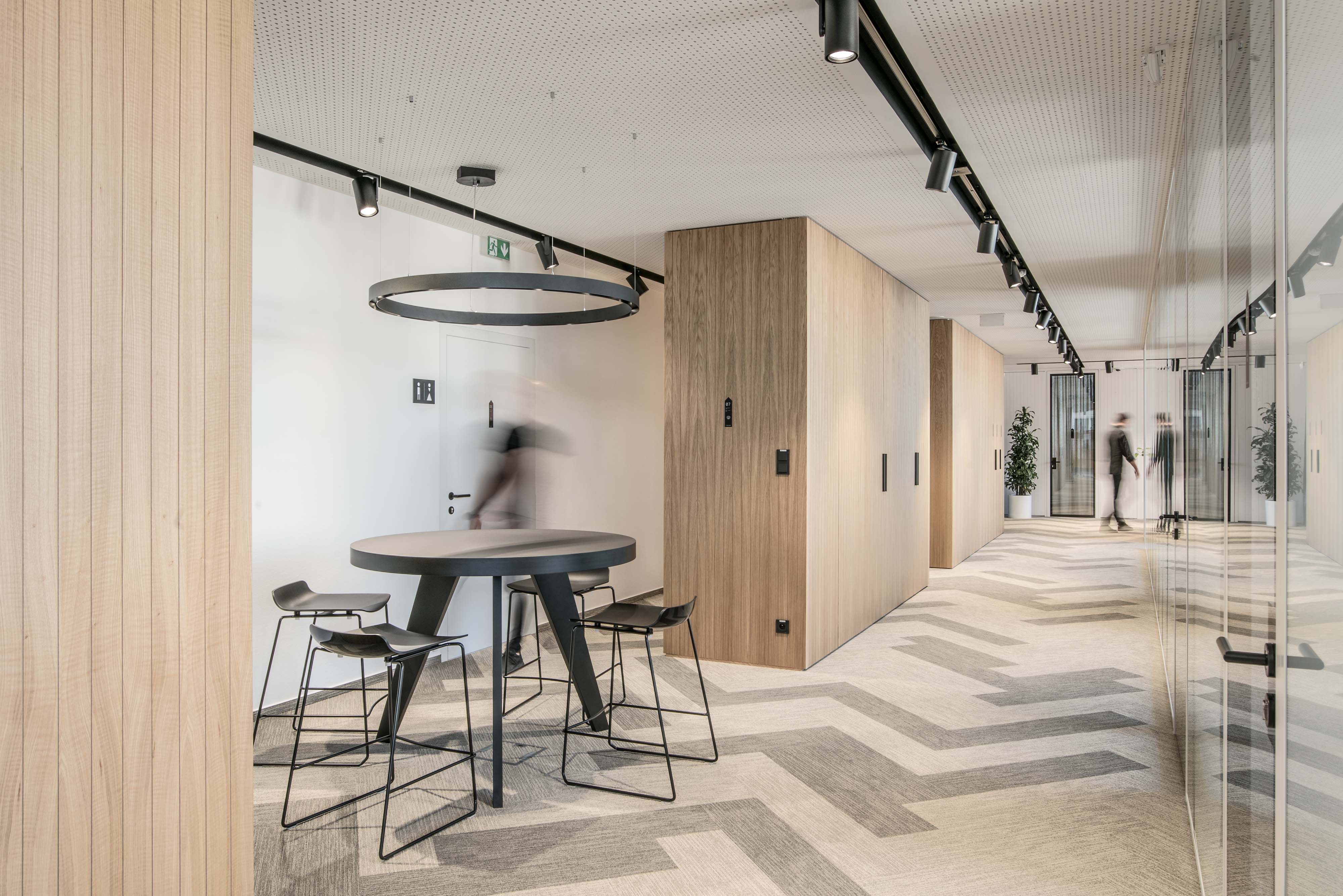 Charakteristická vlastnosť na mieru vyrábaných stolárskych komponentov je integrácia funkcií a definovanie samotného priestoru z prevádzkového a pocitového hľadiska. Použitá materiálová skladba a monochromatická farebnosť je predpokladom neutrálneho a príjemného pôsobenia na užívateľa priestoru a nadčasového vzhľadu do budúcnosti. Multifunkčné využitie chodbových priestorov (posedenie, občerstvenie,...) povyšuje úroveň priestoru vhodnú na spoločenskú aktivitu.