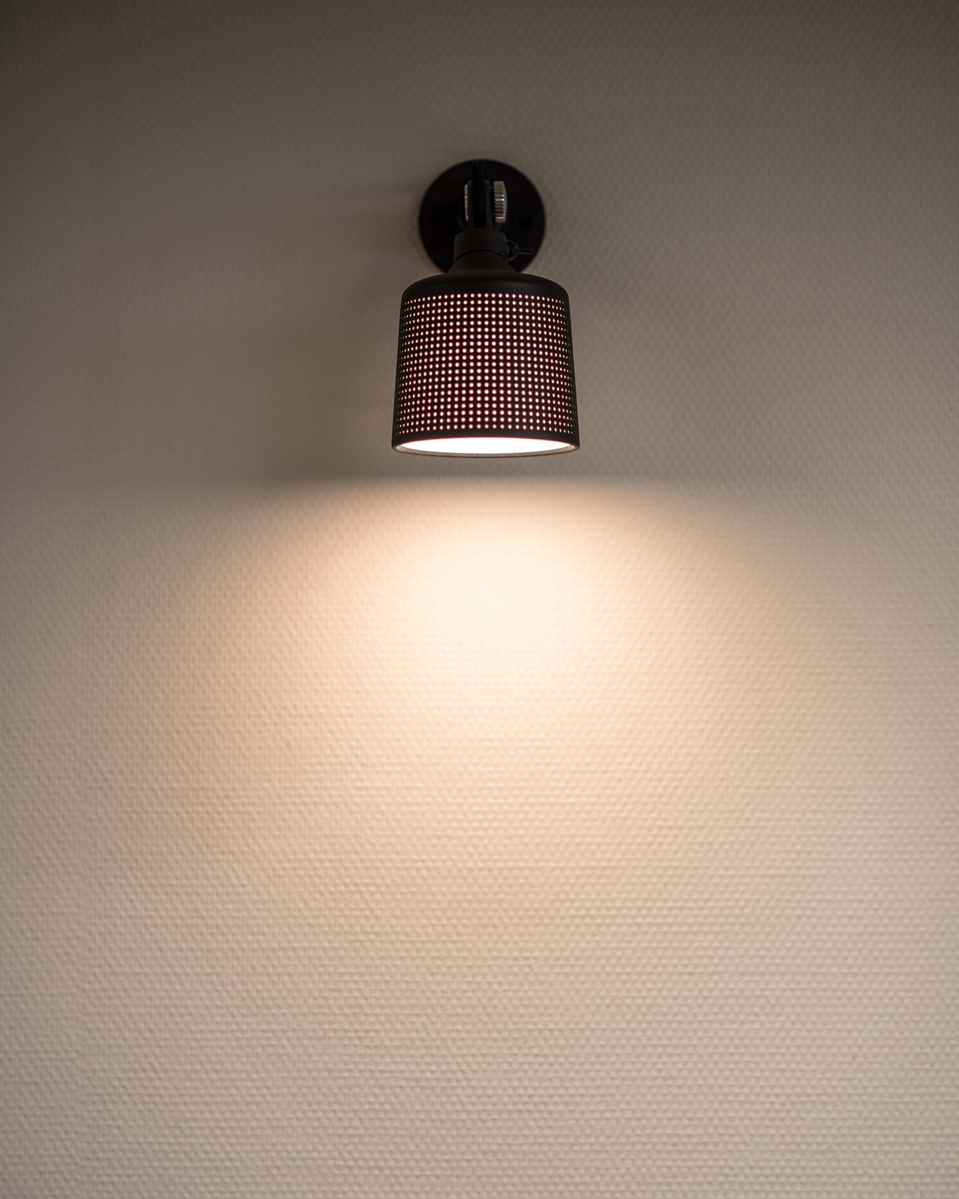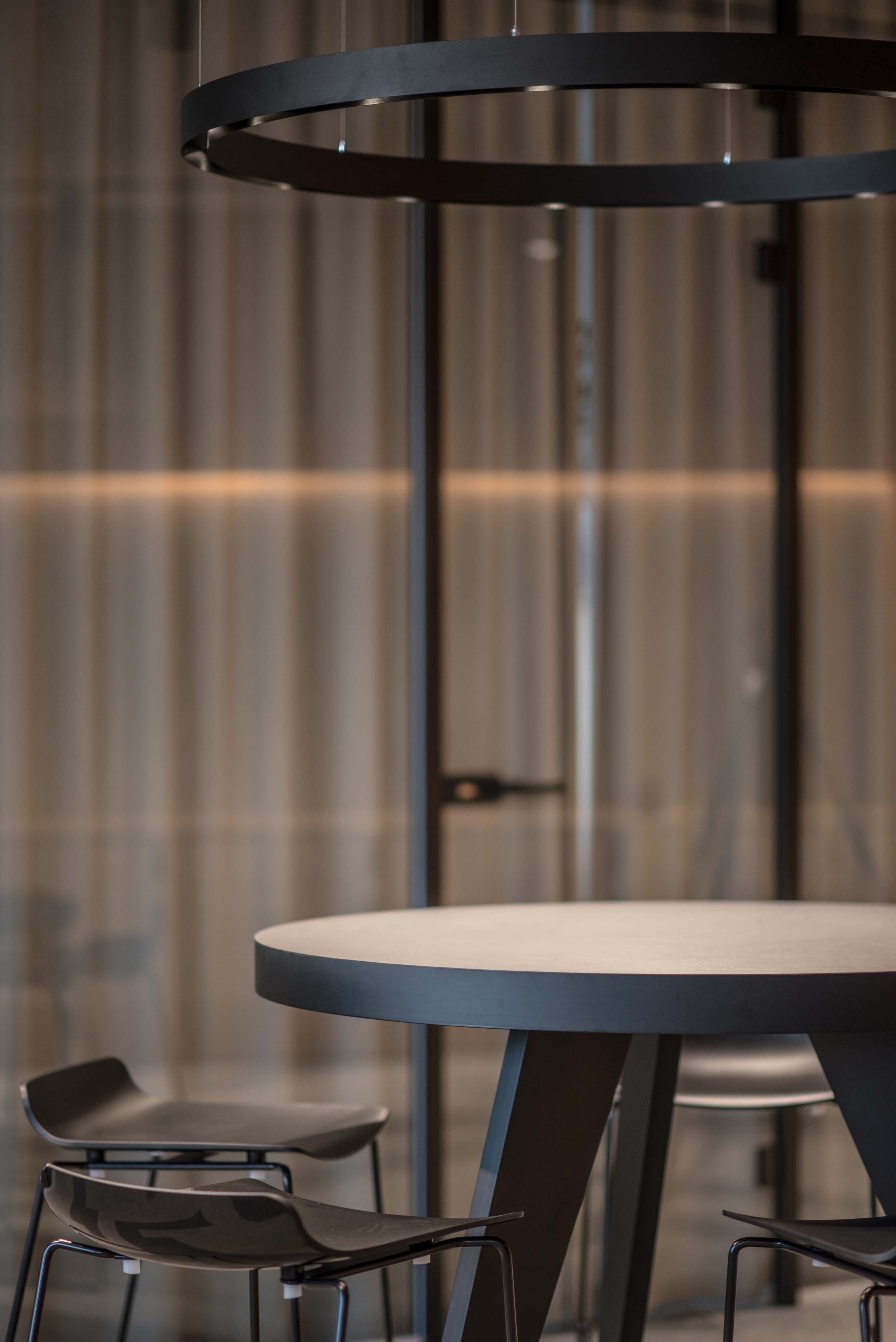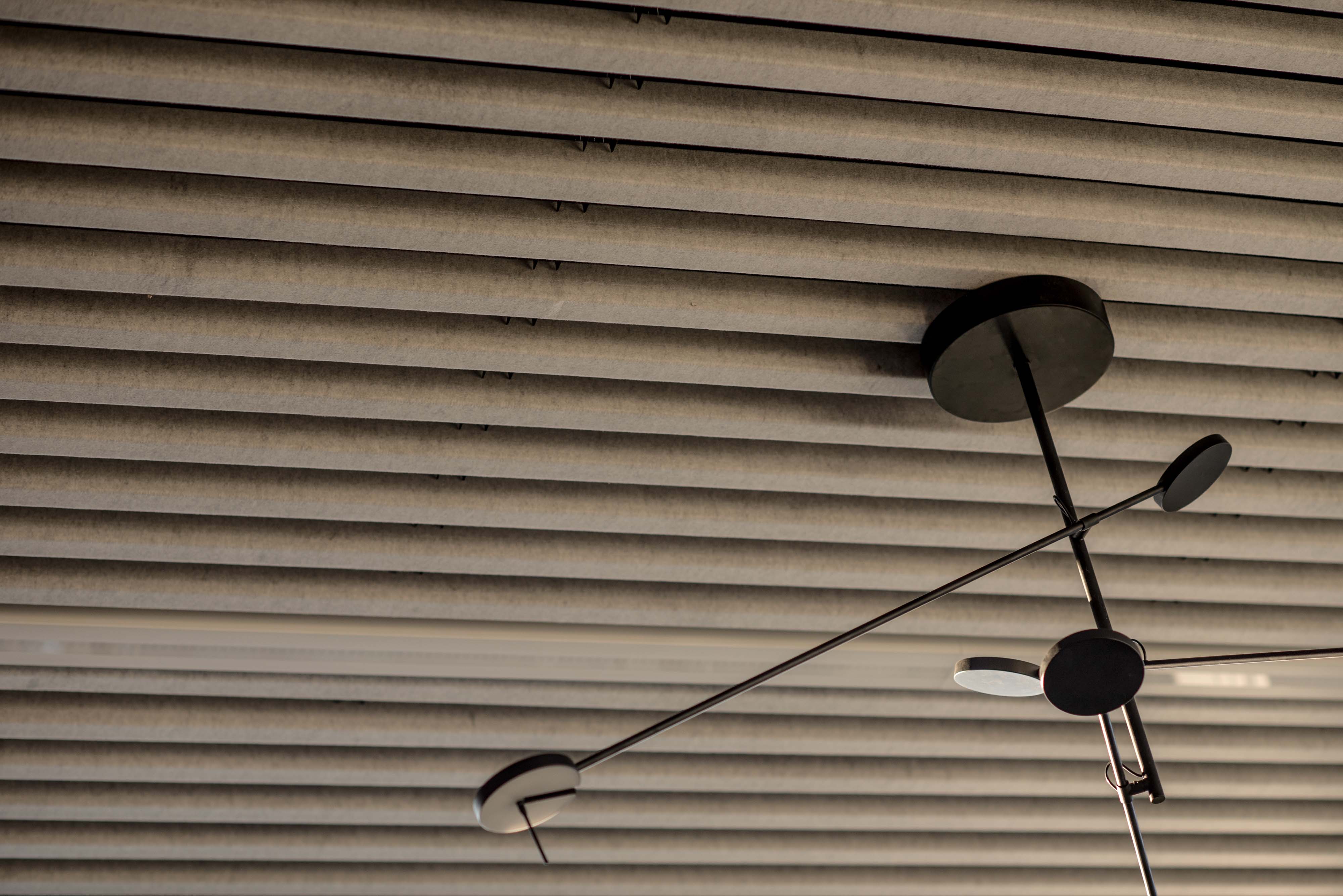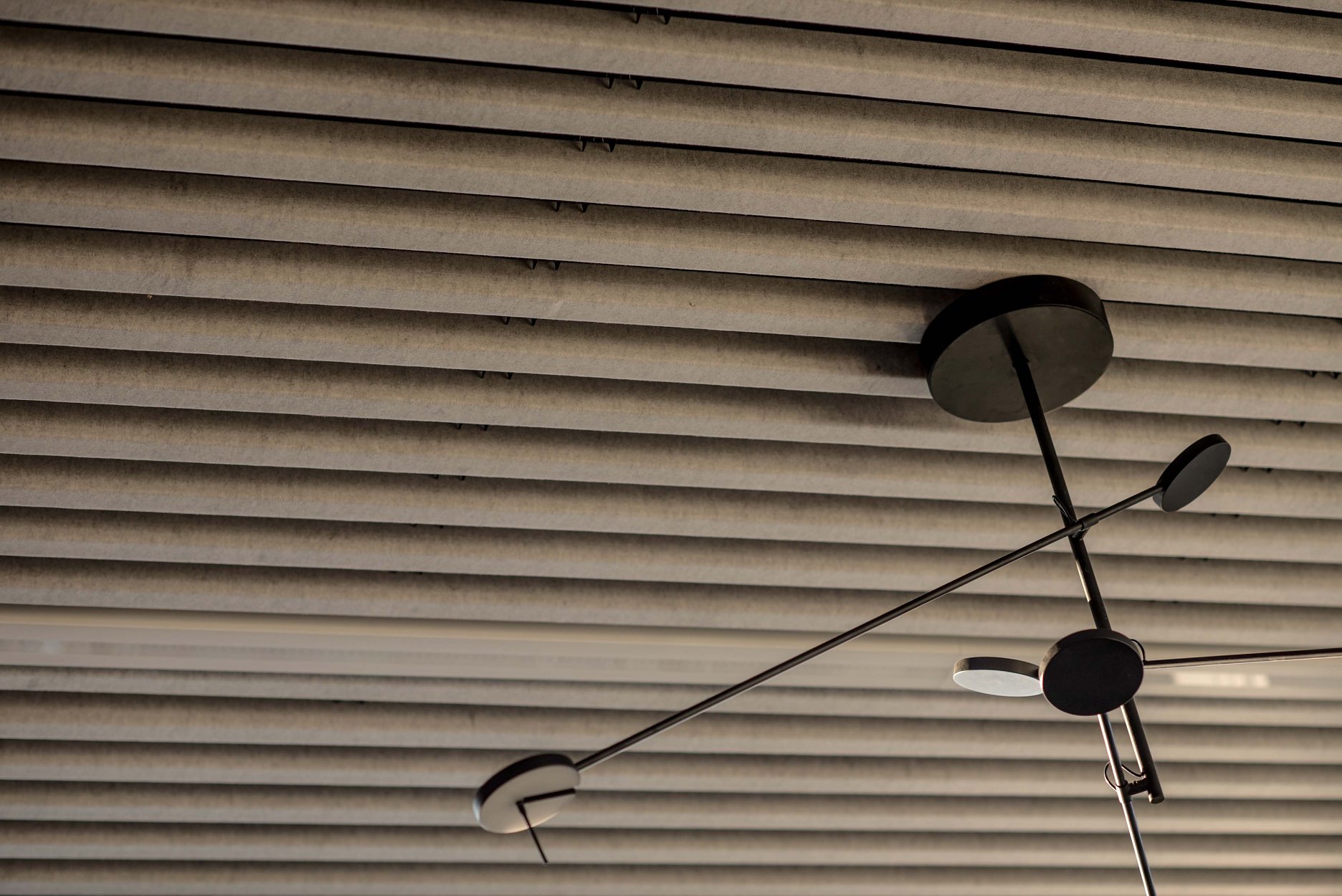 Dizajn a materiálová skladba priestoru vychádza zo vzťahu kontrastov bielej a béžovej farby okolitého priestoru (steny, podhľad a podlaha) a vložených stolárskych komponentov s prirodzenou farebnosťou dreva. Kompozíciu dopĺňajú biele a čierne stoly so stoličkami.