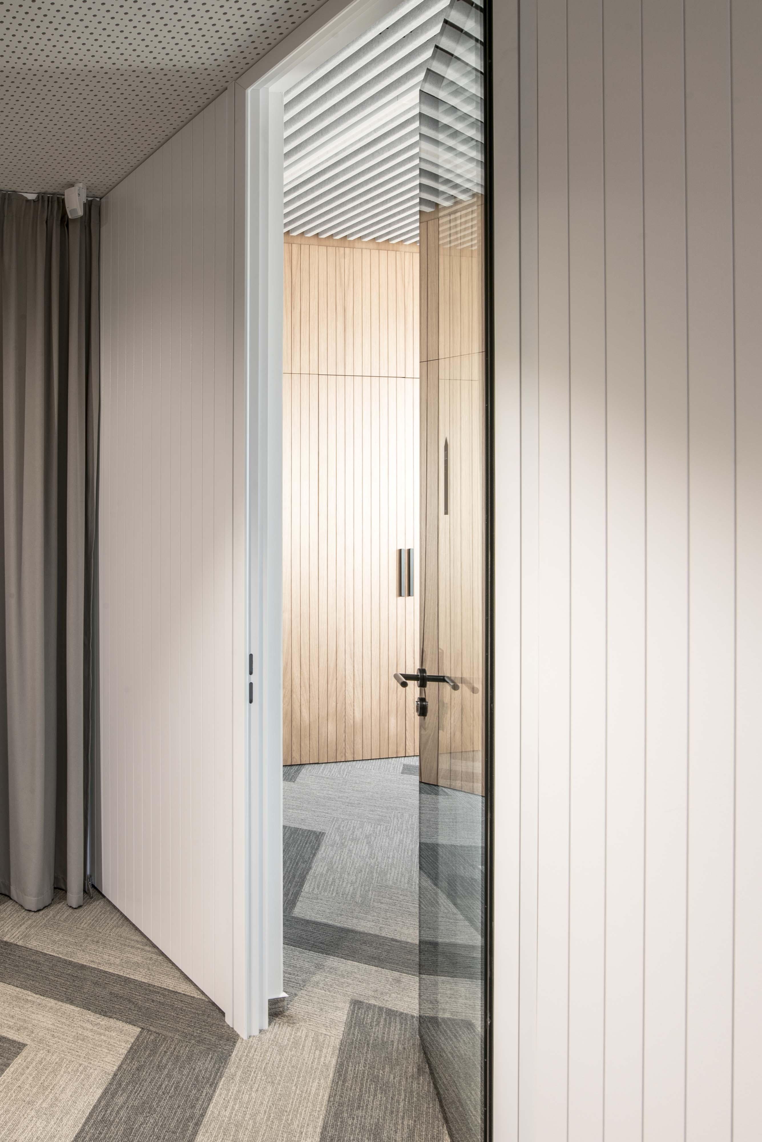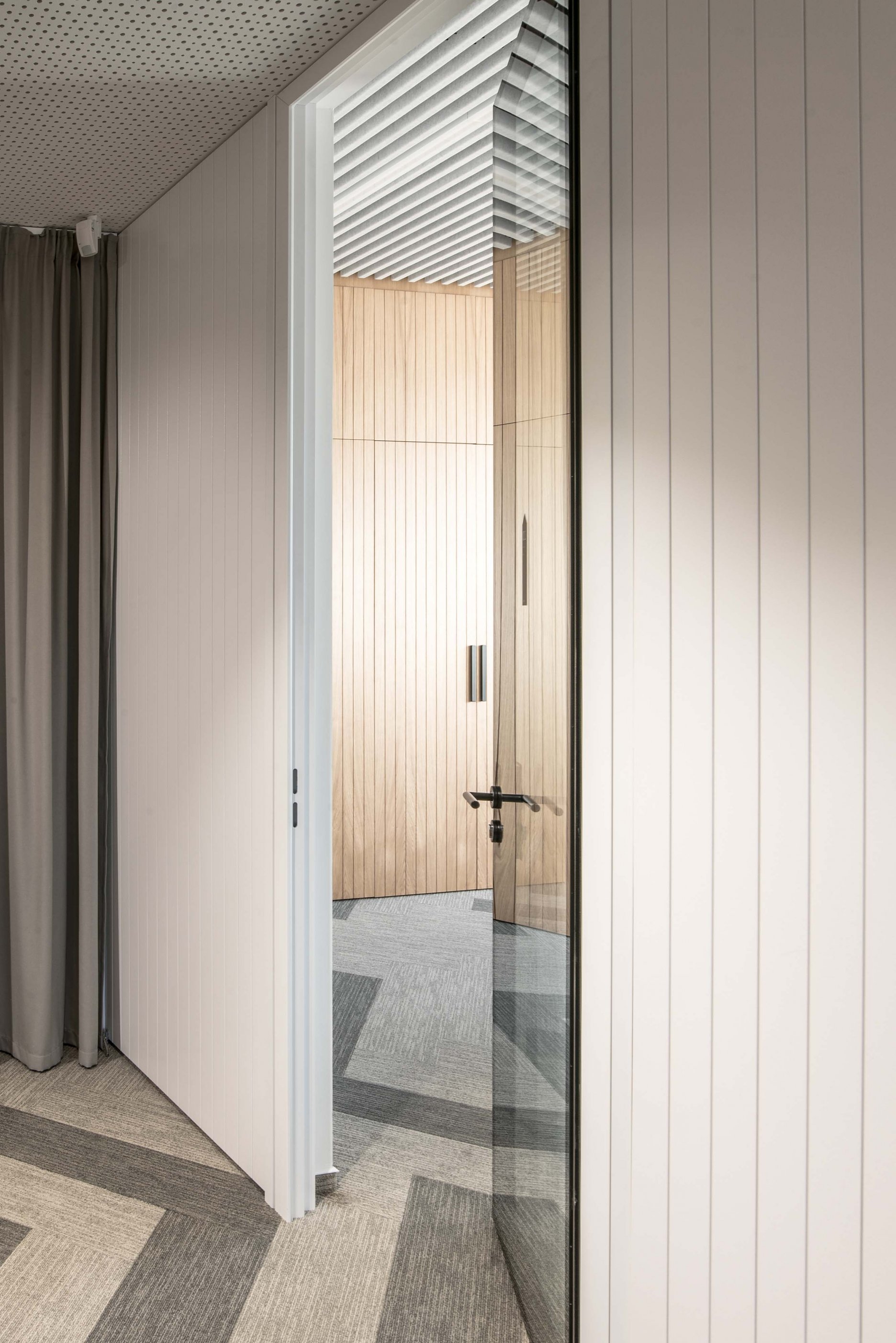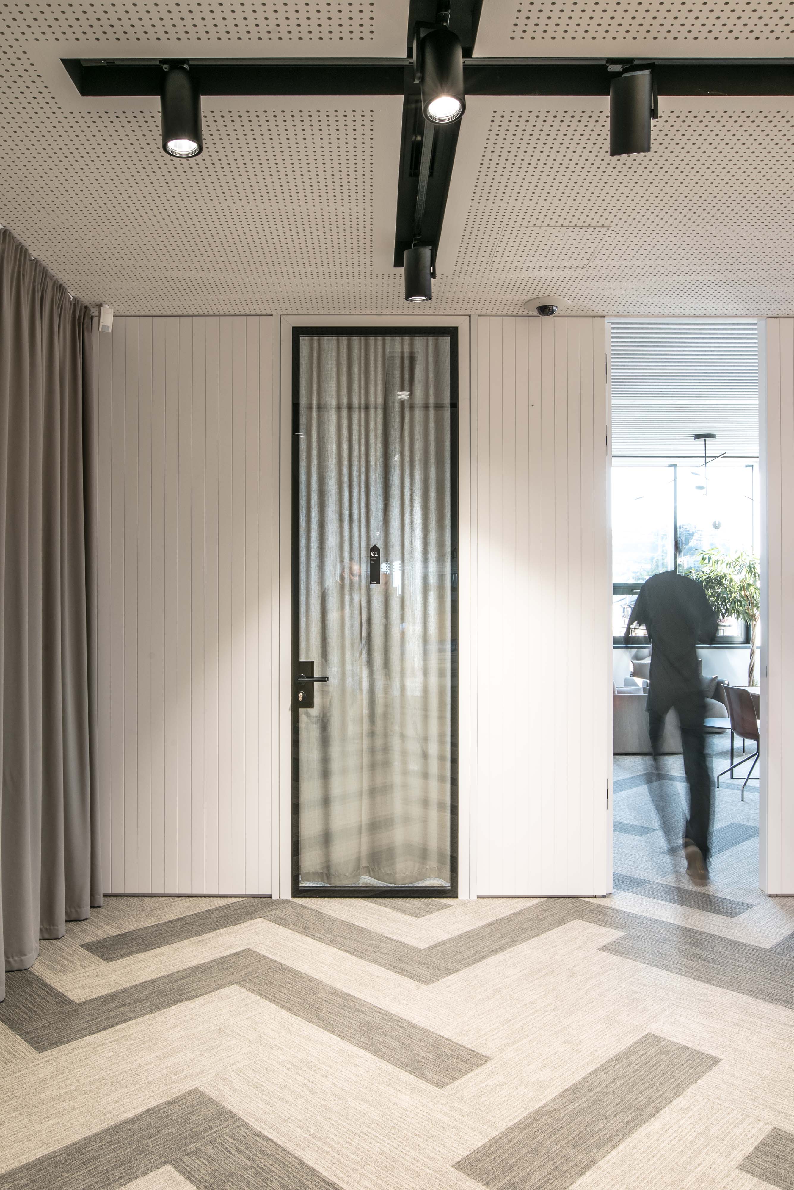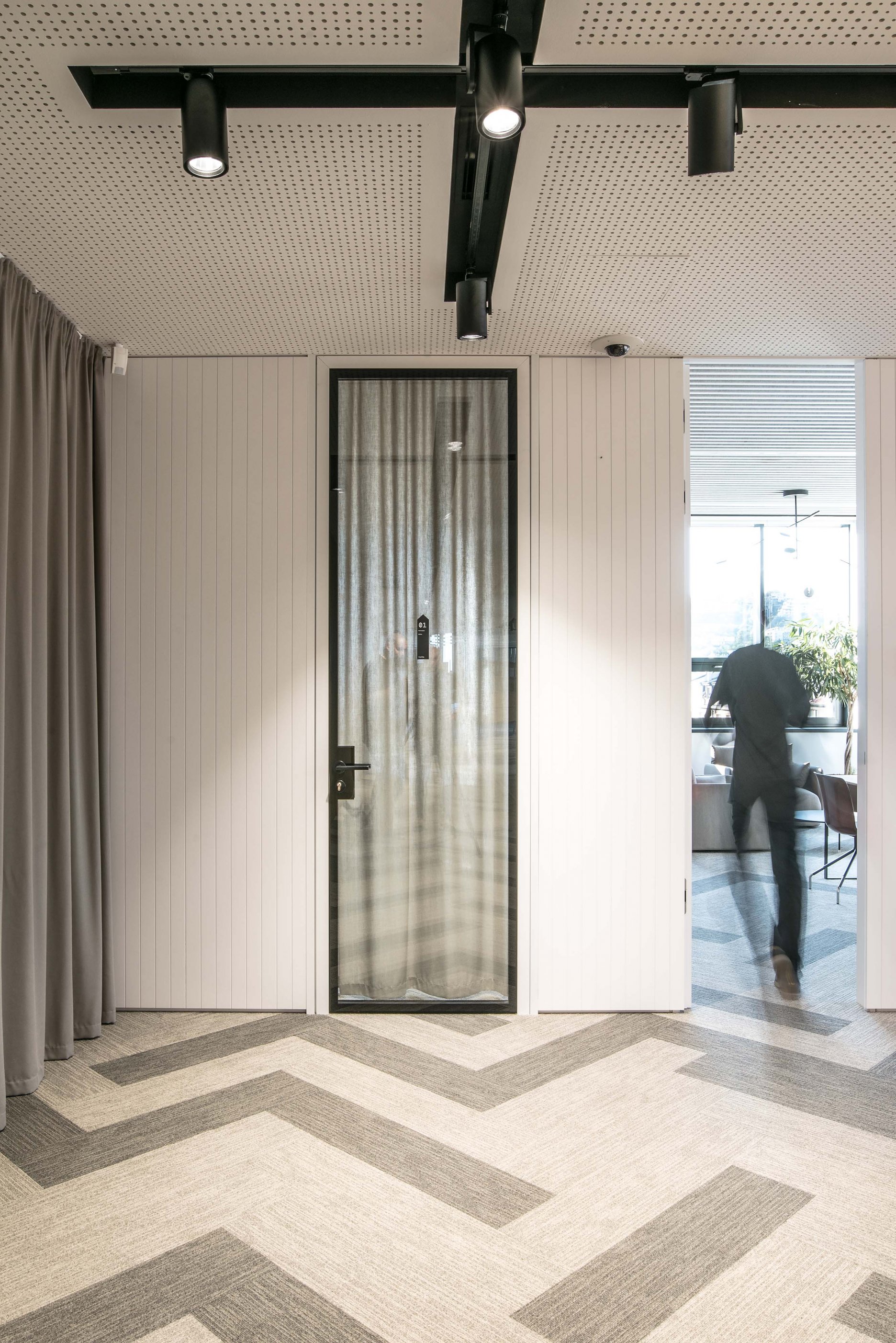 Vo vstupe do kancelárskeho priestoru sa nachádza recepčný pult situovaný do stredu "zálivu". Za recepciou sú posuvné perforované okenice, ktoré zjednocujú kulisu za solitérnym dreveným recepčným stolom. Z ľavej strany recepciu ohraničuje priebežná drevená stena s integrovanými dverami vedúcimi do dvoch kancelárií a z pravej strany vegetačná stena. Na ľavo od recepcie sú dve samostatné kancelárie prístupné cez dvere integrované do priebežnej drevom obloženej steny. Na pravo od recepcie začína multifunkčný chodbový priestor z ktorého sú prístupné dve rokovacie miestnosti predelené mobilnou stenou. Rokovacie miestnosti sú do chodby orientované priebežnou presklenou stenou so závesom. Chodba sa na úrovni rokovacích miestností rozširuje, vznikol tu priestor pre solitérný stolársky box. Zo zadnej strany boxu je prístupná kopírka a regále, zatiaľčo prednú stranu tvorí drevená stena, ktorá drží líniu chodby. V nadväznosti na rozšírenie chodby je umiestnený kruhový stôl, ktorý svojou polohou nezasahuje do priechodu, no zároveň plní funkciu neformálneho posedenia.