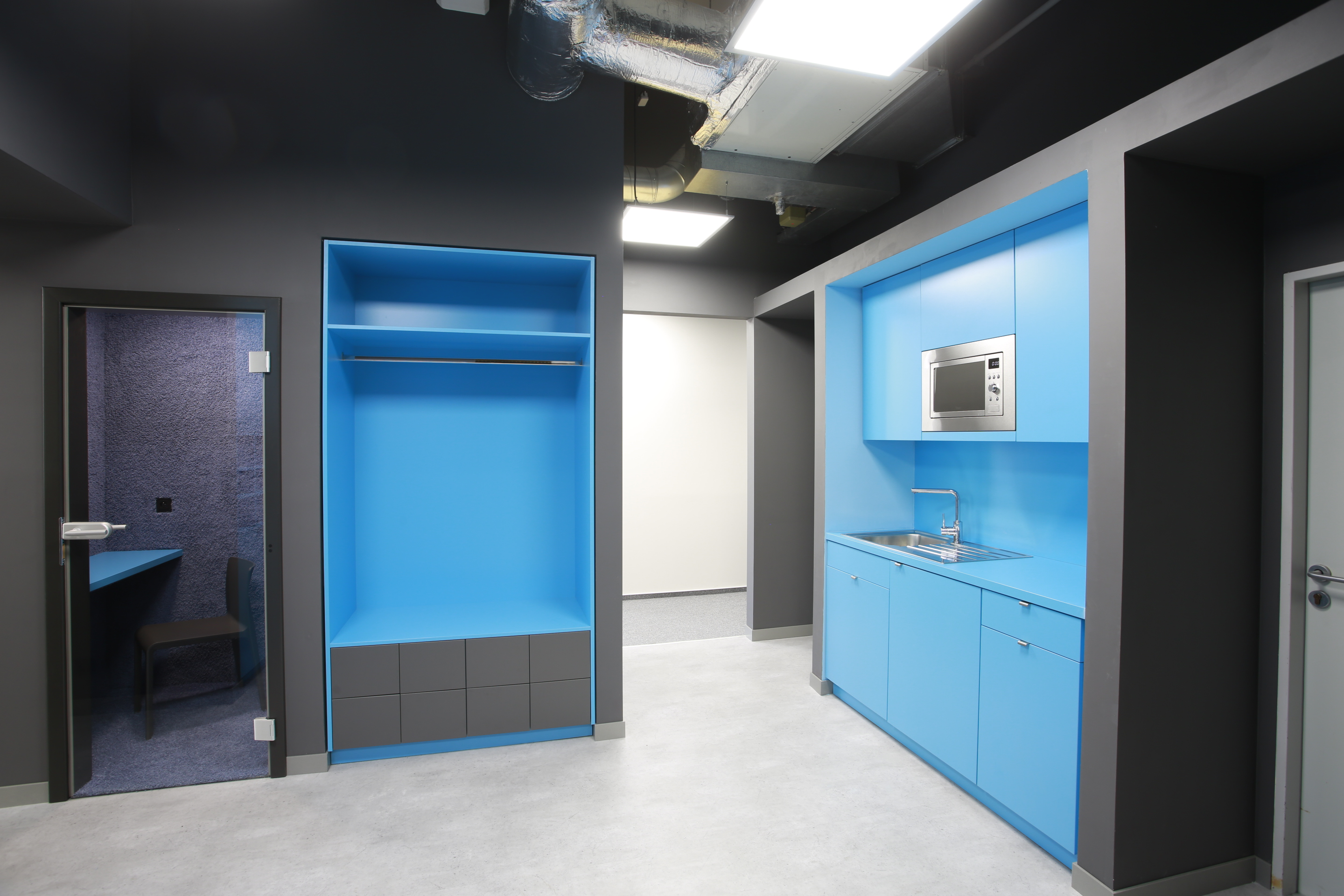 Na prízemí sú pozdĺž okien umiestnené bunkové kancelárie. Uprostred dispozície je doplnkový priestor, ktorý slúži ako meeting point. Nachádza sa tu aj kuchynka, tlačiarne a odpočinkový priestor. Kancelárie sú monochromatické, riešené s dôrazom na nenáročnú údržbu. Časť určená k neformálnej práci, meetingom a odpočinku je antracitová, s modrými akcentami.