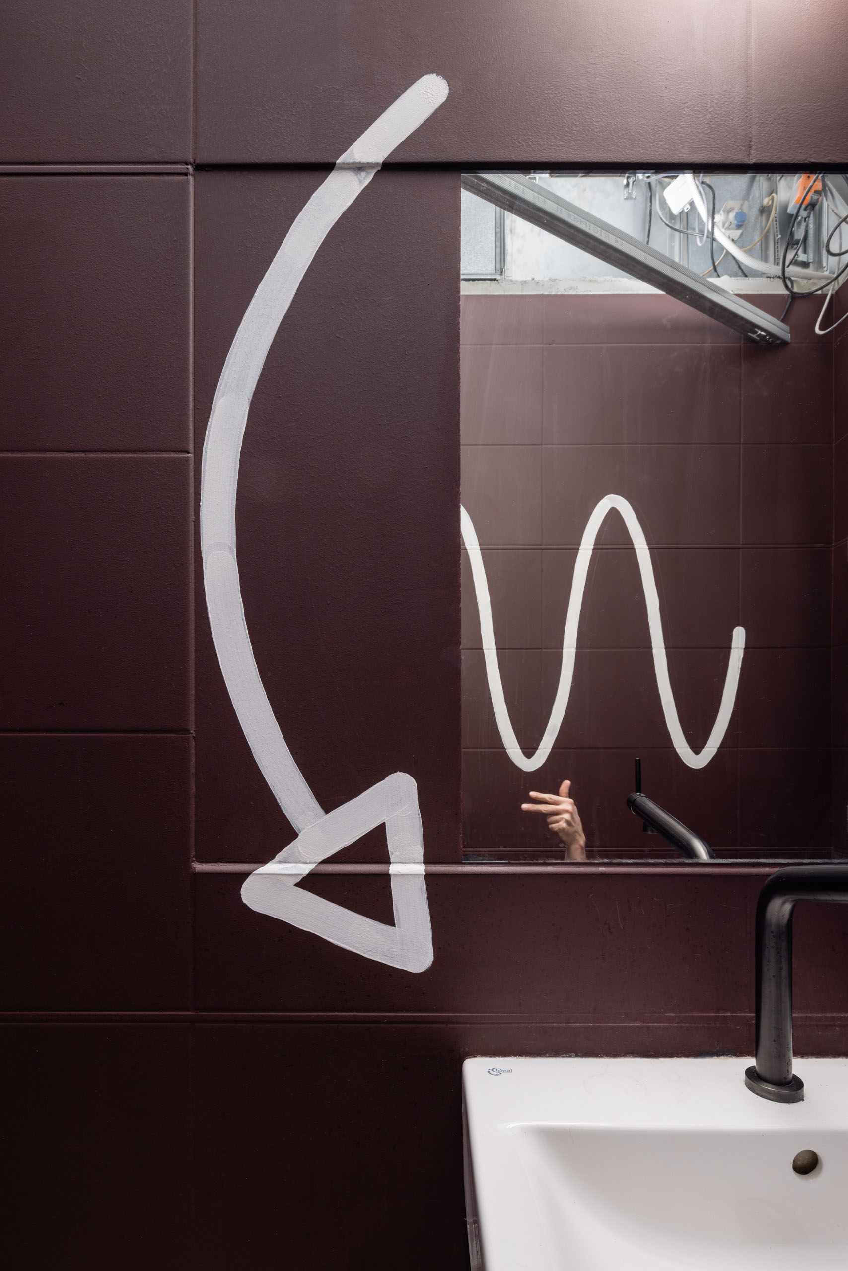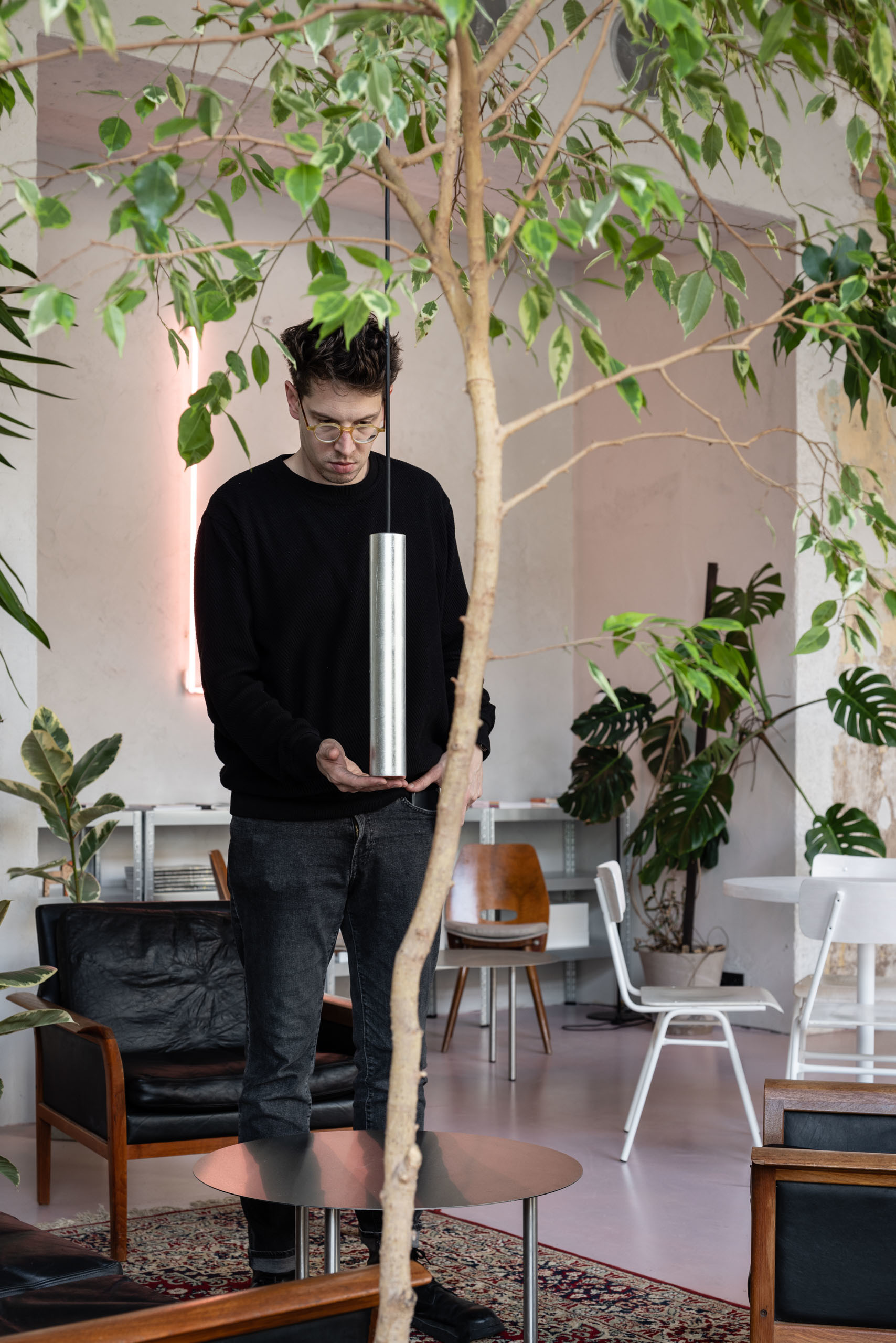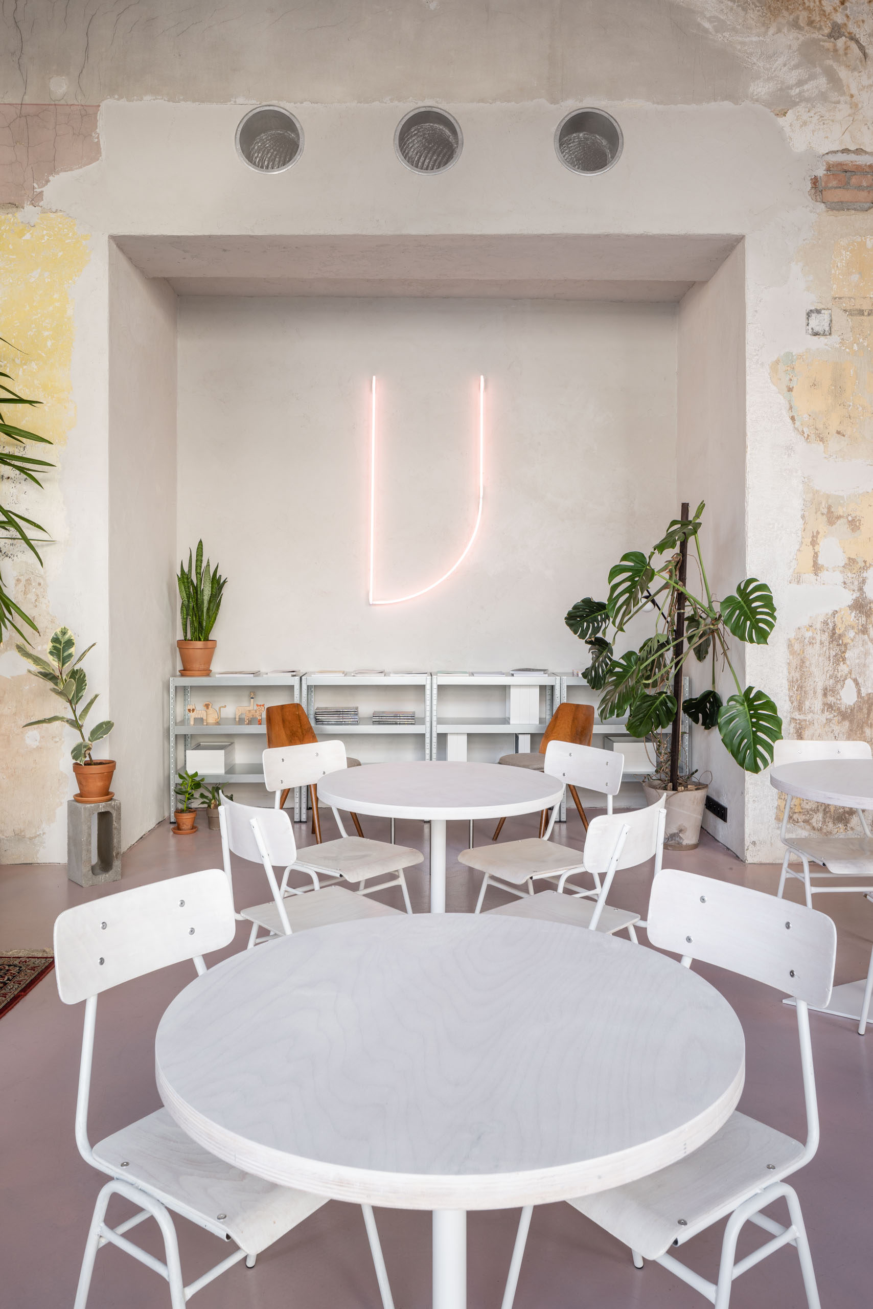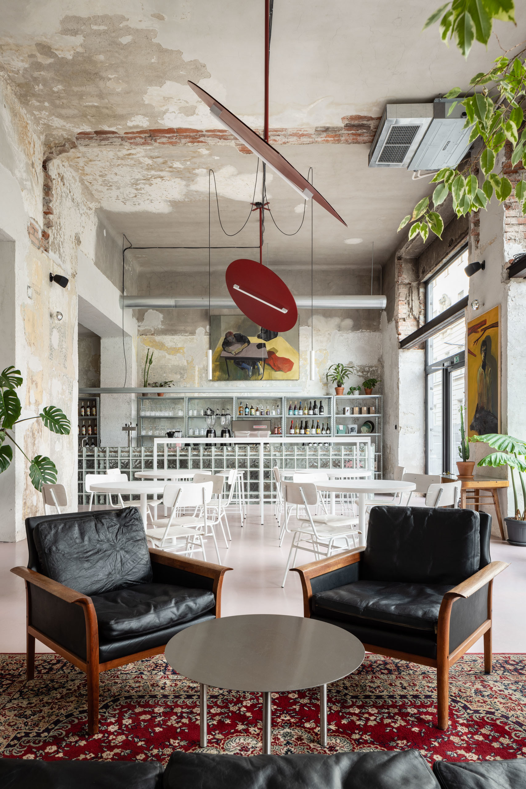 Charakteristickými prvkami sú aj zavesené svietidlá z bordového hliníkového plechu, znázorňujúce prototvary opakujúce sa v ďalších predmetoch. Tieto “lustre” sú odkazom na pôvodný historický priestor, rovnako ako celková symetria rozmiestnenia objektov.