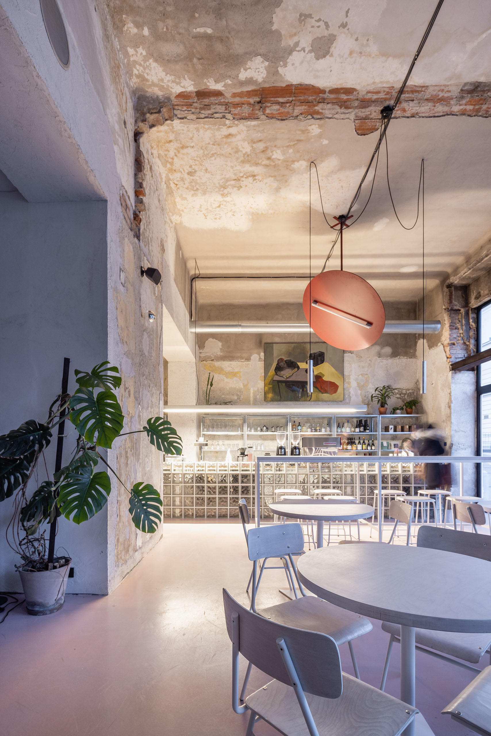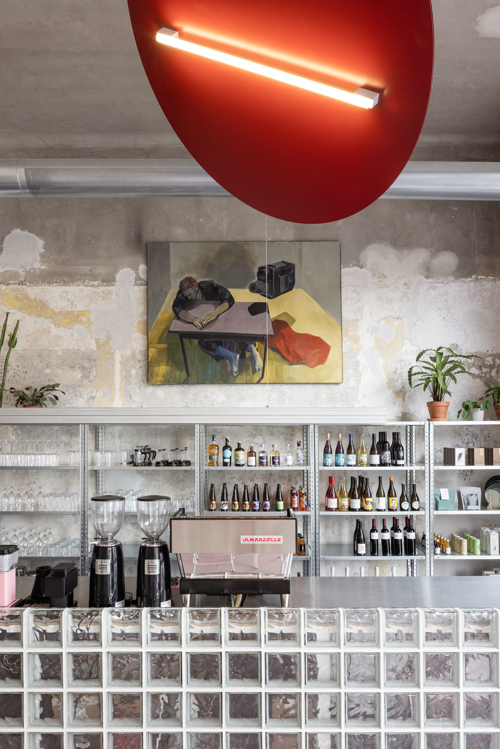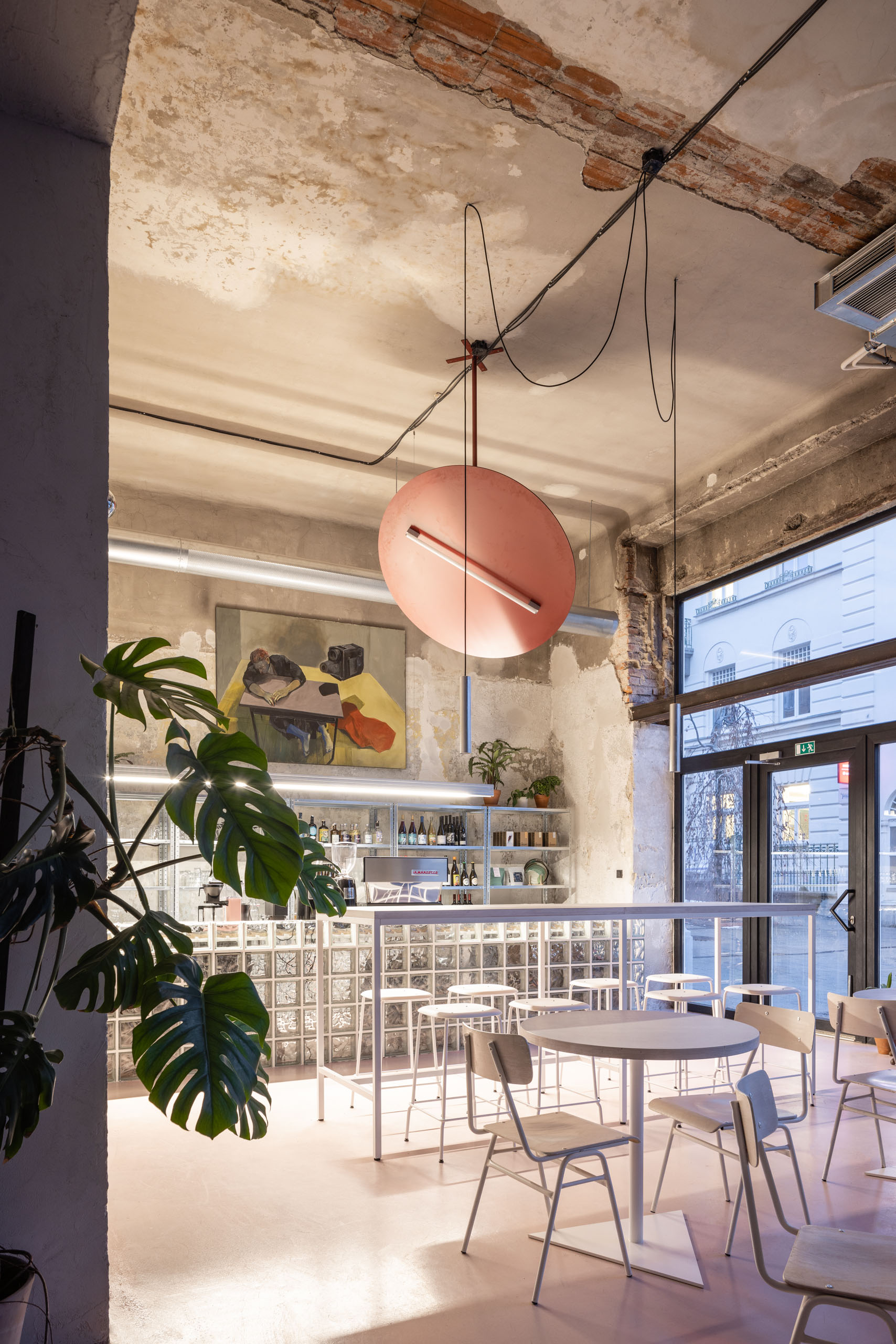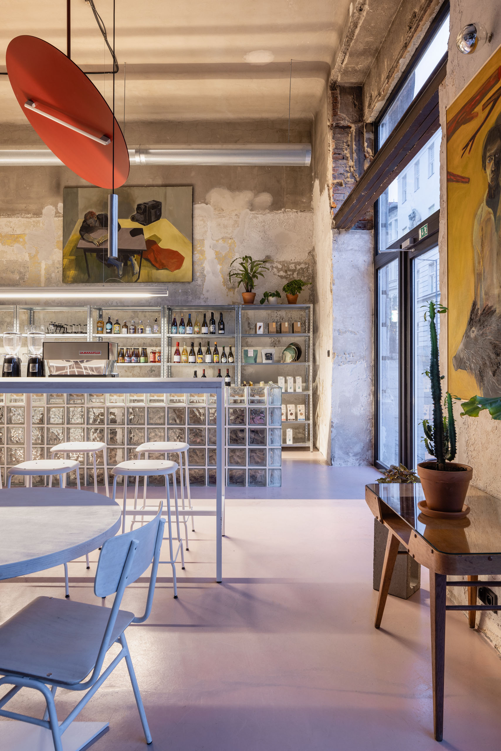 Ako hovorí samotný názov kaviarne, dominantou sú veľké presklenia, výklady prevádzky, ktoré dávajú kaviarni prísun denného svetla. Každé z nich upúta z ulice rozdielnou atmosférou. Prvý s dominantným sklobetónovým barom, kde sa odohráva celá príprava, druhý s ústredným neónom vychádzajúcim z logotypu kaviarne a posledný s príjemným obývacím sedením a “nekonečnou” zelenou oázou.