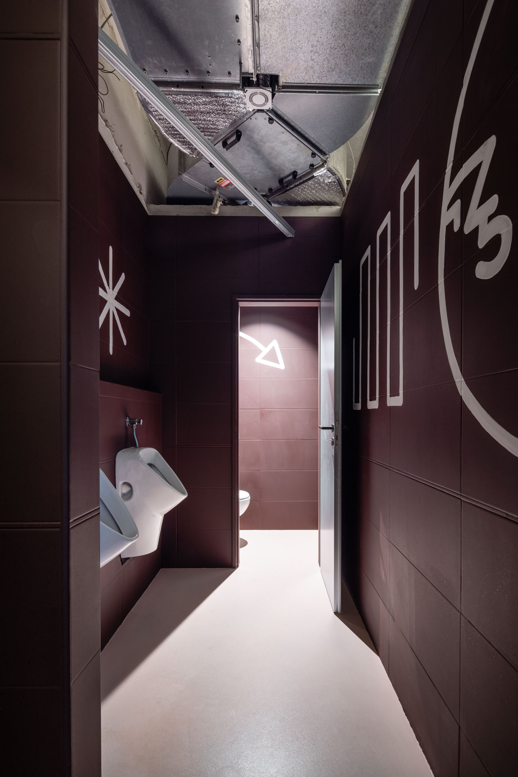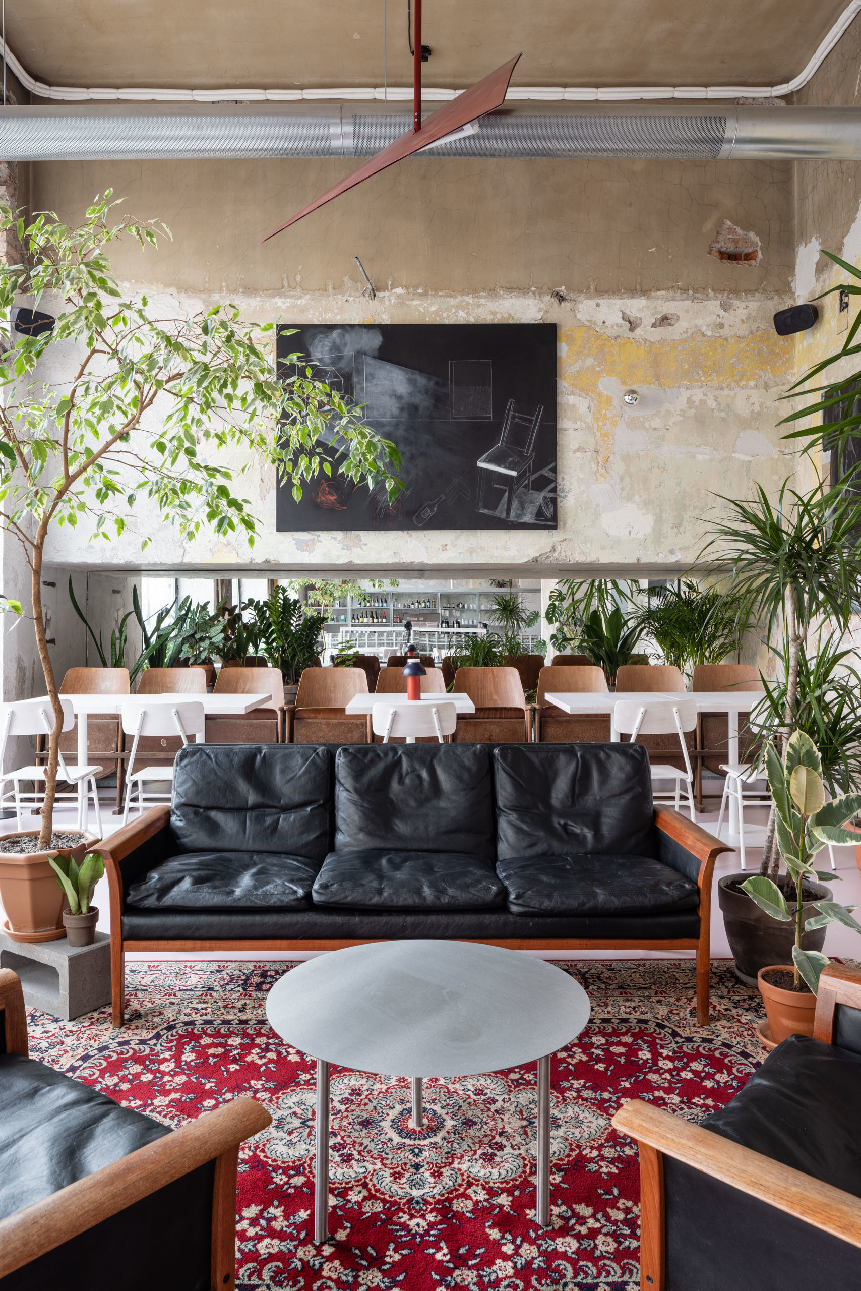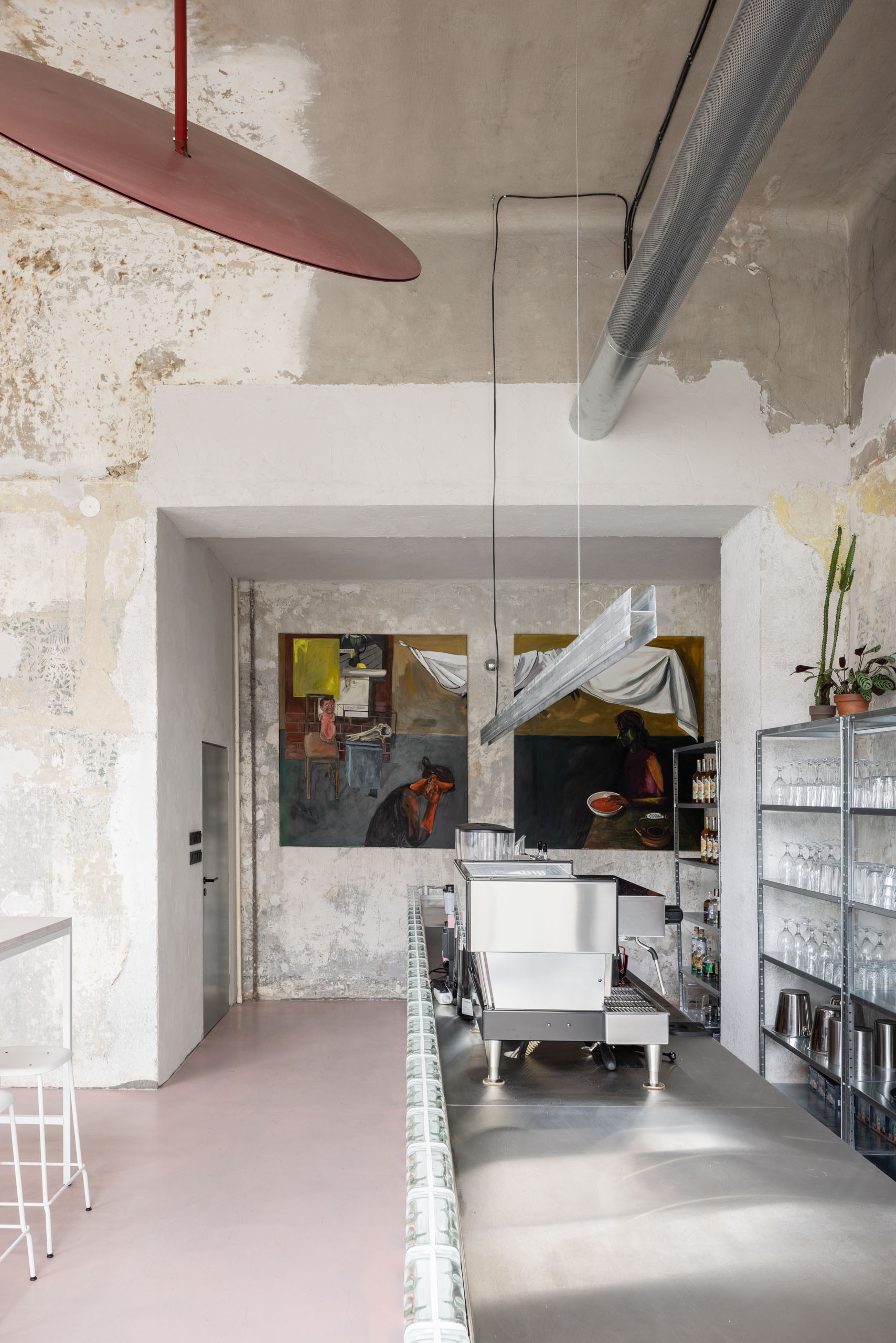 Očistenie interiéru odkrylo rôzne staré nánosy, zrkadliace jeho časový vývoj. Steny a strop so štruktúrou mnohých minulých vrstiev sú zafixované transparentným penetračným náterom. Tento surový charakter vytvára autentickú atmosféru. Mäkkosť do interiéru vnáša podlaha na ktorú bol aplikovaný štandardný nivelizačný poter a nasledovalo tónovanie do ružovej farby. Kontrast vytvára repasovaný nábytok, v dialógu s prvkami z bielenej bukovej preglejky. Pôvodný obklad toaliet oživil bordový náter a ilustrácie či priestorové objekty dizajnéra Emila Taschku.