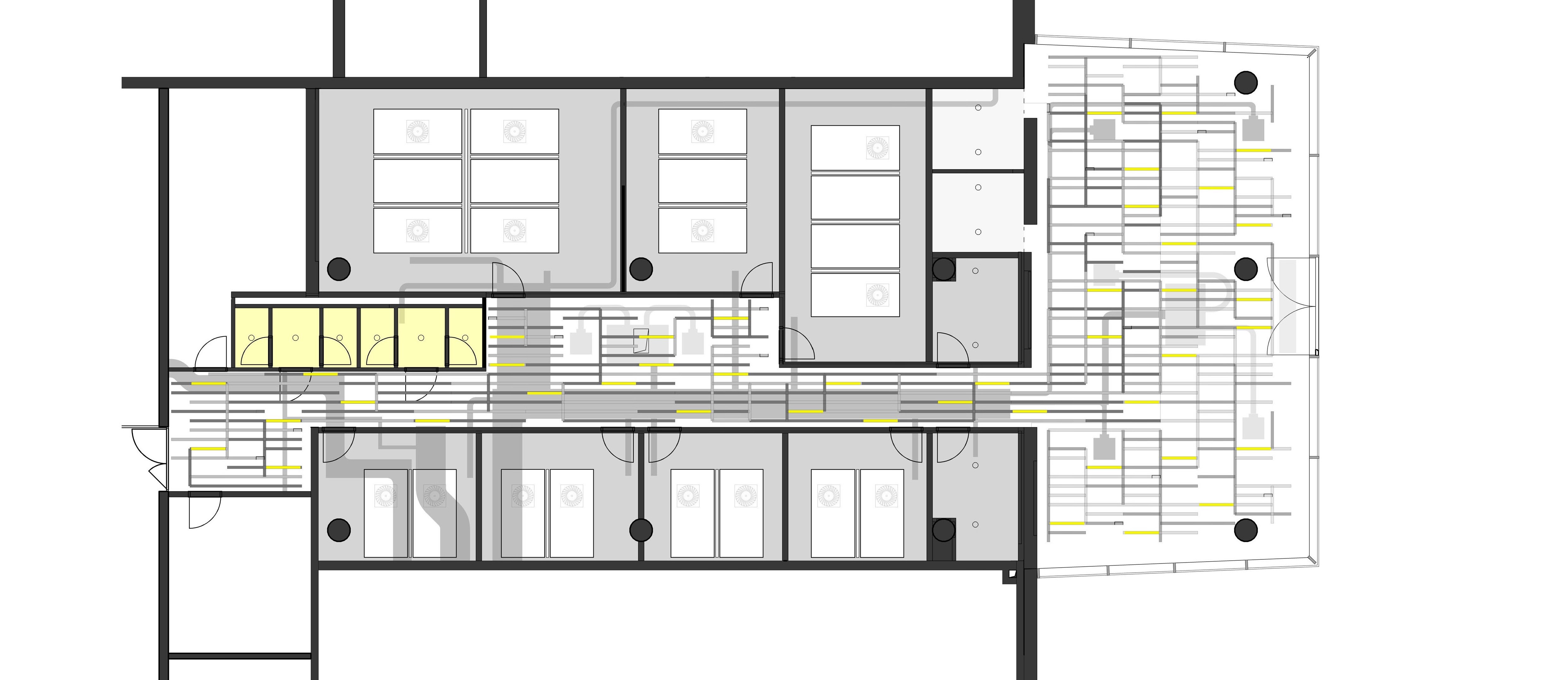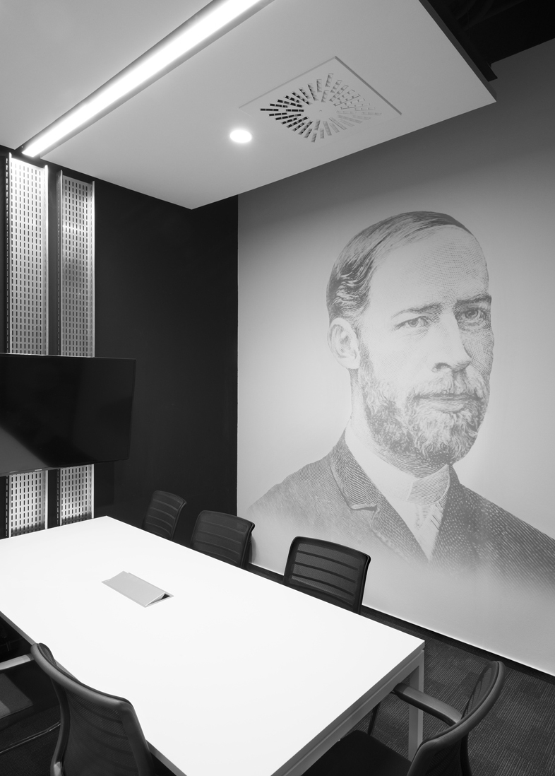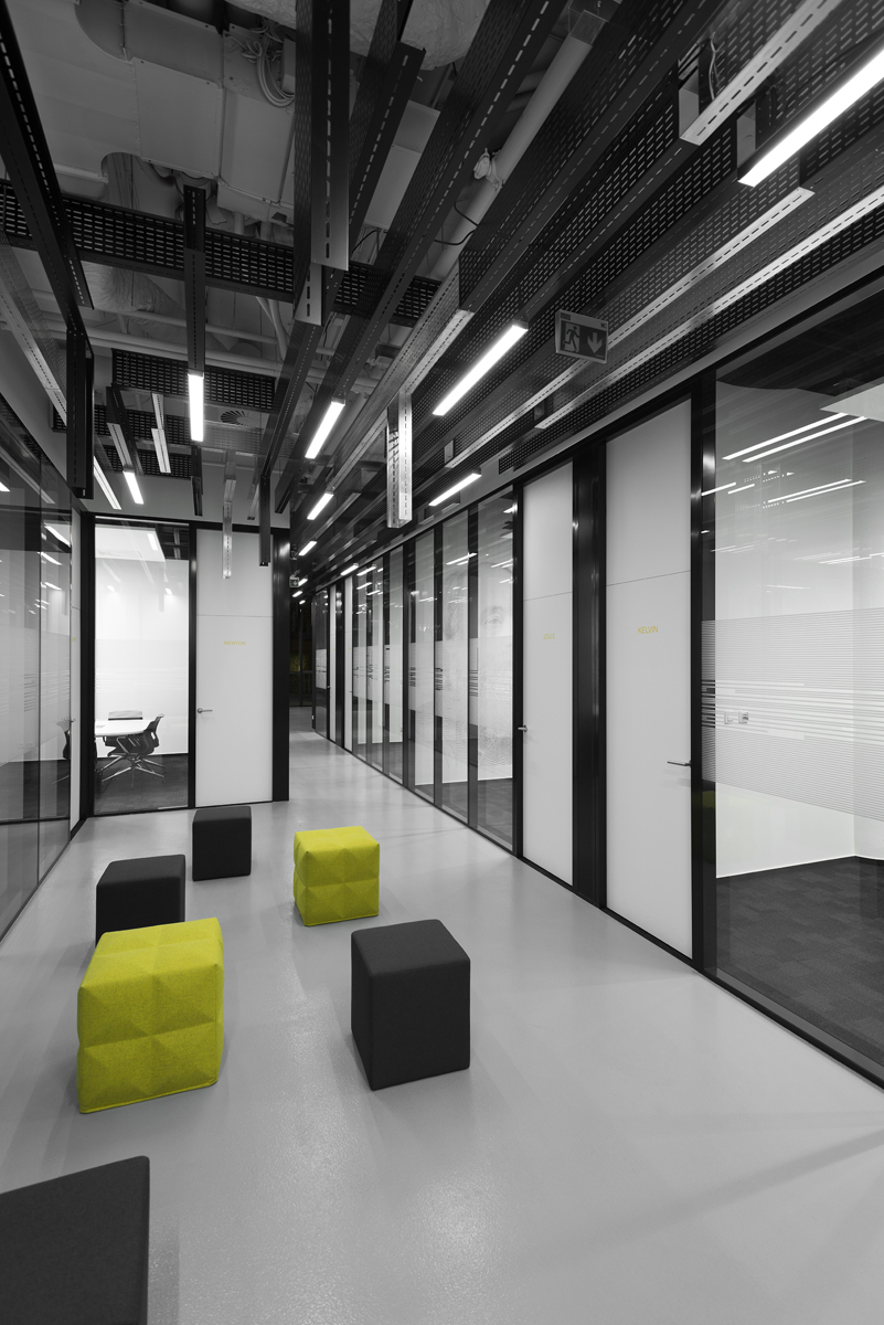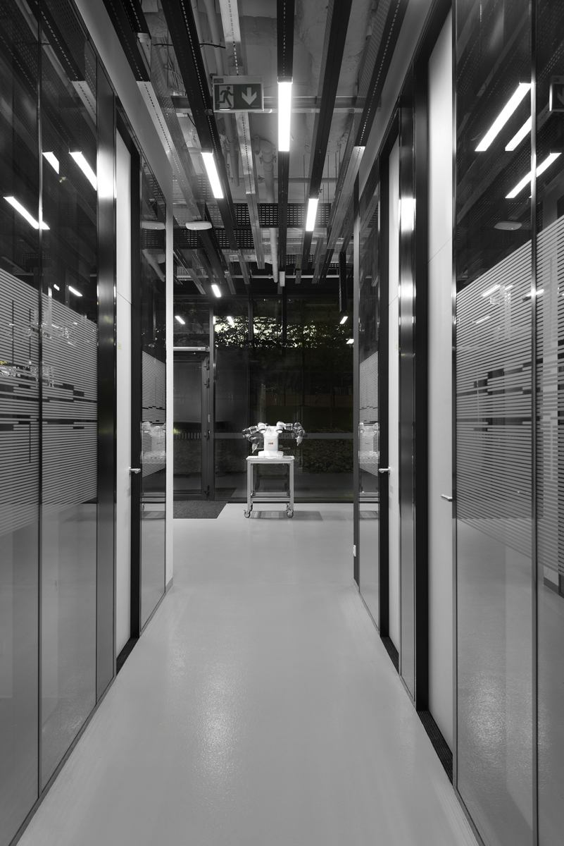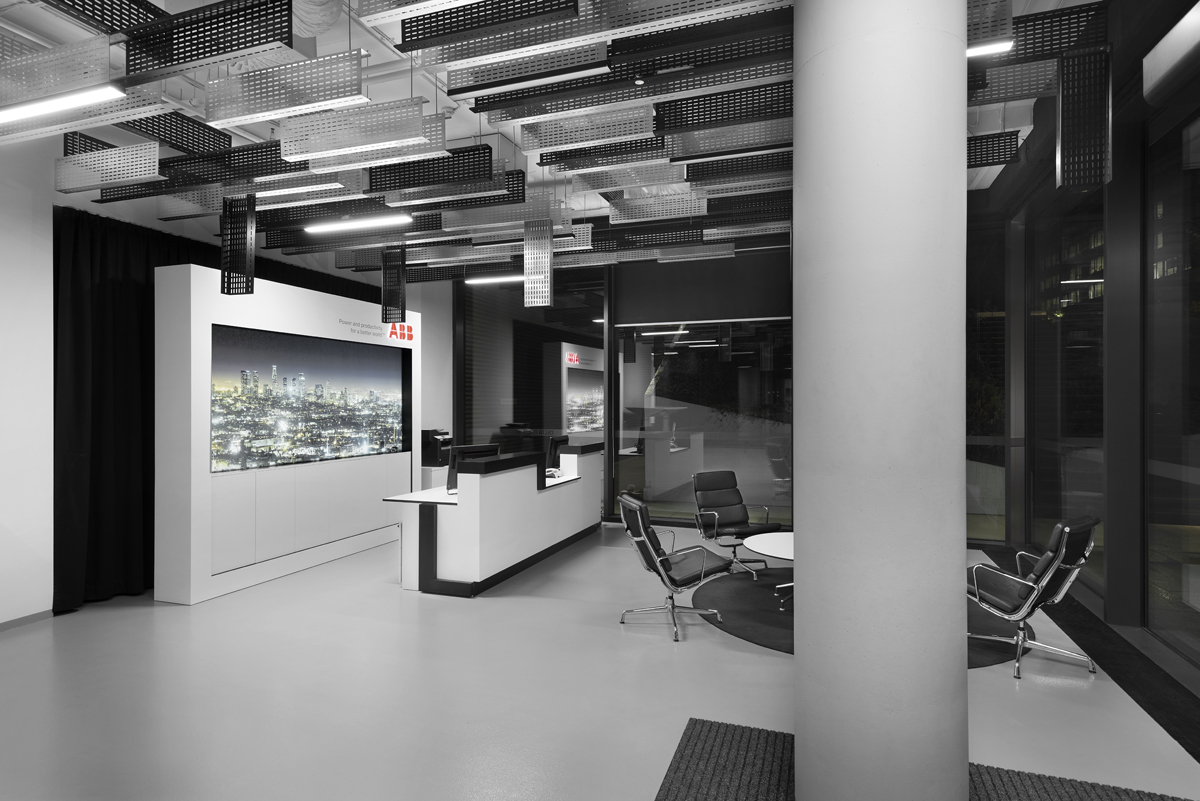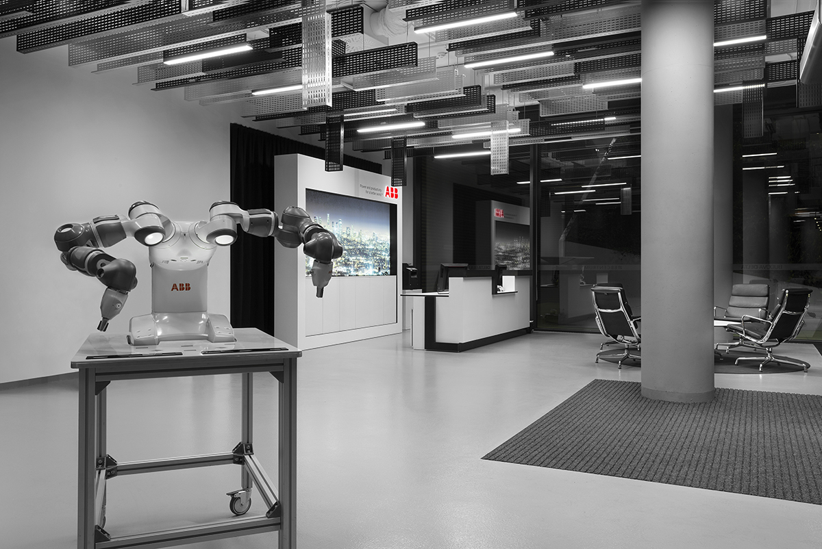 Elektroinštalačné žľaby sú okrem podhľadov použité napríklad aj ako držiaky obrazoviek v rokovacích miestnostiach. Tieto výrazné prvky sú doplnené štylizovanými polepmi sklenených priečok a stien, ktoré taktiež reprezentujú zameranie firmy. Ústredným prvkom vo vstupnej hale je špičkový priemyselný robot z dvomi ramenami, ktorý je “vlajkovou loďou” spoločnosti.