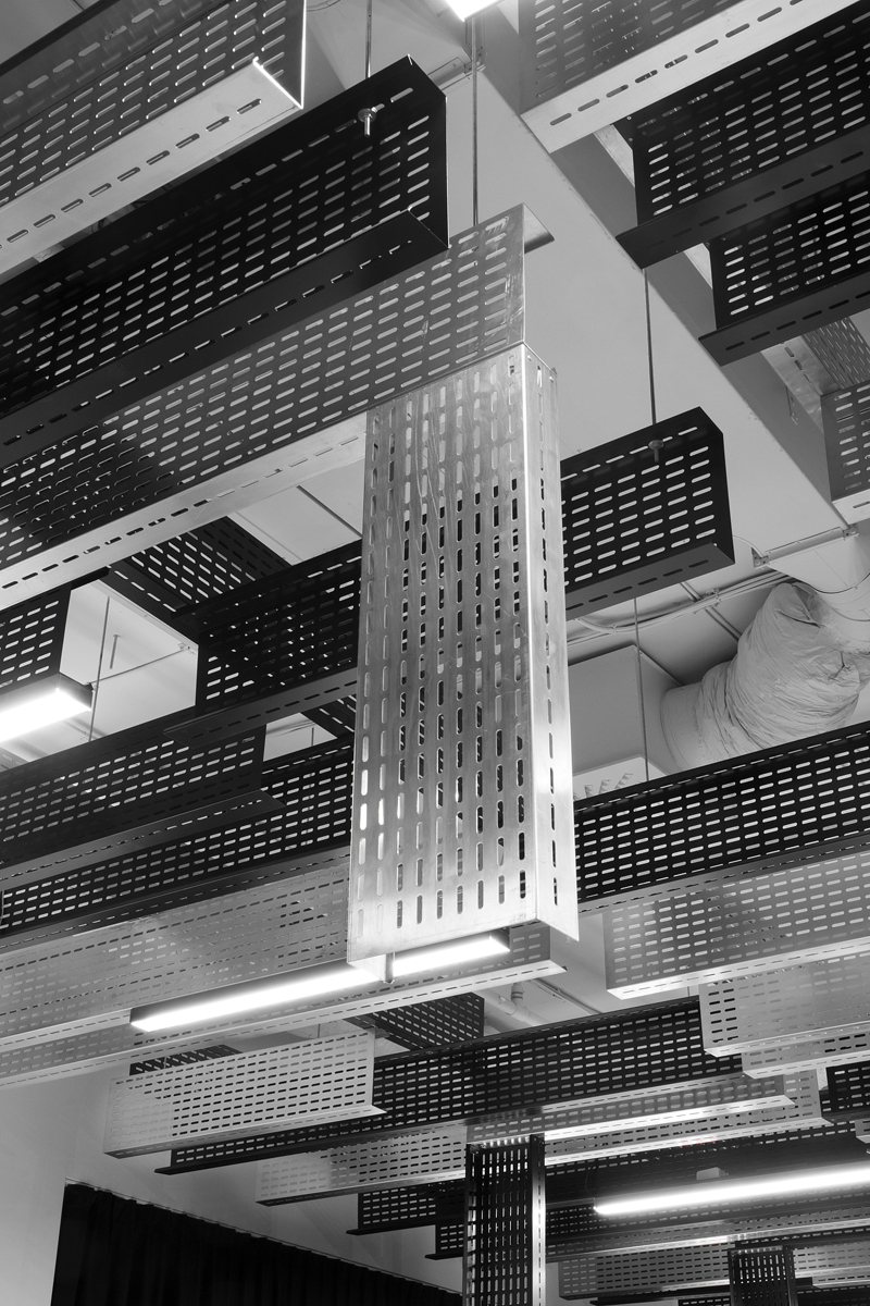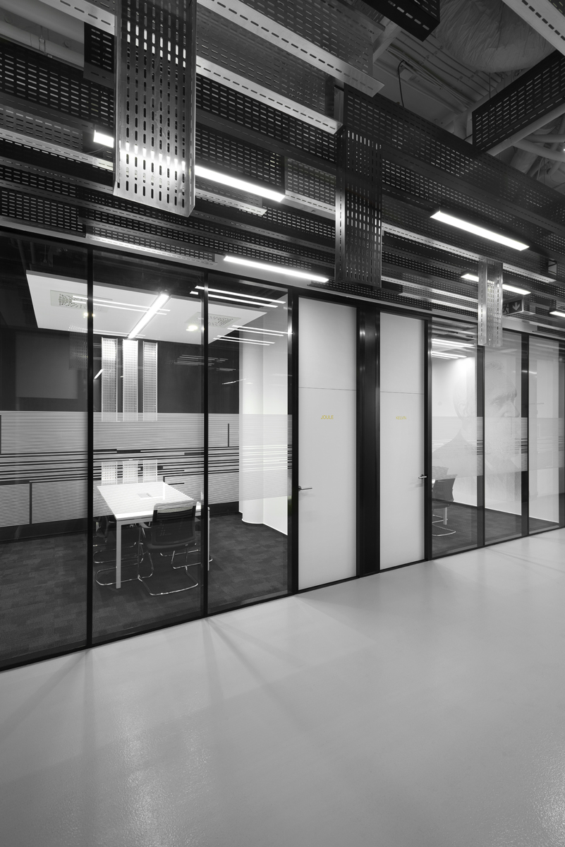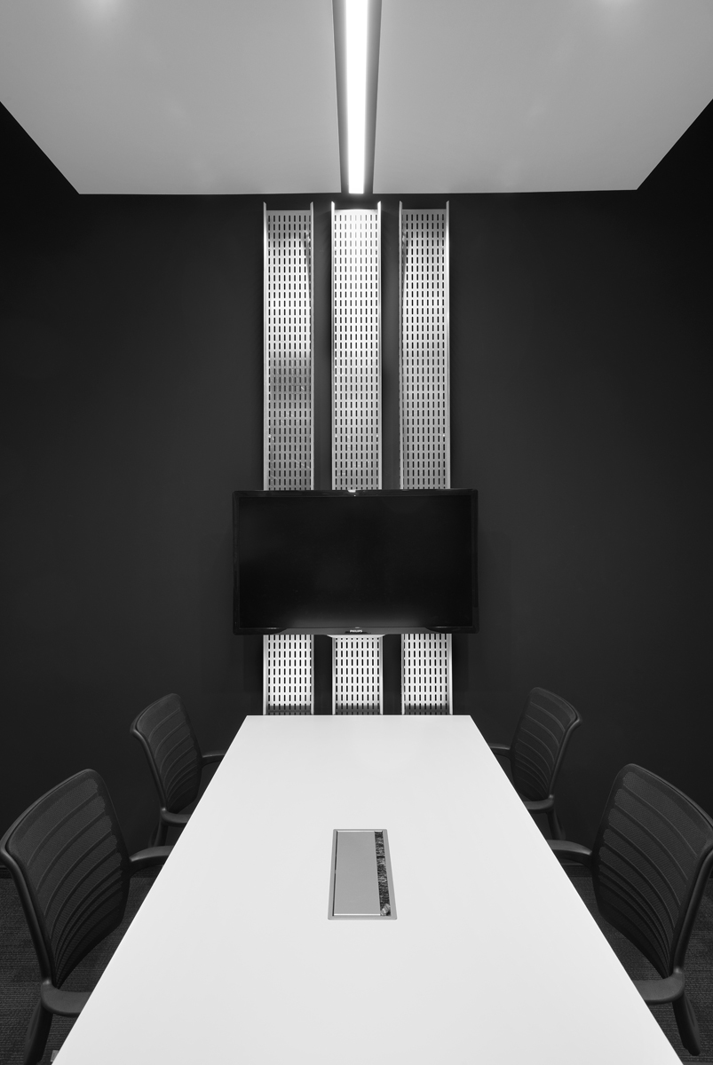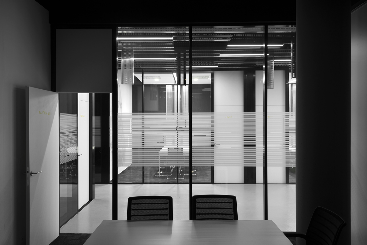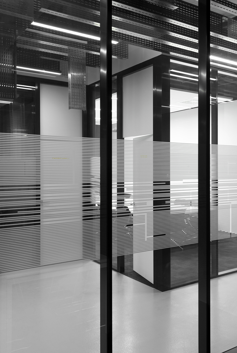 Bežné materiály, a stavebné systémy vo výraznej miere dopĺňajú plechové profily pre elektrické inštalácie, ktoré sa stávajú ústredným motívom technicky ladeného interiéru. Zaujímavá štruktúra, ktorá bola vyskladaná na mieste nahradzuje klišé interiérov ladených do firemného štýlu. Produkt sa stáva nositeľom informácie. “Vzájemnou kombinací černých, bílých a kovových, resp. transparentních a plných ploch společně s jejich nasvícením, zrcadlením a odlesky vznikl tento abstrahovaný, nebarevný, mírně iluzivní prostor, záměrně eliminující v obdobných případech častý důraz na důležitost designu a materiality jednotlivých prvků,” hovoria architekti o koncepte interiéru.