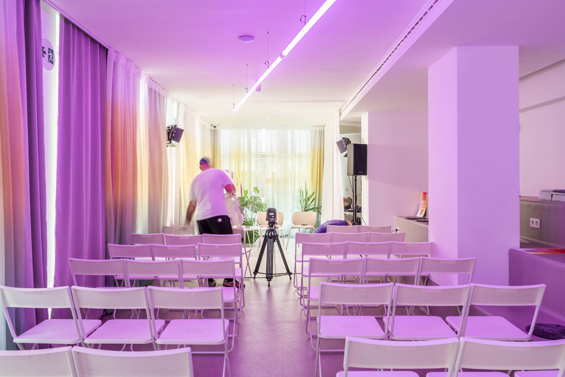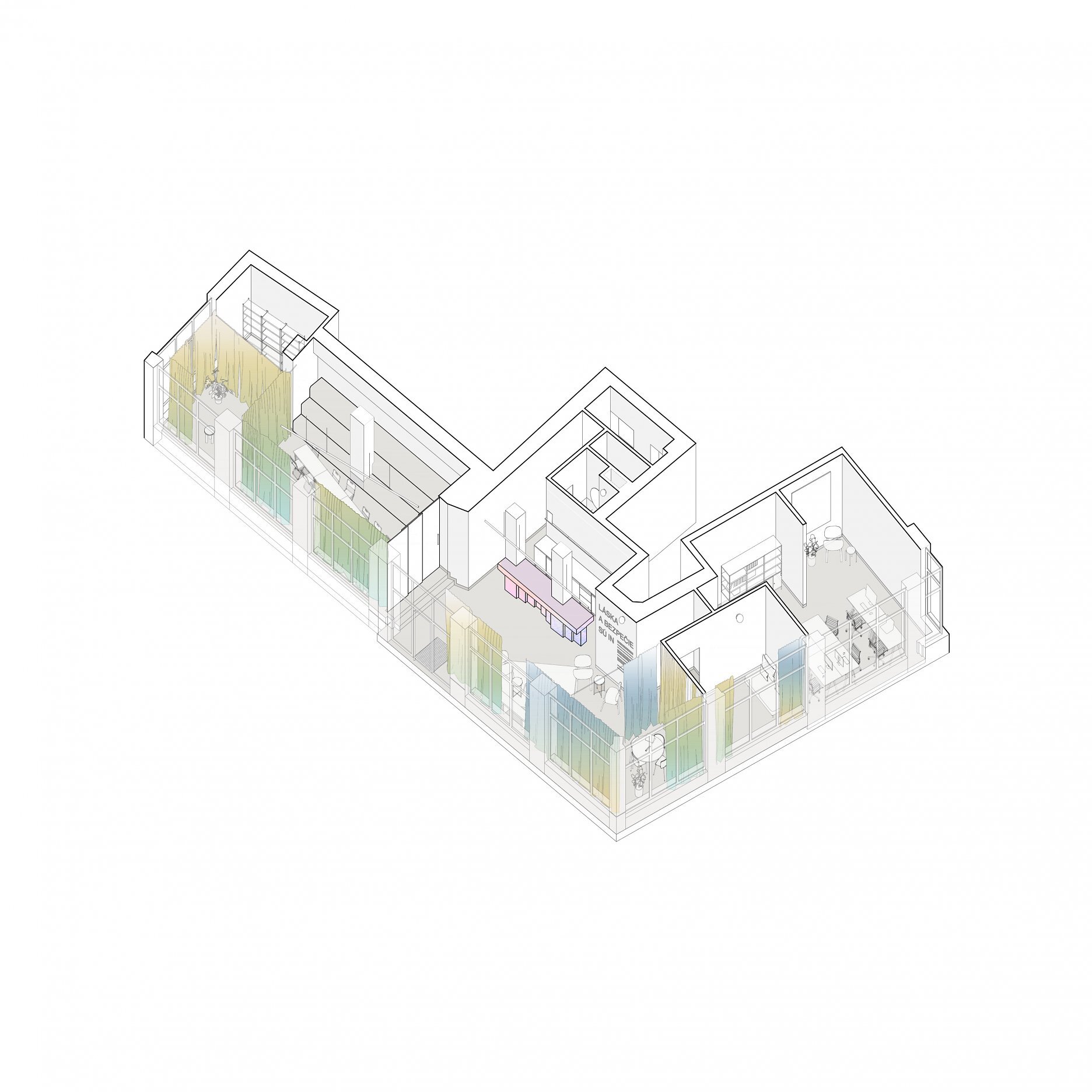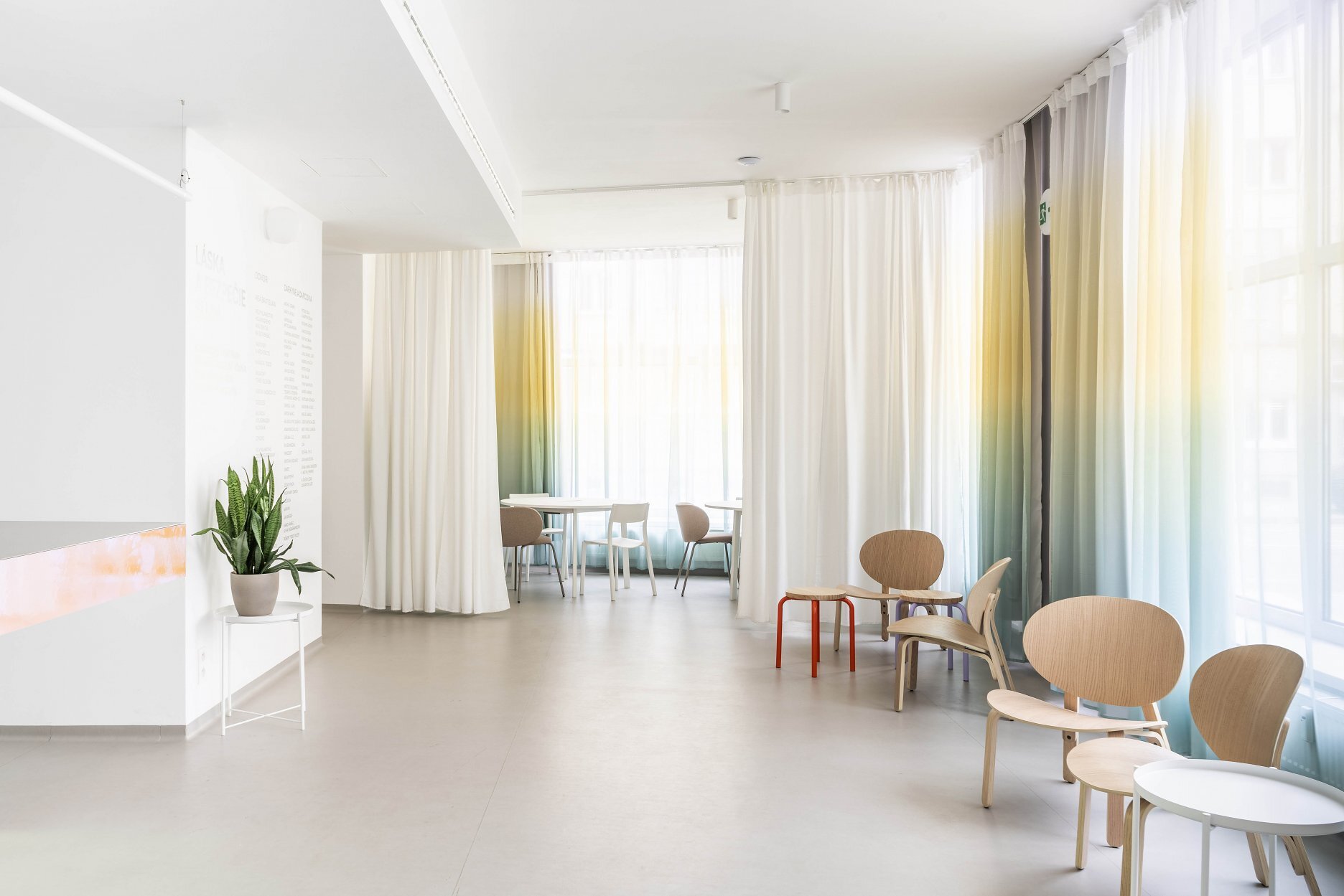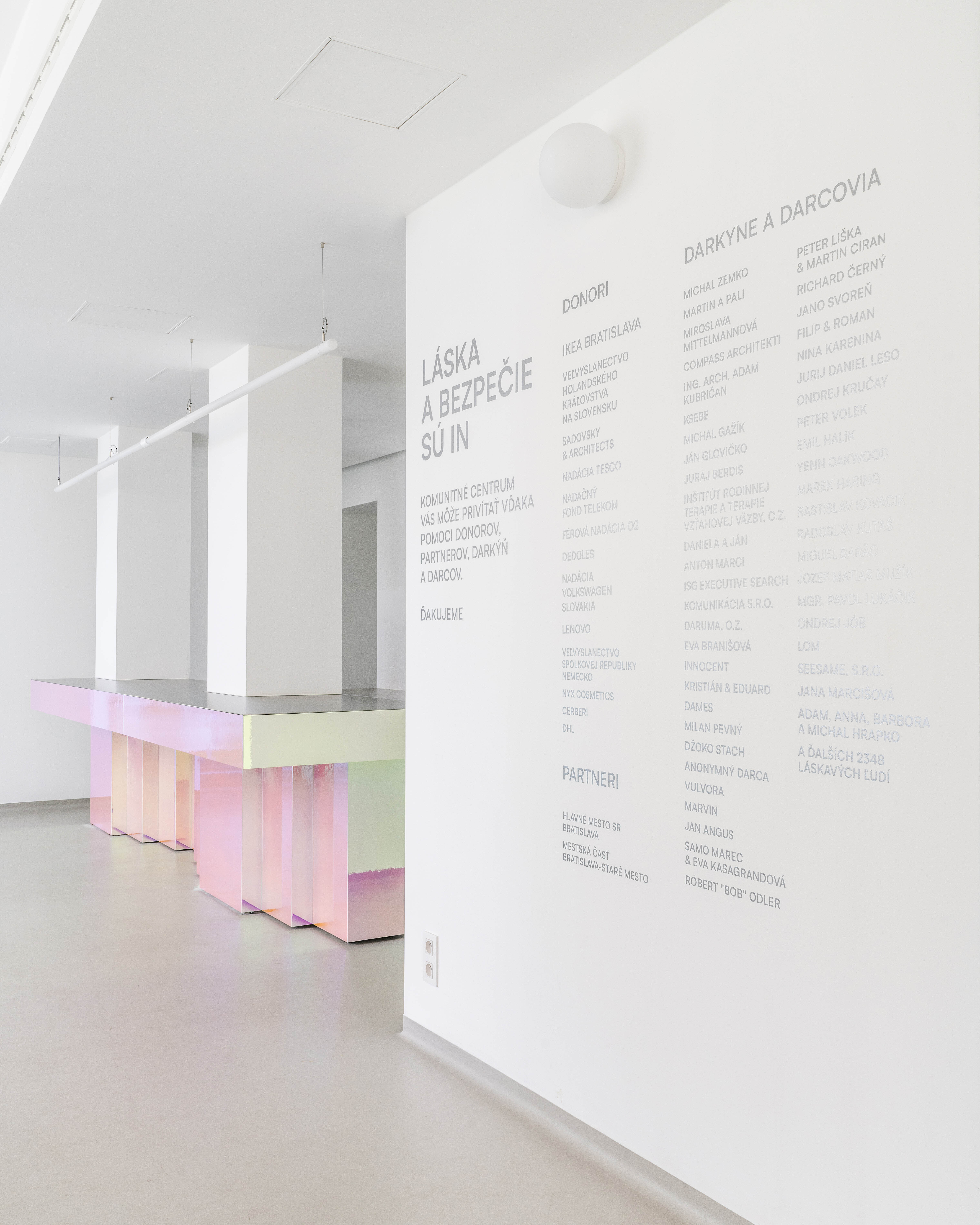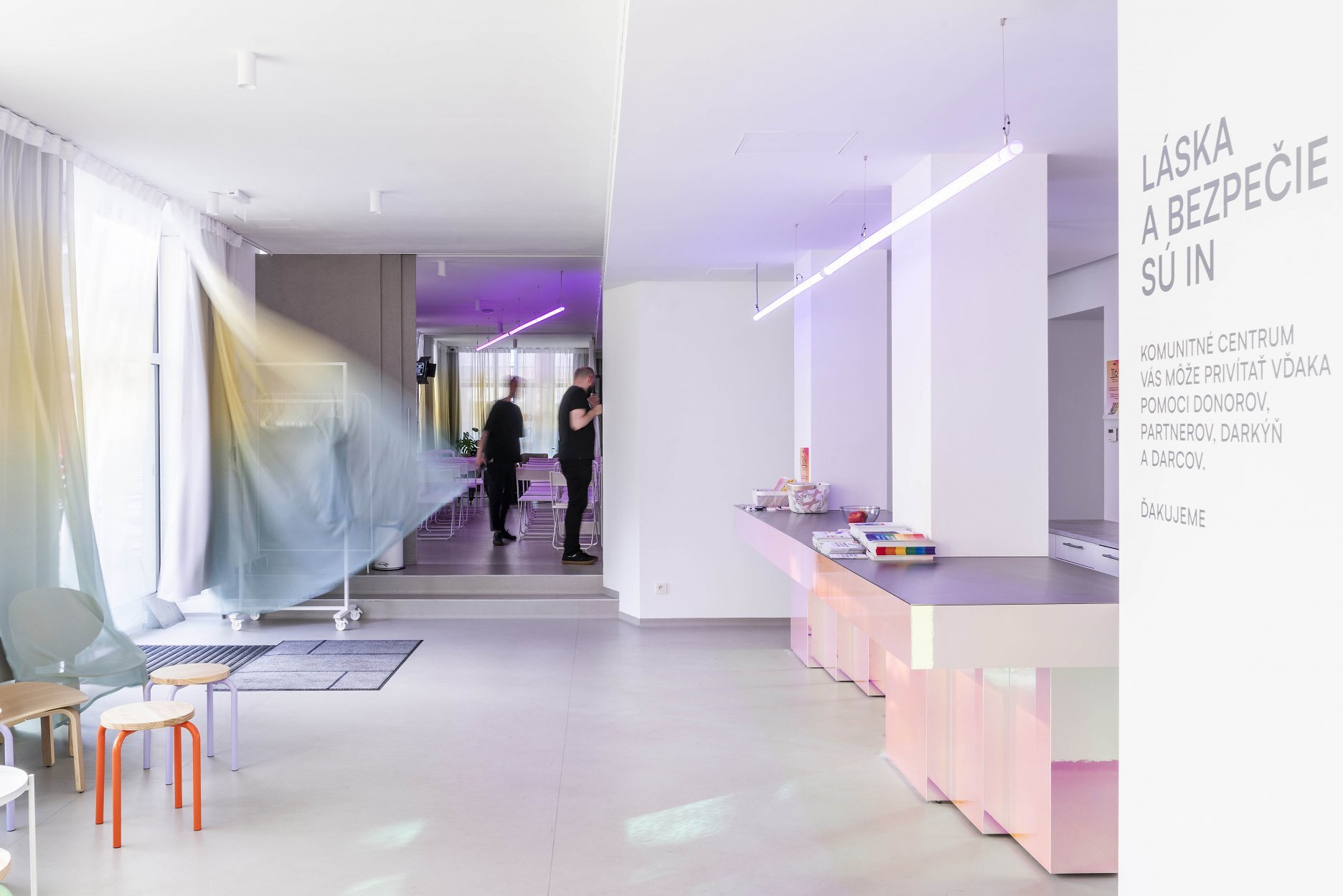 Farebný recepčný pult je miestom prvého kontaktu s komunitným centrom. Podporuje koncept spolupatričnosti i jedinečnosti. Nástrojom mäkkej zmeny sa stávajú závesy prechádzajúce celým priečelím. Lokálne vstupujú hlbšie do priestoru a vytvárajú mikroklastre. V druhom pláne sú zatemňujúce závesy, ktoré umožňujú fungovanie interných stretnutí či premietania.