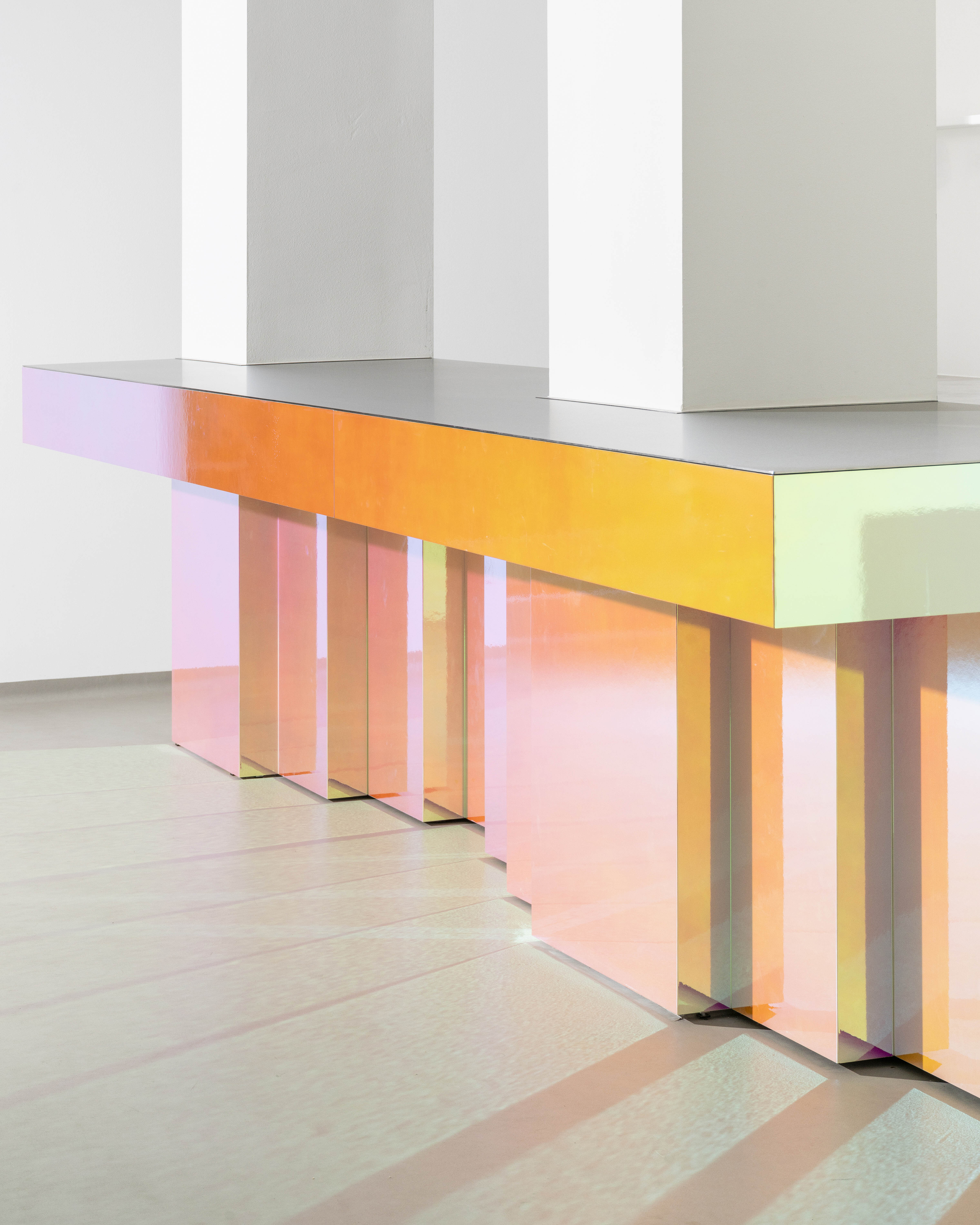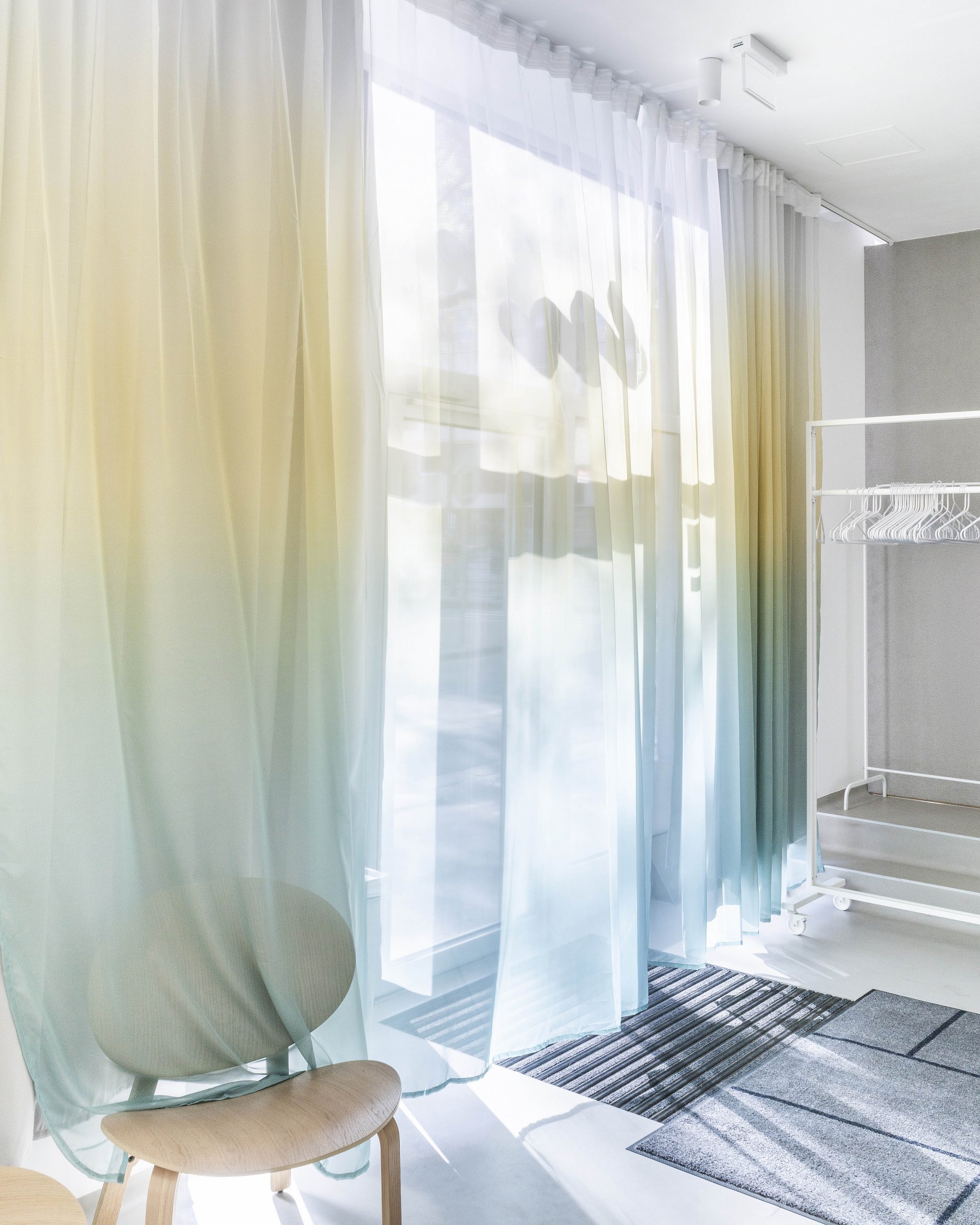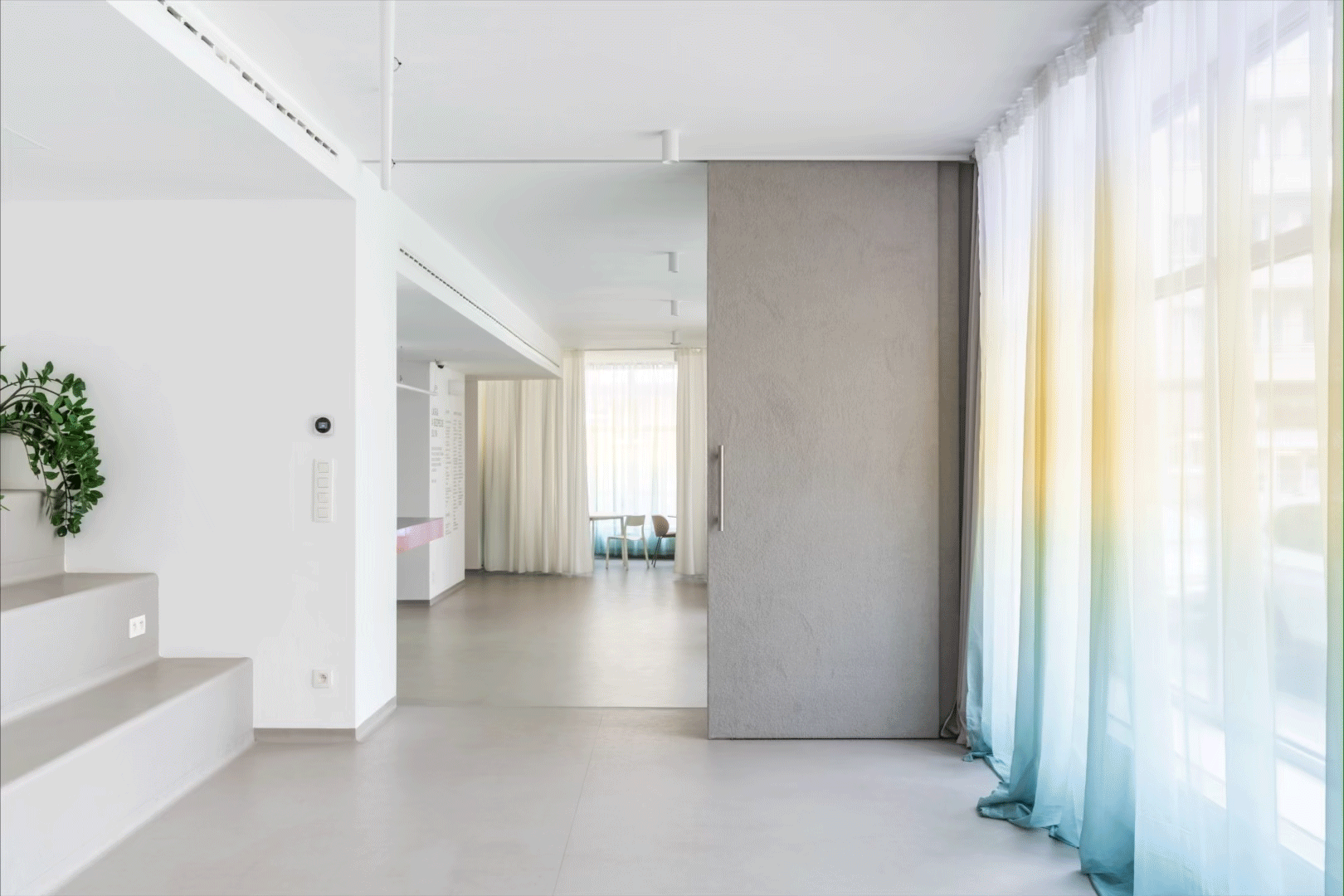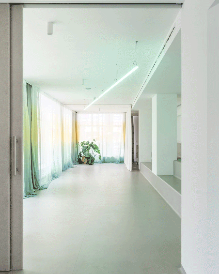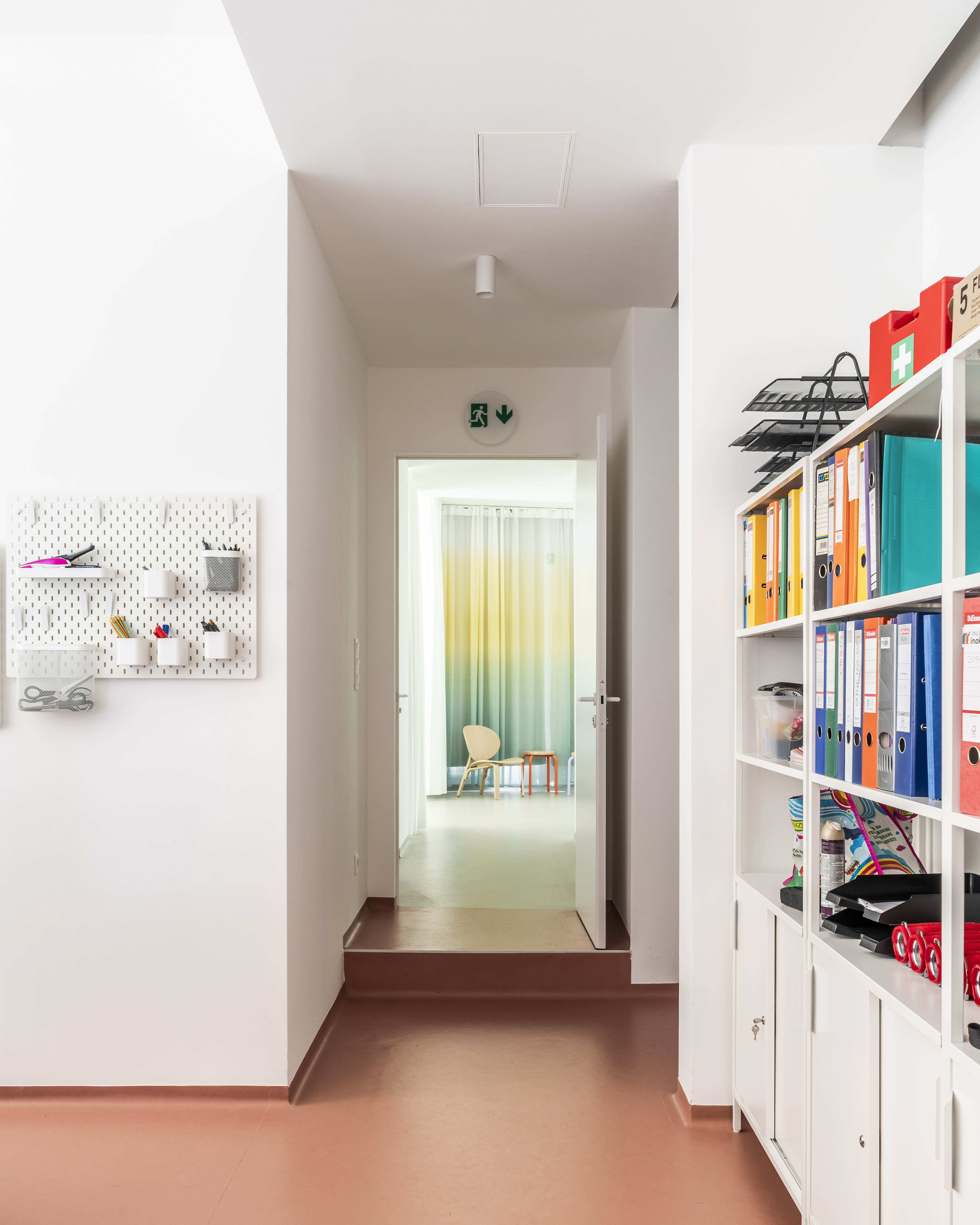 Farebný recepčný pult je miestom prvého kontaktu s komunitným centrom. Podporuje koncept spolupatričnosti i jedinečnosti. Nástrojom mäkkej zmeny sa stávajú závesy prechádzajúce celým priečelím. Lokálne vstupujú hlbšie do priestoru a vytvárajú mikroklastre. V druhom pláne sú zatemňujúce závesy, ktoré umožňujú fungovanie interných stretnutí či premietania.