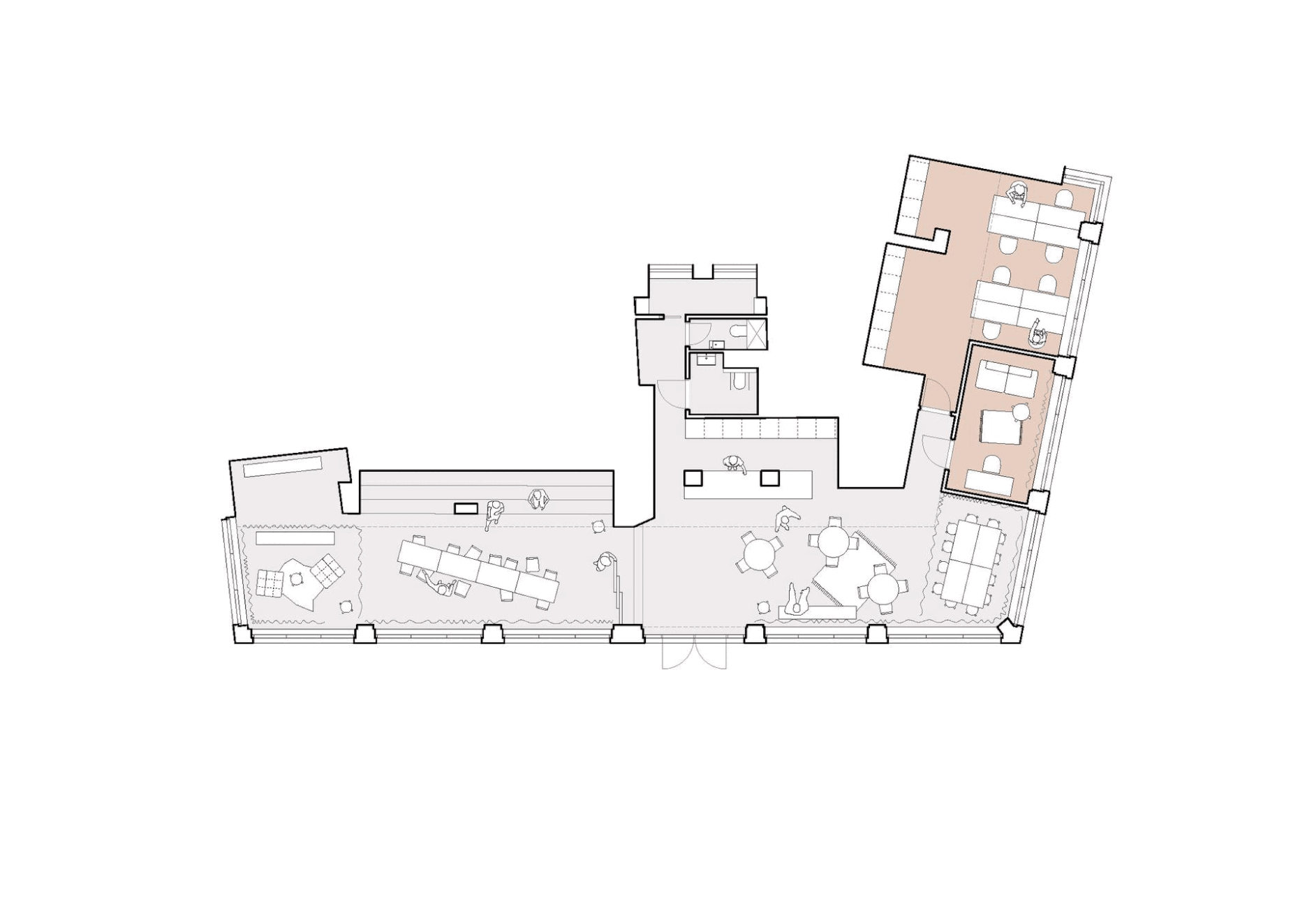 Priestory sme očistili od kancelárskeho nánosu bývalej banky tak, aby interiér ponúkal žiadanú otvorenosť a flexibilitu. Množstvo veľkých okien a prirodzeného svetla otvorený charakter priestoru ešte umocnilo a zjednotilo. Funkčné delenie komunitného centra ostáva variabilné a ľahko prispôsobiteľné potrebám užívateľov, ktoré sa môžu v čase prirodzene vyvíjať.
