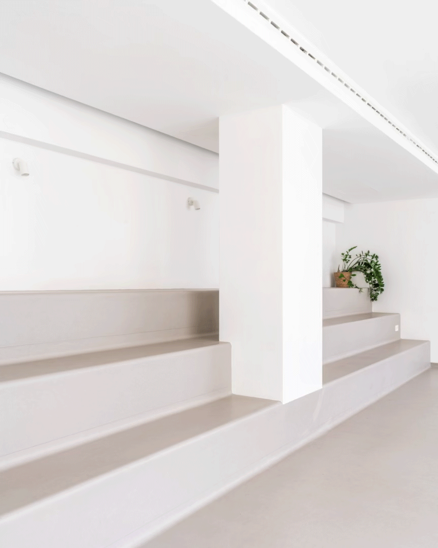 Hlavnou témou priestoru je prepájanie. Zjednotená podlaha prirodzene prechádza do sedenia na schodoch a otvára nové možnosti pre využívanie priestoru v podobe live diskusií, knižných klubov či prednášok.