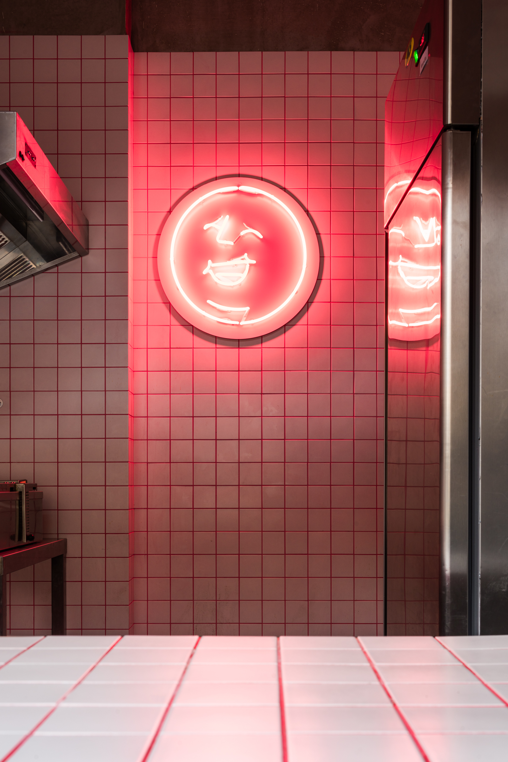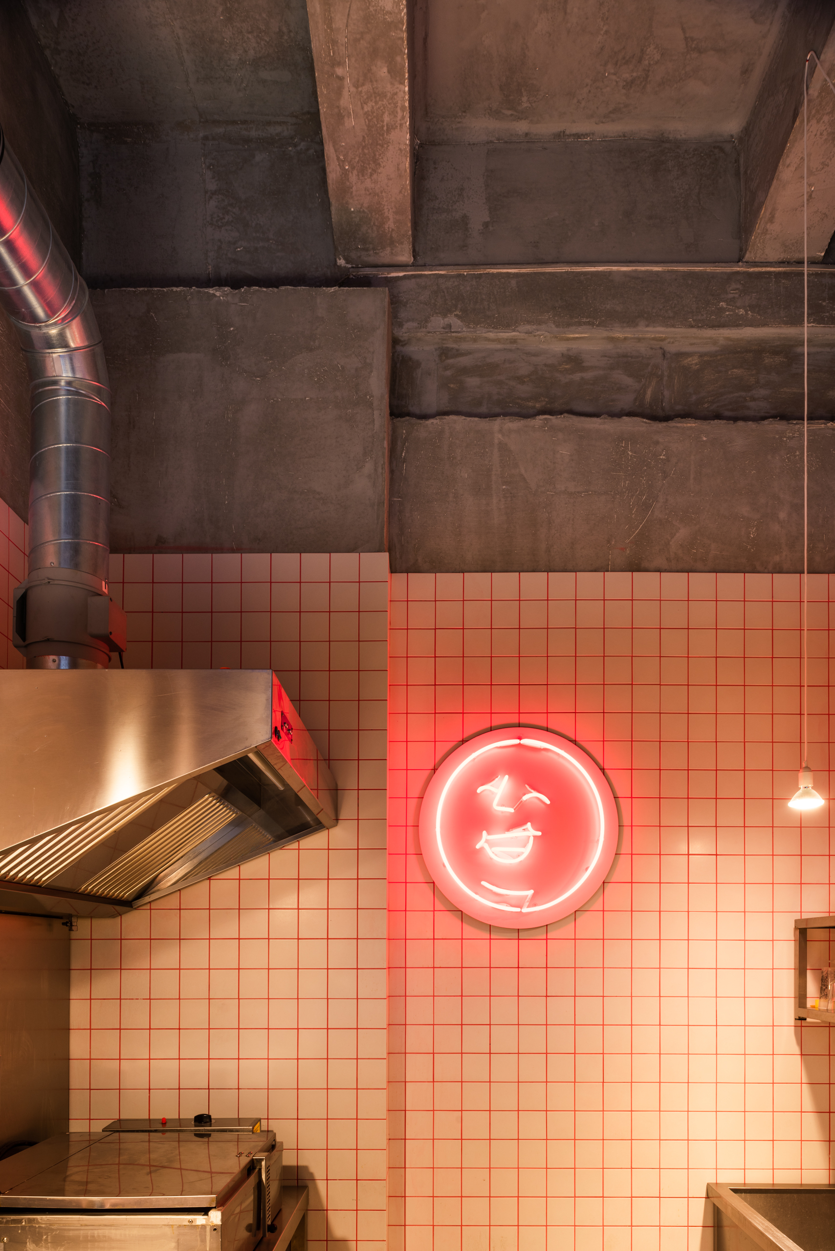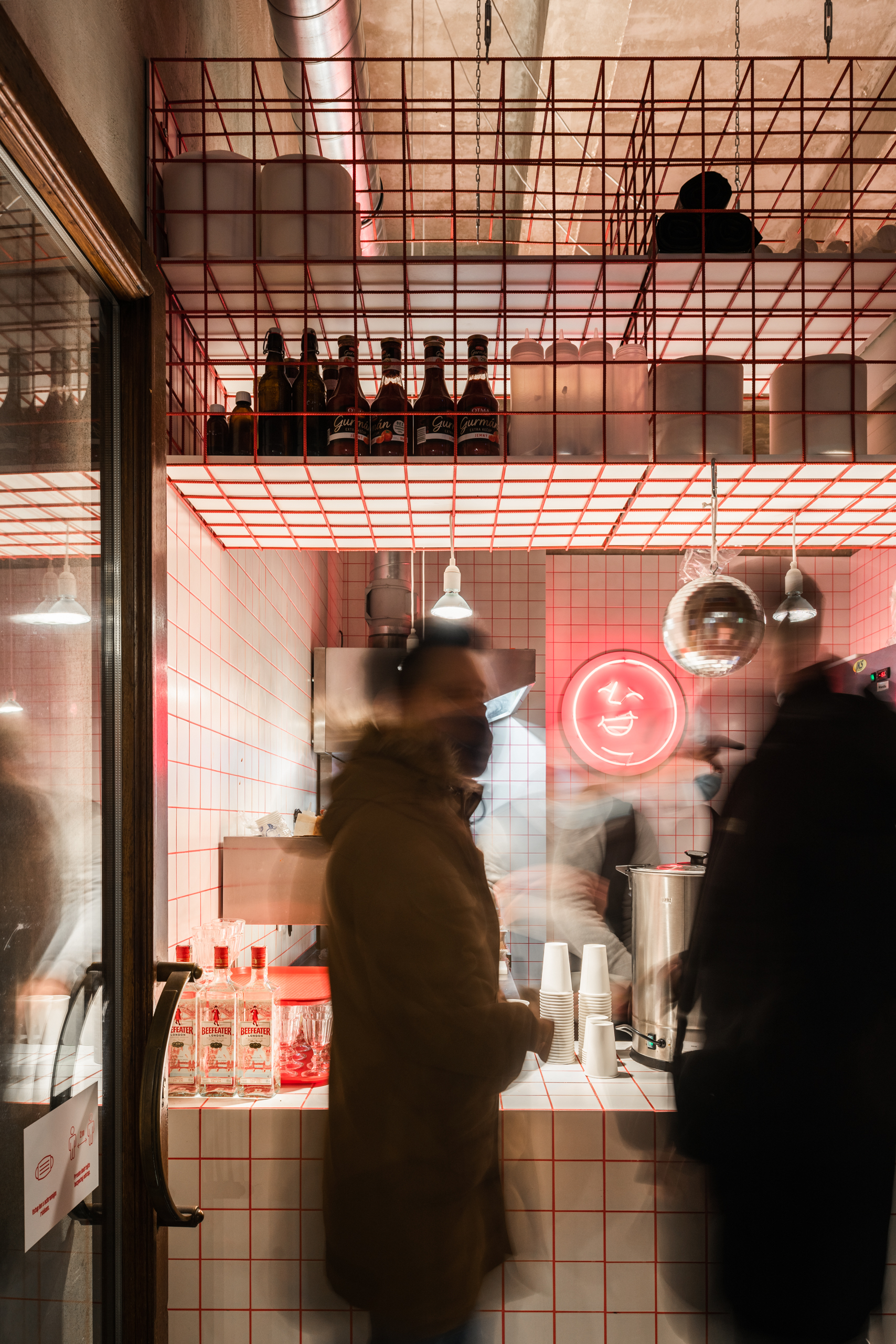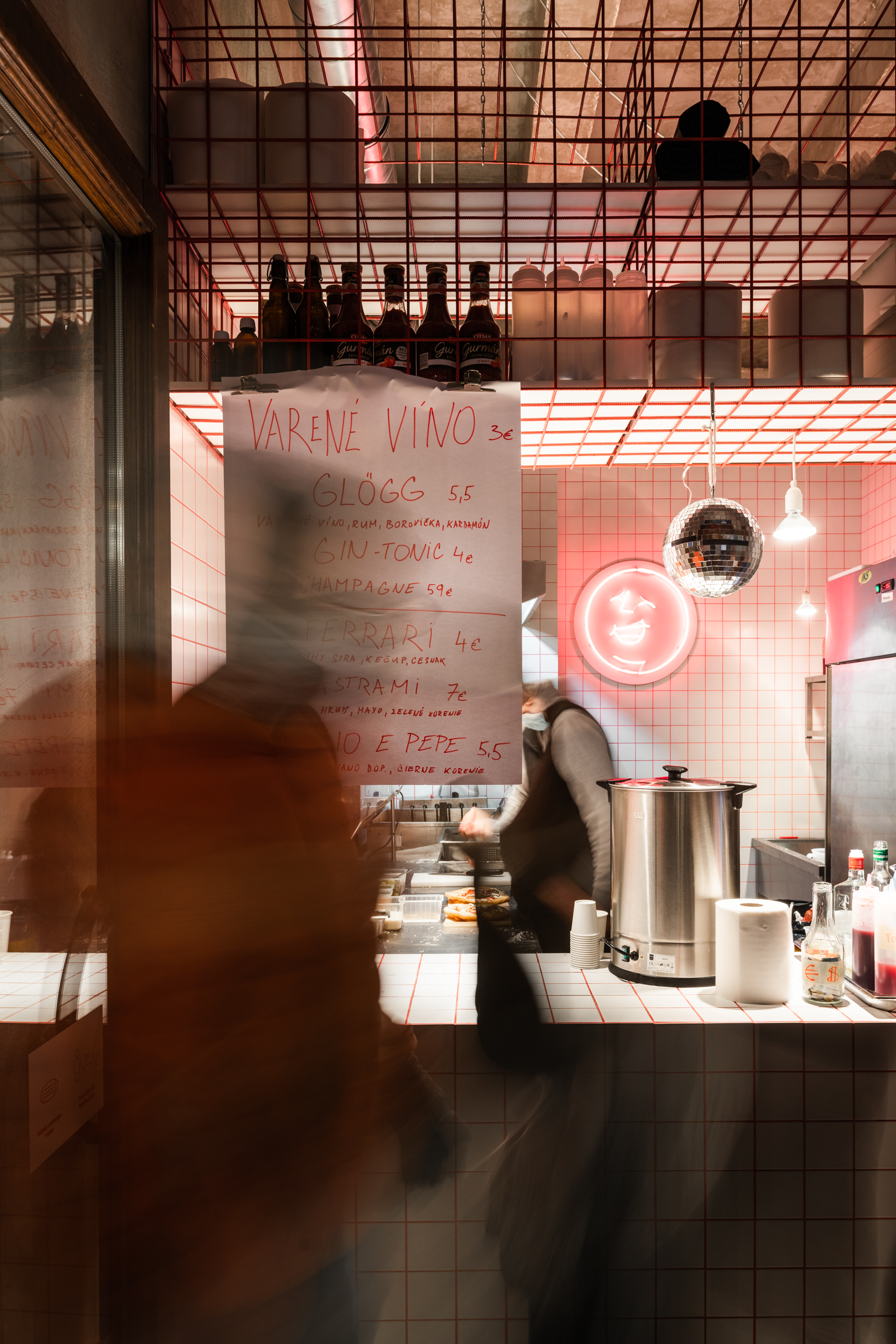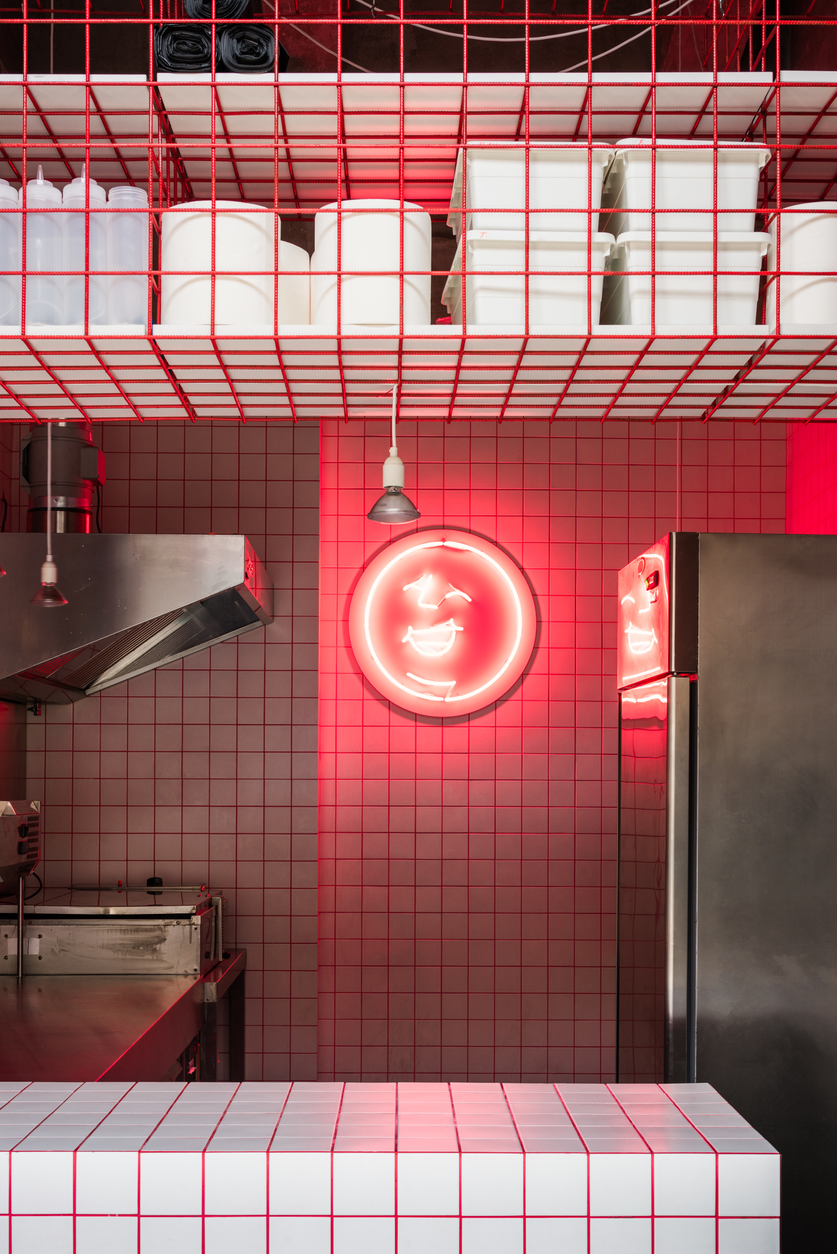 Do priestoru upraveného hrubou cementovou stierkou sme vložili funkčný box zložený z bielych dlaždíc, oceľovej police z kari siete a gastro technológie z nehrdzavejúcej ocele. Jedinou farbou, ktorú sme použili, je červená, ktorá vytvára akcent a je dobre spojená s vizuálnou identitou.