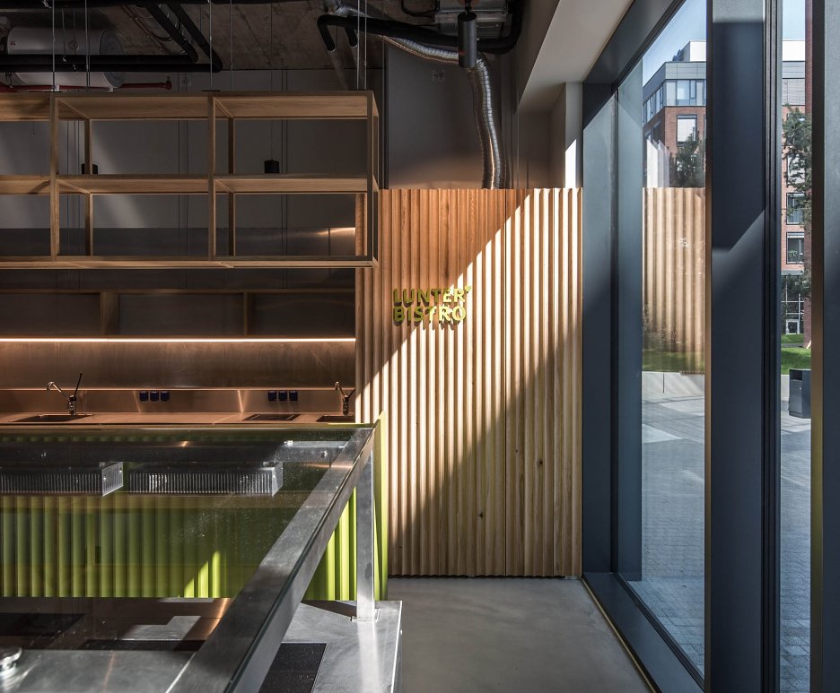 Zákazník bistra zameraného na zdravé stravovanie prirodzene očakáva poctivú alternatívu presahujúcu bežný štandard. Gastro prevádzka v parteri Twin City Tower sa snaží očakávania naplniť. Či už ide o jedlo alebo architektúru. Malý, ale frekventovaný priestor vyžaduje efektívne dispozičné riešenie, odolné materiály a prehľadný priestorový koncept. "Otvorenosť a poctivosť. Primárne heslá, ktoré charakterizujú značku Lunter boli kľučové aj pri formovaní architektonického konceptu" vysvetľuje architekt Martin Hudec.