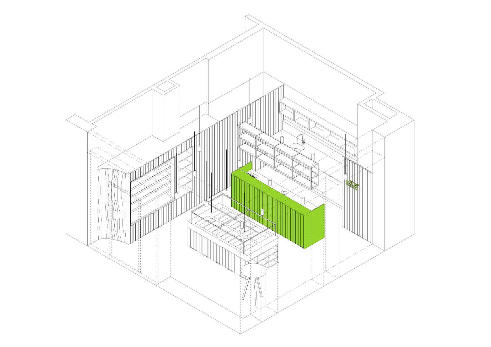 Bistro je prístupné z interiéru vstupnej haly, čitateľné je však rovnako cez exteriérové presklenie. Vnútorný priestor definuje kompaktná drevená zástena, ktorá skrýva len nevyhnutné zázemie prevádzky (skladovú chladničku, príručný sklad a malú prípravovňu...). Zakomponované sú v nej rovnako plochy pre produkty. Na osi vstupu sa nachádzajú otvorený šalátový bar a transparentná prípravovňa jedál s obslužným pultom. Zóna návštevníkov a obsluhy je delená vizuálne iba pomocou zníženej priehľadnej police nad pultom, čím menšiemu retailu neuberá na ploche. Časť obalená v nerezi vyjadruje čistotu procesu prípravy gastronomických produktov. Koncept otvorenosti vyjadruje rovnako aj stropná vrstva bez podhľadu.