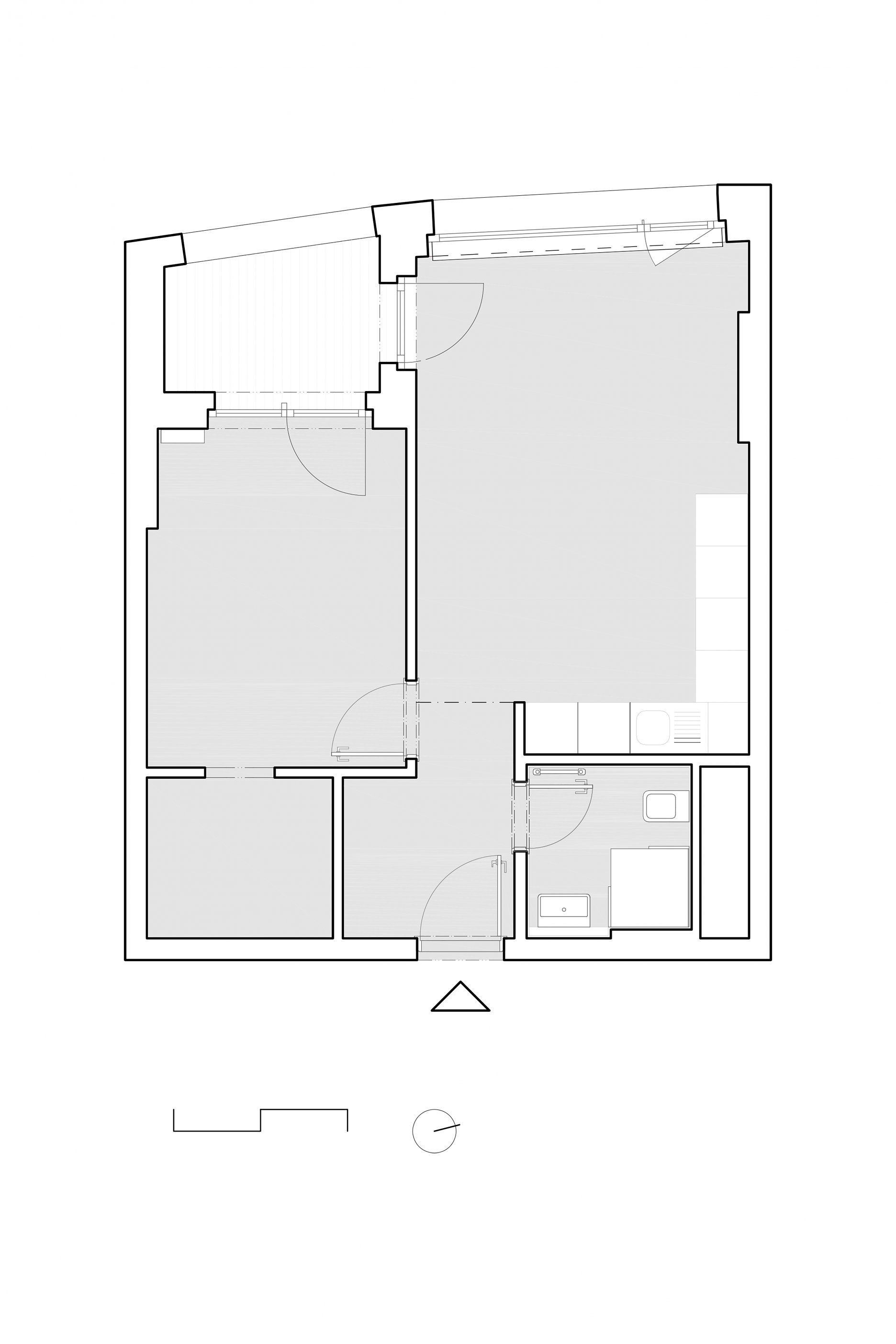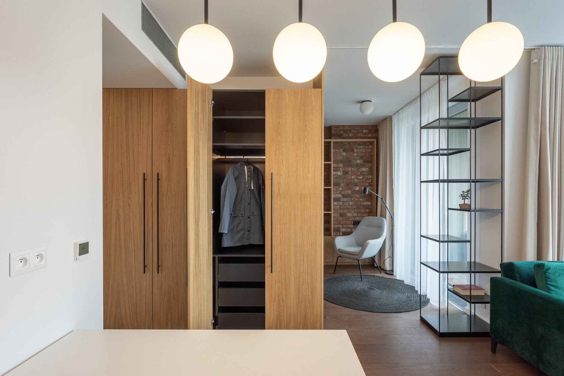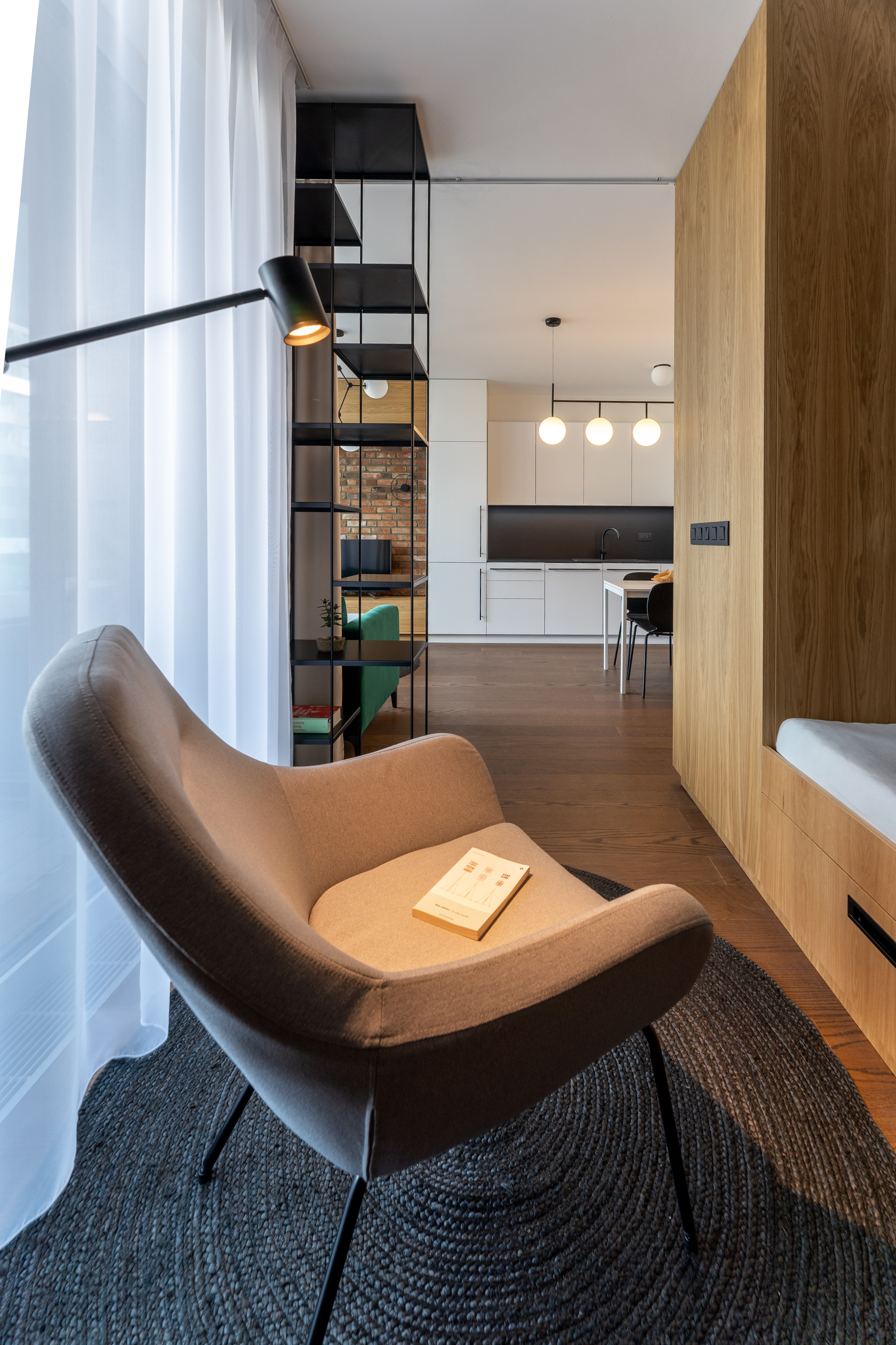 Zámerom architektov bolo otvoriť pôvodnú dispozíciu bytu a vytvoriť veľkorysejší priestorový zážitok. Odstránenie priečky medzi obývačkou a spálňou prepojilo obe miestnosti a presvetlilo obytnú časť aj vstupný priestor.