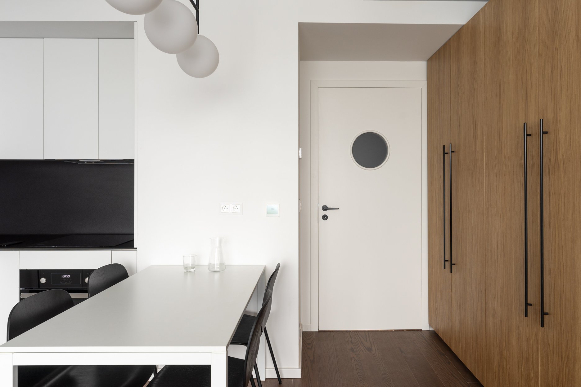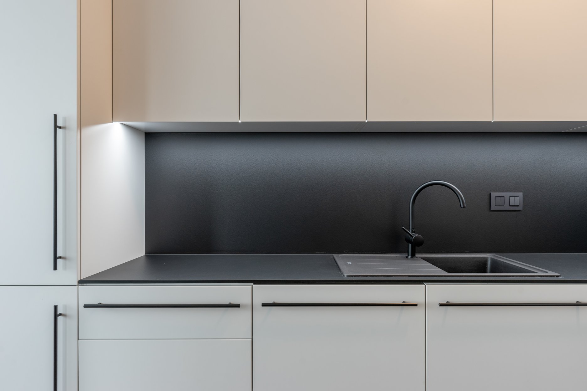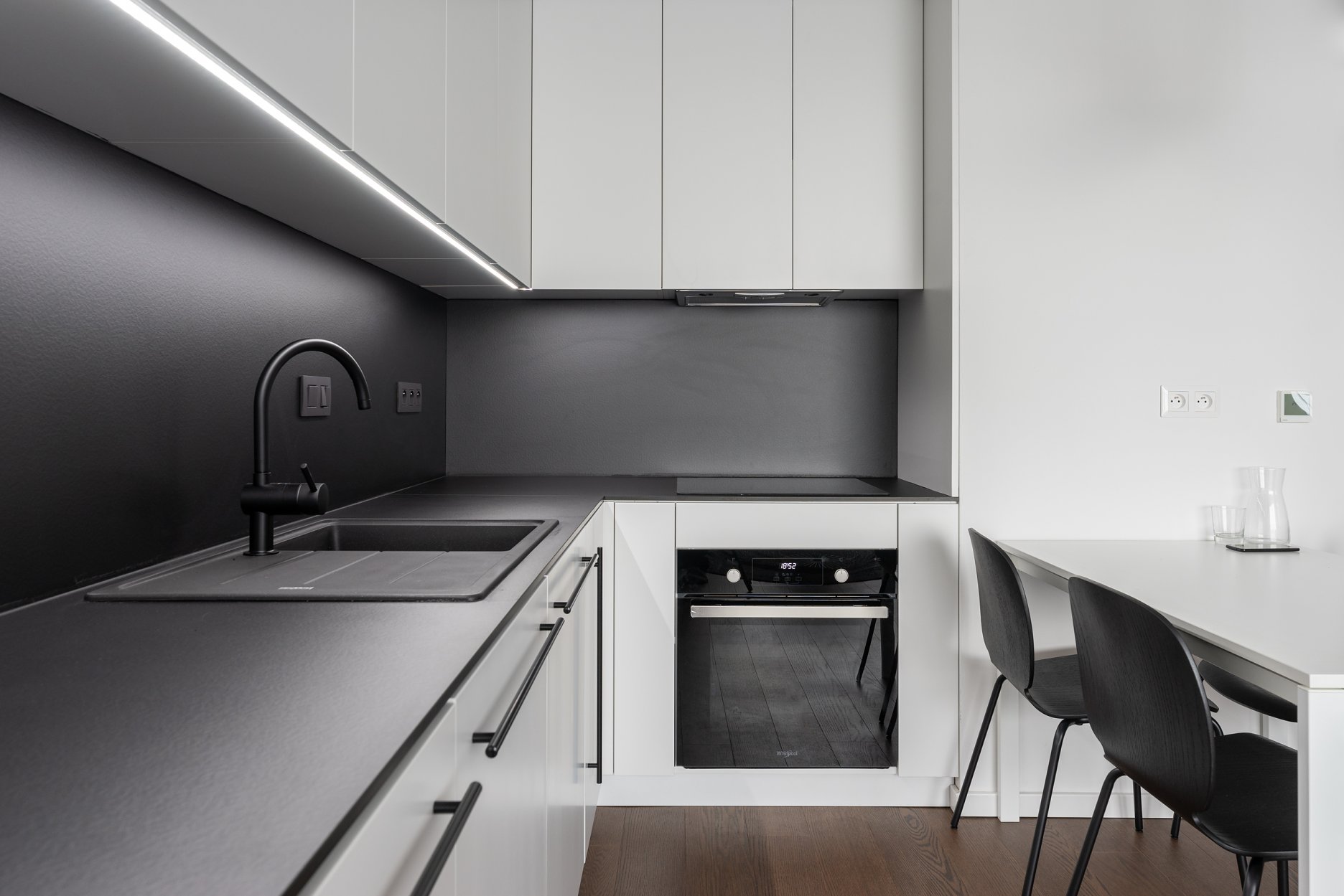 Interiér kombinuje tmavé horizontálne plochy (podlaha, pracovná doska) so svetlými vertikálnymi povrchmi.