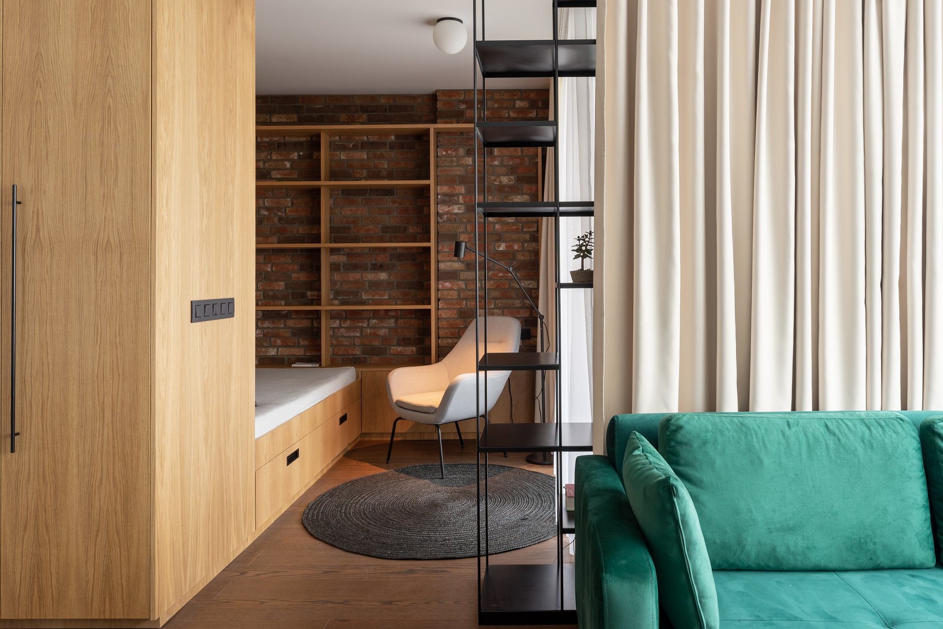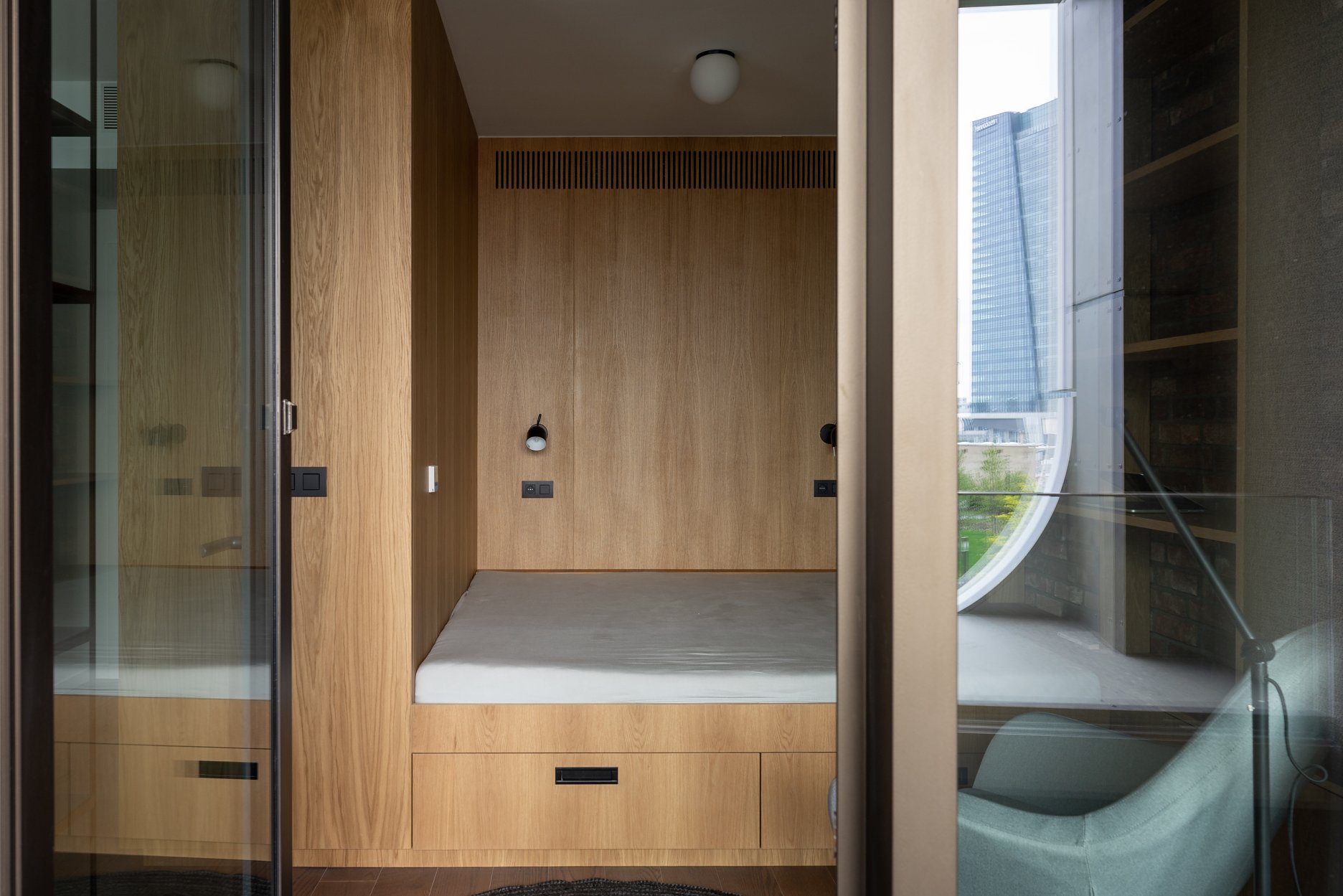 Spálňu nahradila posteľná nika s povrchom z dubovej dyhy, tvorená vstavaným nábytkom s úložným priestormi.