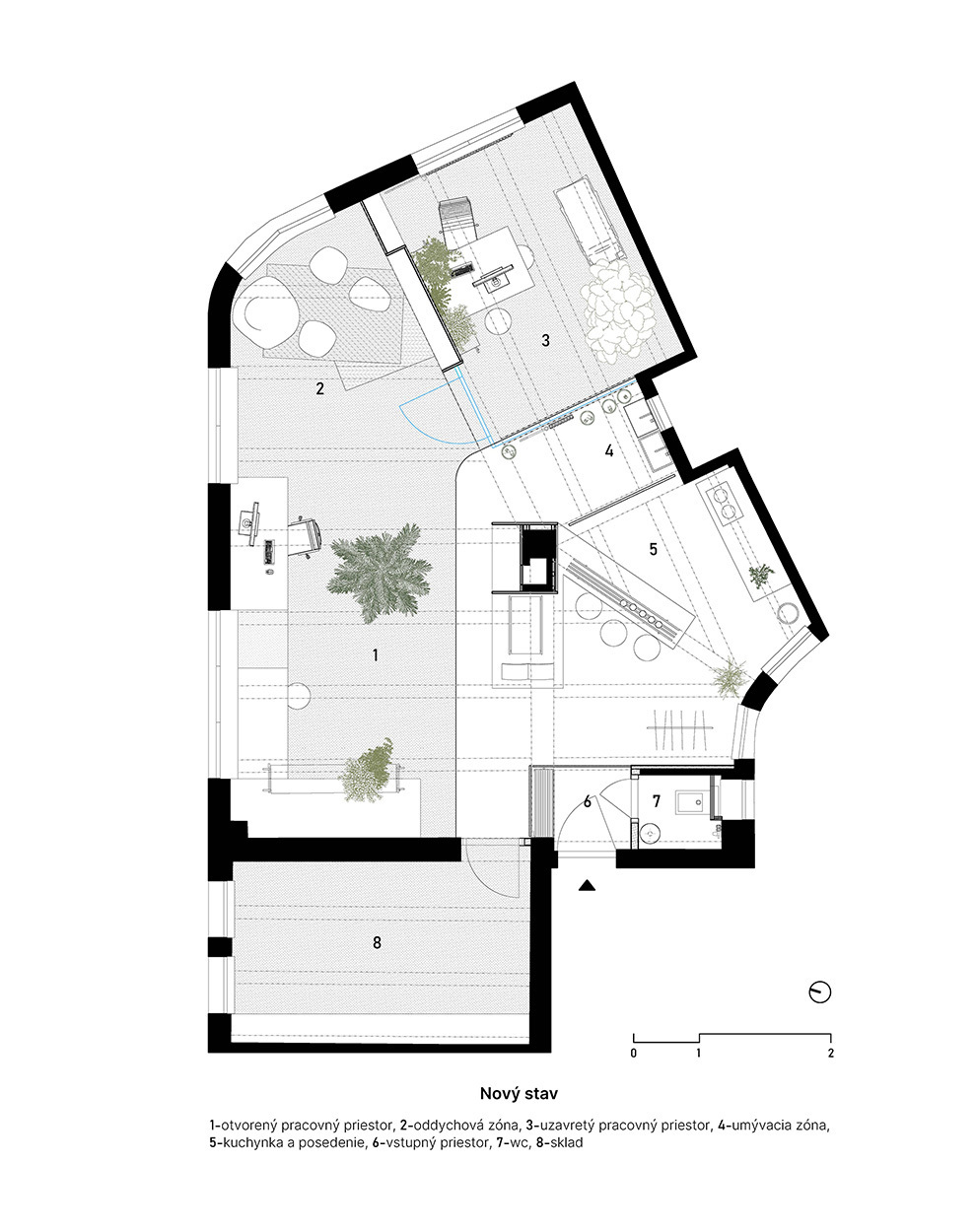 Zámerom bolo vytvoriť otvorený, plynulý priestor, so zákutiami. Otvorený, no rozčlenený – aby sa v ňom dala čítať jednotnosť priestoru, a zároveň ponúkal aj miesta pre súkromie a individuálnu prácu.